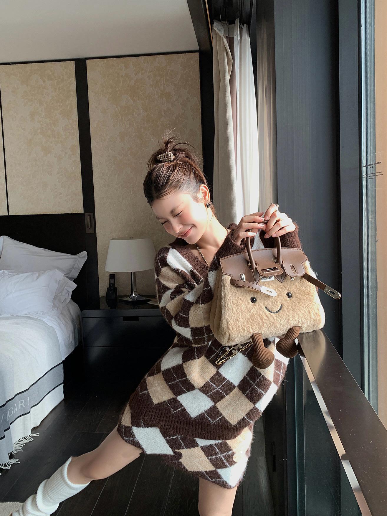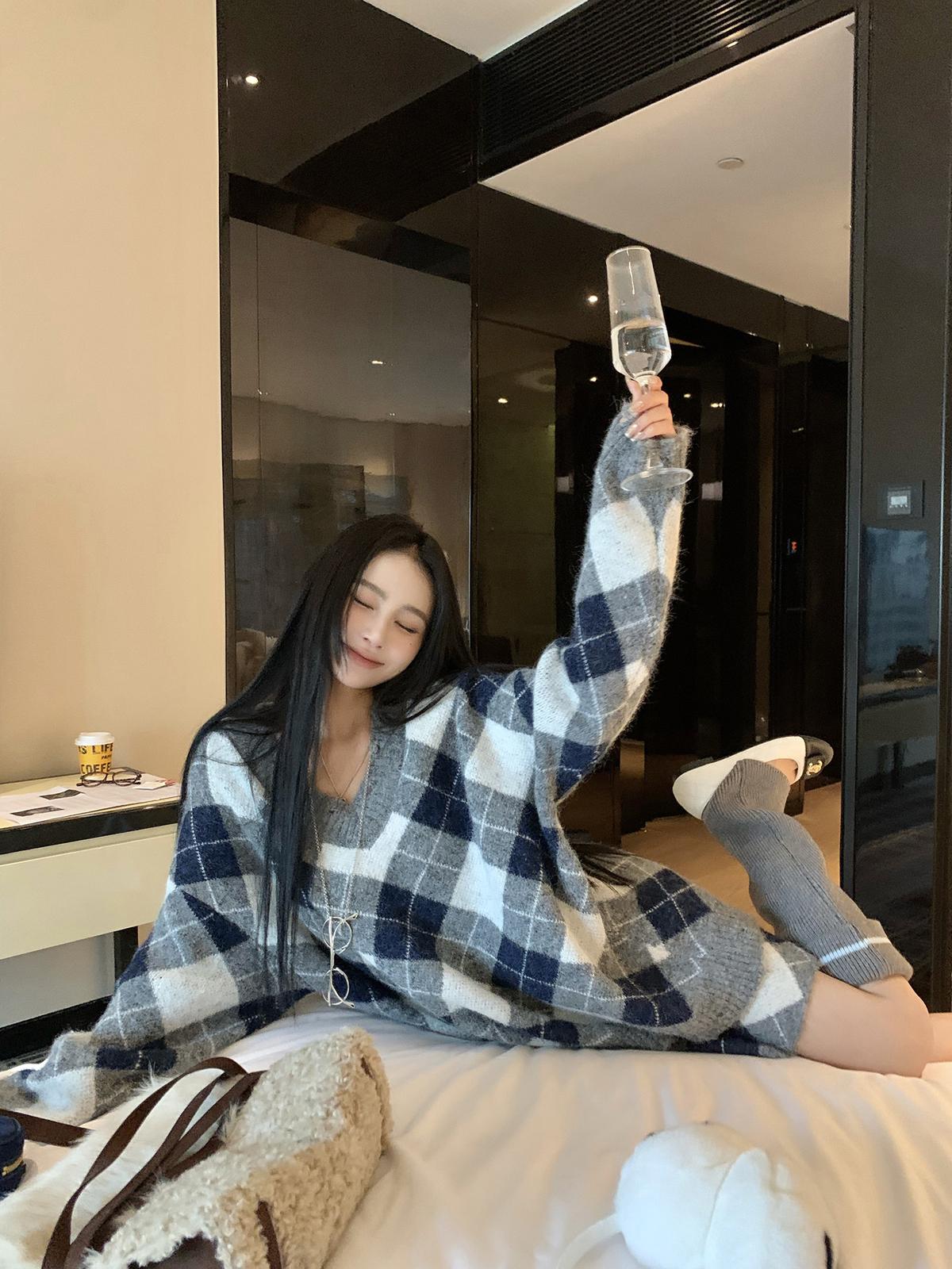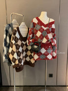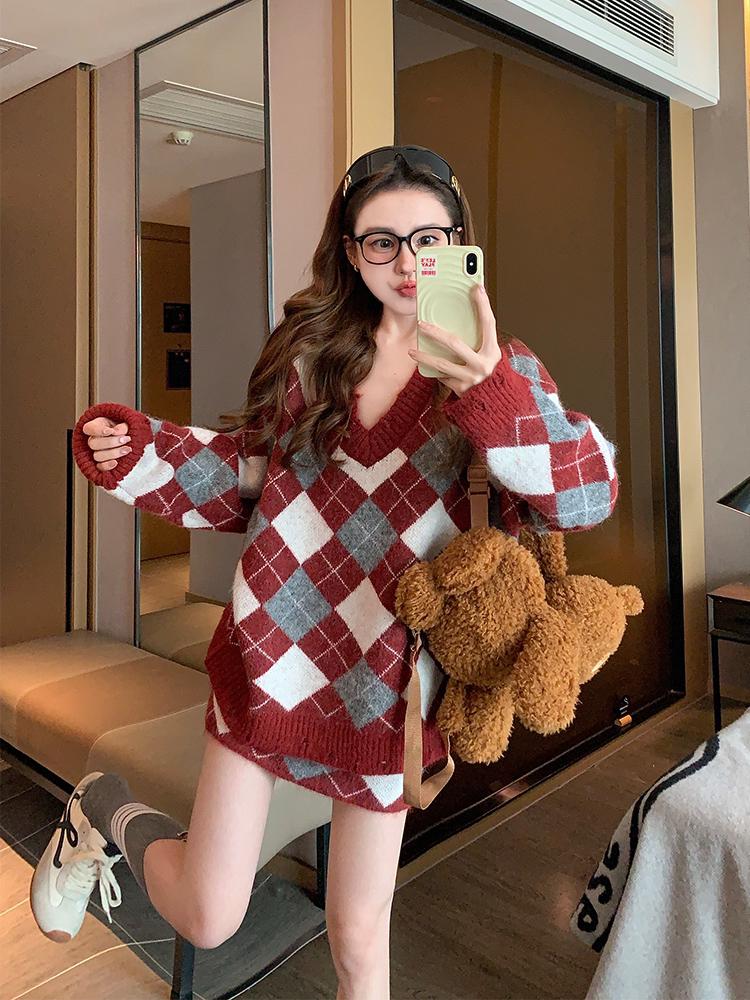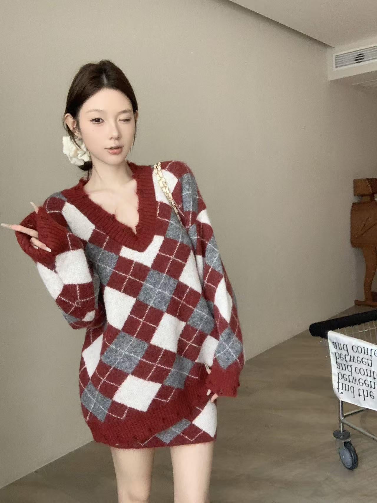 3. 【C8221】格菱布朗尼 撞色菱格V領毛衣+包臀半身裙套裝