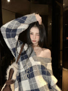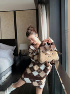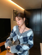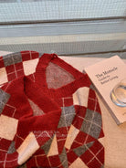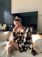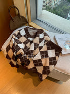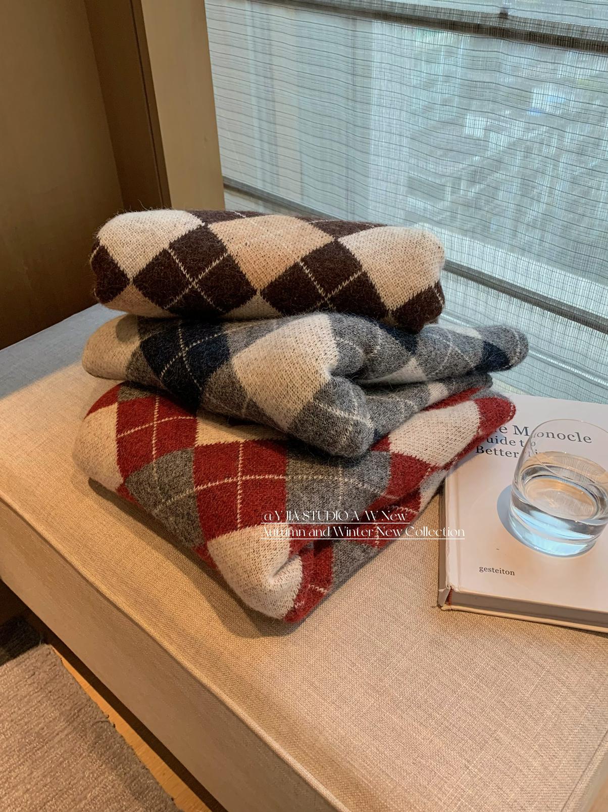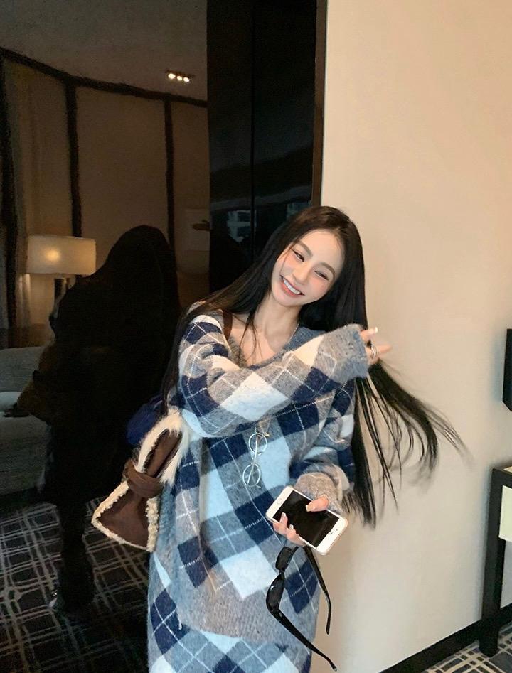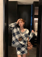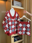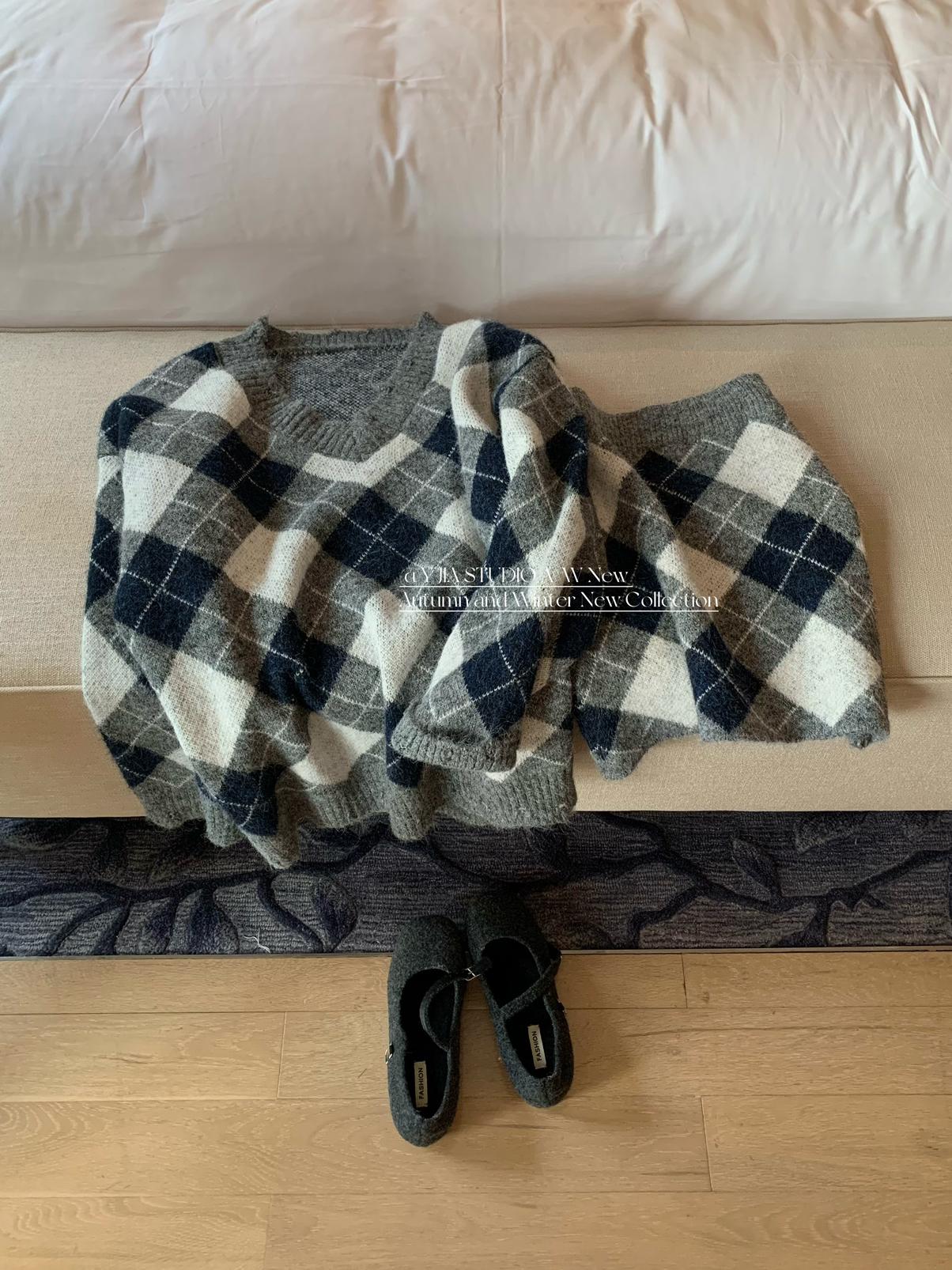 【C8221】格菱布朗尼 撞色菱格V領毛衣+包臀半身裙套裝