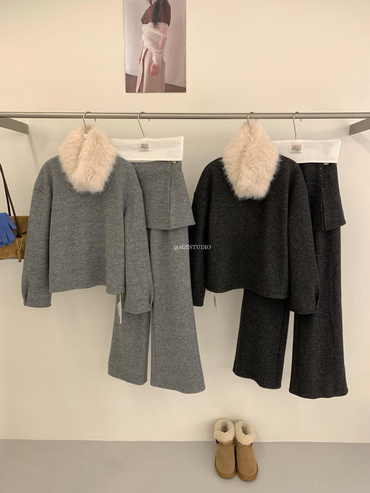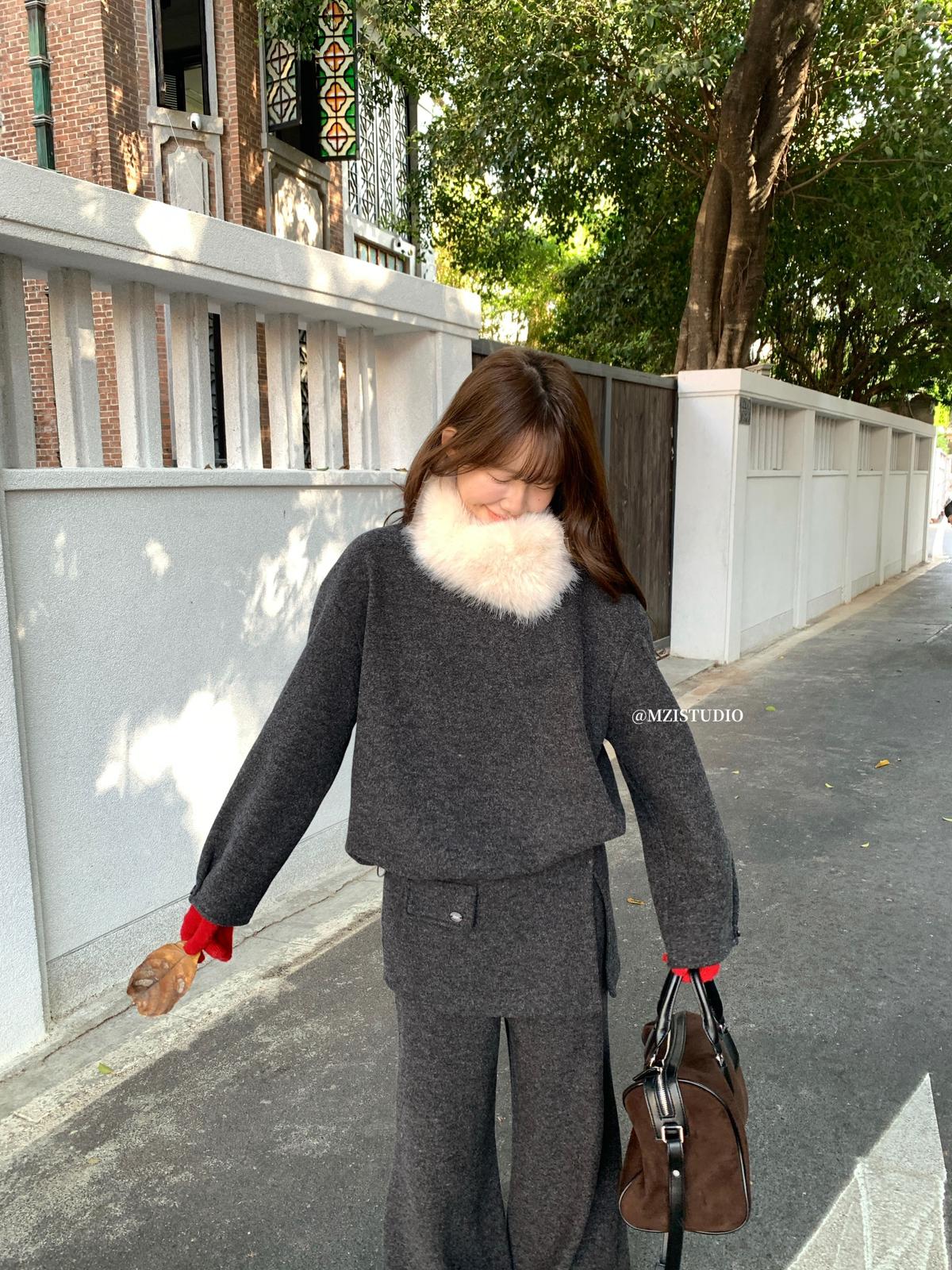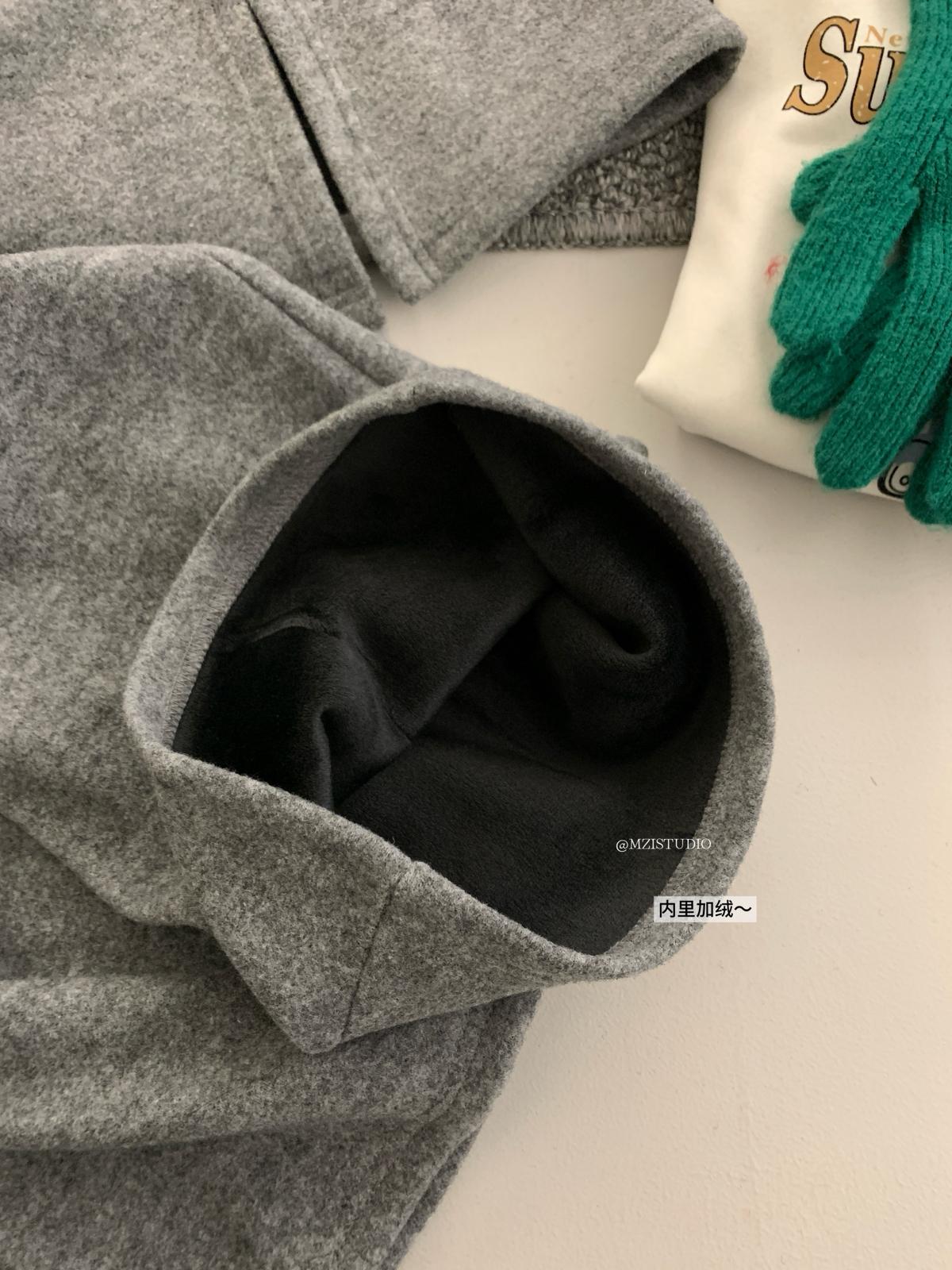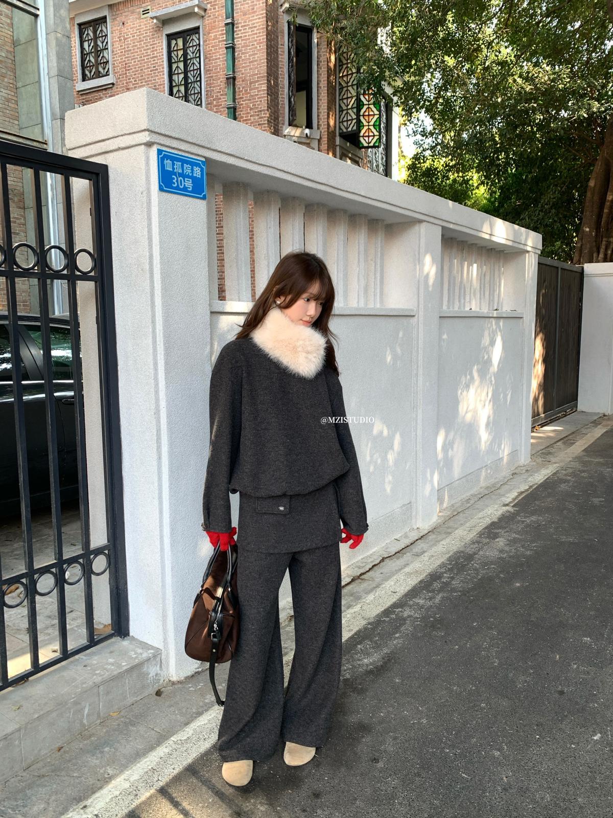 【C8283】無拘無束舒適日常韓標冬日加絨毛呢上衣+不可拆卸屁簾鬆弛休閒褲套裝(配可拆卸毛領)