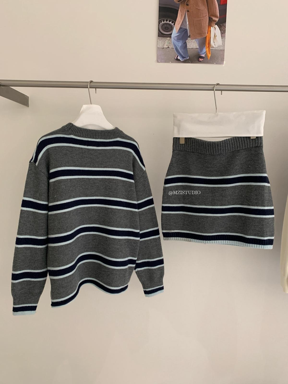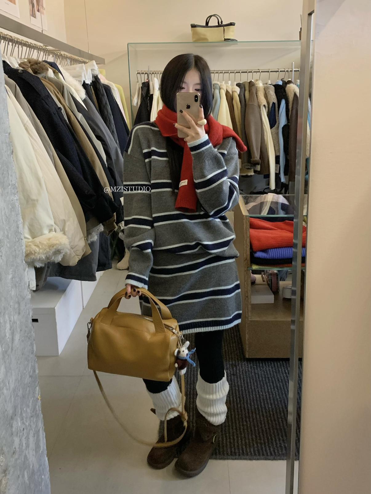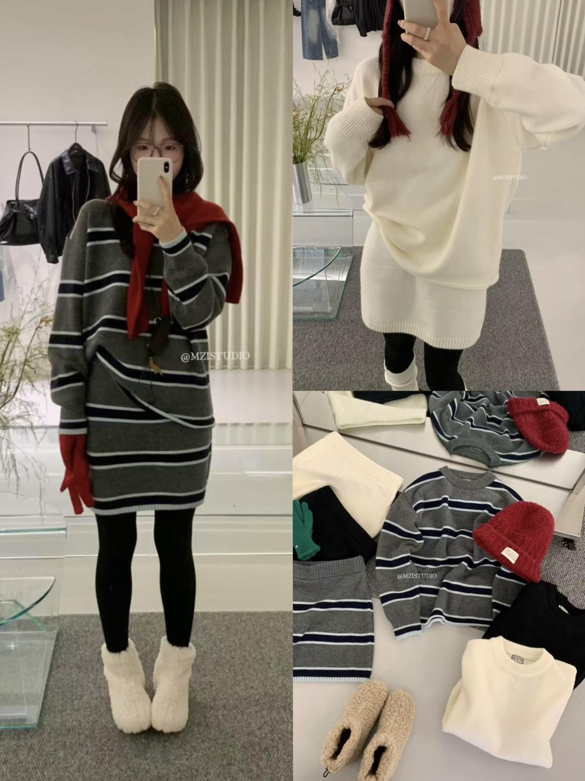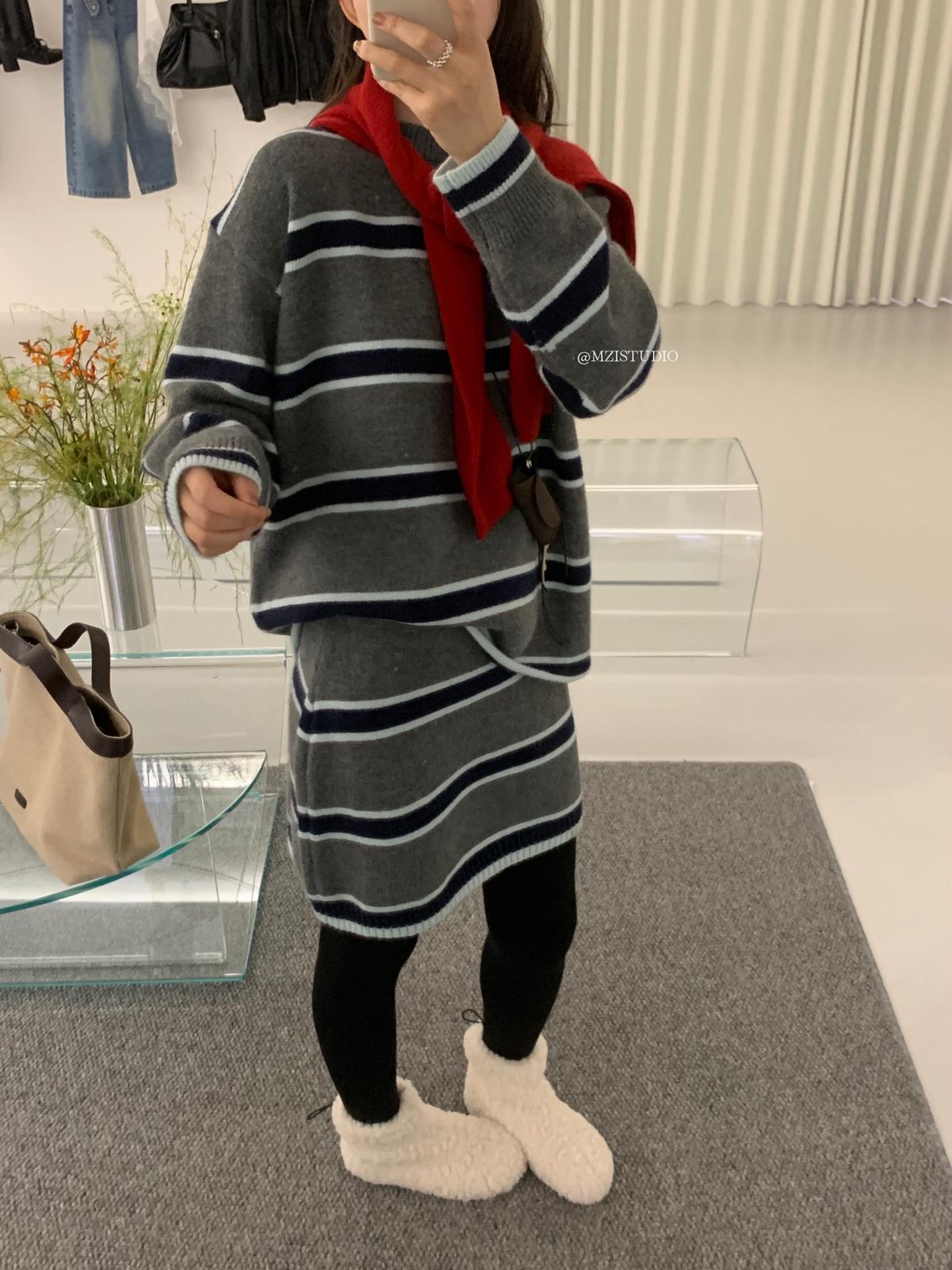 【C7829】慵懶假日韓標條紋純色軟糯寬鬆套頭毛衣+修身顯腿長包臀短裙套裝