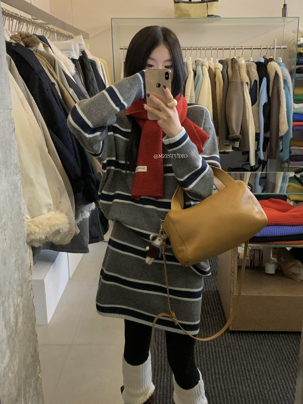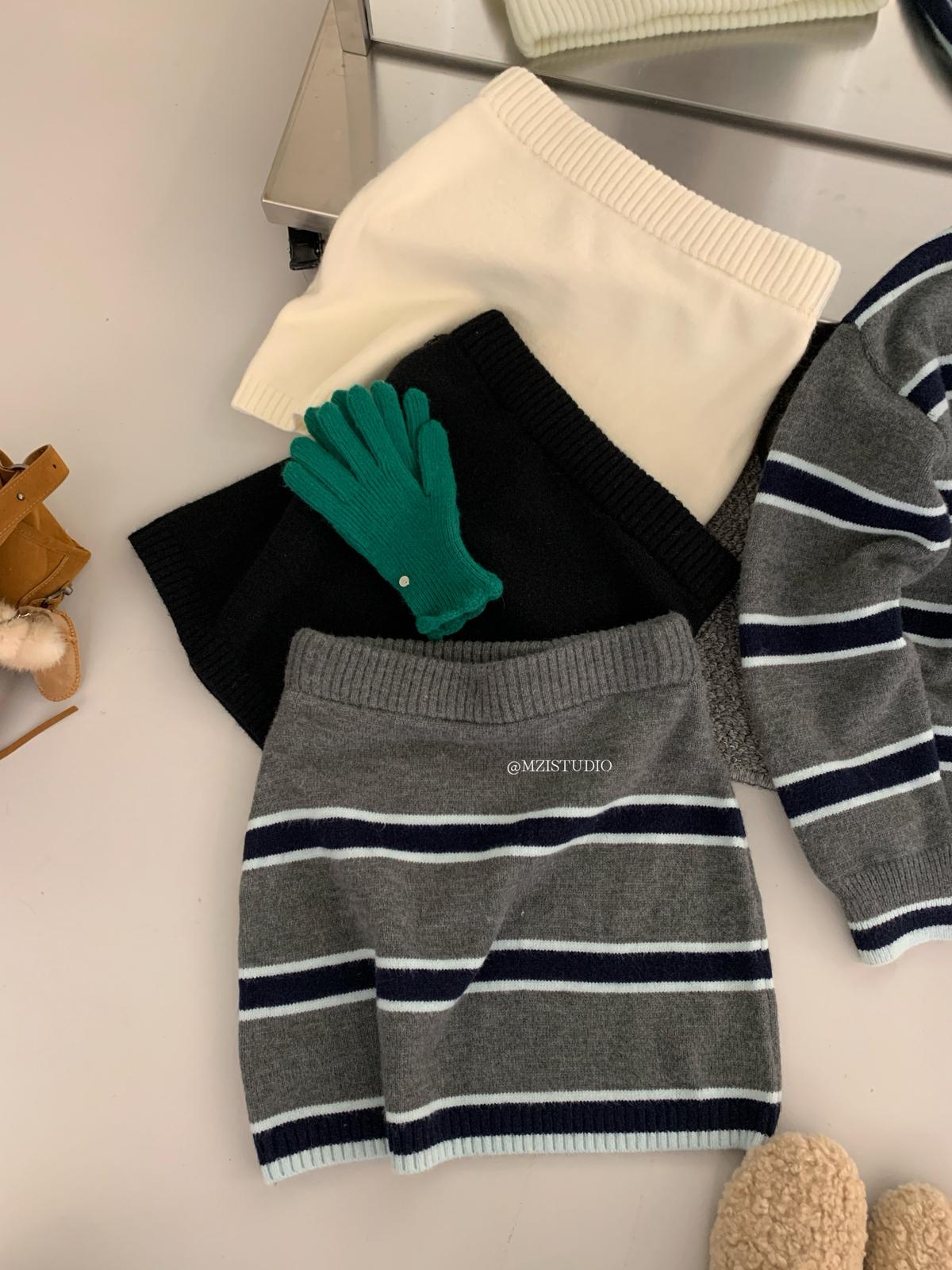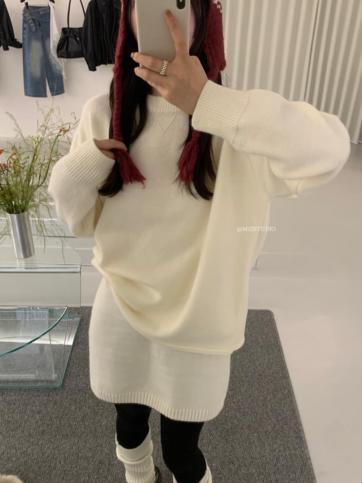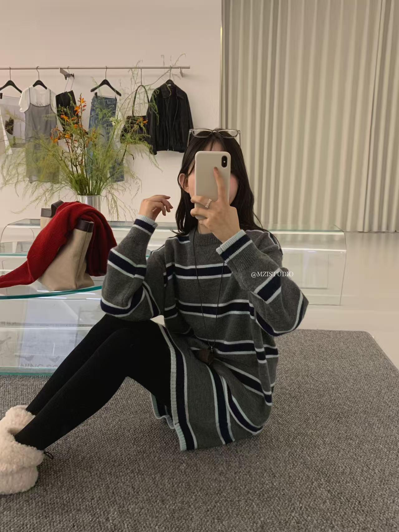 【C7829】慵懶假日韓標條紋純色軟糯寬鬆套頭毛衣+修身顯腿長包臀短裙套裝