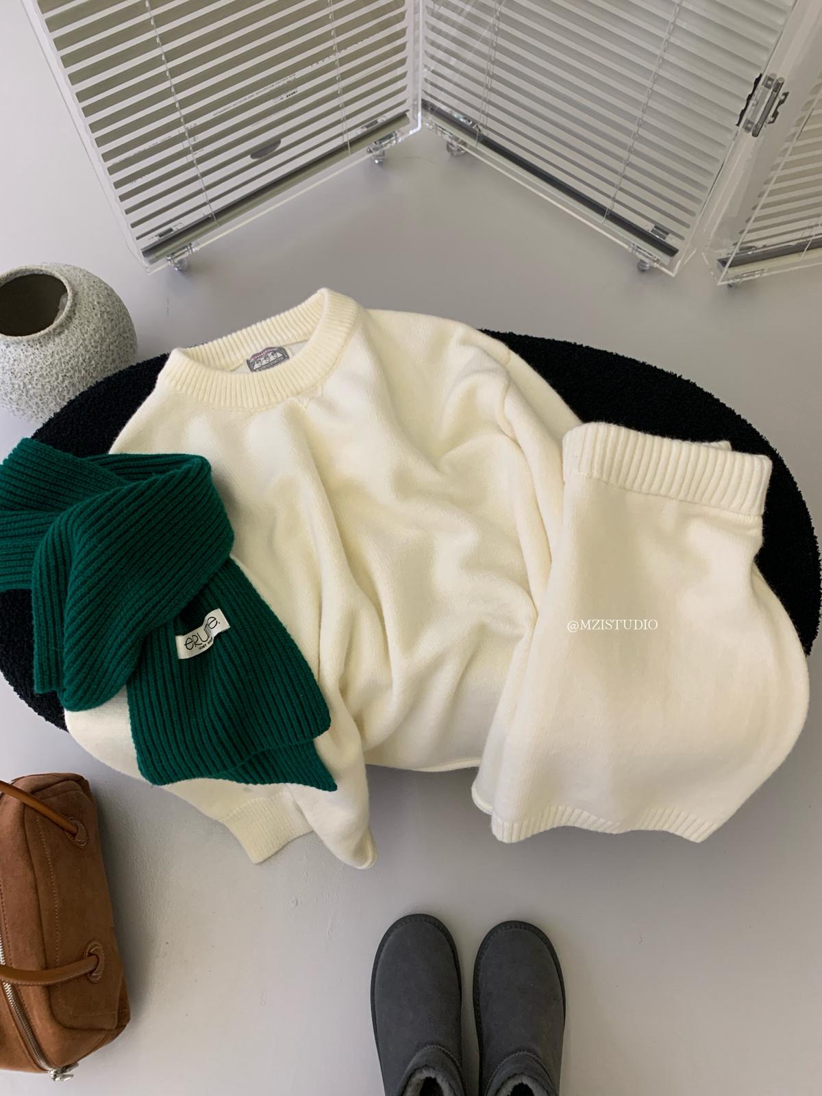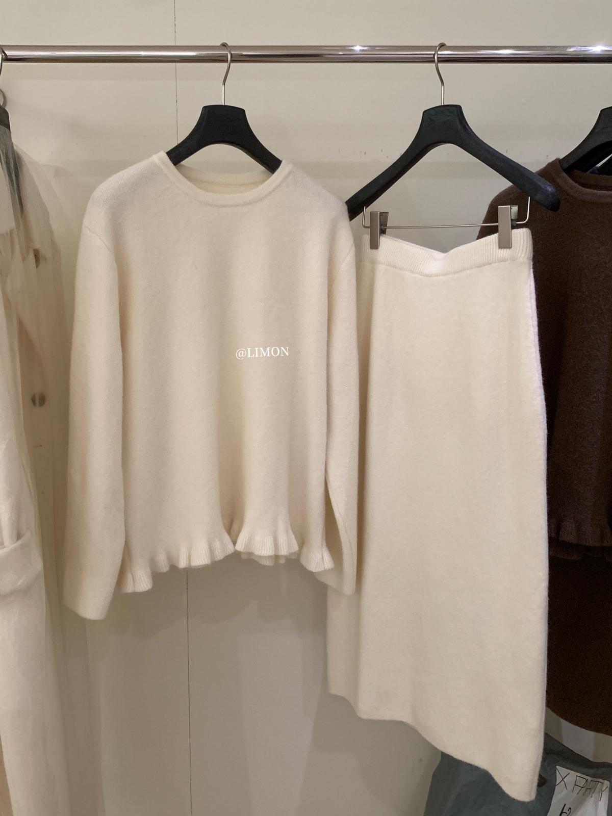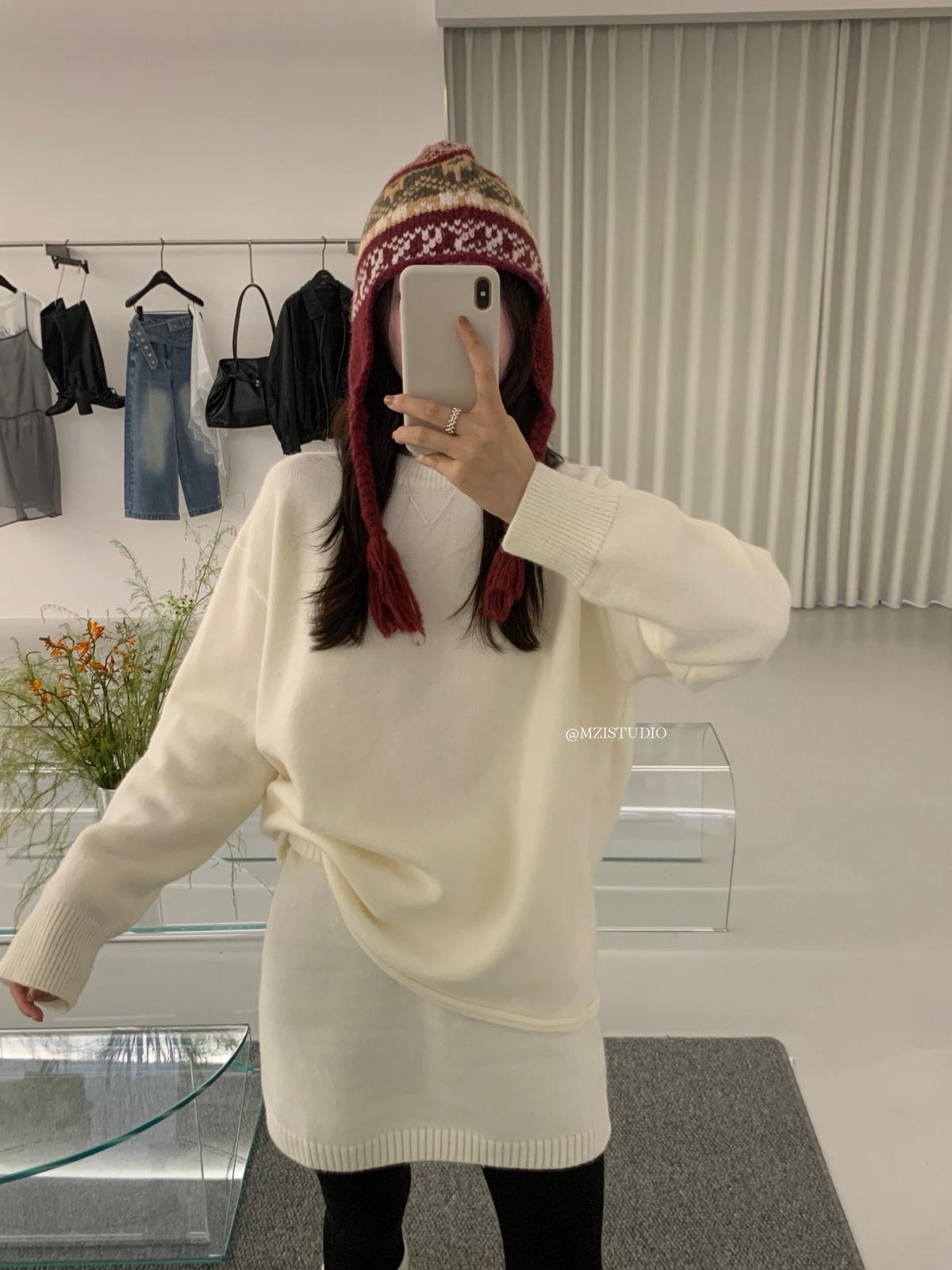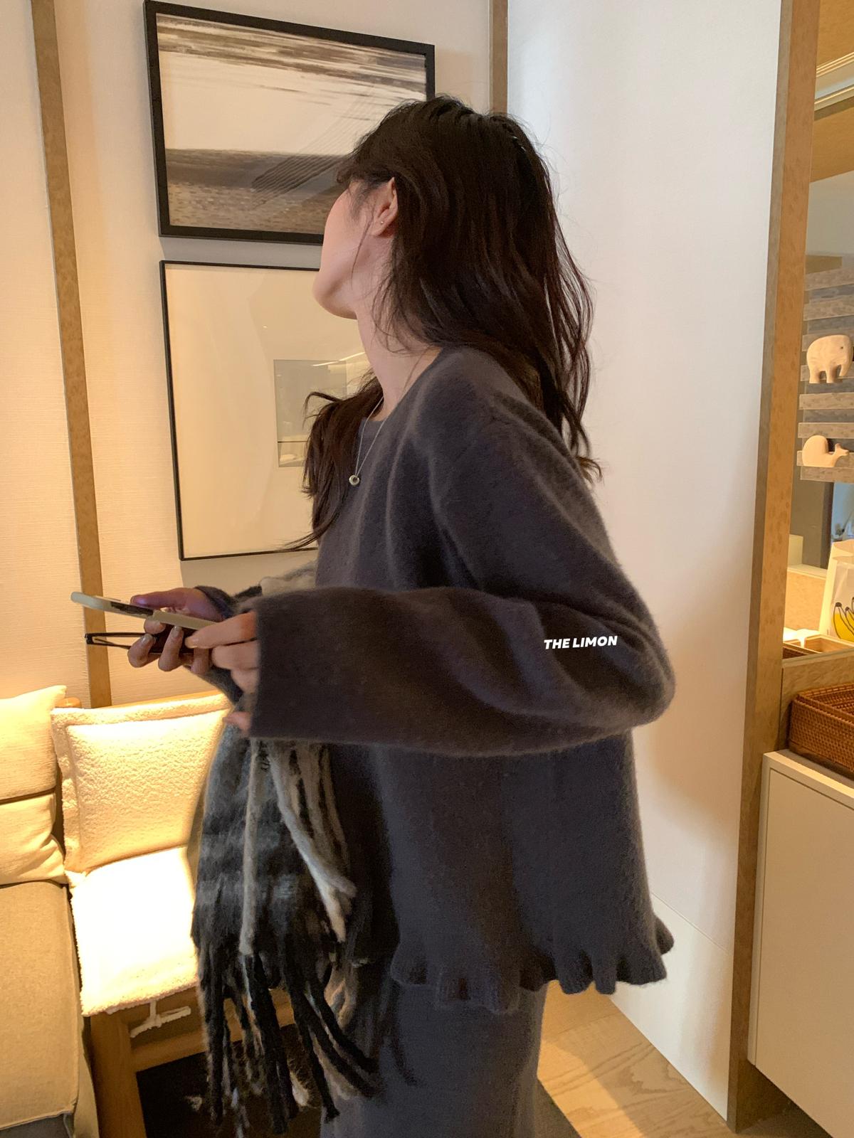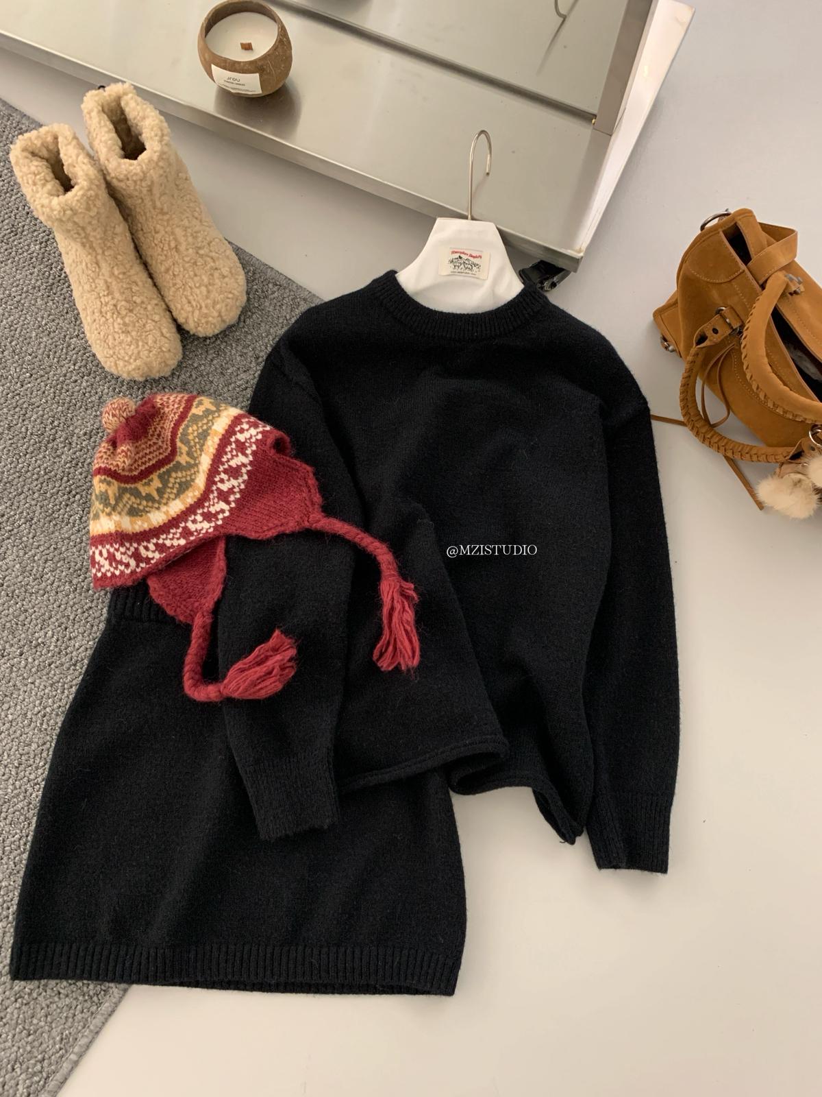 【C8048】慵懶木耳邊圓領毛衣+鬆緊腰顯瘦半身裙套裝