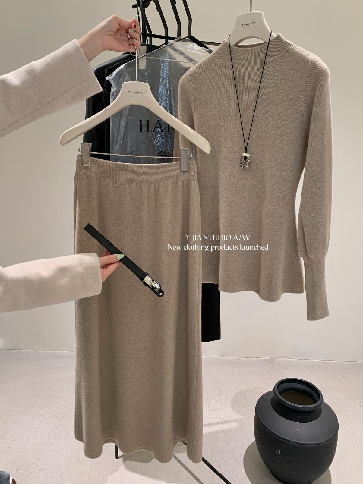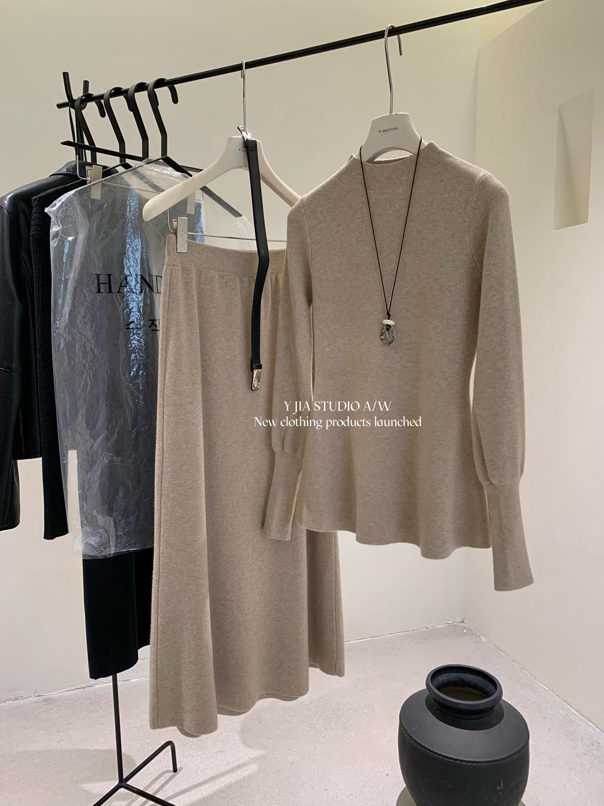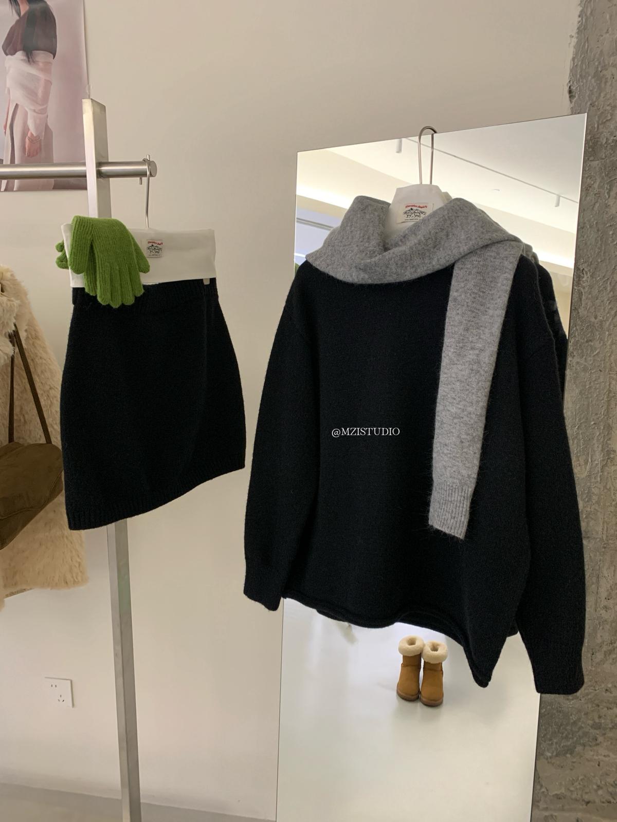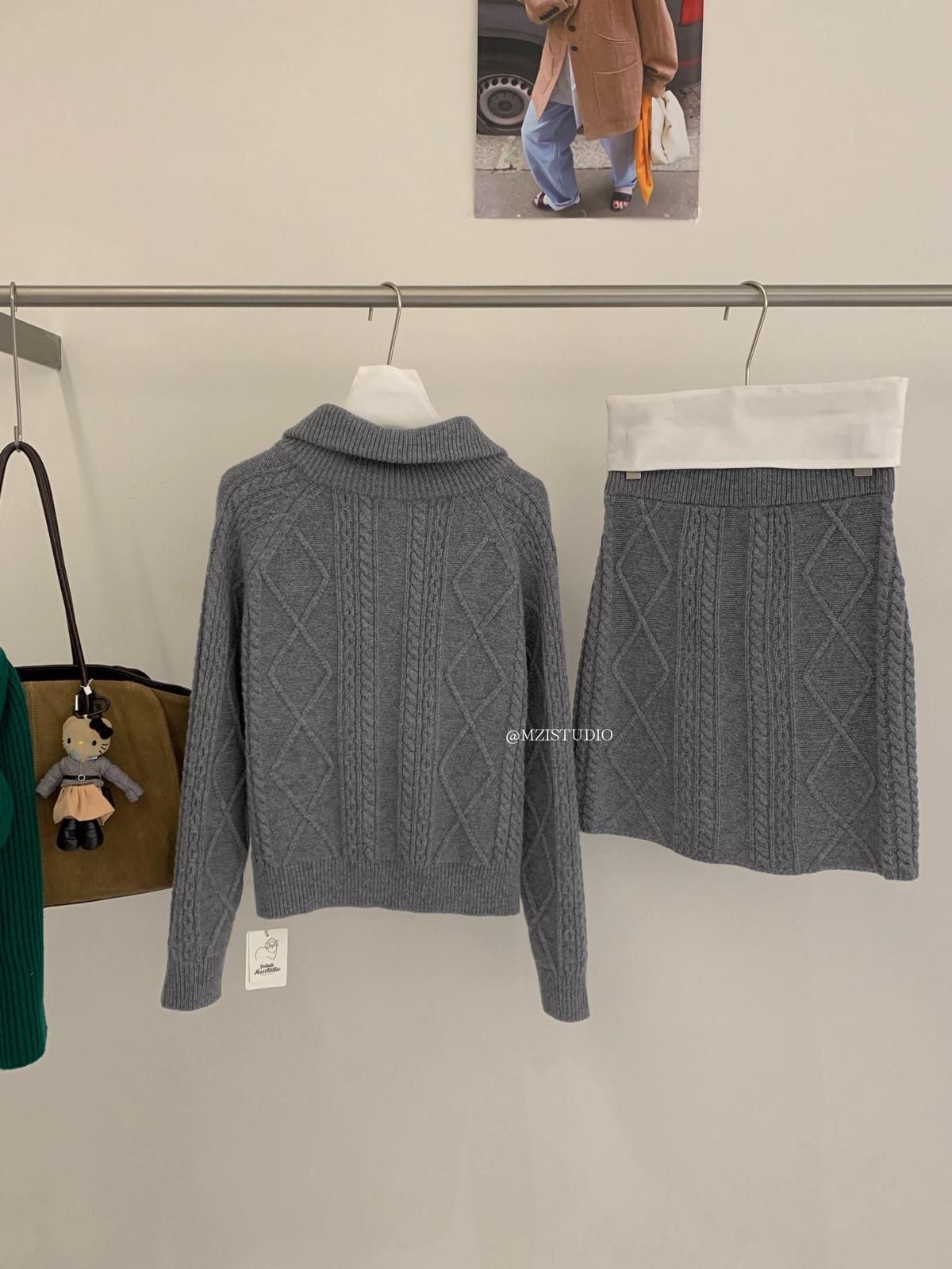 【C8219】高級感立領翻領棒針毛針織衫毛衣+高腰包臀半身裙套裝