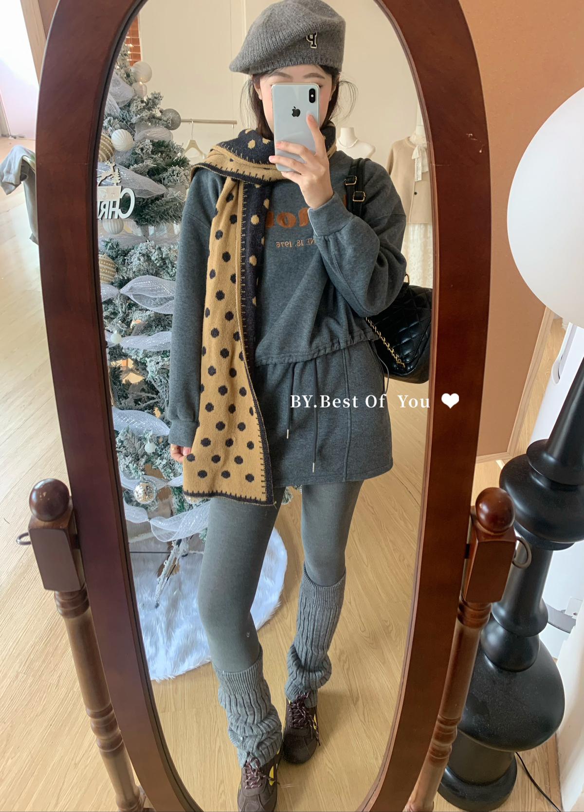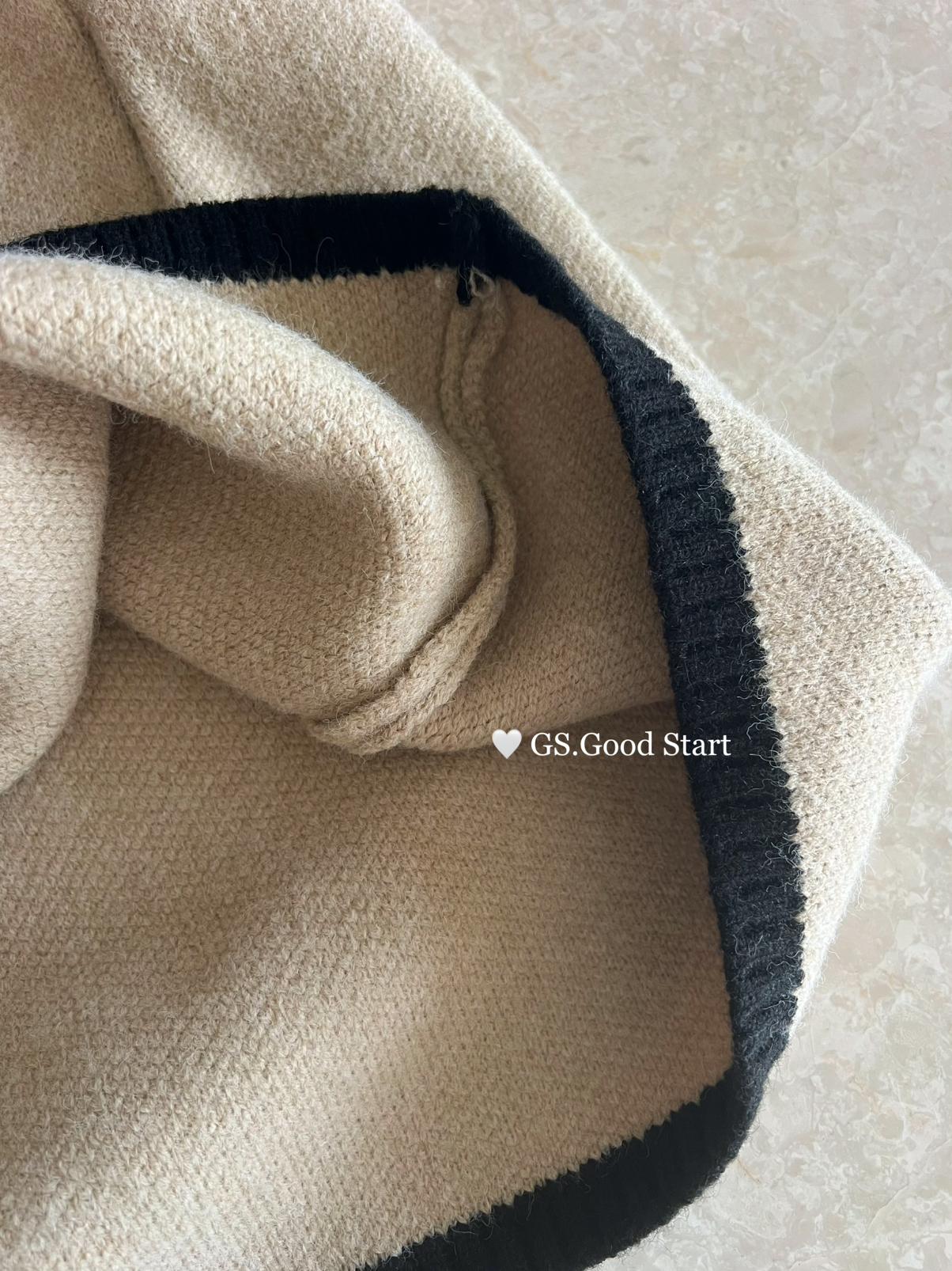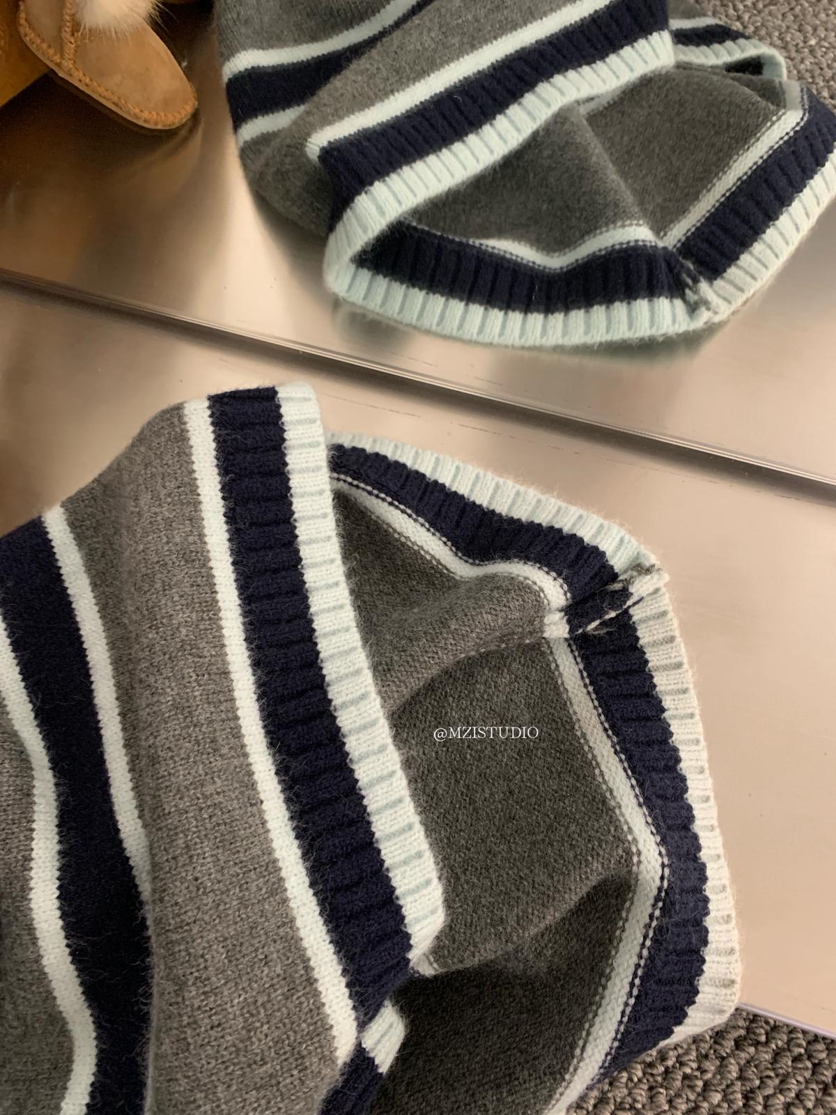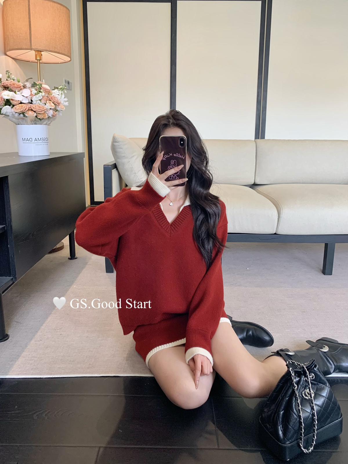 【C8266】洋氣v領撞色寬鬆大版毛衣+短褲加厚針織套裝(配圍巾)
