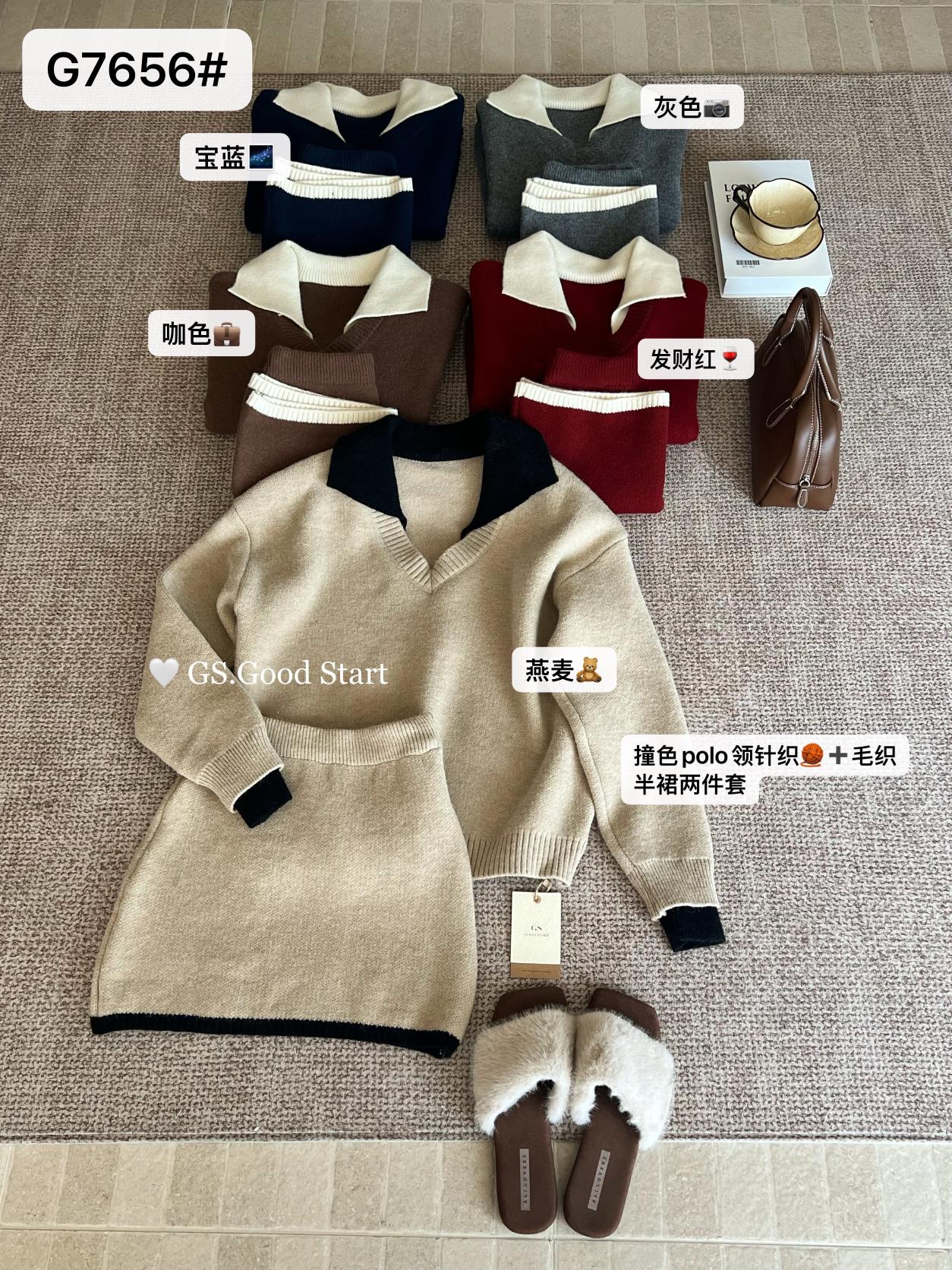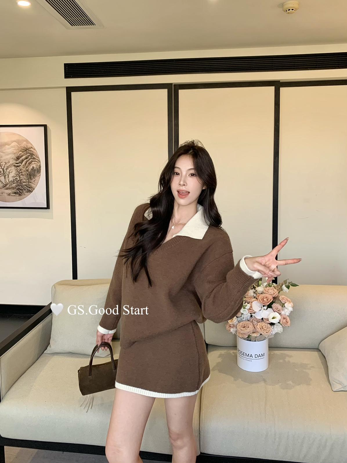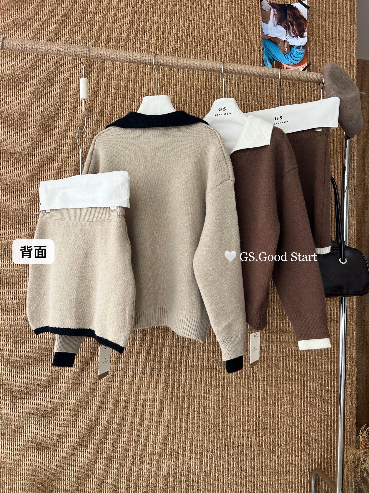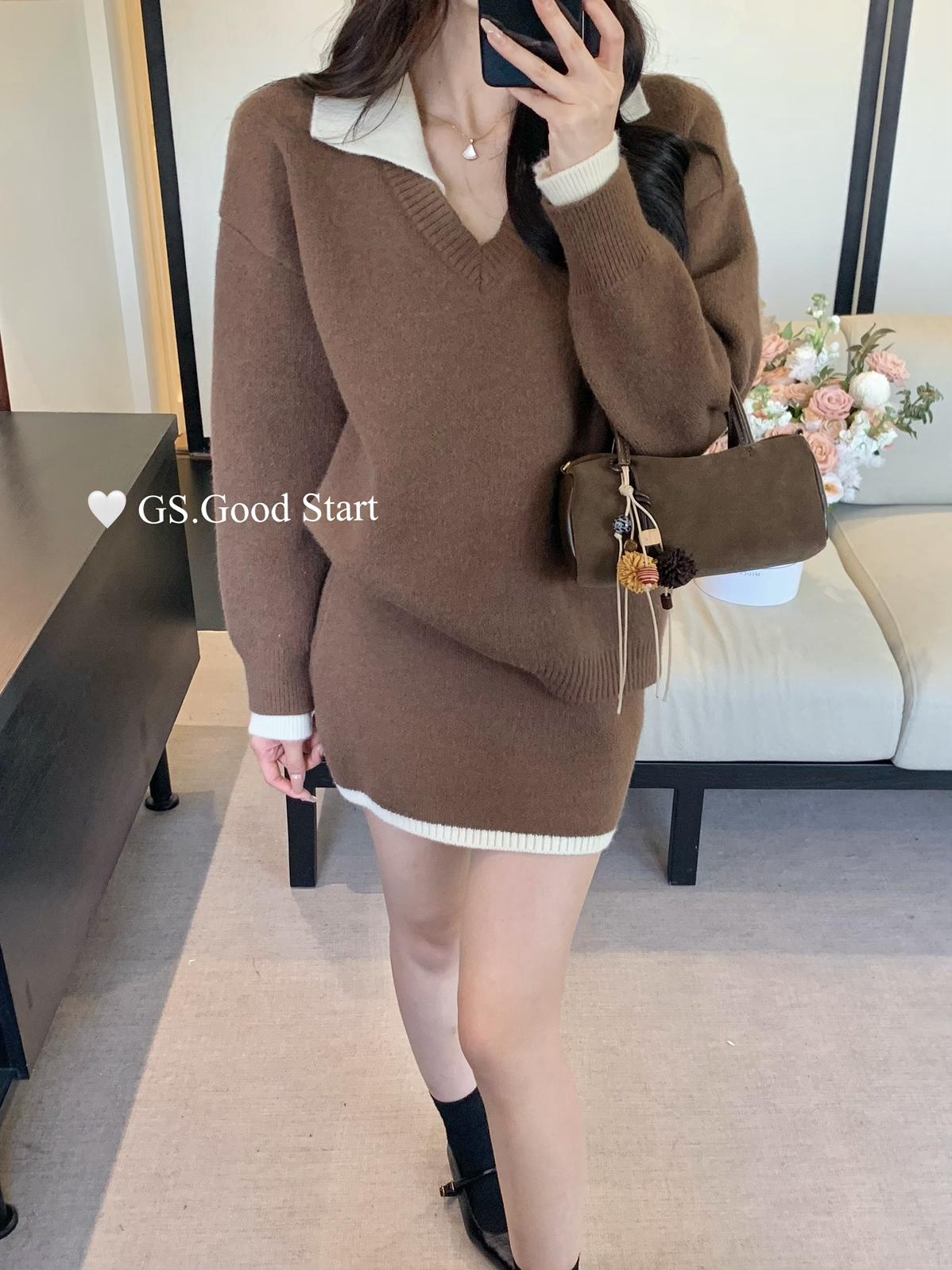 【C7863】人氣選手!拍照都被問鏈接~秋冬休閒學院風撞色針織衫+半身裙套裝