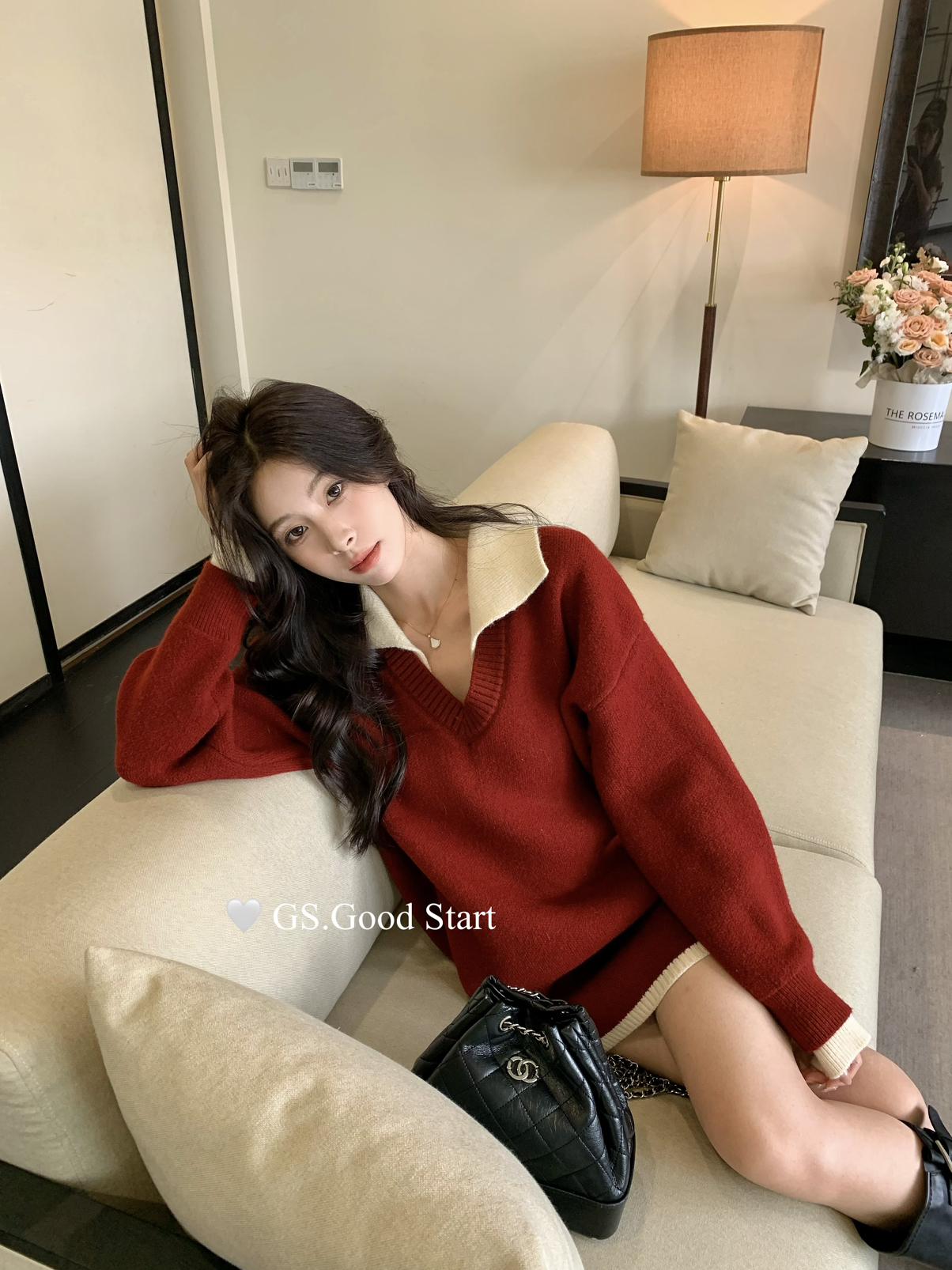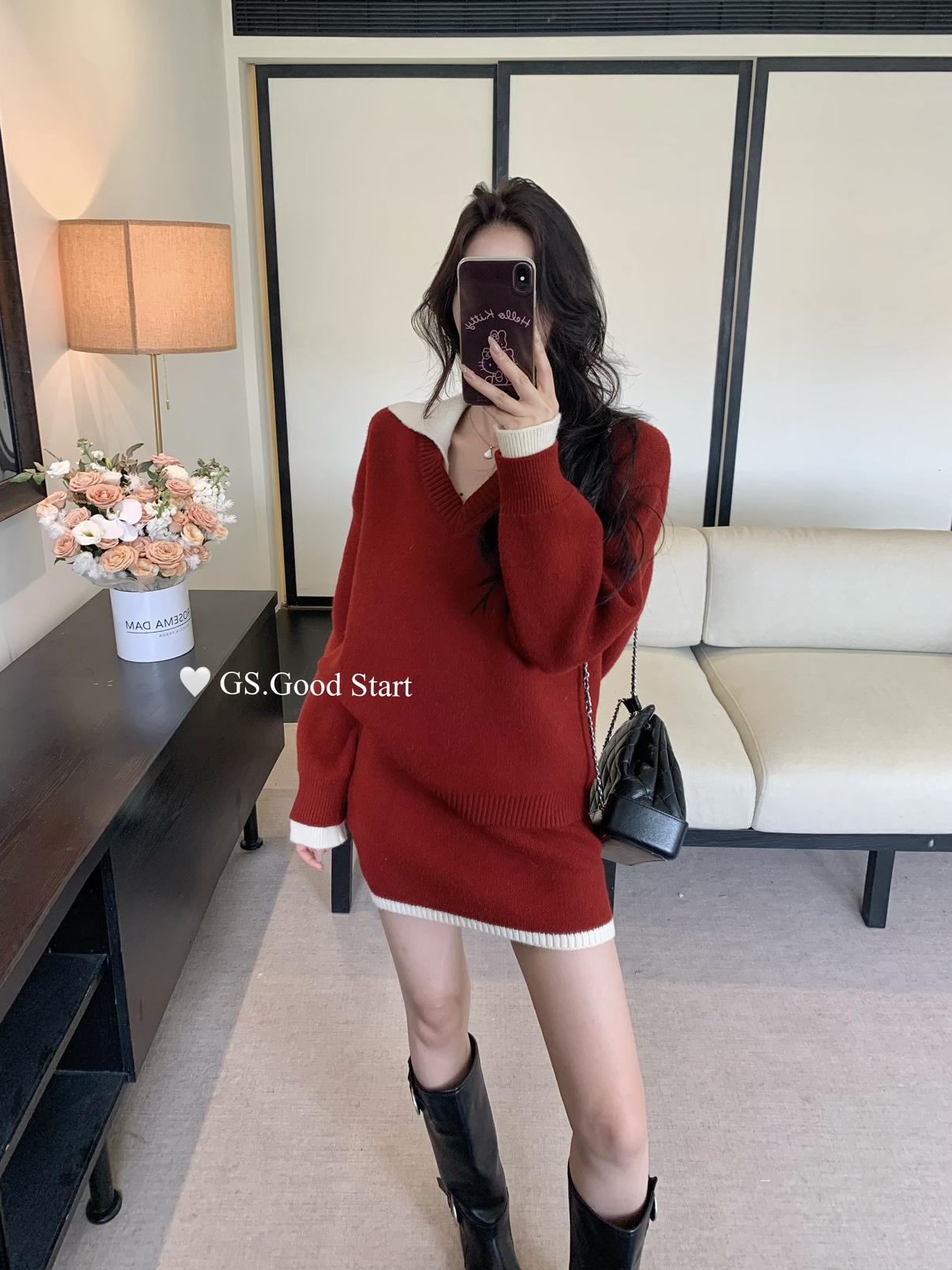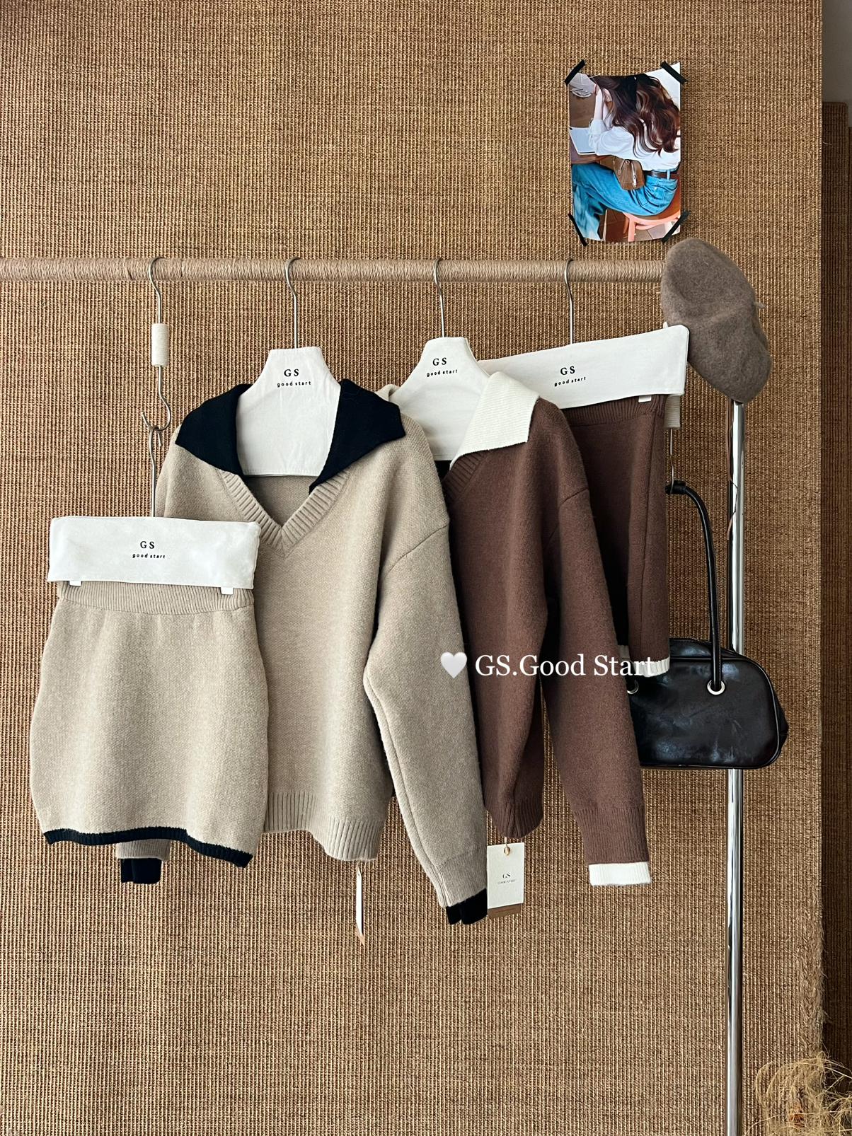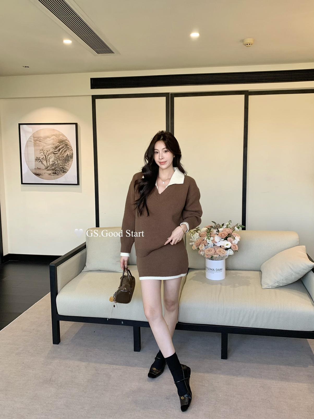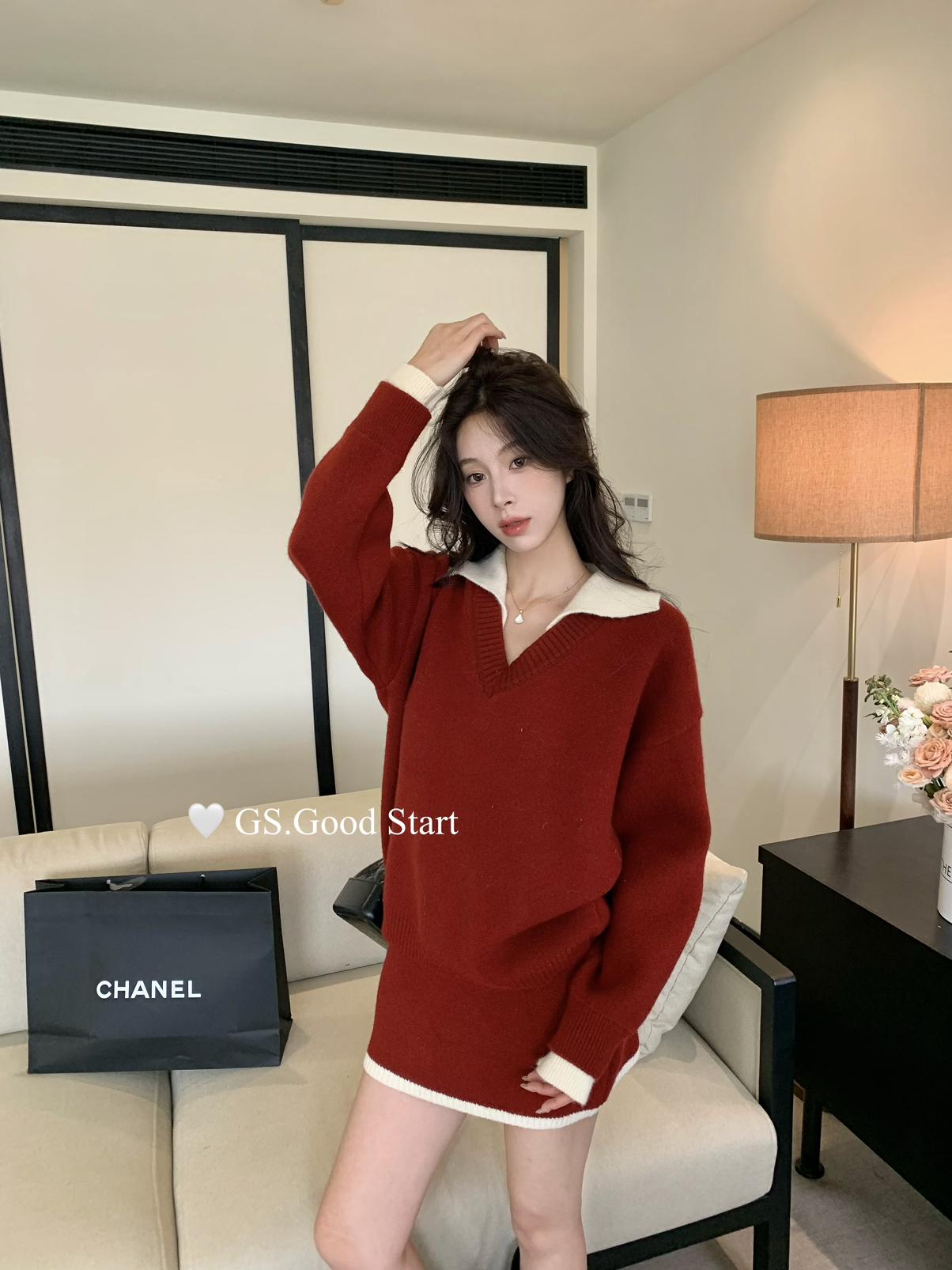 【C7863】人氣選手!拍照都被問鏈接~秋冬休閒學院風撞色針織衫+半身裙套裝