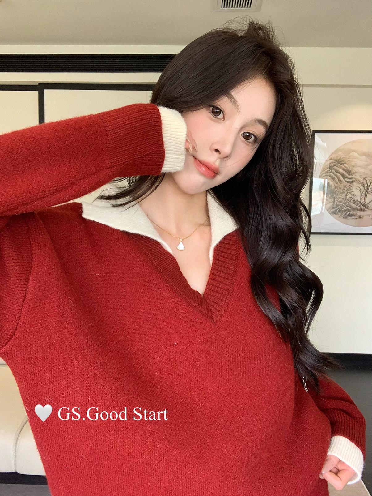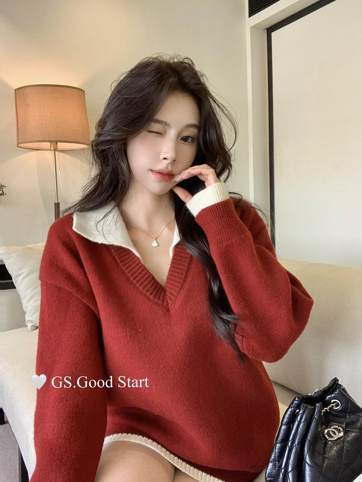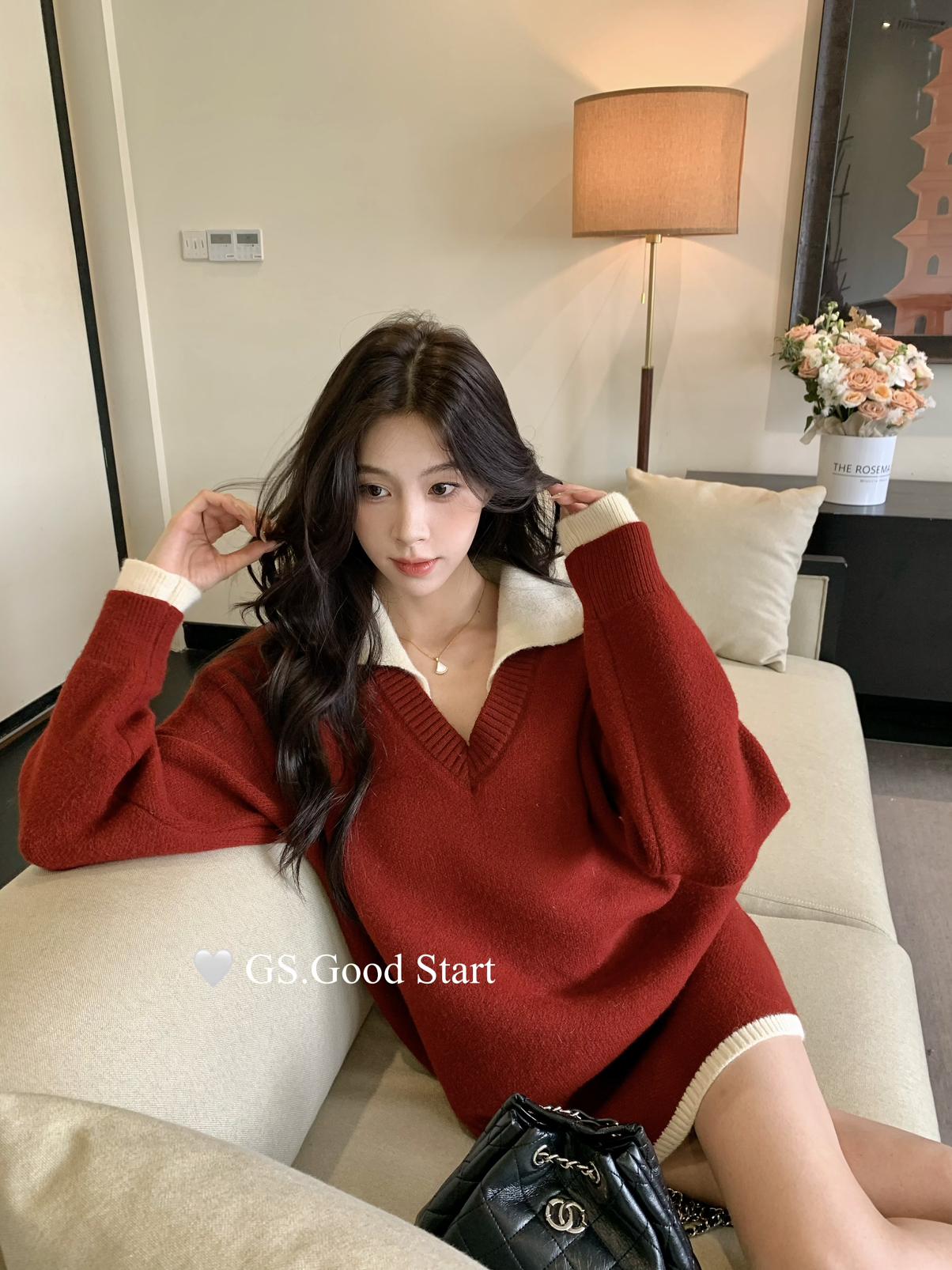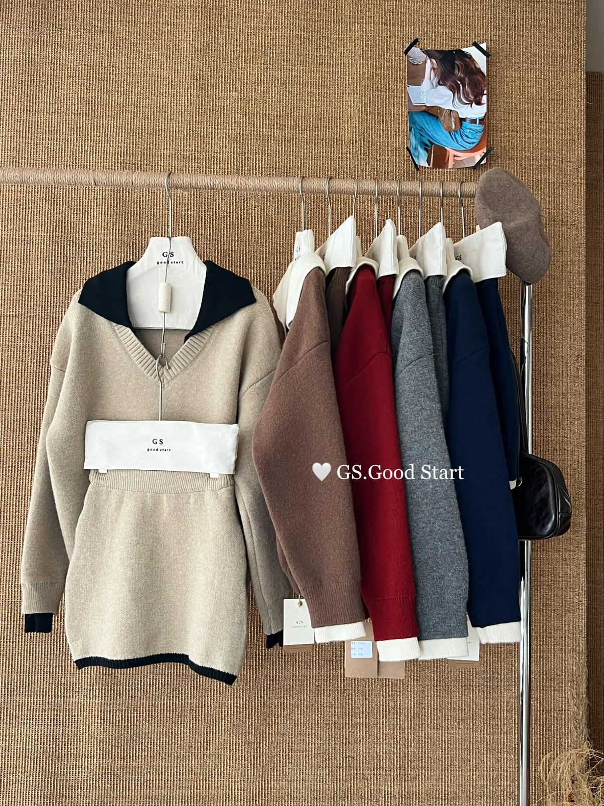 【C7863】人氣選手!拍照都被問鏈接~秋冬休閒學院風撞色針織衫+半身裙套裝