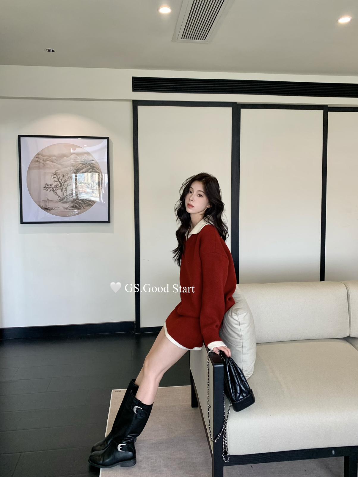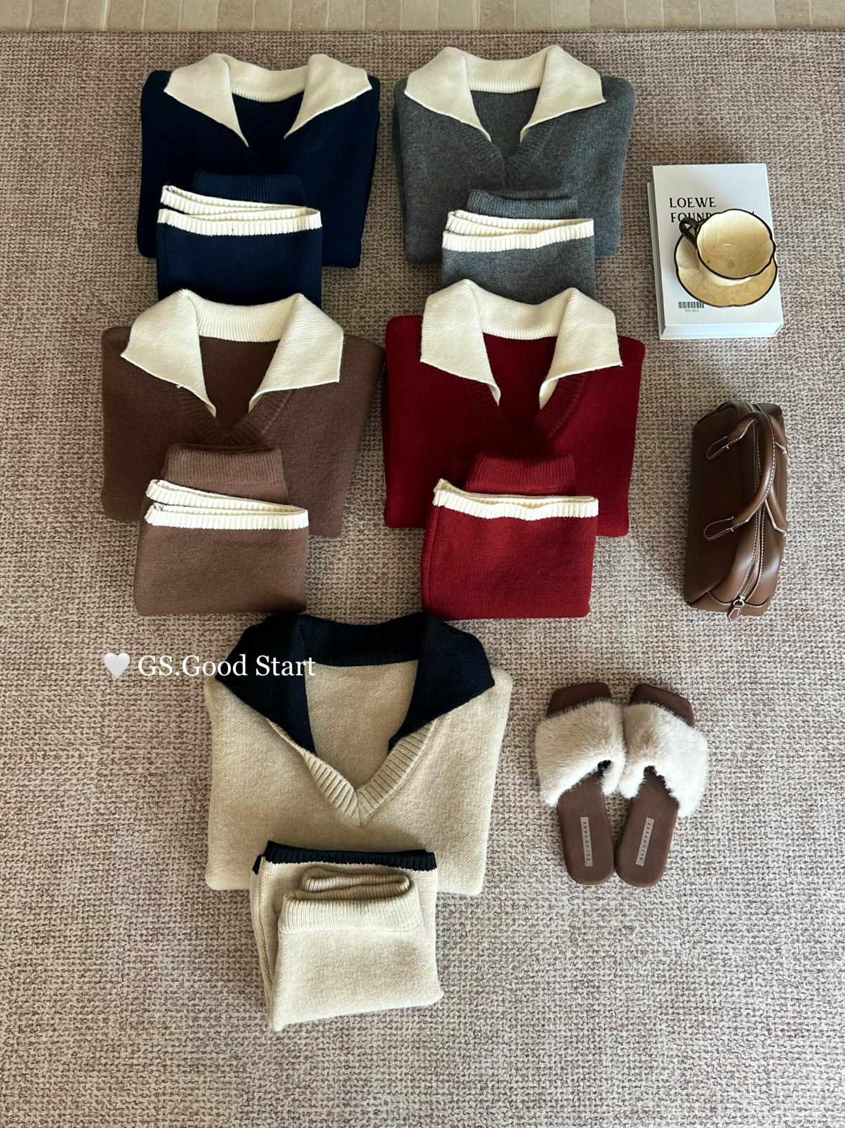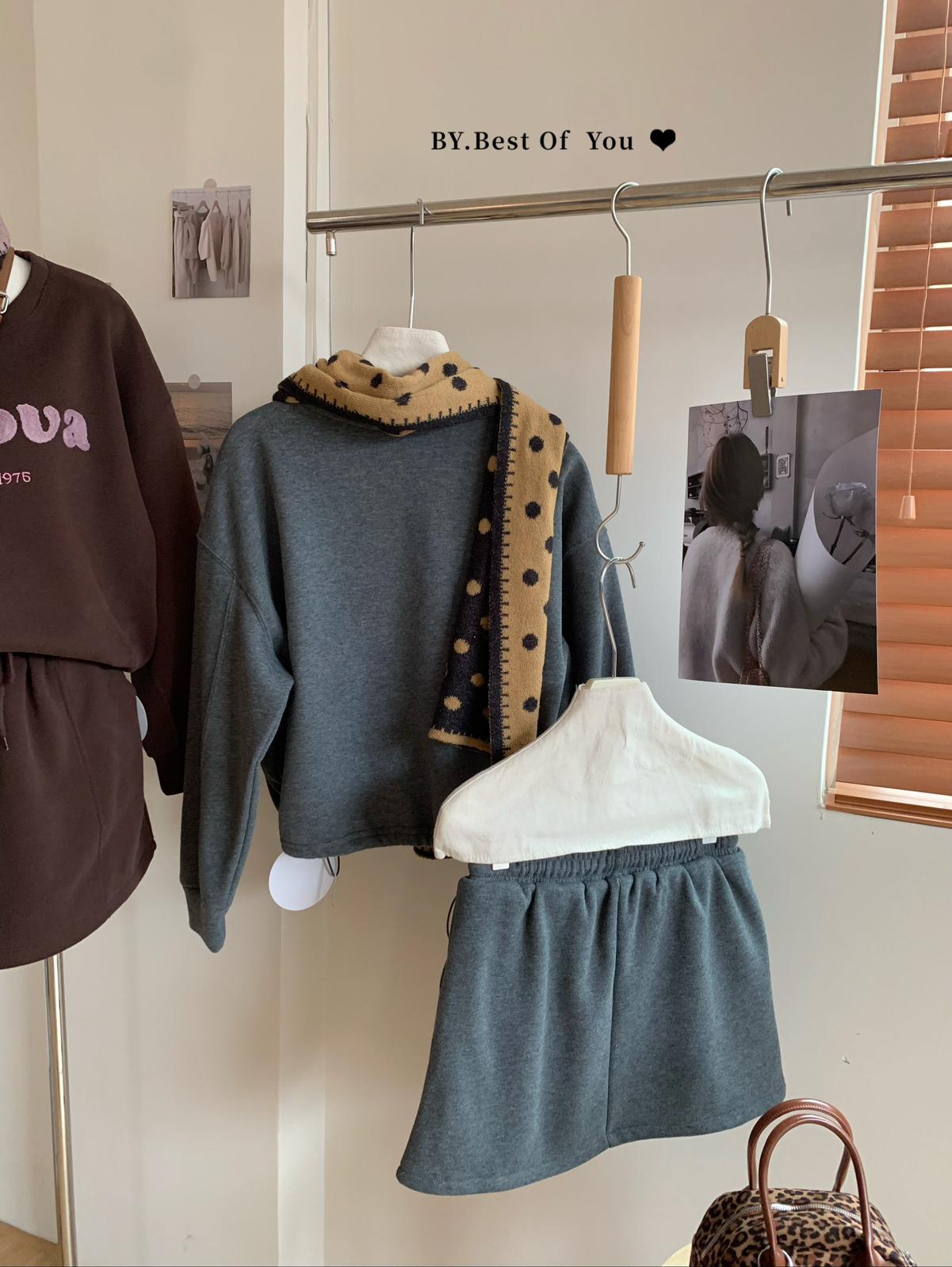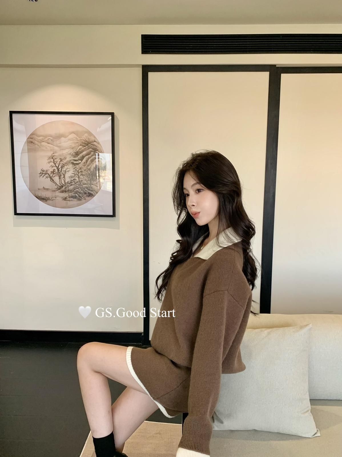 【C8204】「明洞歐尼」巨好看的套裝女慵懶休閒翻領針織毛衣+高腰休閒短褲套裝