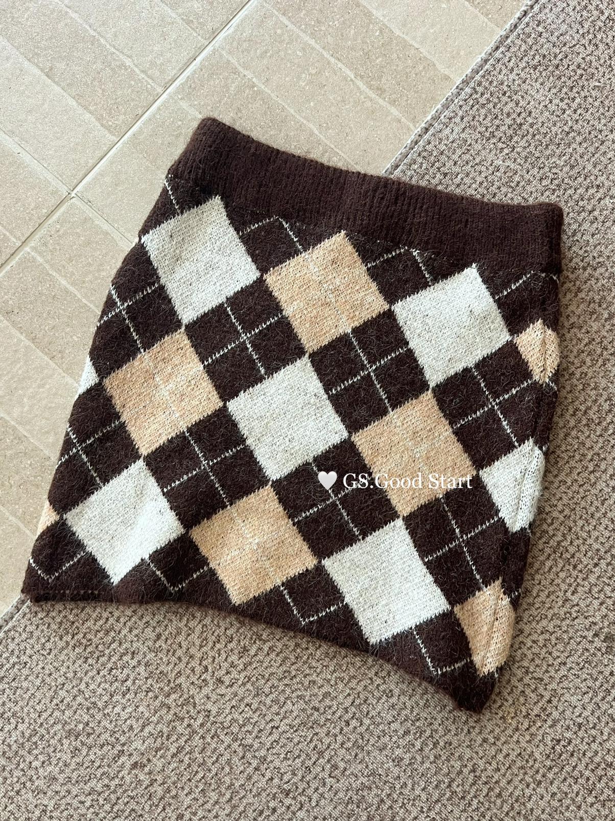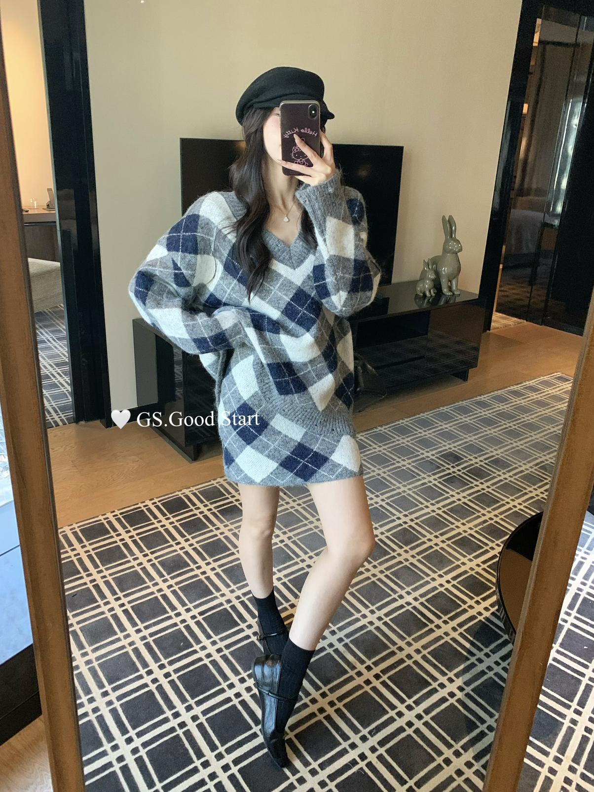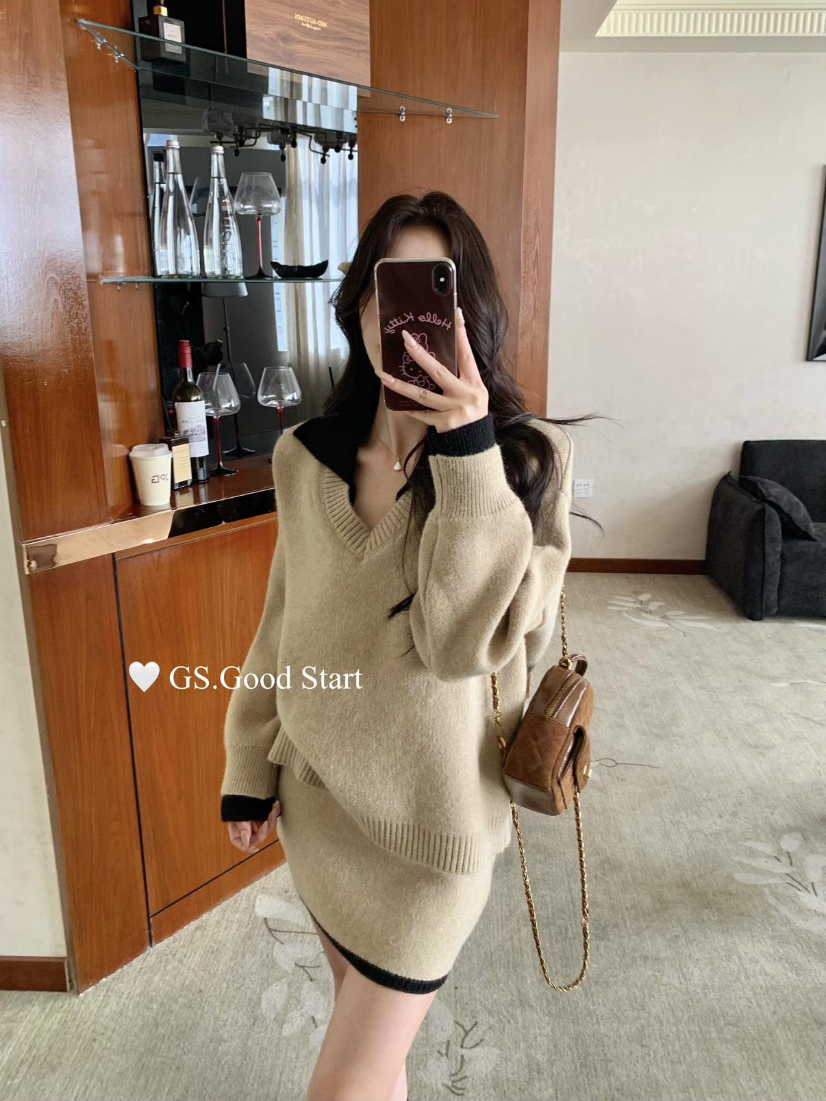 【C8221】格菱布朗尼 撞色菱格V領毛衣+包臀半身裙套裝