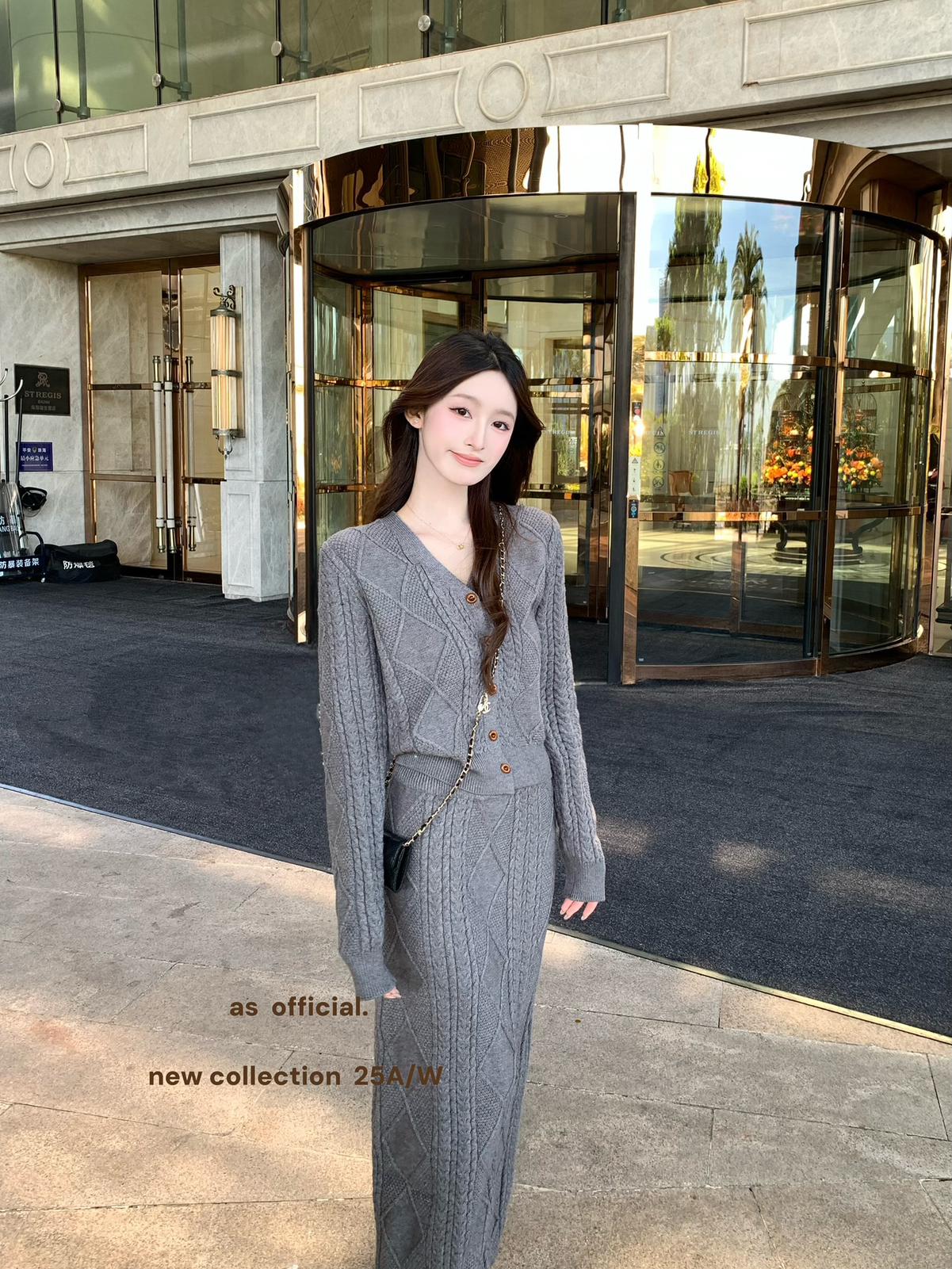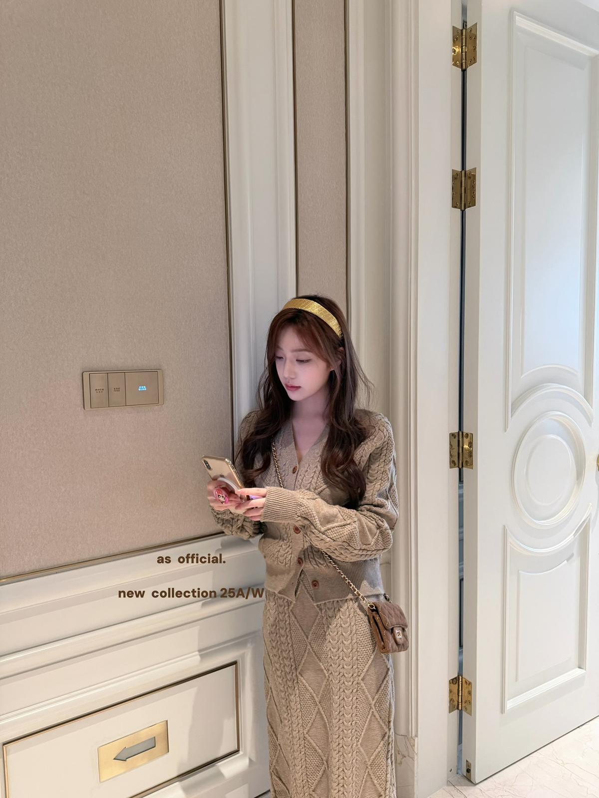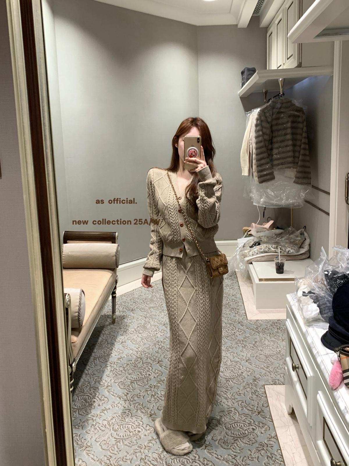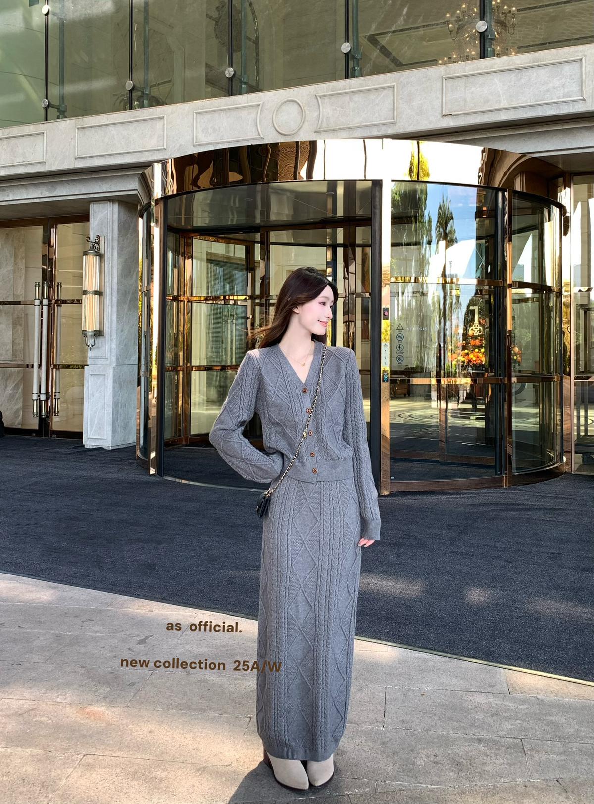 【C8034】高級感氣質開衫毛衣+中長款連衣裙套裝(含5%羊毛)