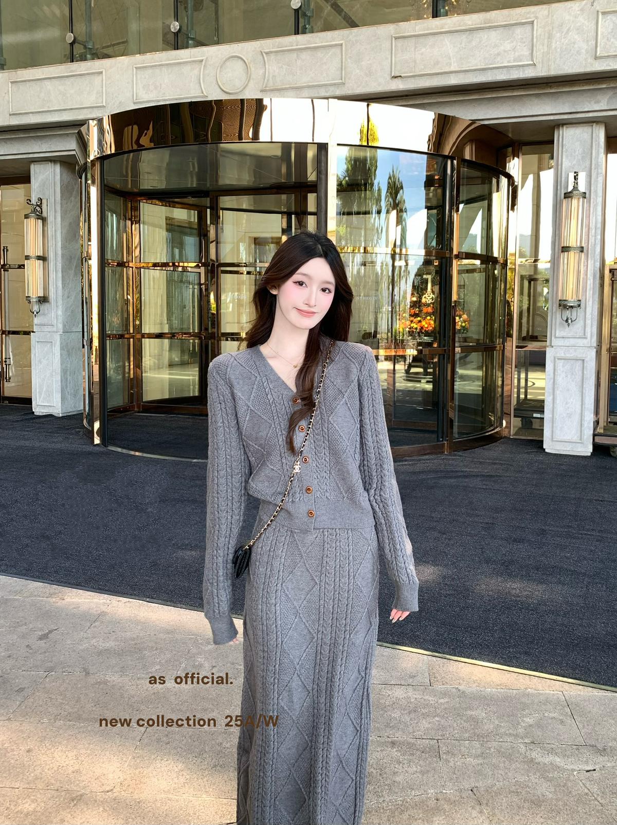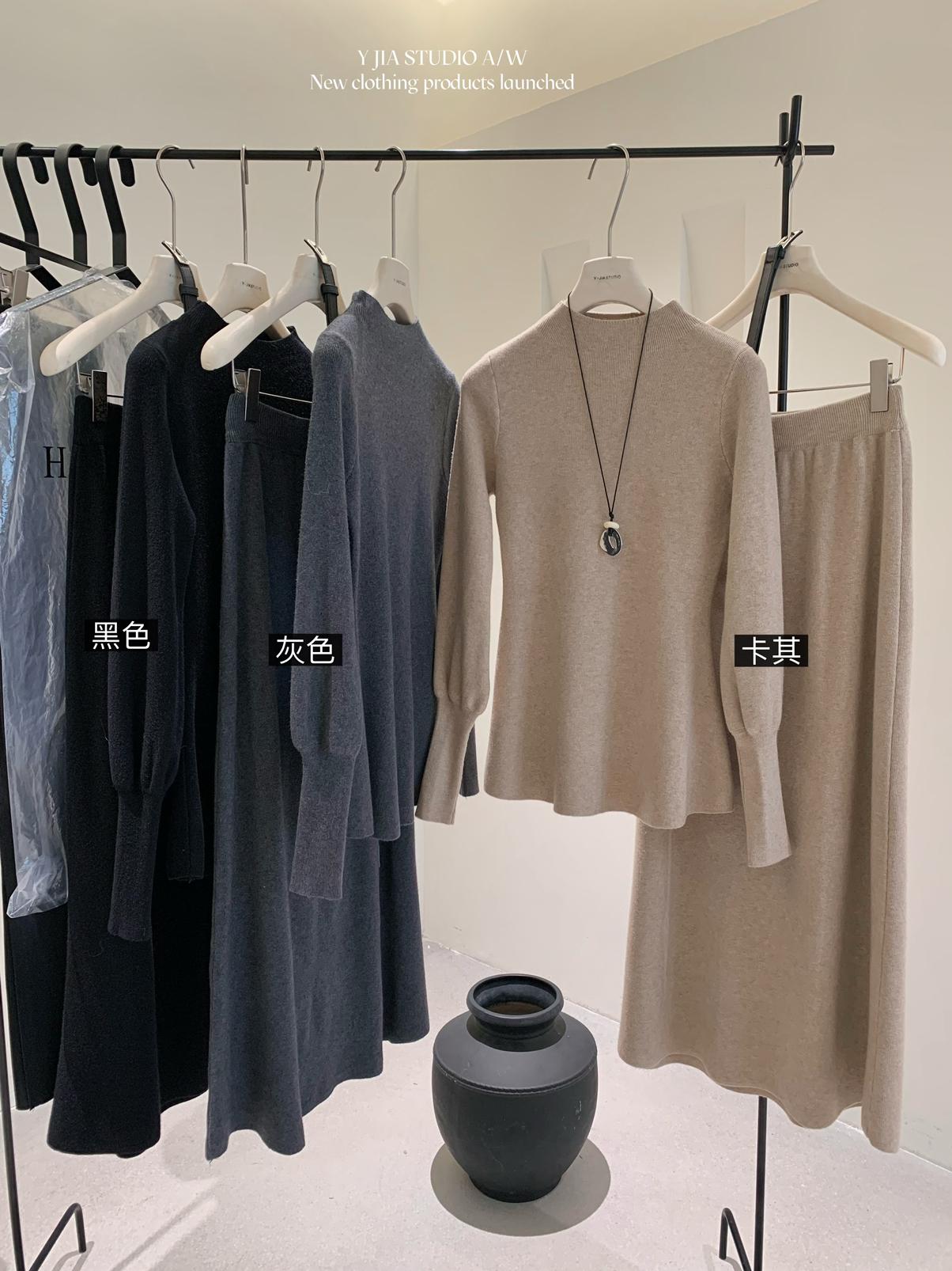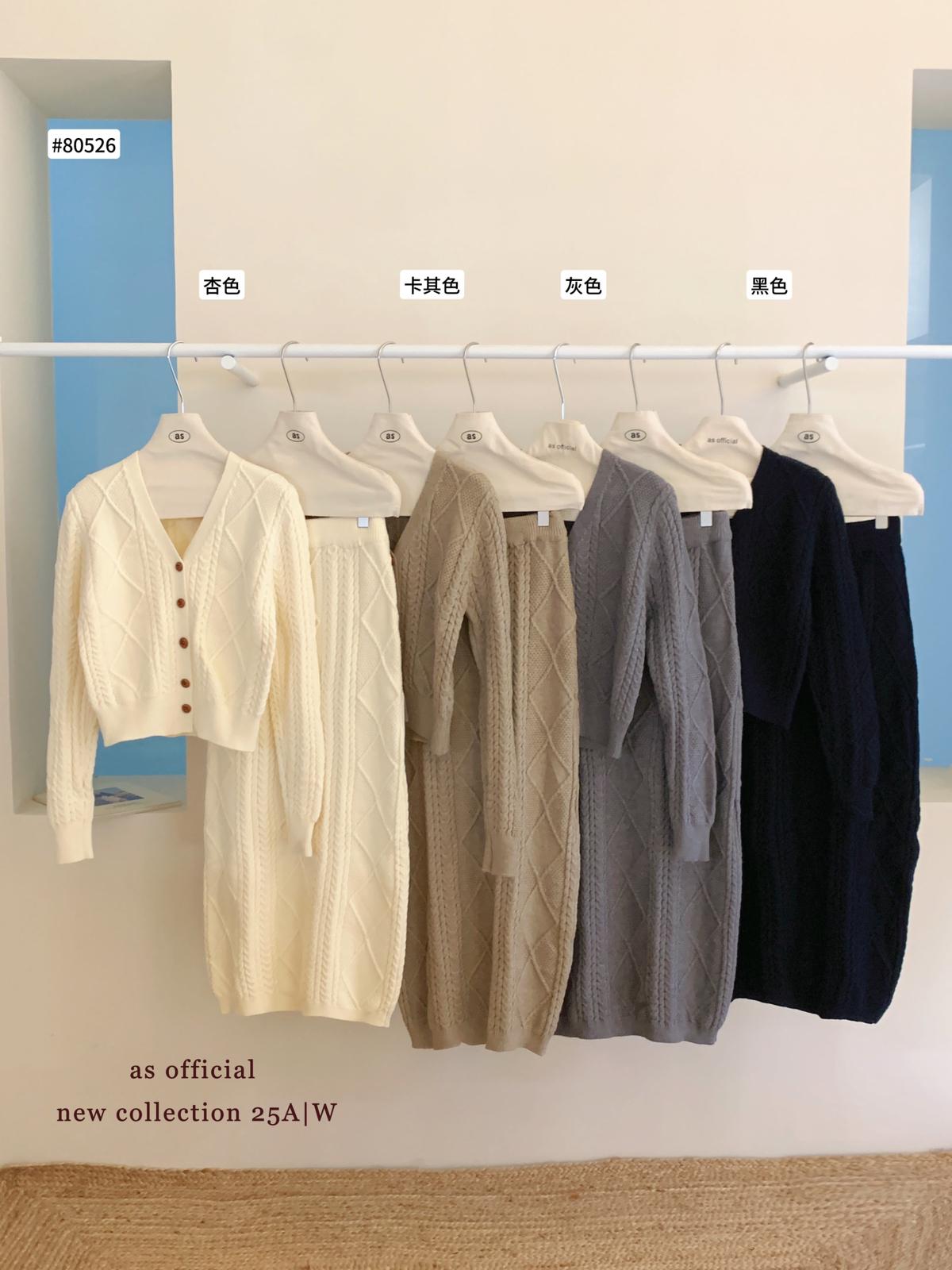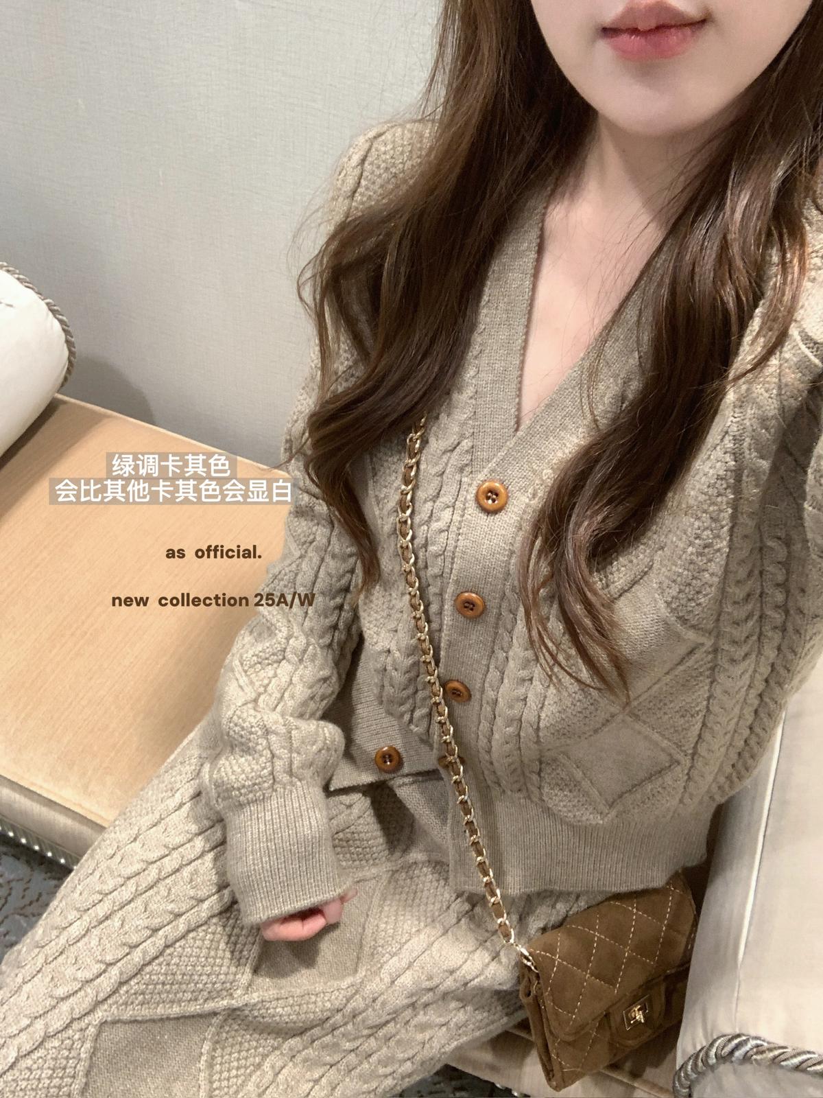 【C8034】高級感氣質開衫毛衣+中長款連衣裙套裝(含5%羊毛)