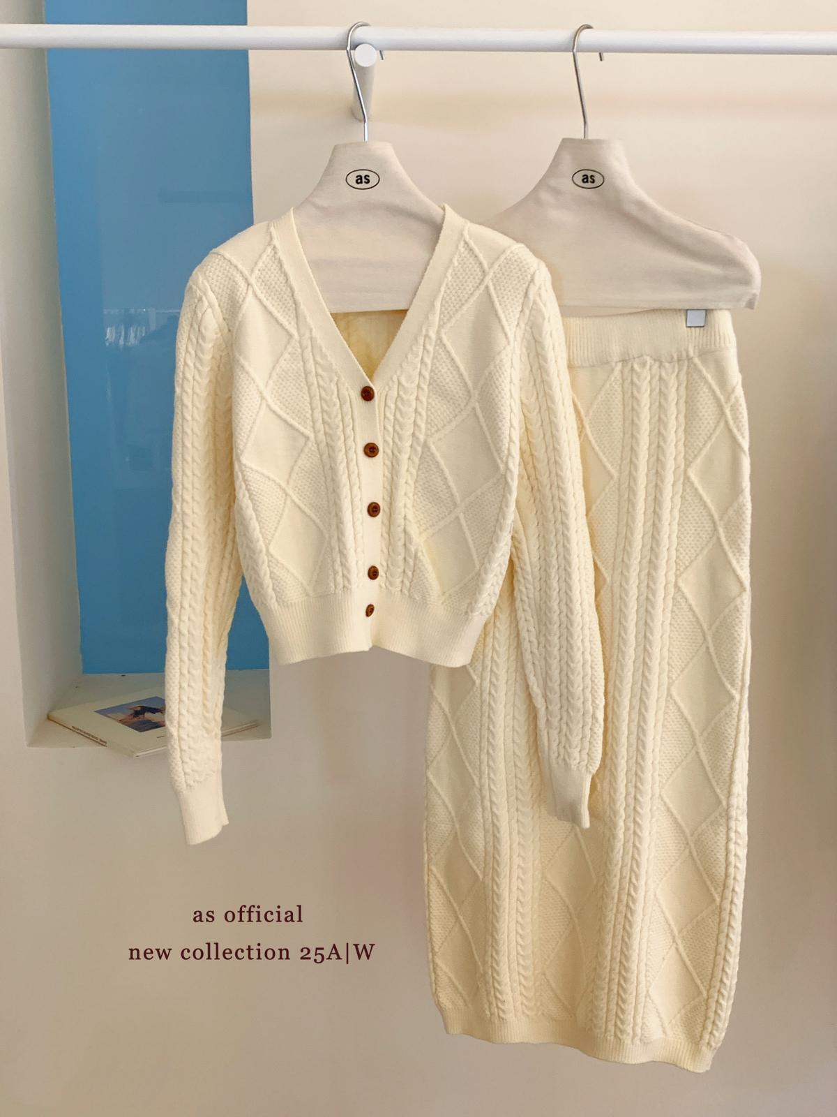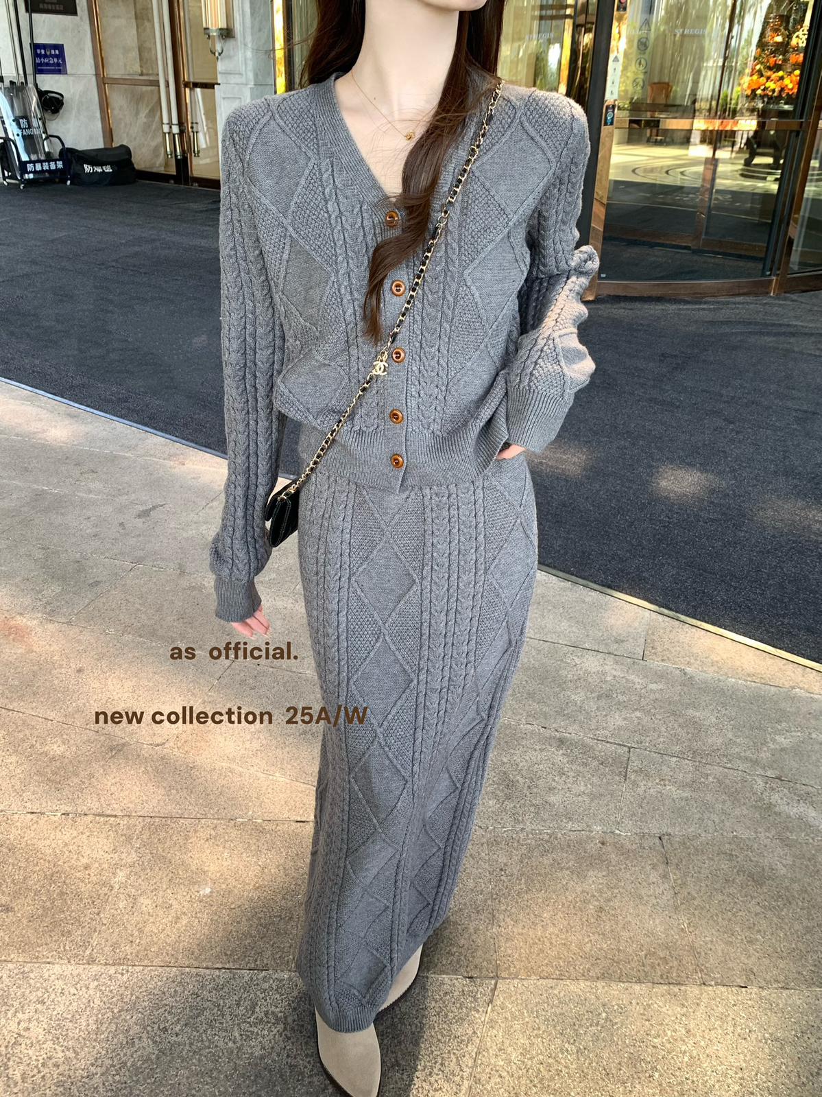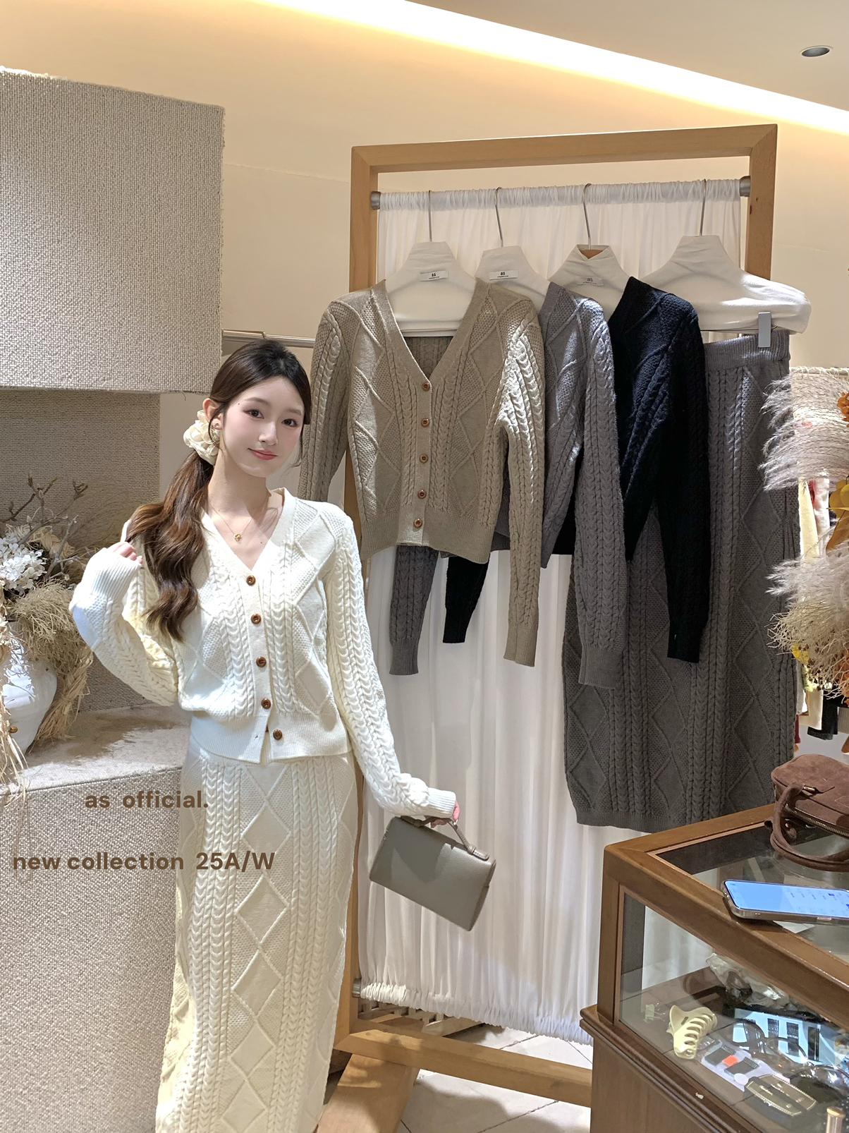 【C7789】超有氣質!菱格針織開衫+圓領背心+高腰半身裙三件套套裝