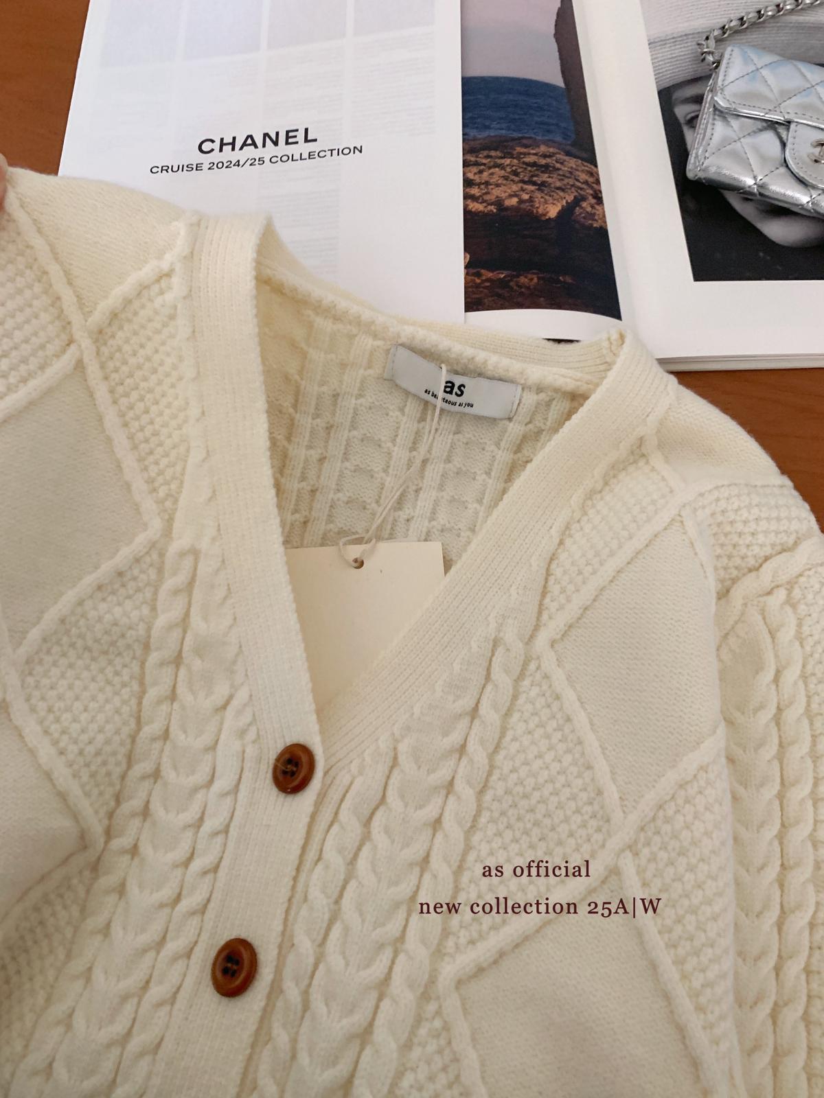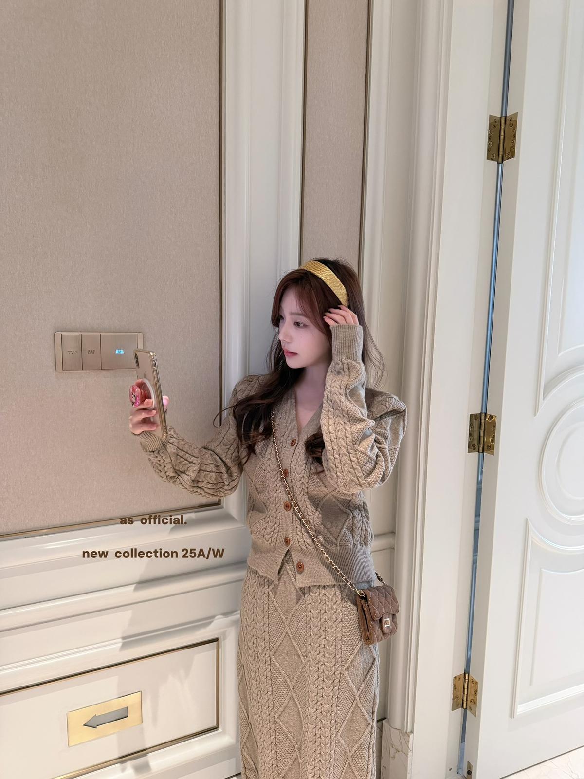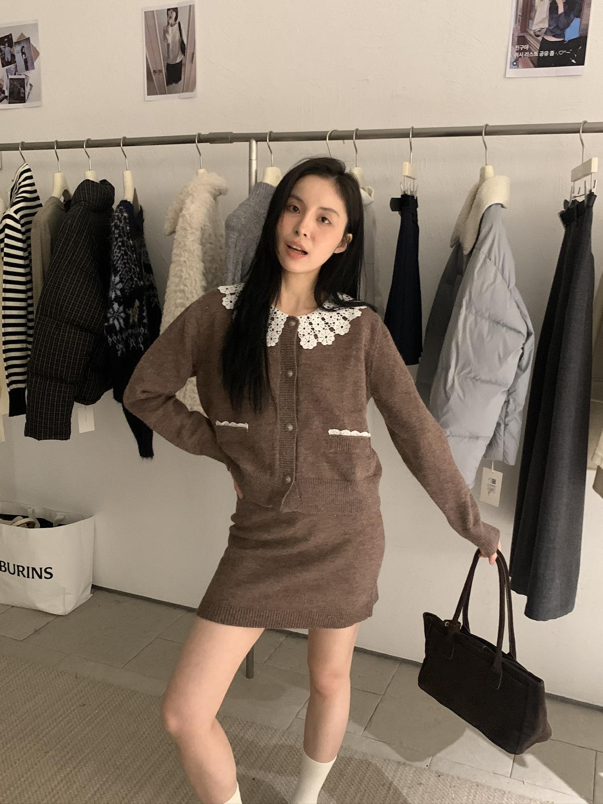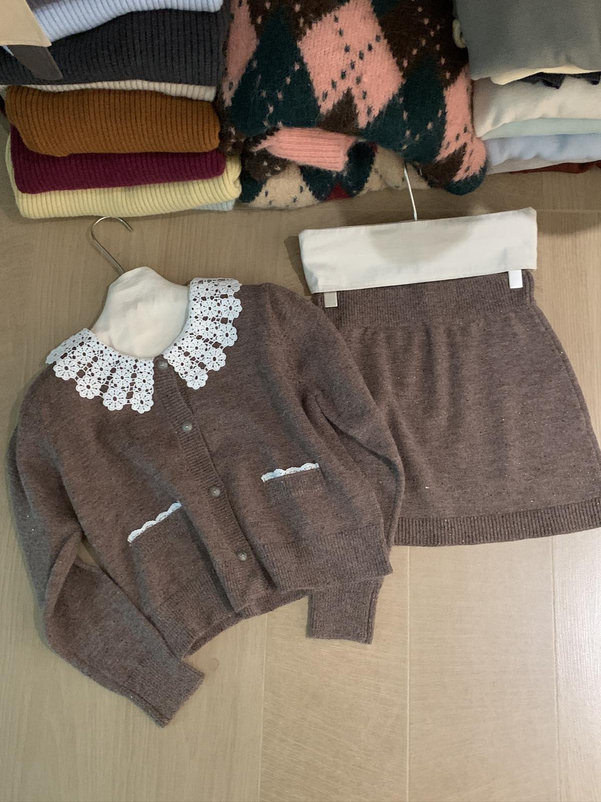 【C8033】韓系復古甜美花邊開衫毛衣+高腰半身裙套裝