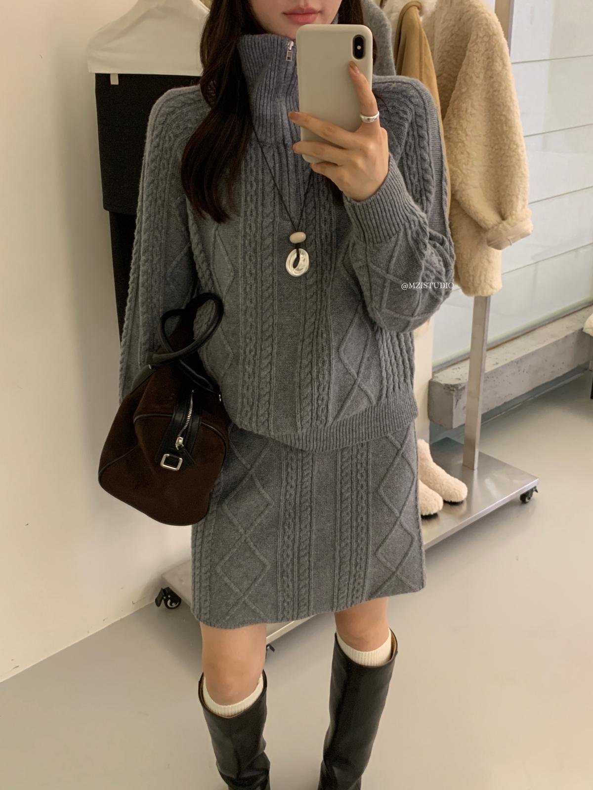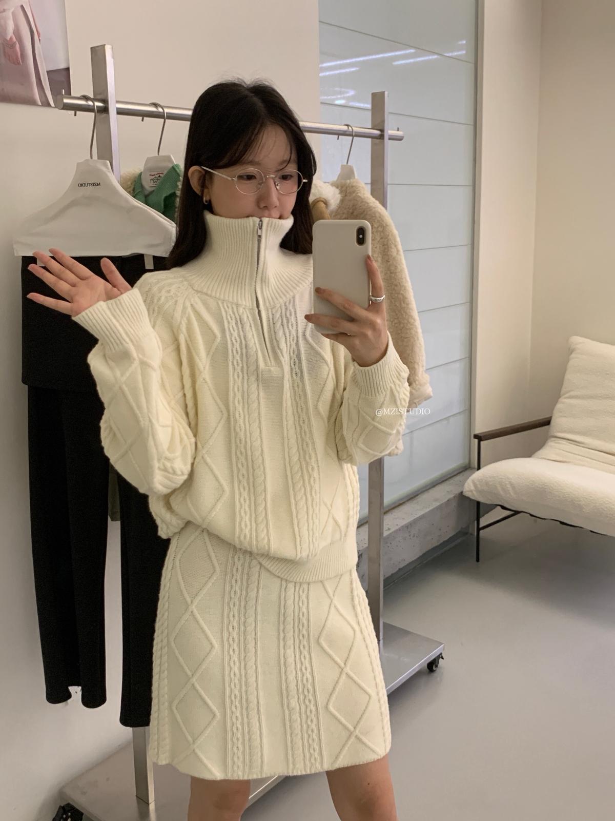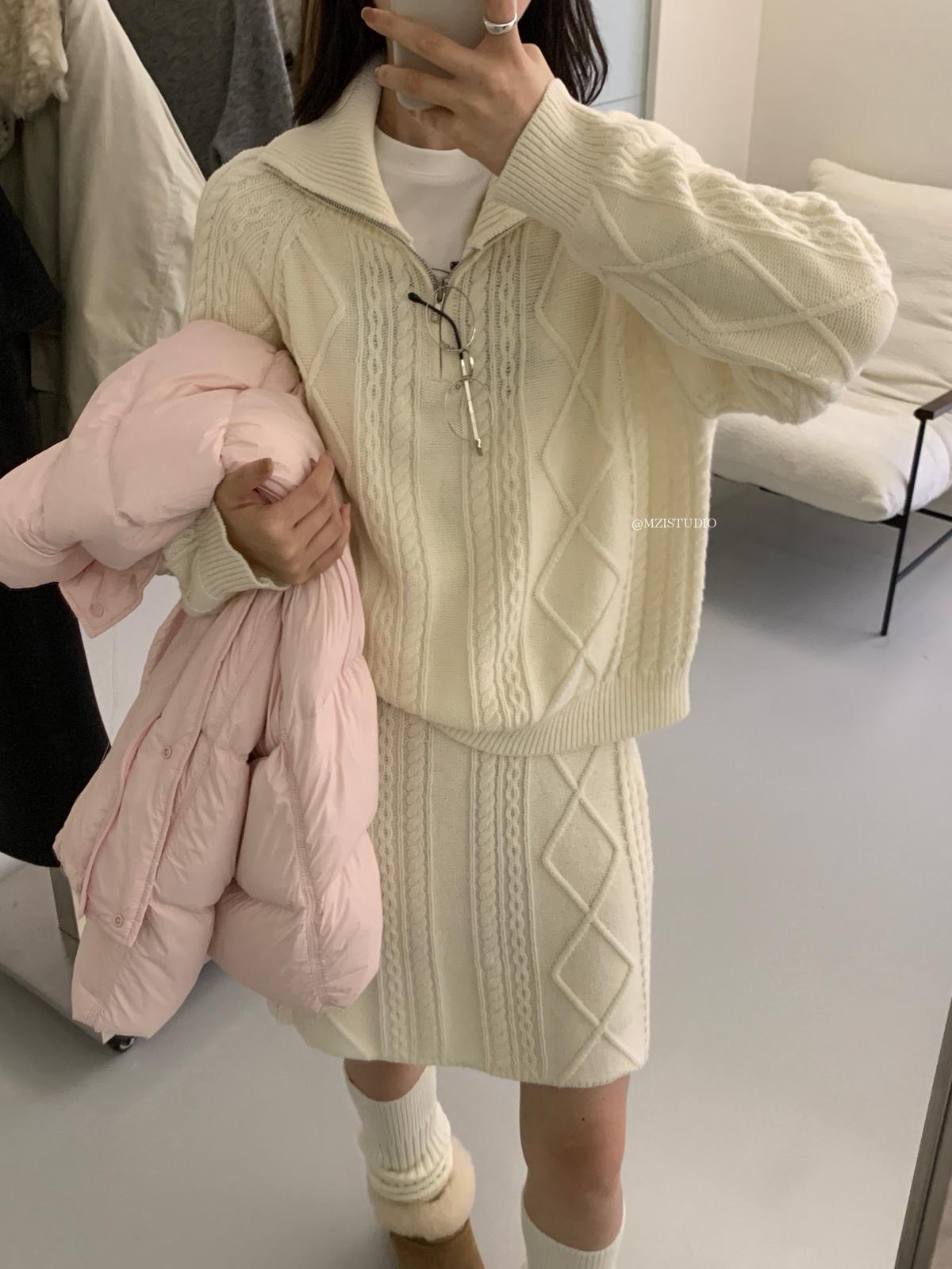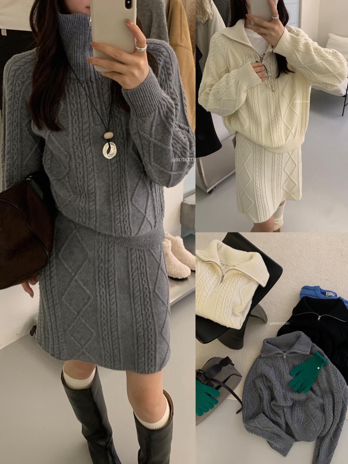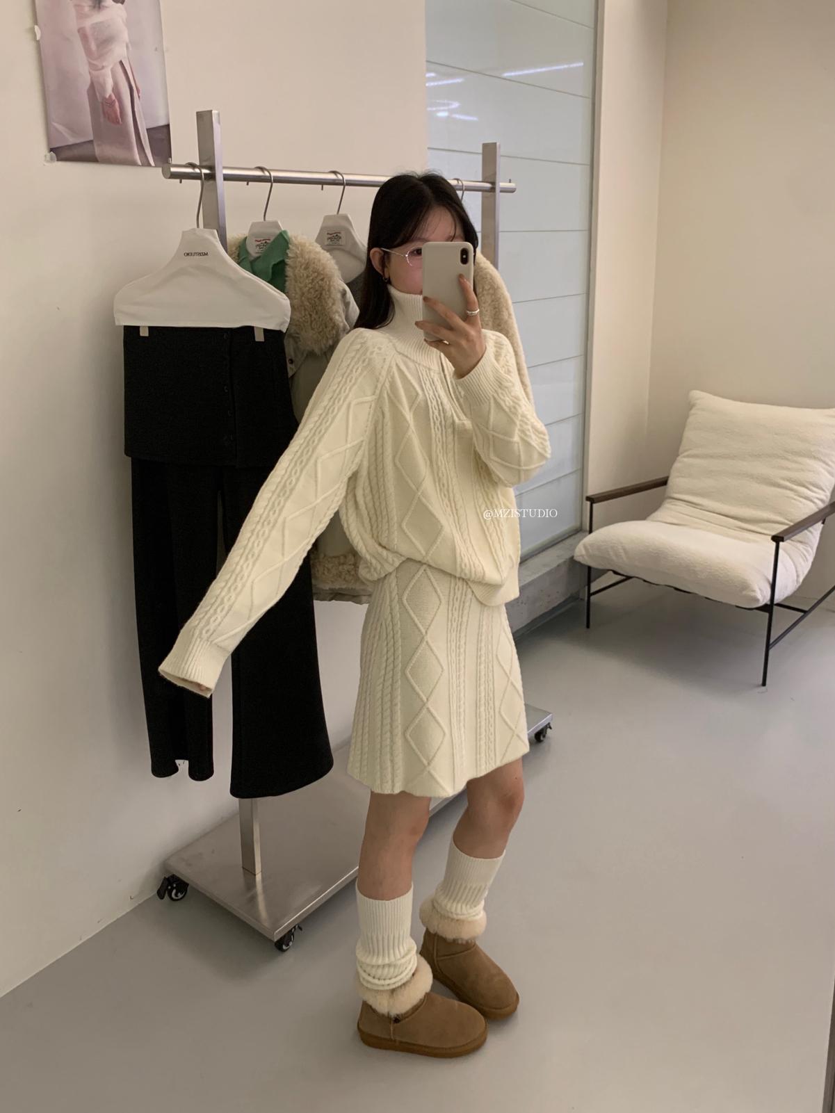 【C7902】冬日樂章韓系重工麻花乾淨溫柔系高領半拉鍊毛衣+包臀顯瘦半身裙套裝