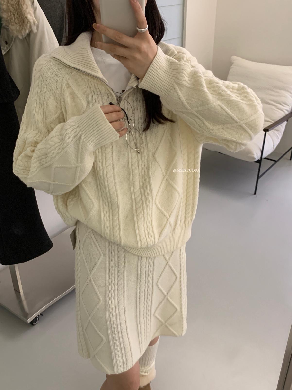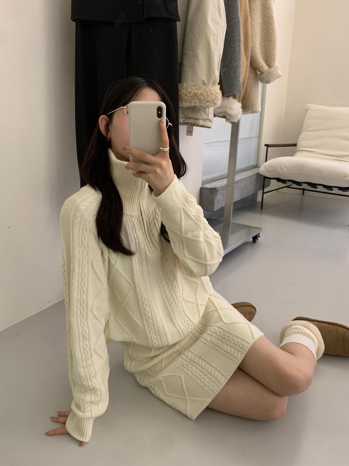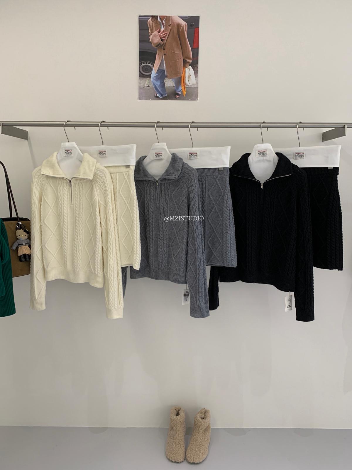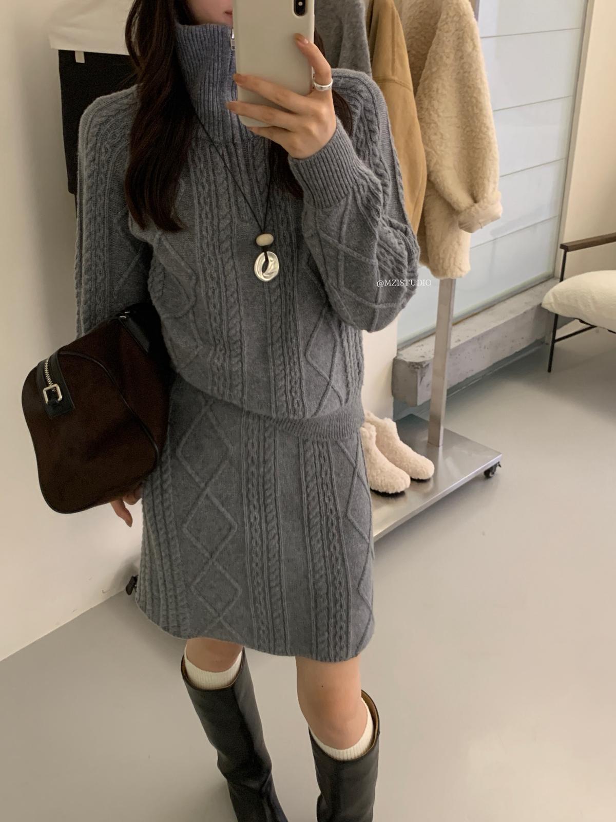 【C7902】冬日樂章韓系重工麻花乾淨溫柔系高領半拉鍊毛衣+包臀顯瘦半身裙套裝