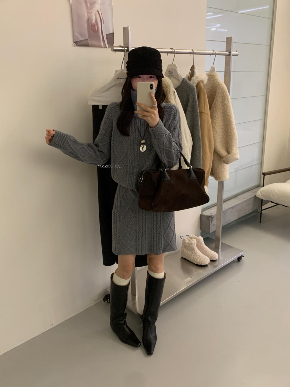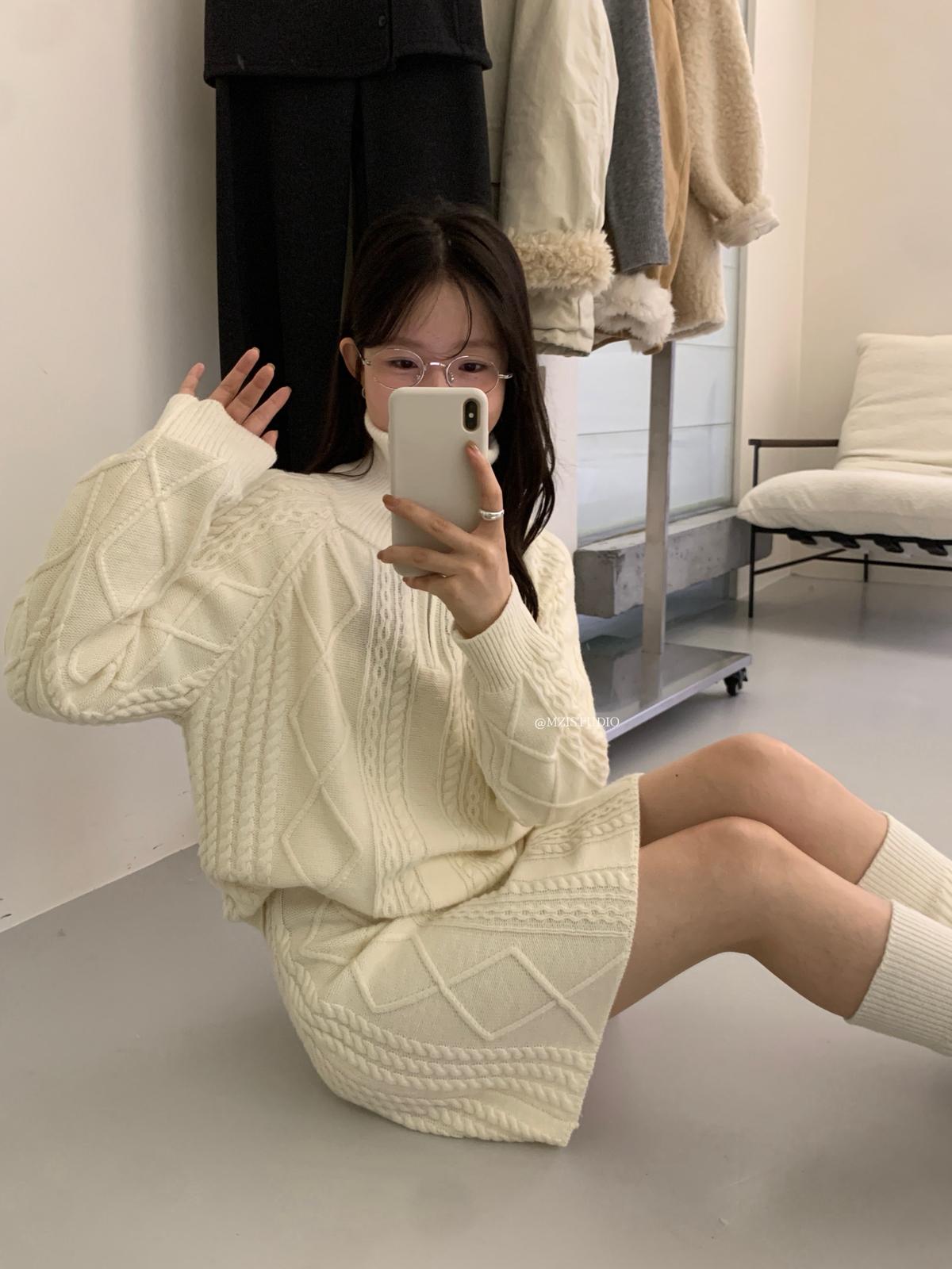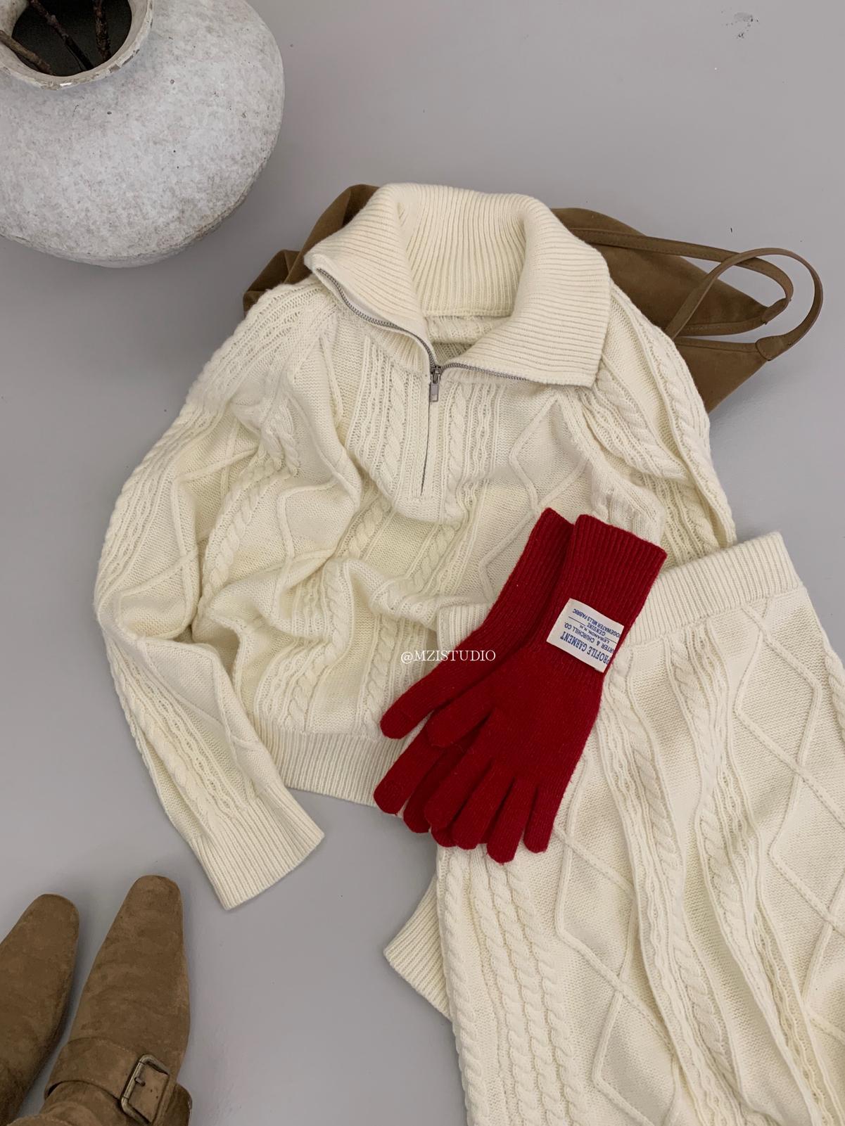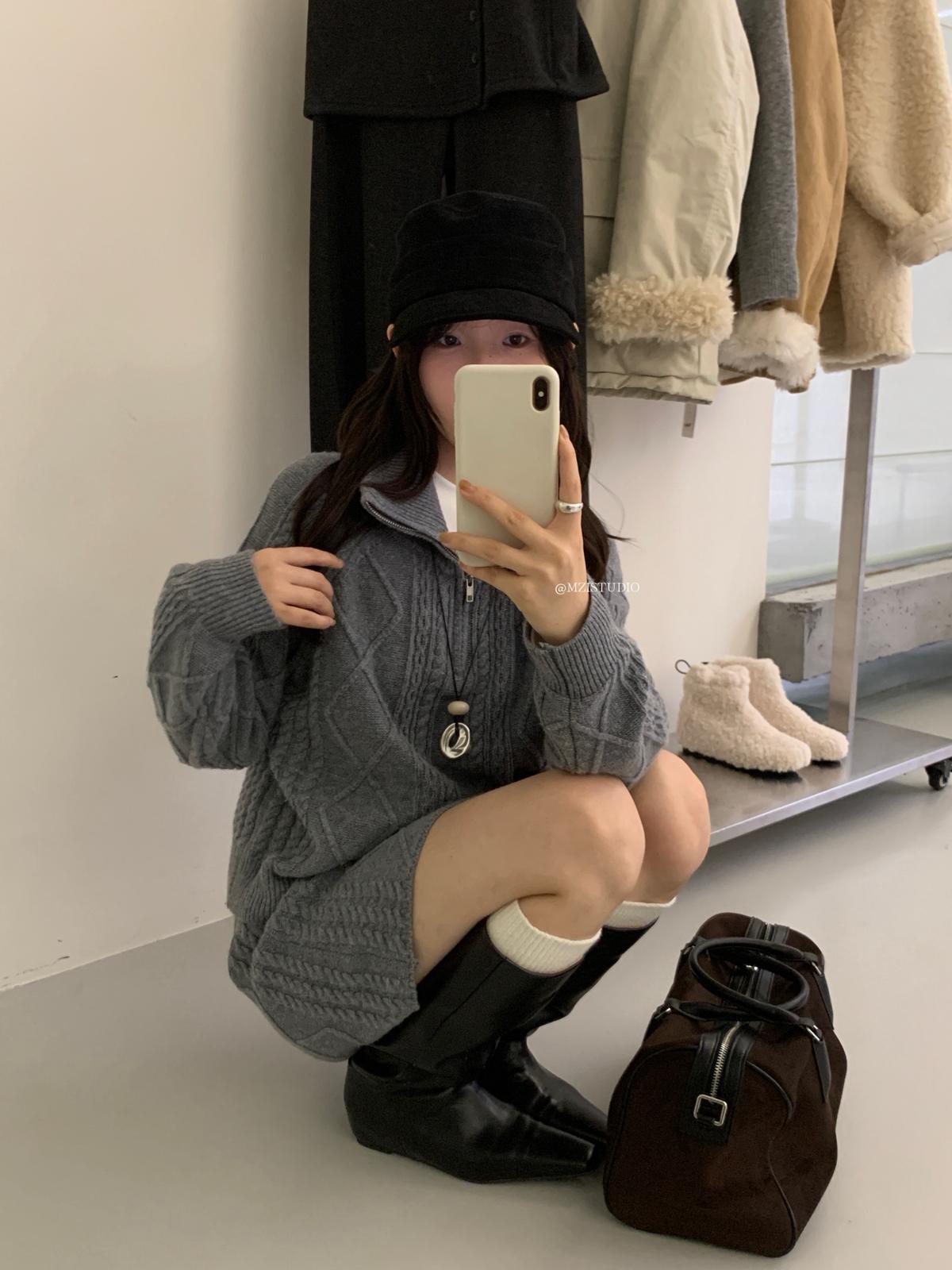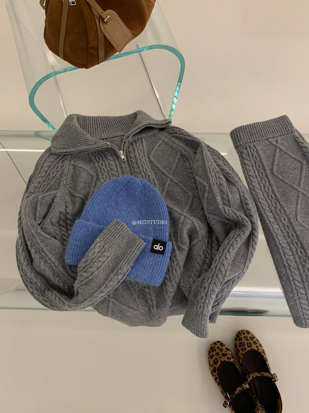 【C7902】冬日樂章韓系重工麻花乾淨溫柔系高領半拉鍊毛衣+包臀顯瘦半身裙套裝
