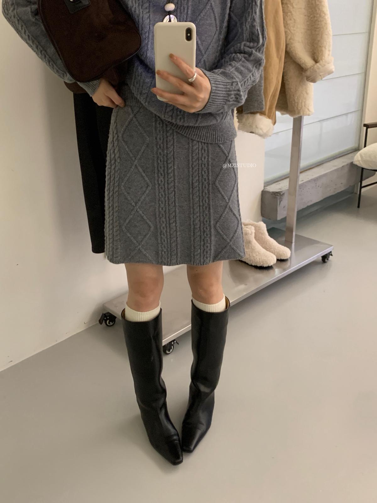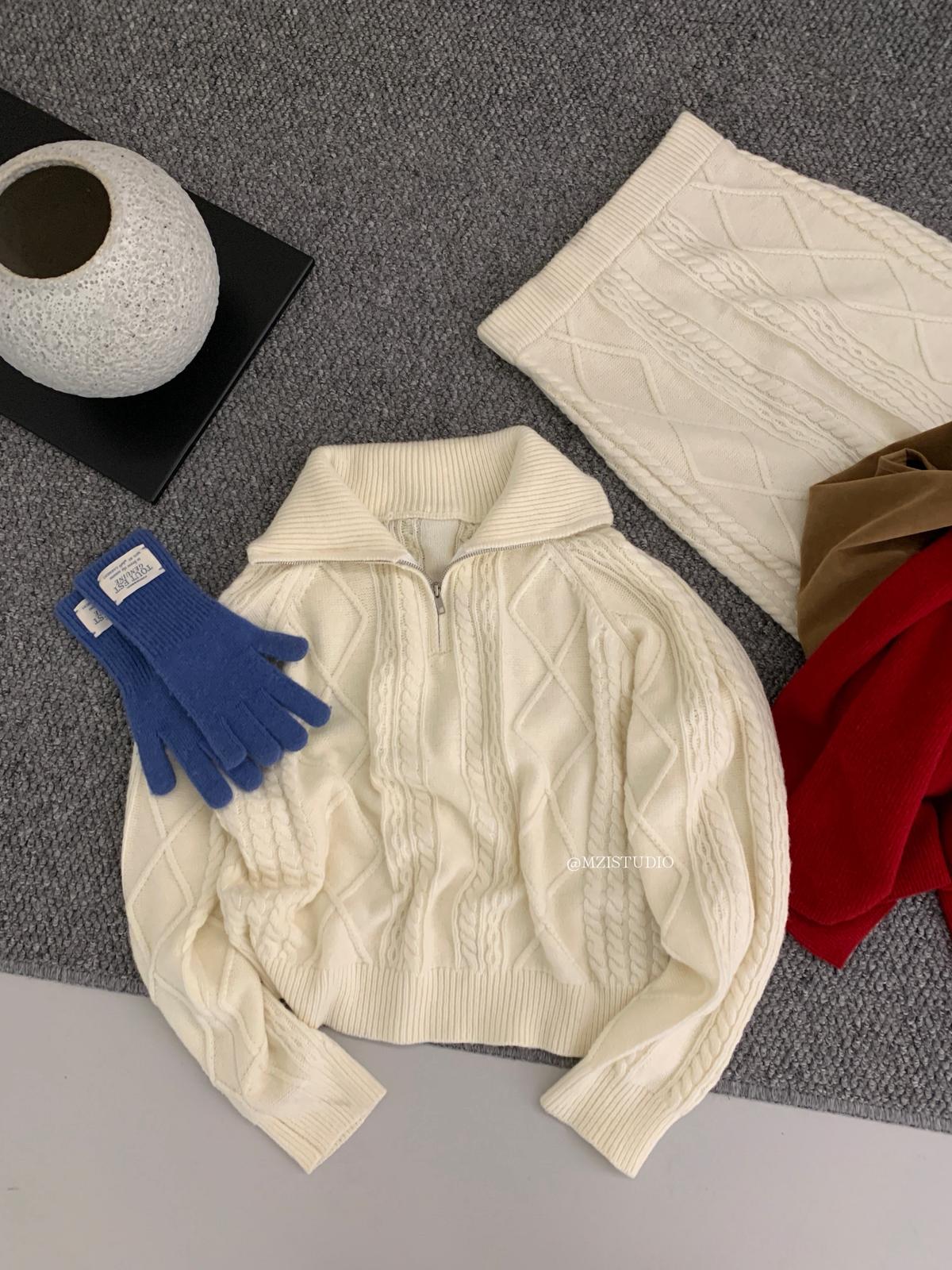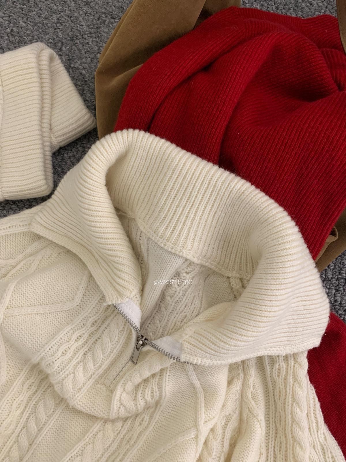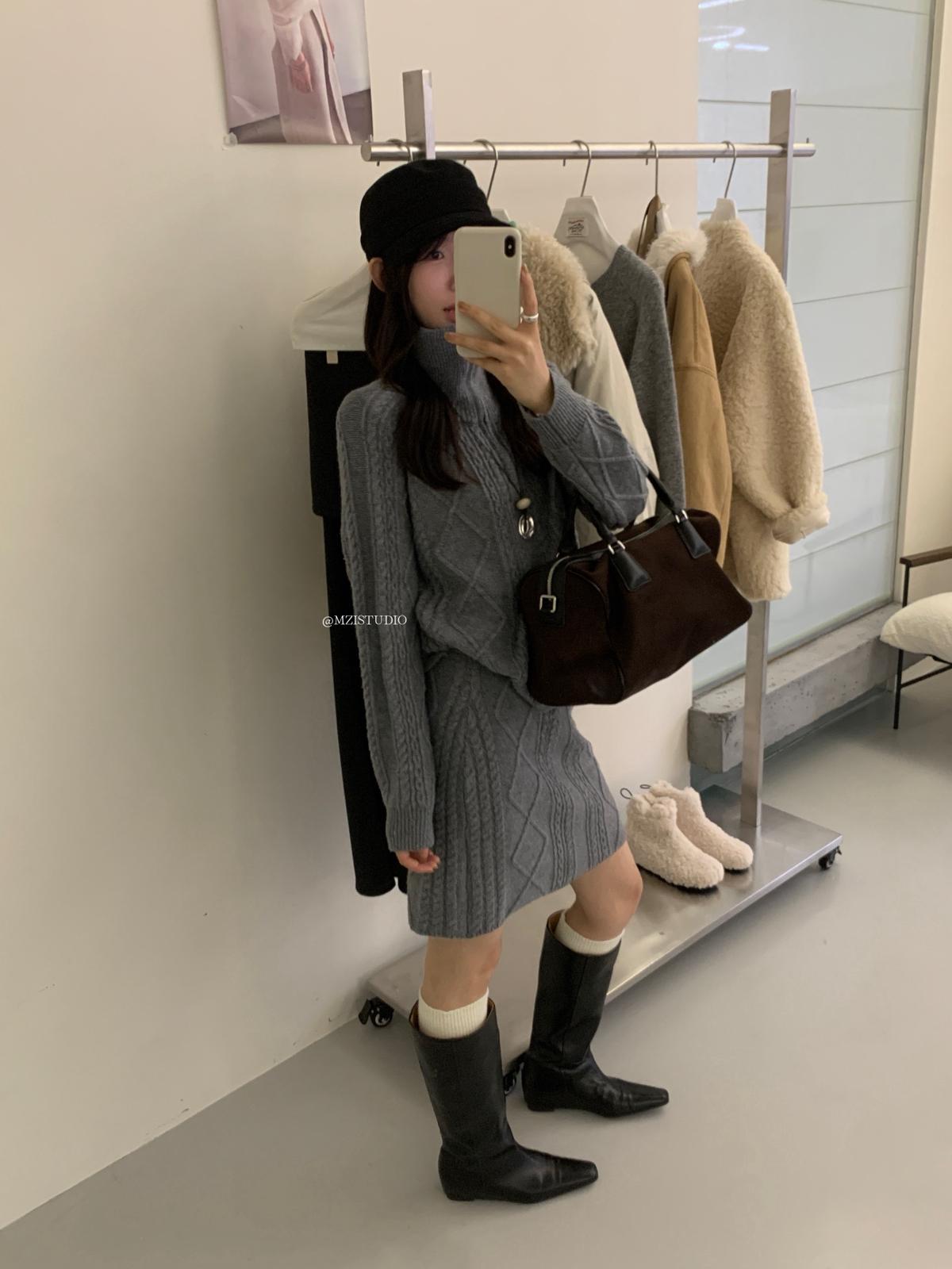 【C7902】冬日樂章韓系重工麻花乾淨溫柔系高領半拉鍊毛衣+包臀顯瘦半身裙套裝