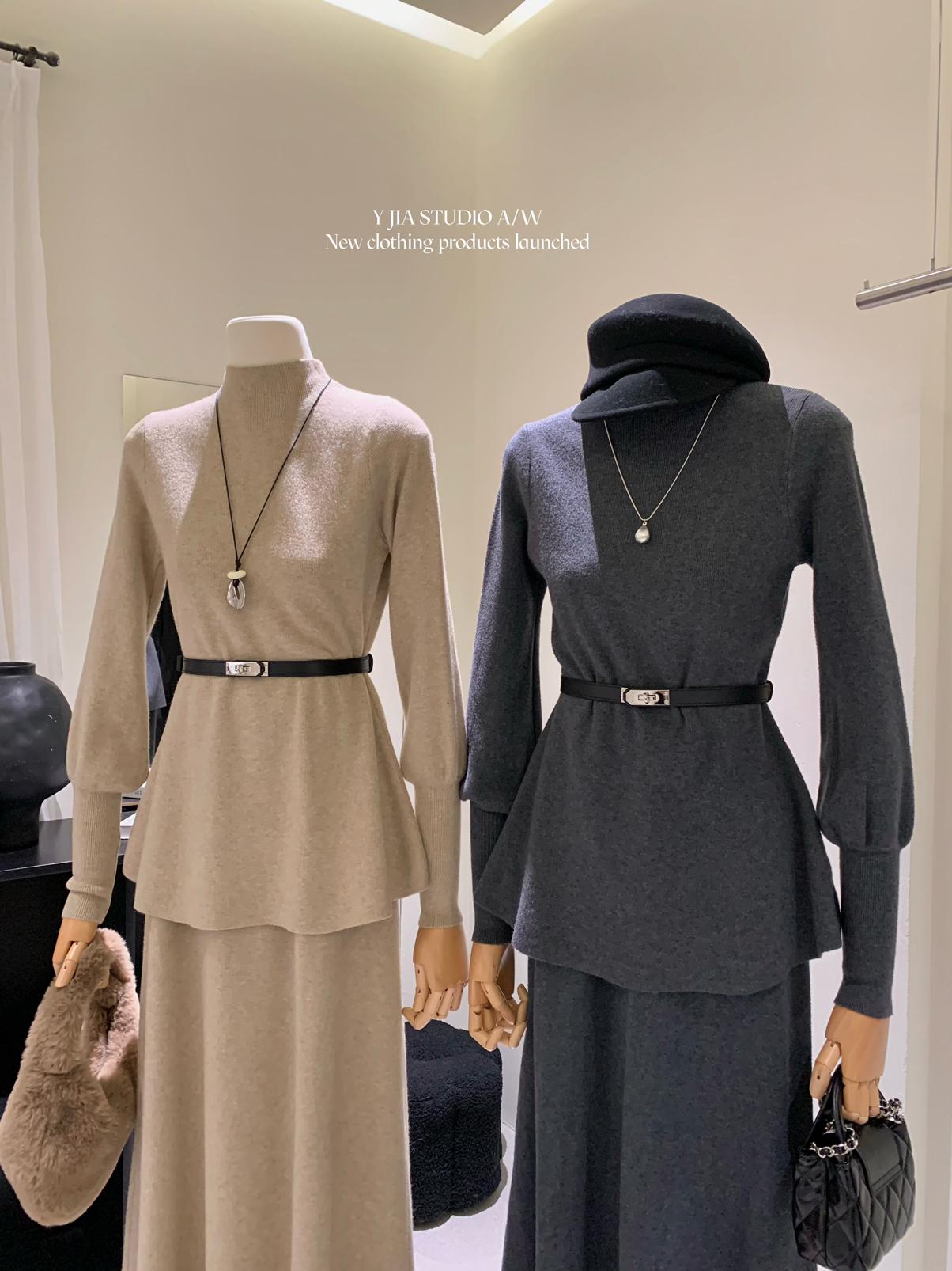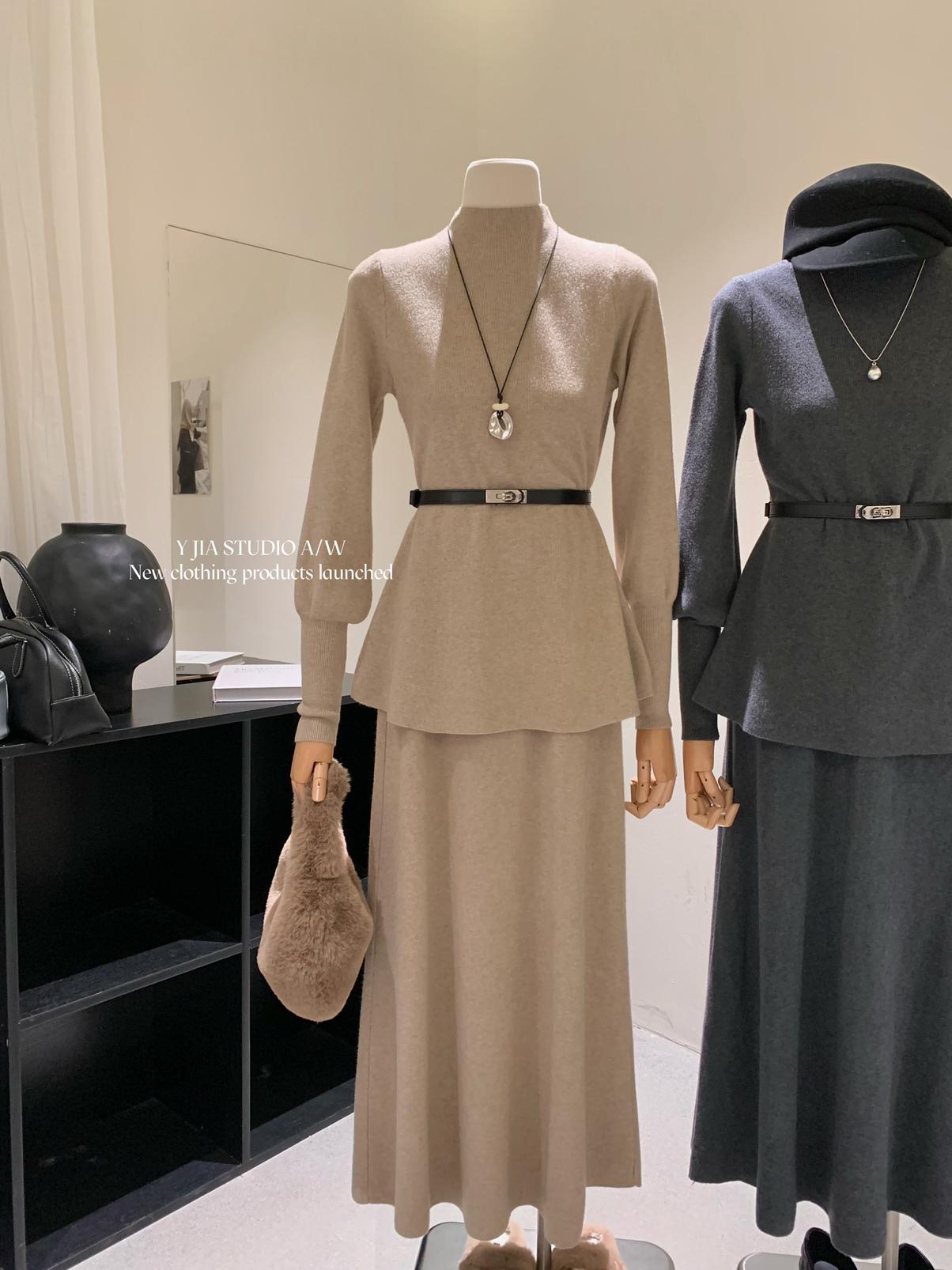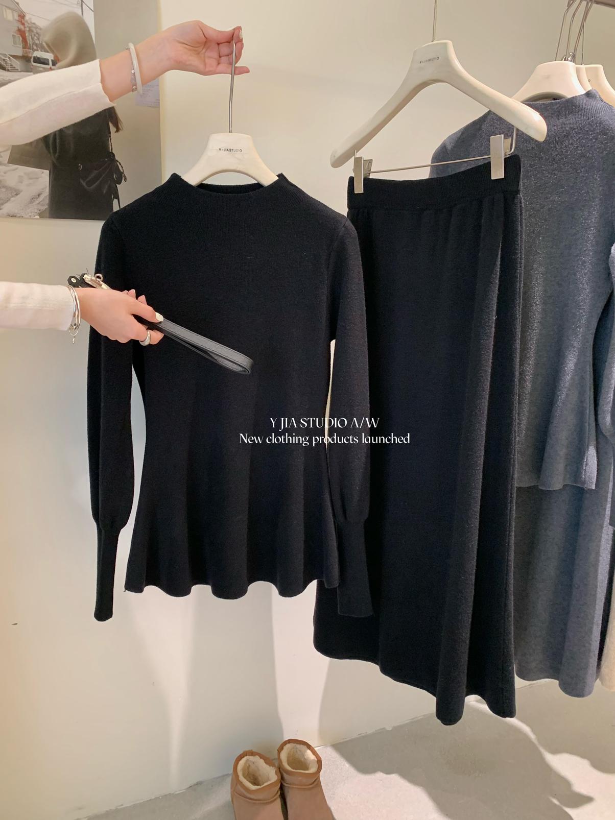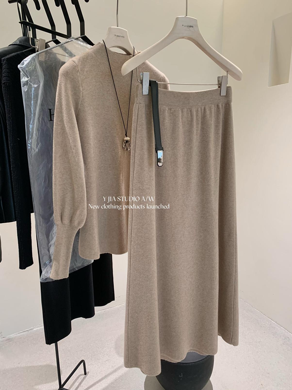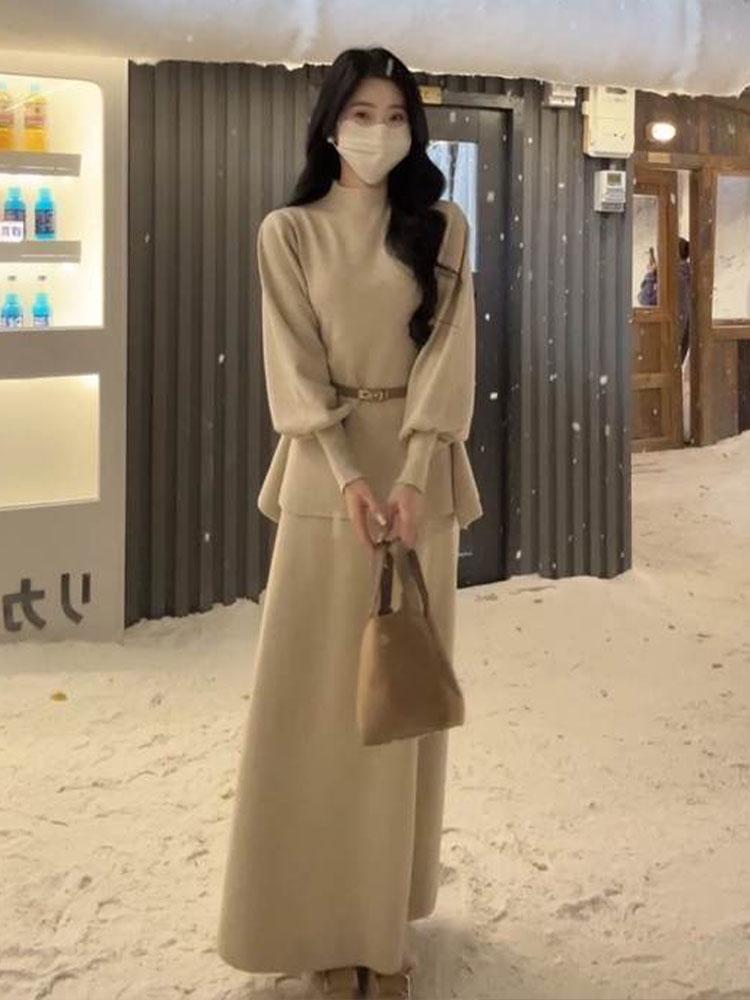 【C7946】慵懶風,高級泡泡袖魚尾擺針織衫+高腰顯瘦針織半身裙套裝(配腰帶)