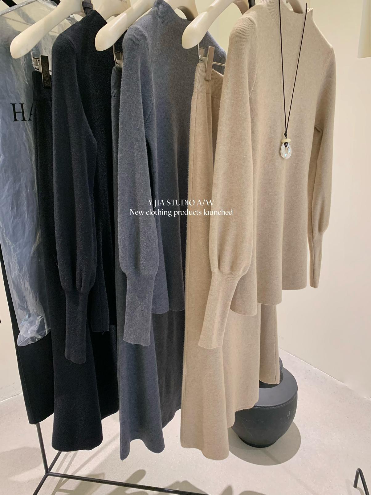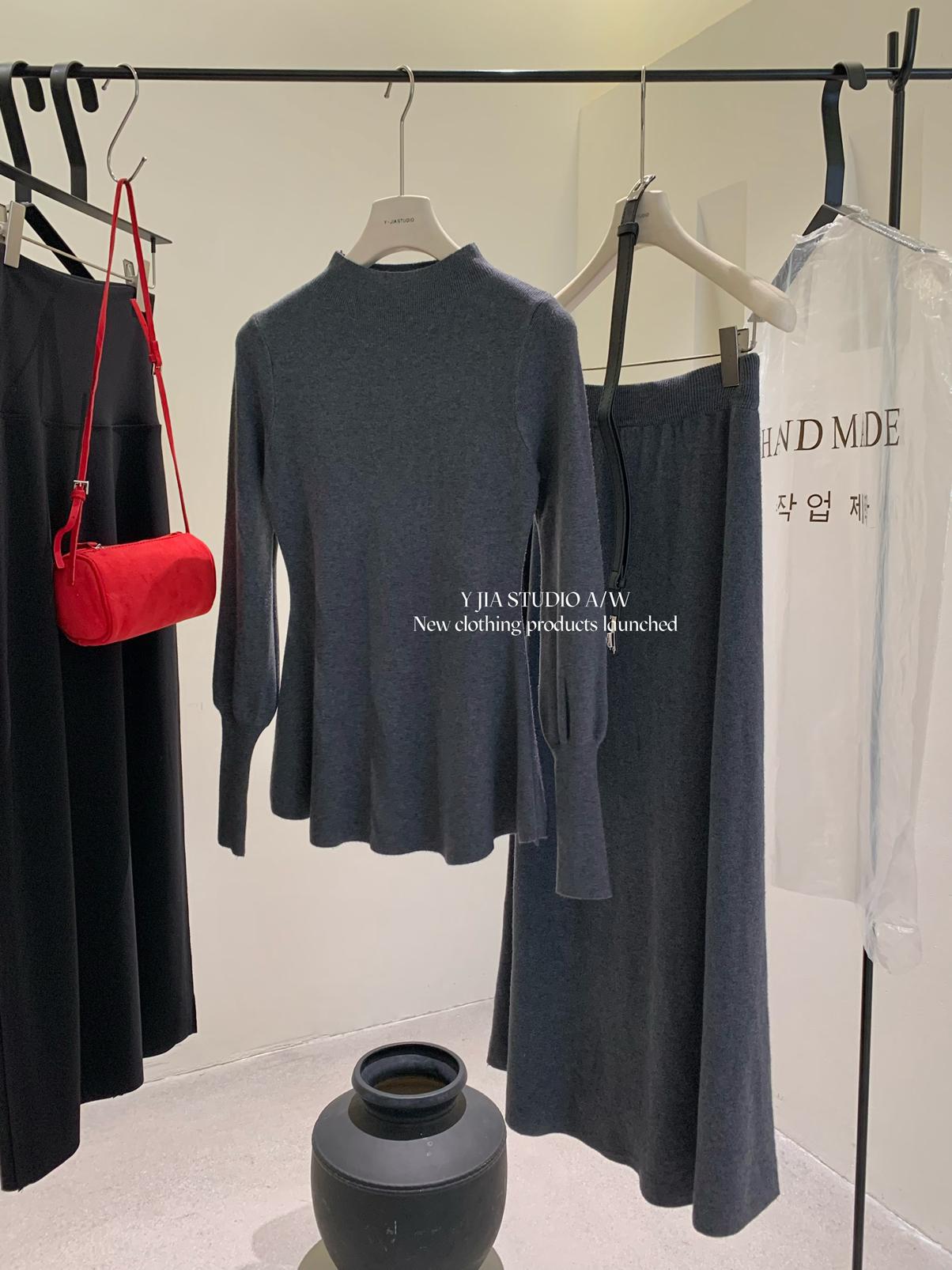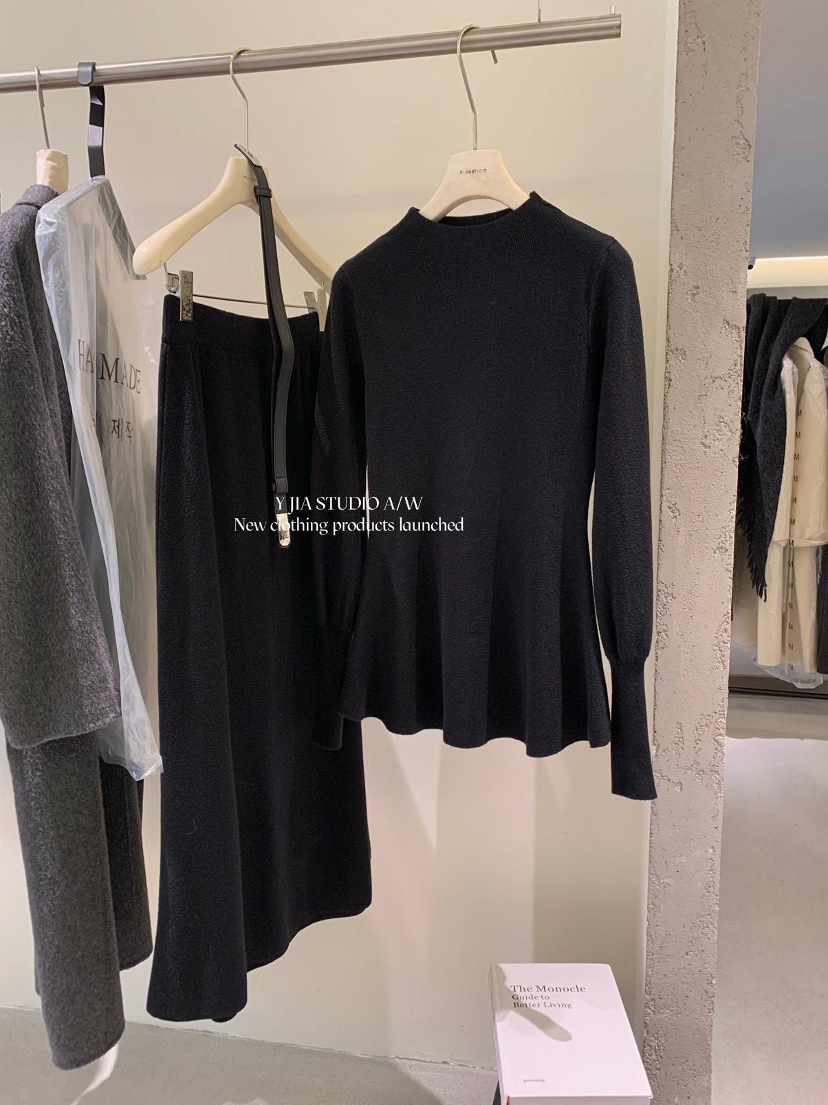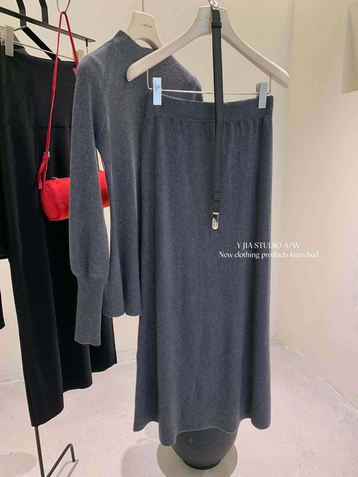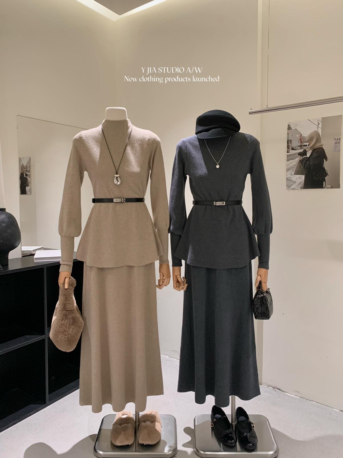 【C7946】慵懶風,高級泡泡袖魚尾擺針織衫+高腰顯瘦針織半身裙套裝(配腰帶)