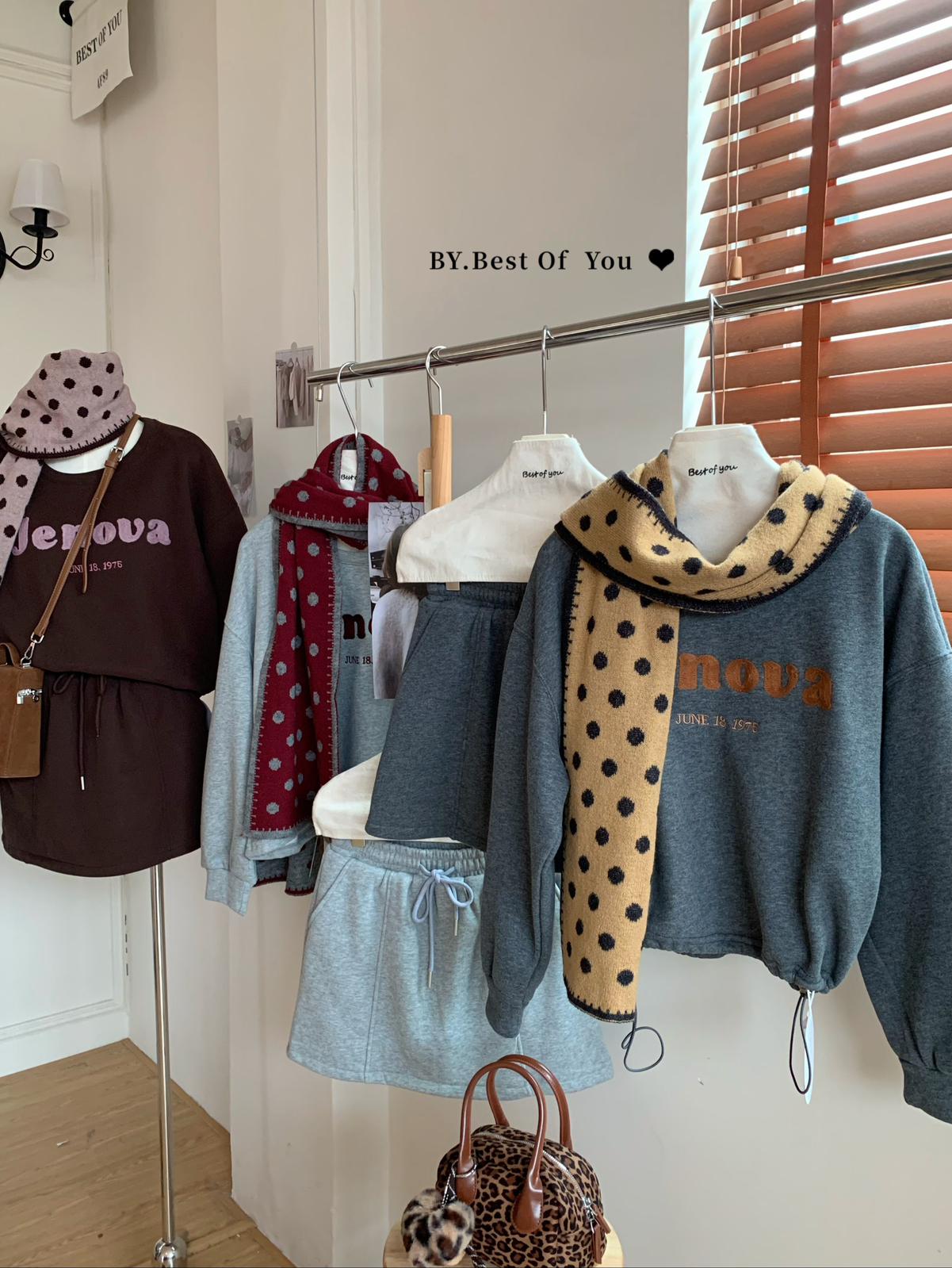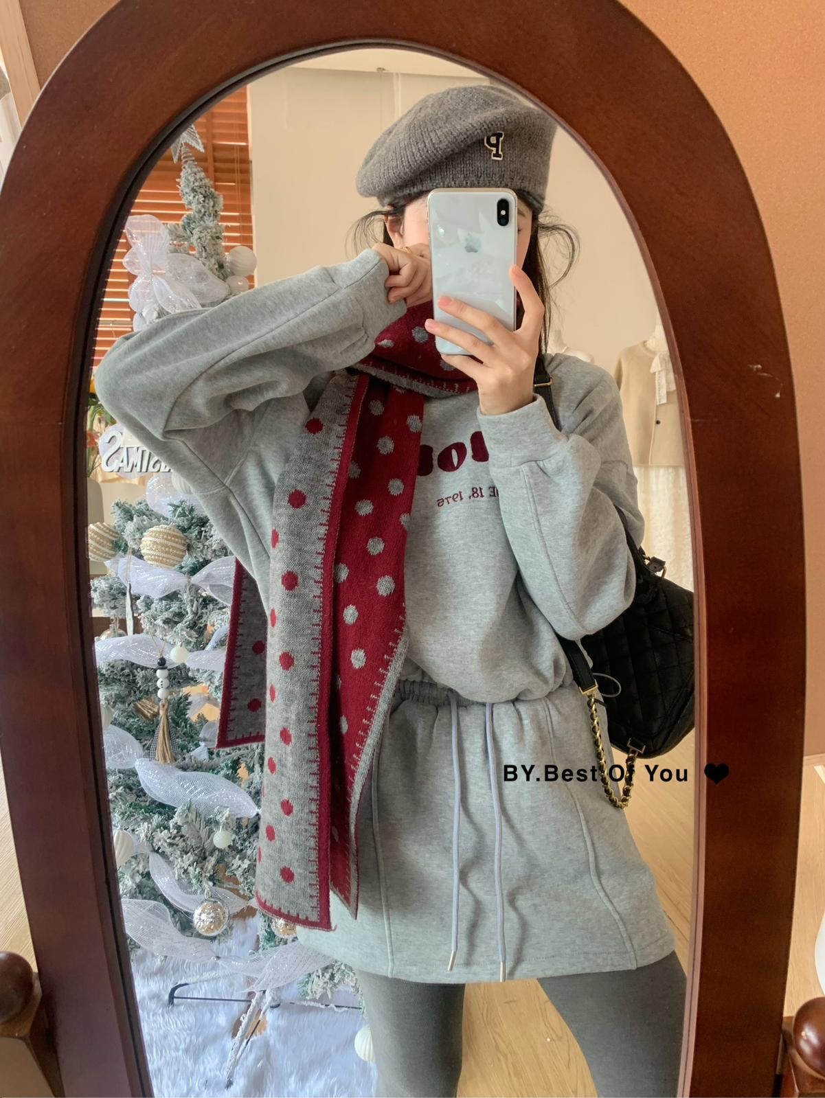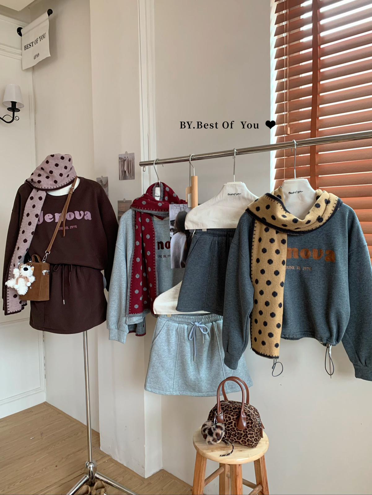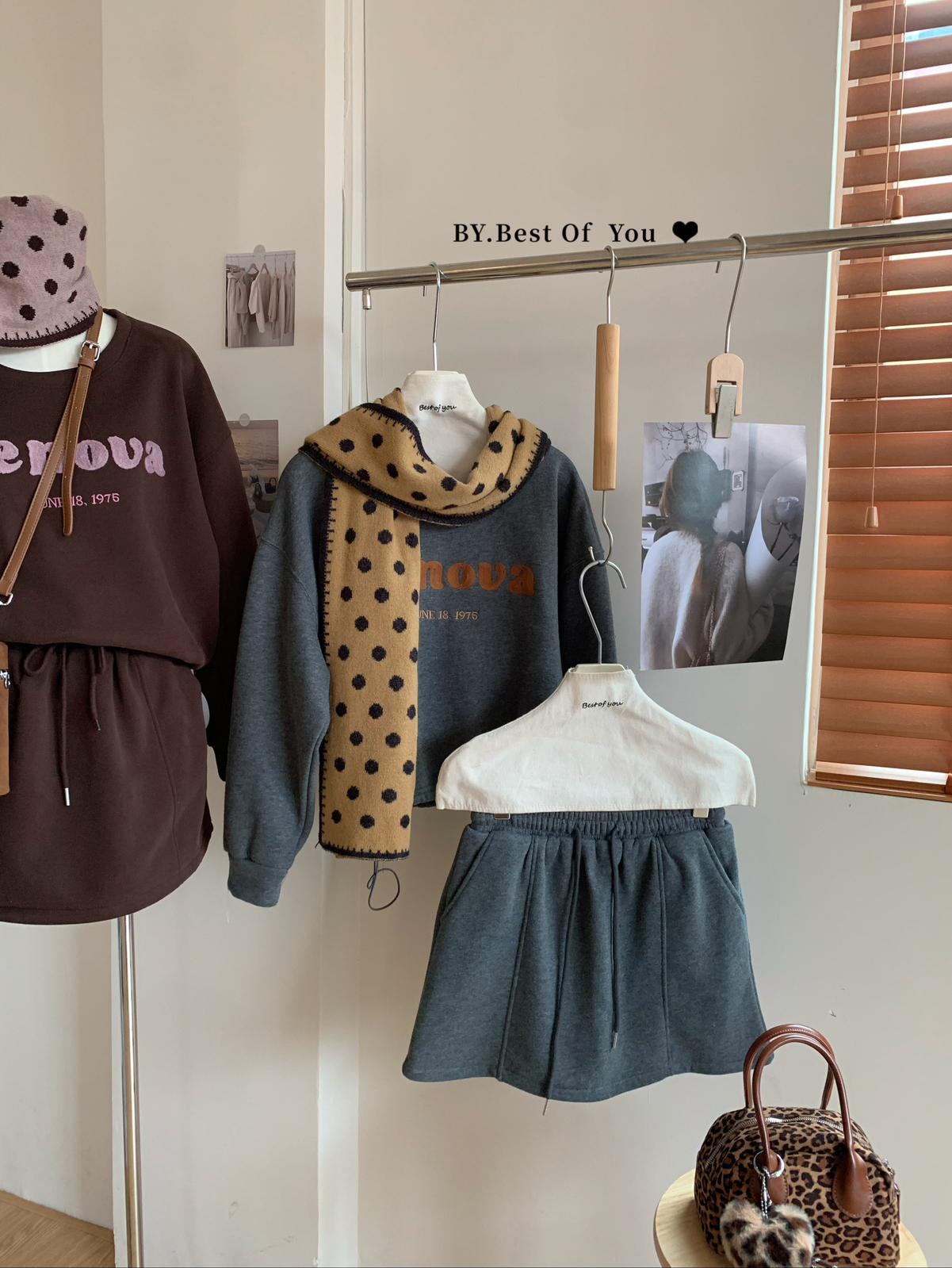【C7980】法式復古刺繡衛衣+半身裙套裝(配波點圍巾)