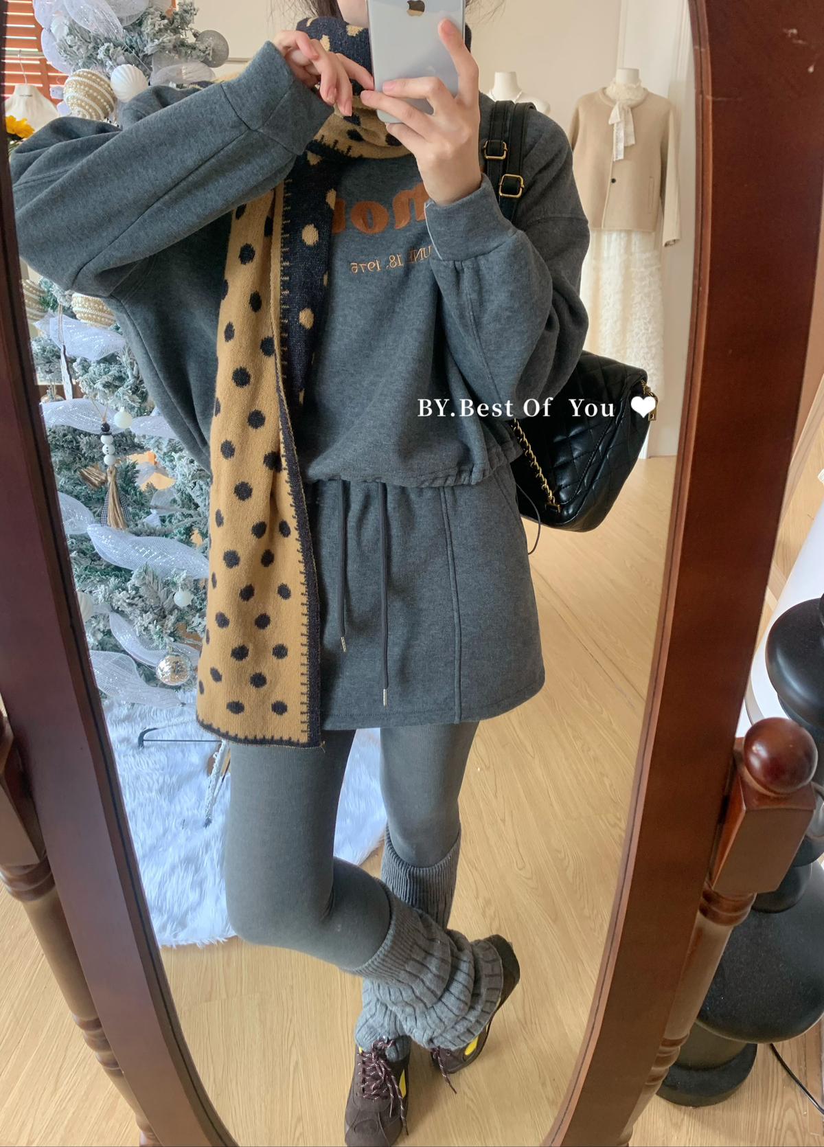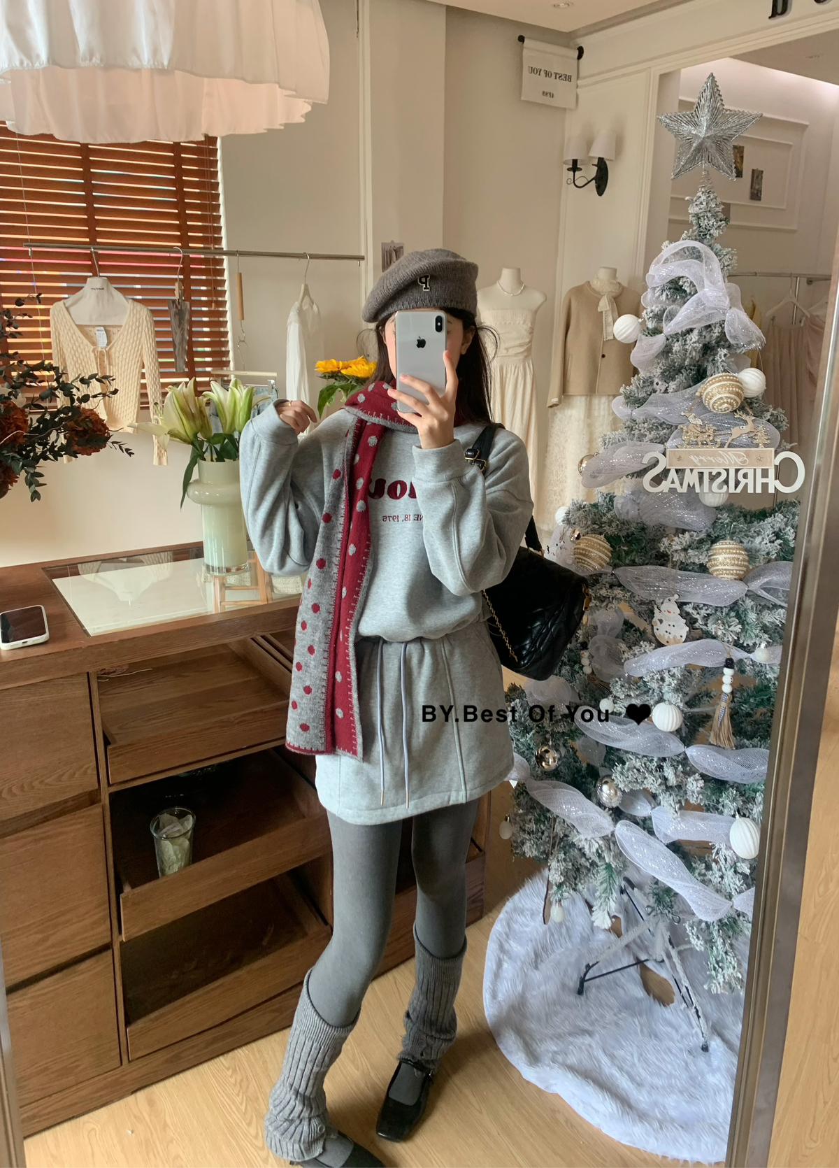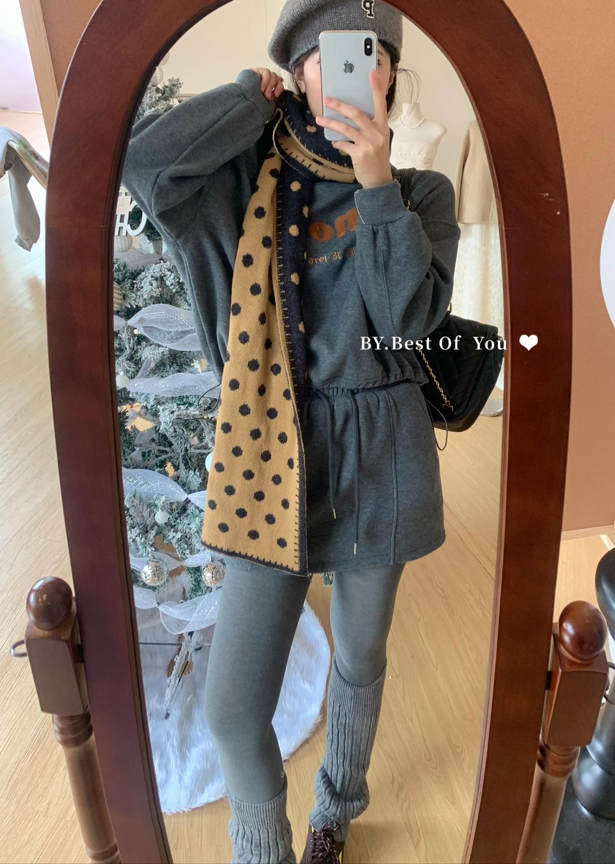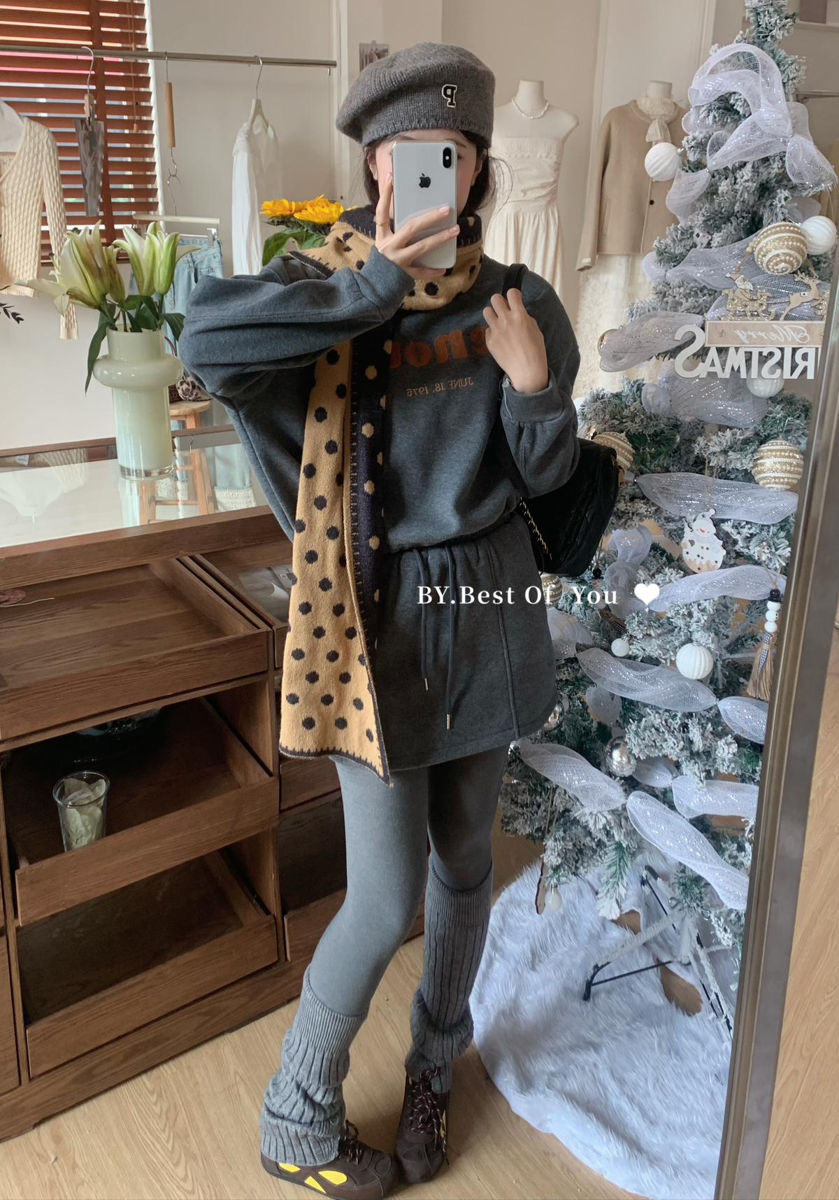 【C7980】法式復古刺繡衛衣+半身裙套裝(配波點圍巾)