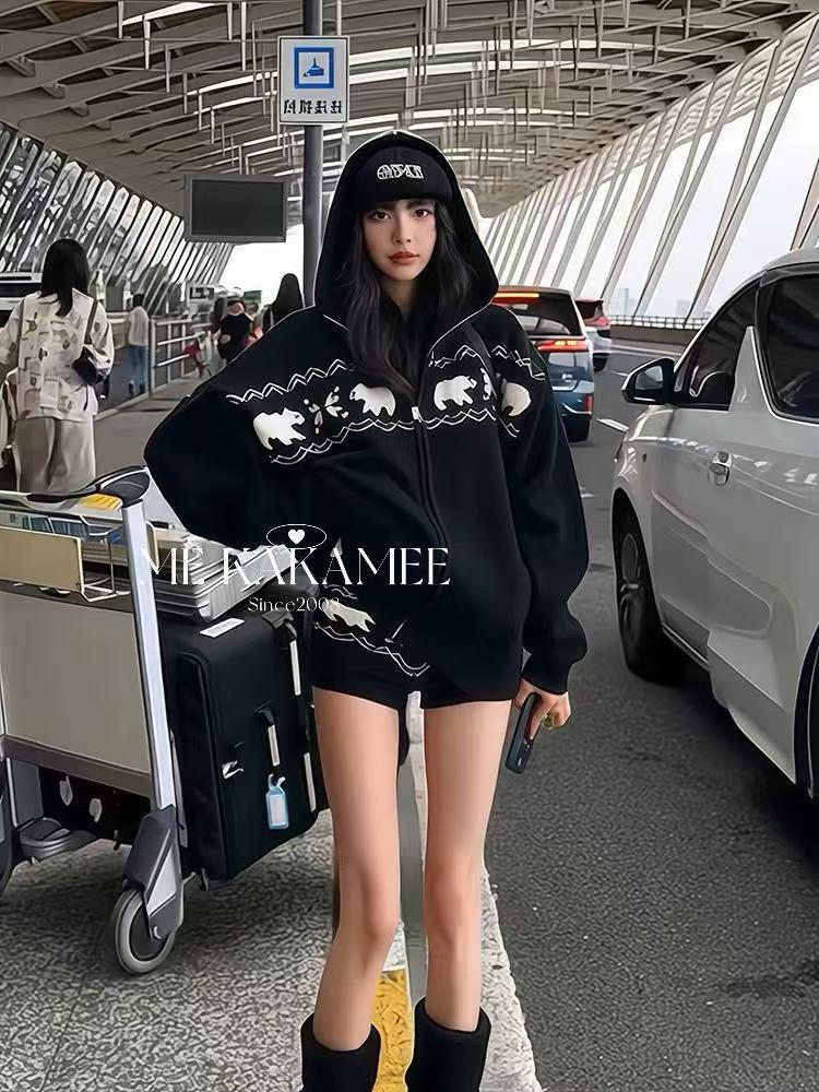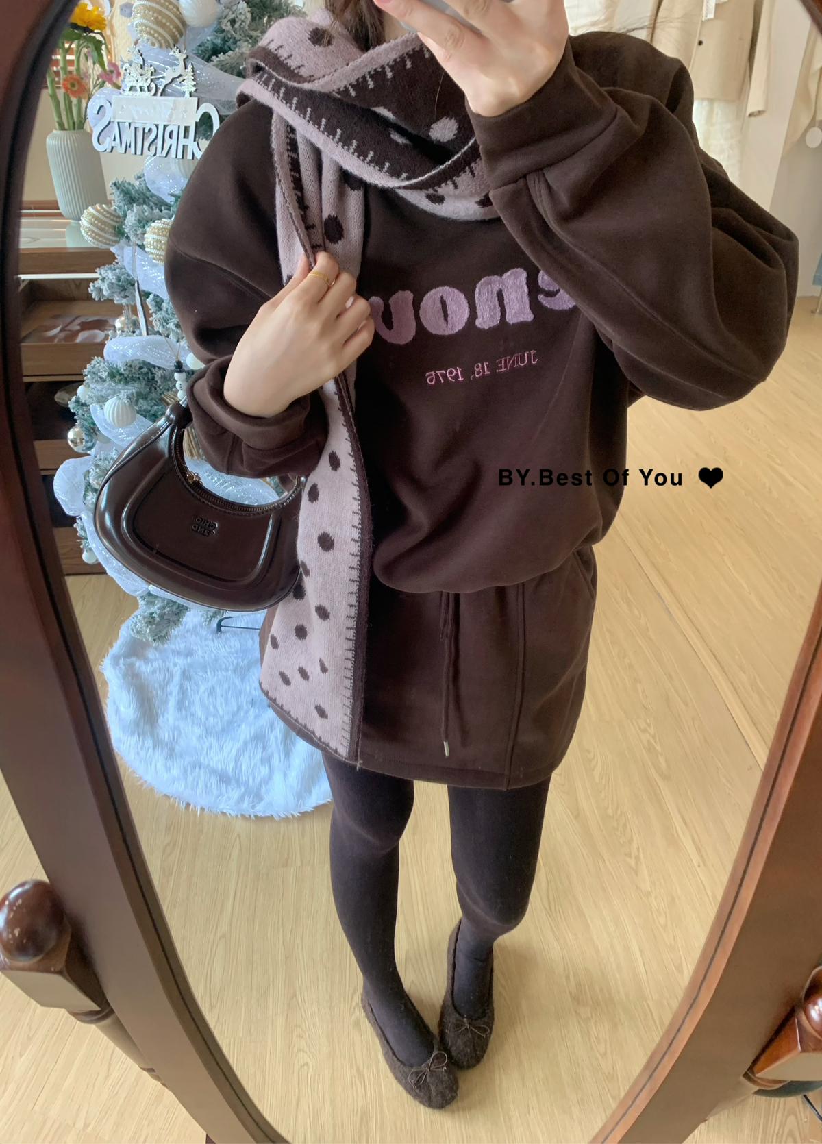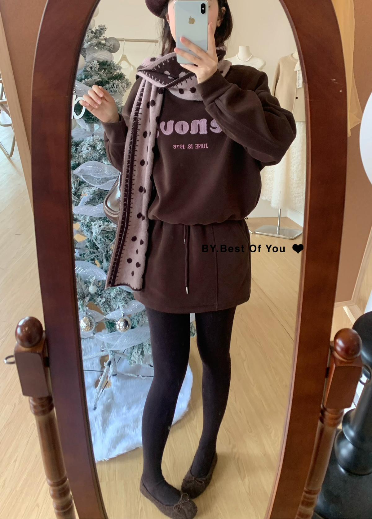【C8096】舒適區~搖粒絨刺繡連帽衛衣外套+高腰a字半身裙套裝