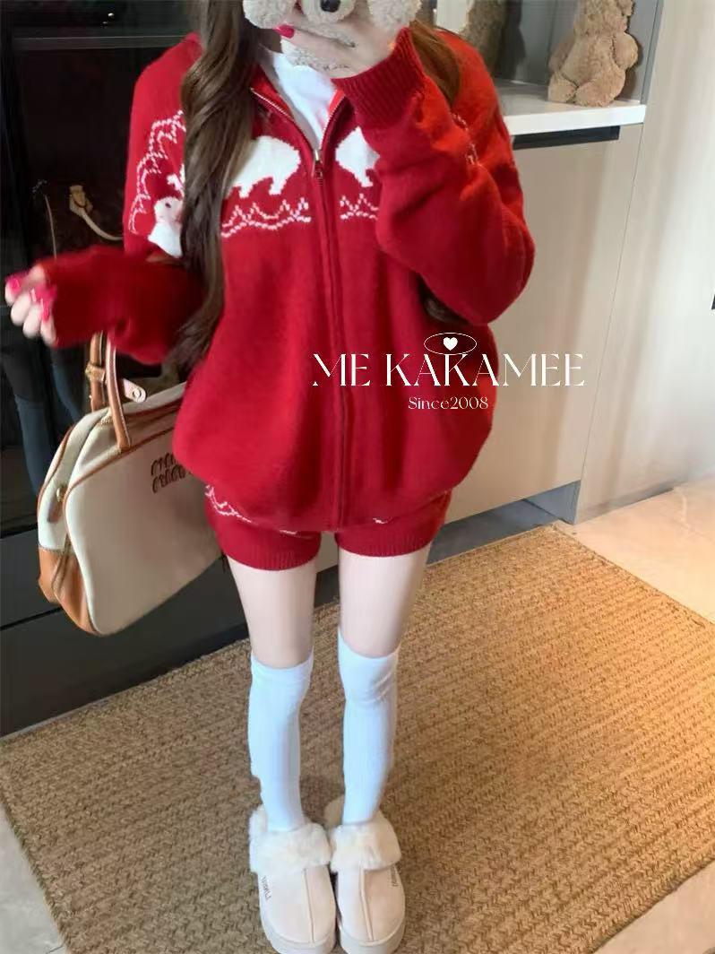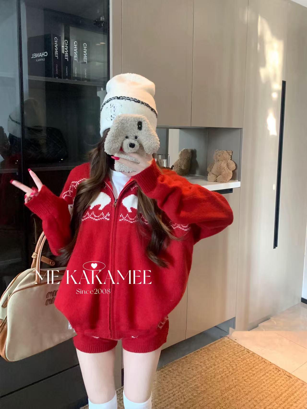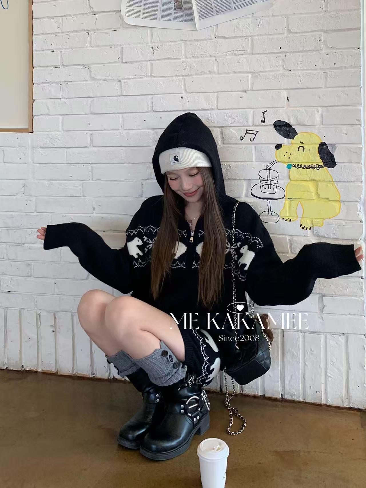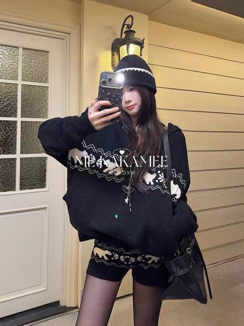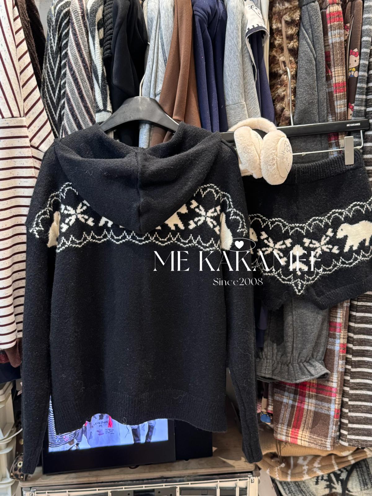 【C7983】冬新品慵懶費爾島提花連帽開衫毛衣+休閒短褲兩件套裝