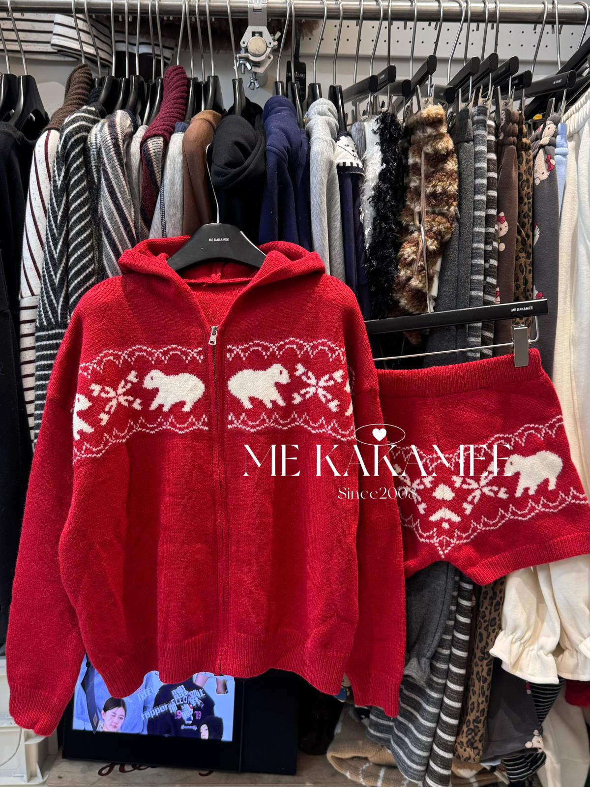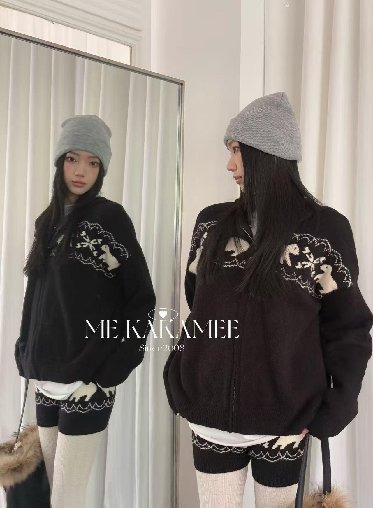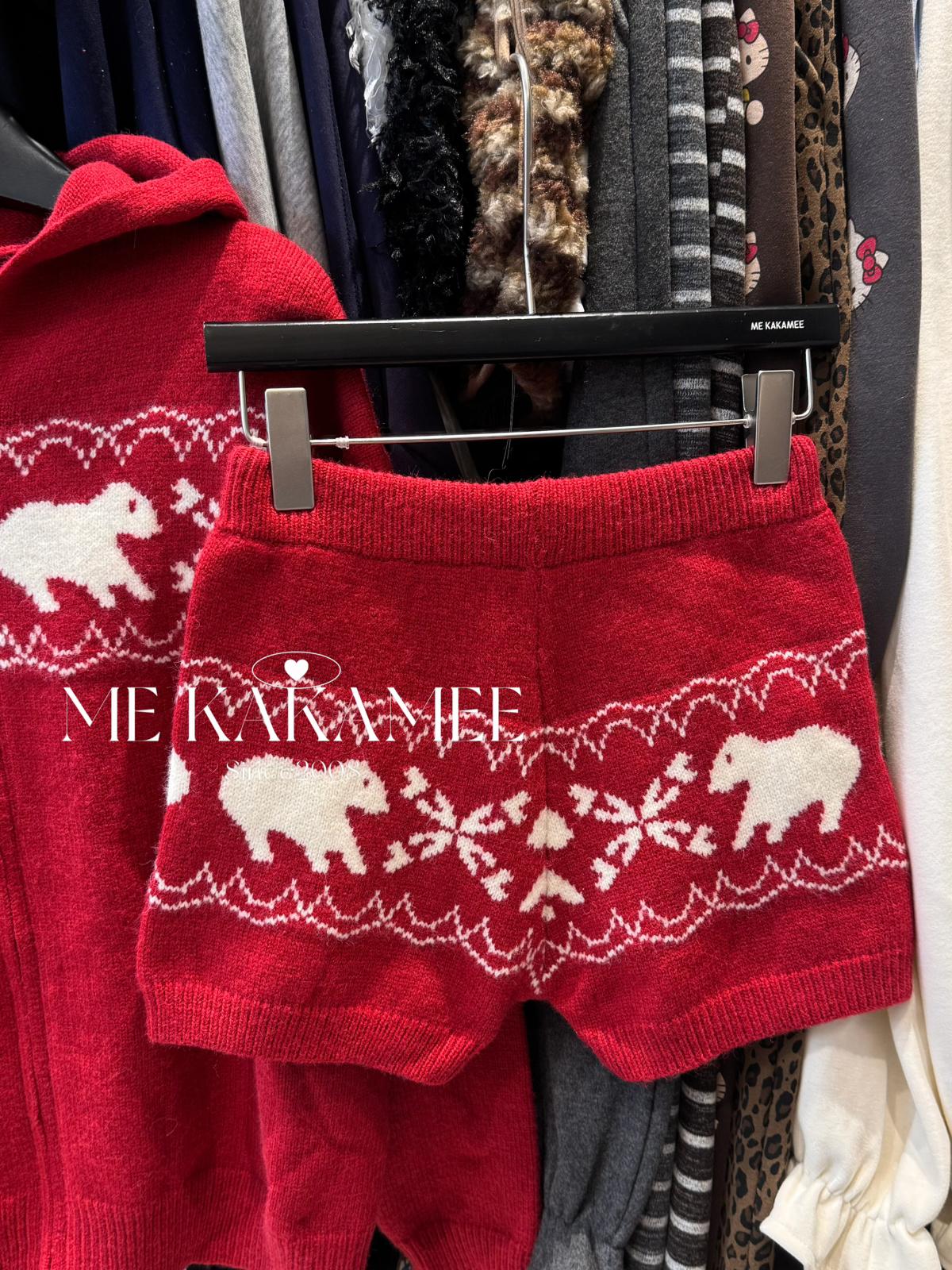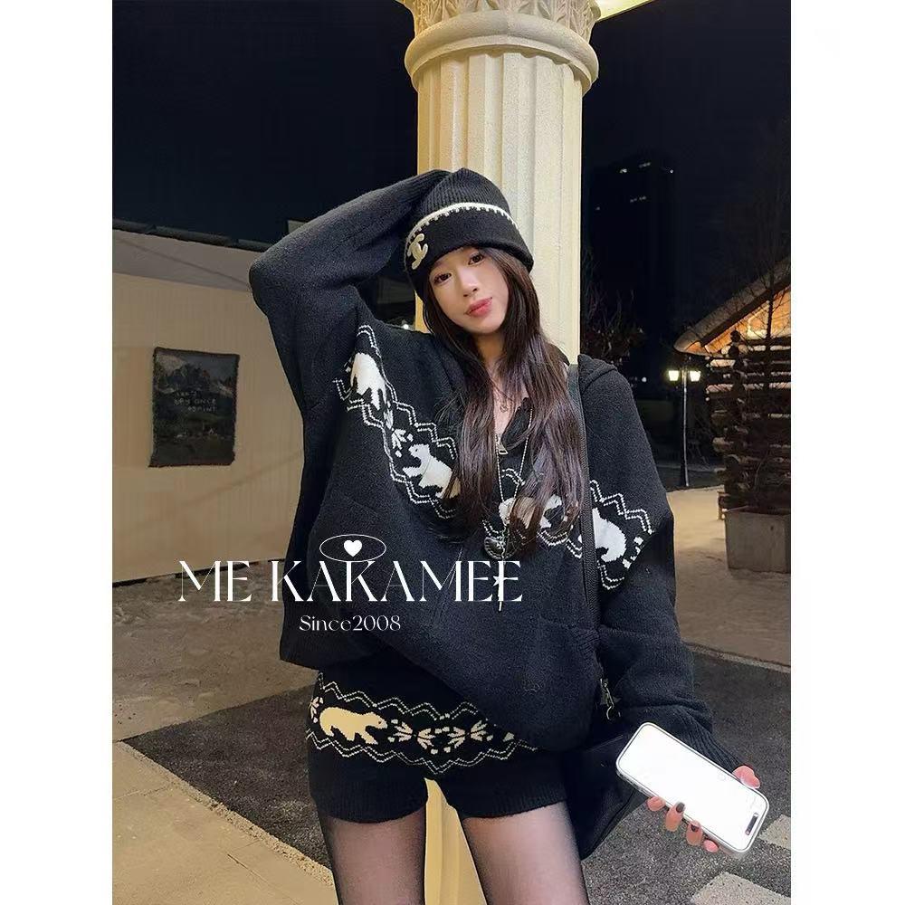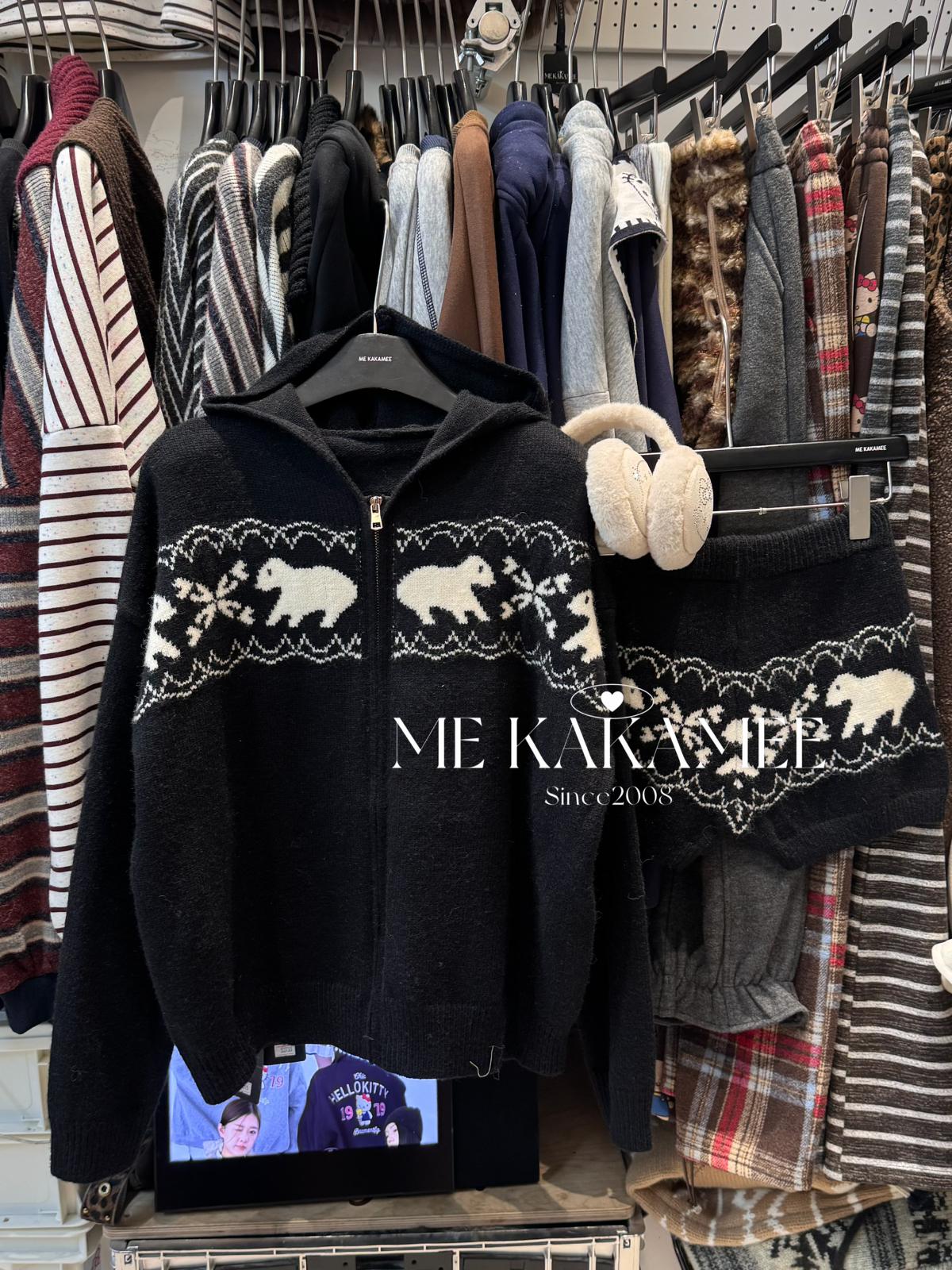 【C7983】冬新品慵懶費爾島提花連帽開衫毛衣+休閒短褲兩件套裝