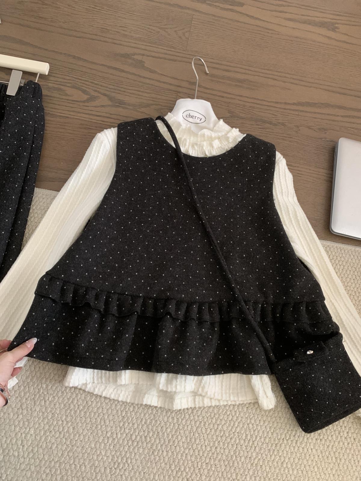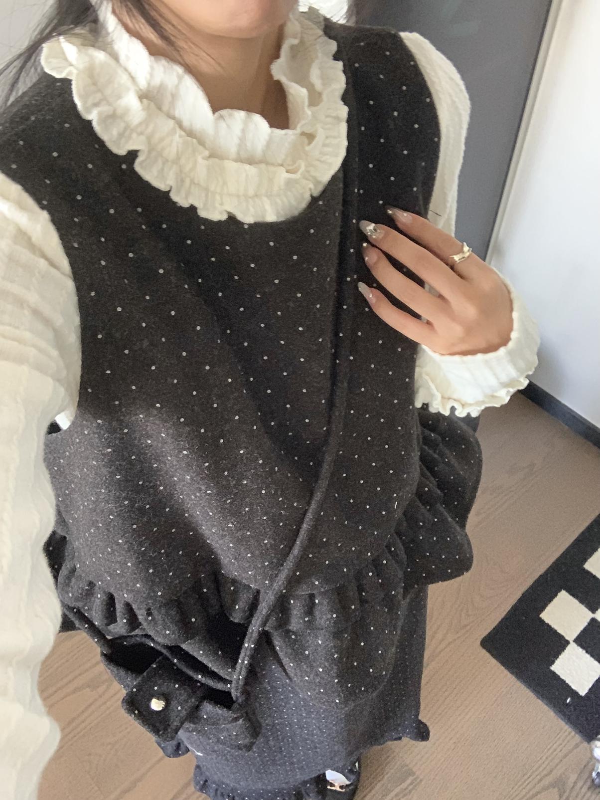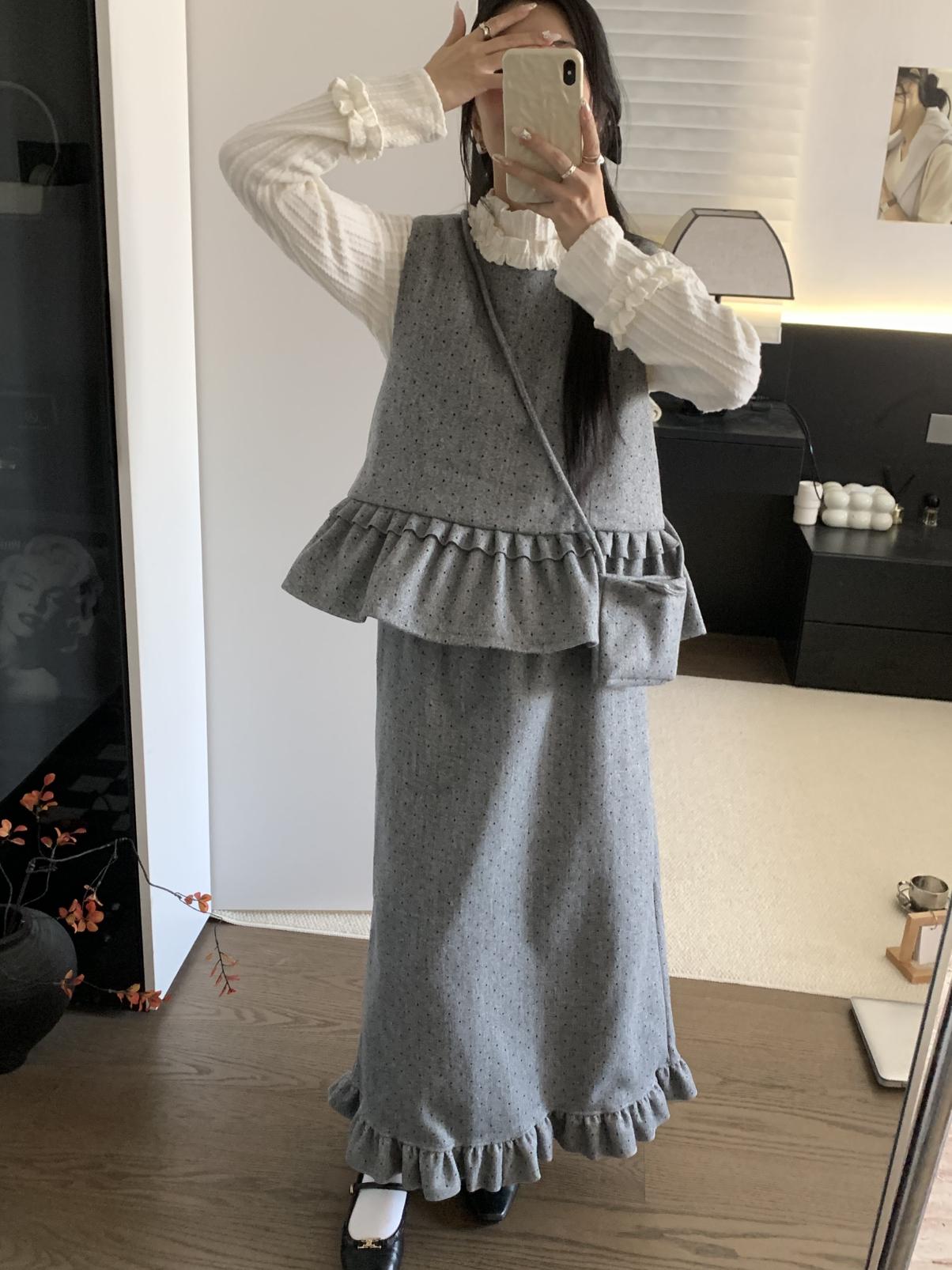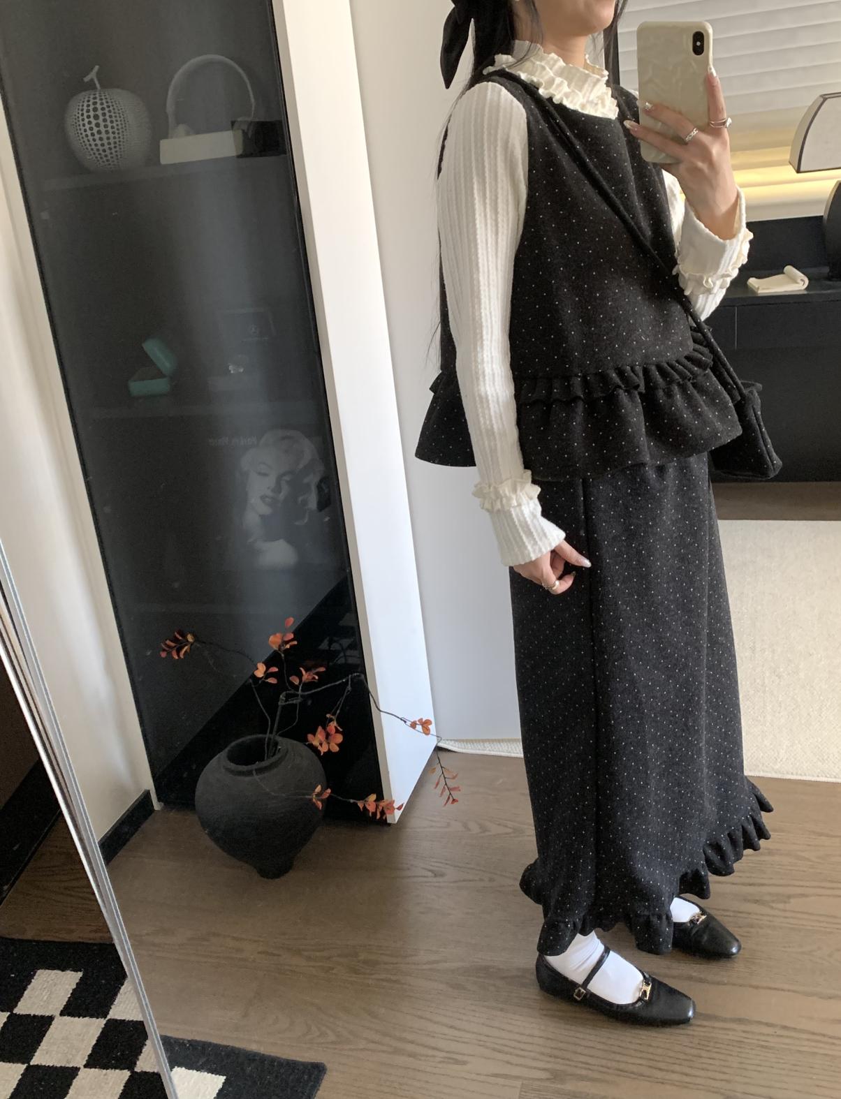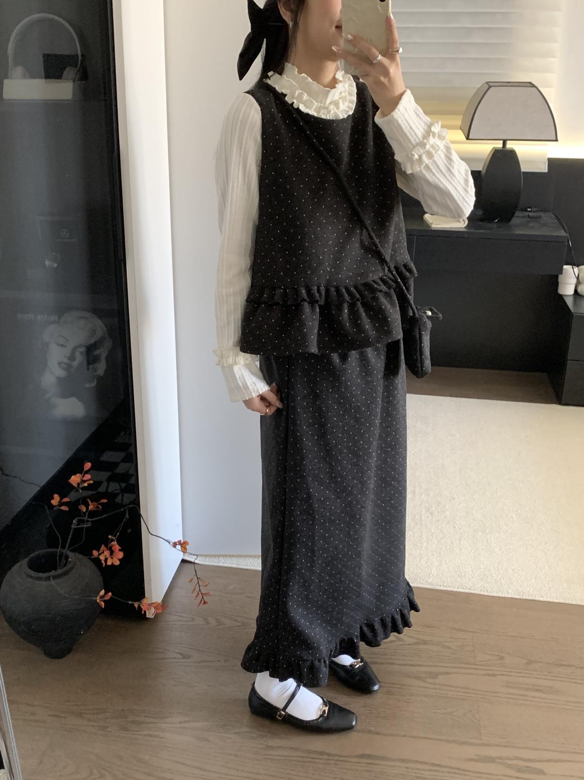 【C8059】韓式氣質波點木耳邊俏皮背心+半身裙套裝(配斜掛包)