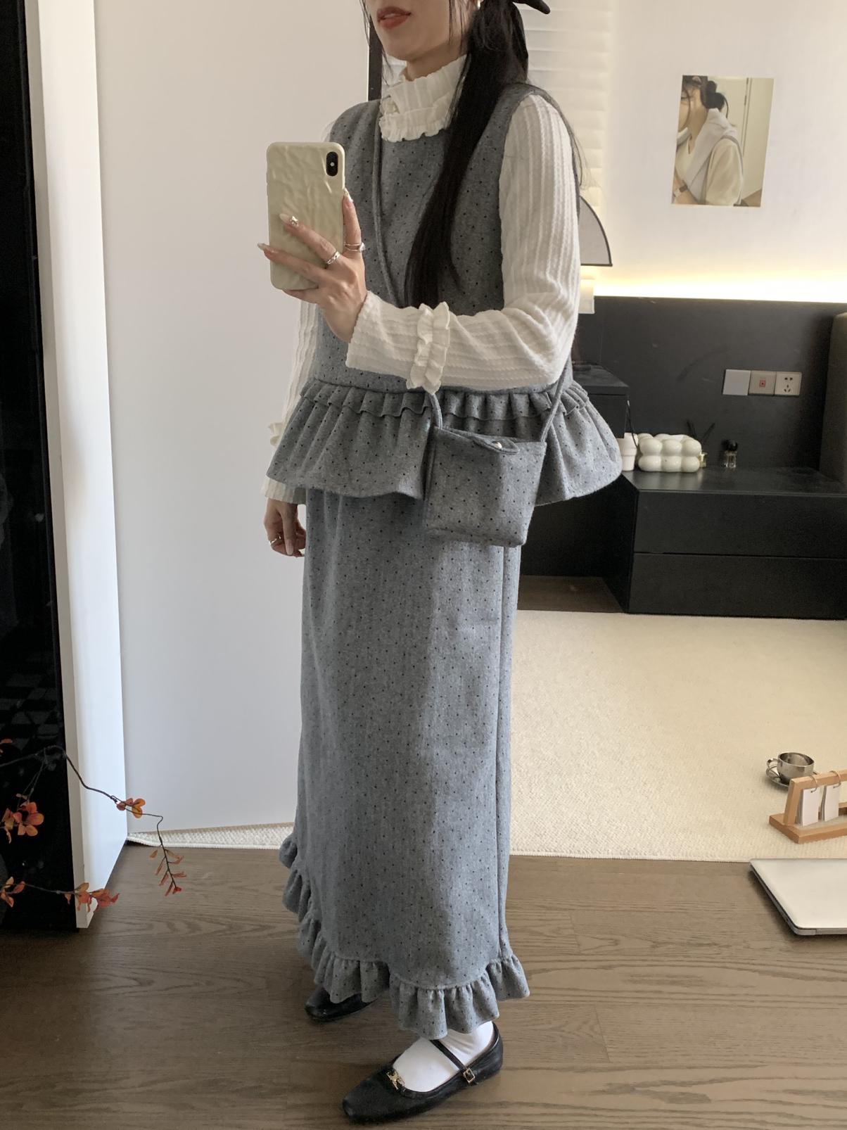 【C7784】在逃公主無袖後背綁帶收腰A字夾棉背心連衣裙+波邊長袖打底衫套裝