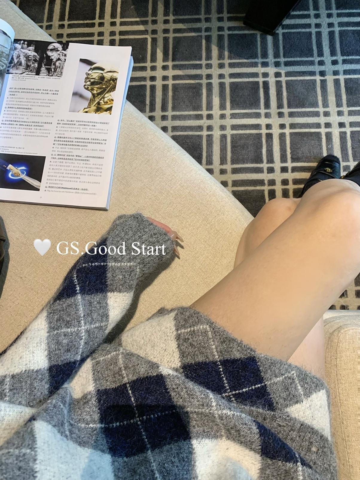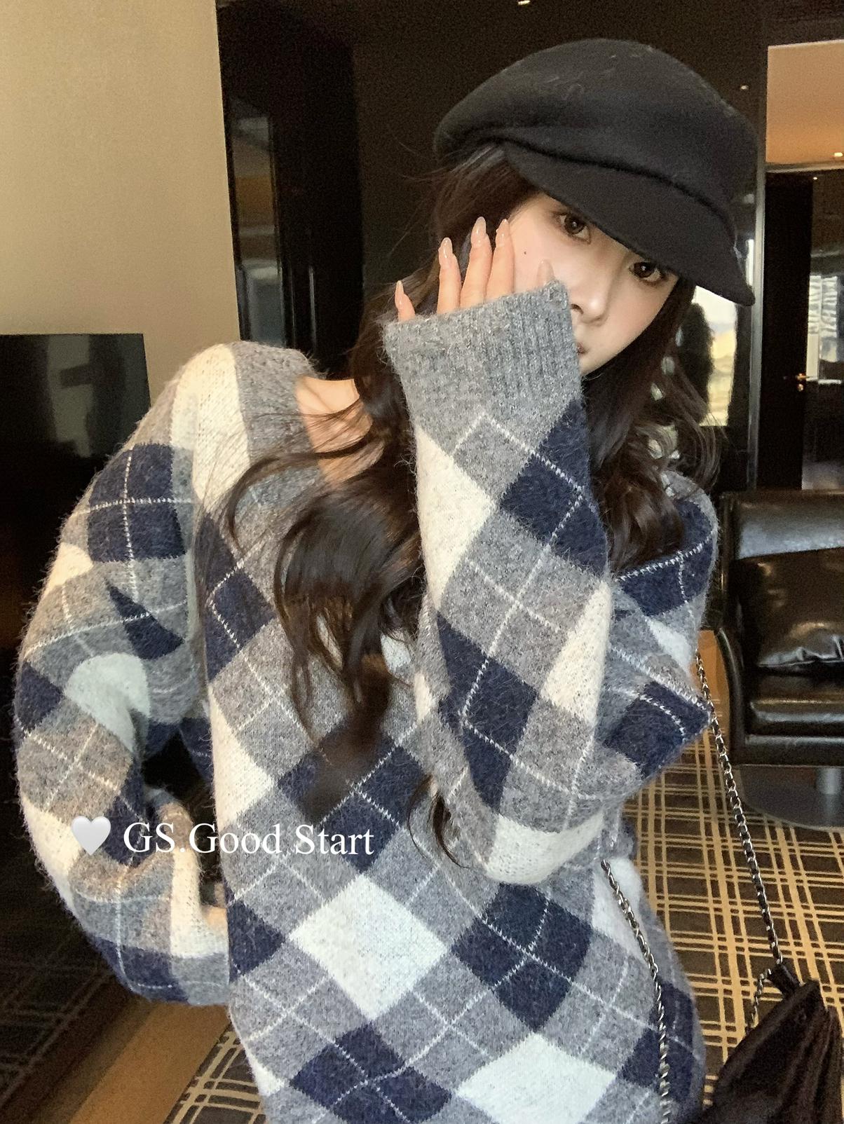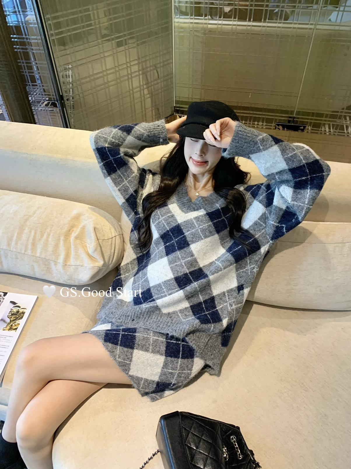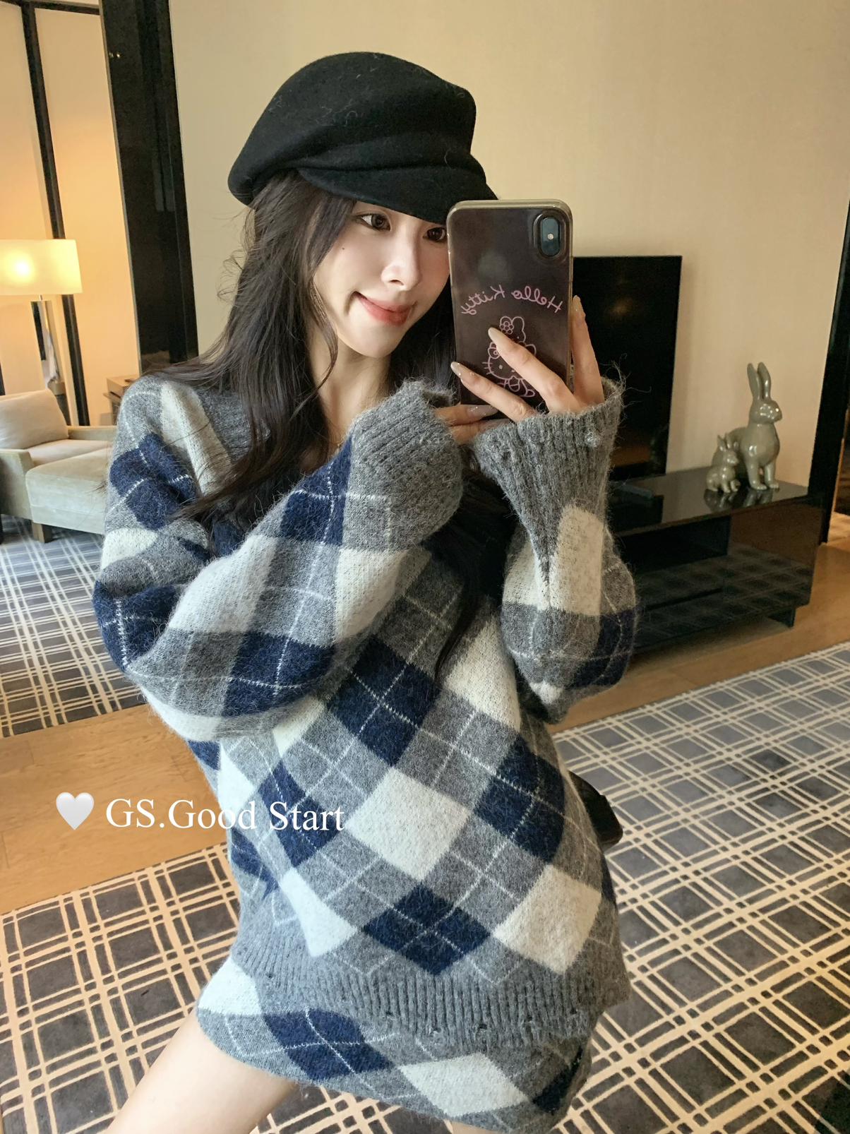 【C8099】一套不愁搭!輕鬆出街慵懶自在秋冬撞色格紋毛衣+包臀半身裙套裝