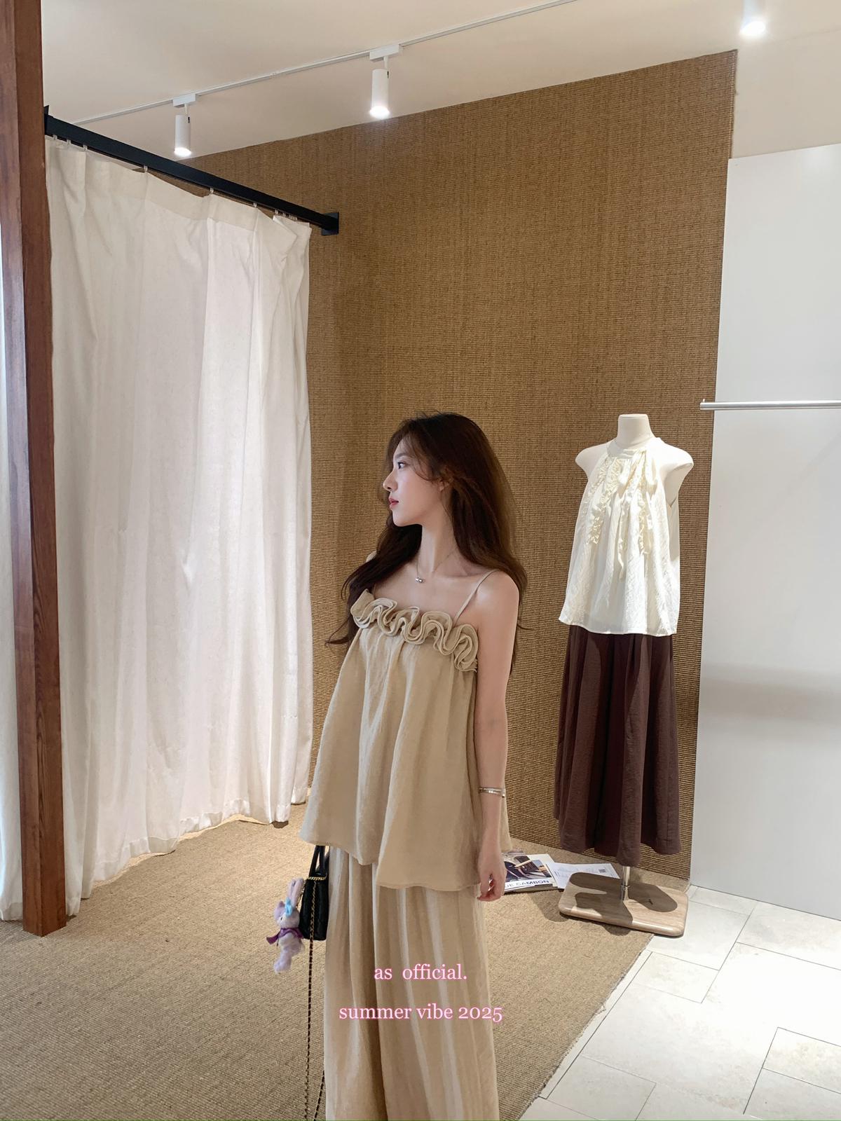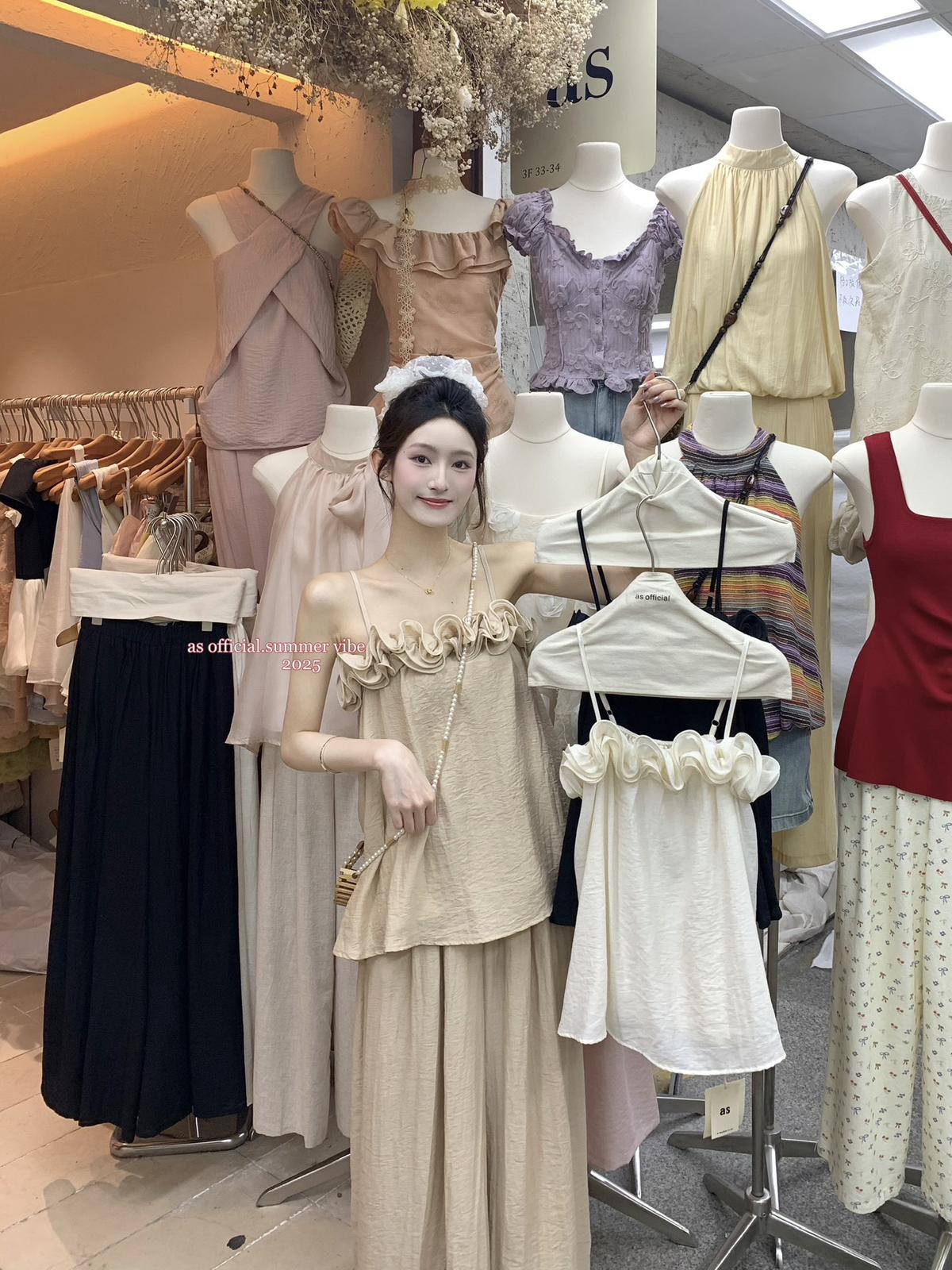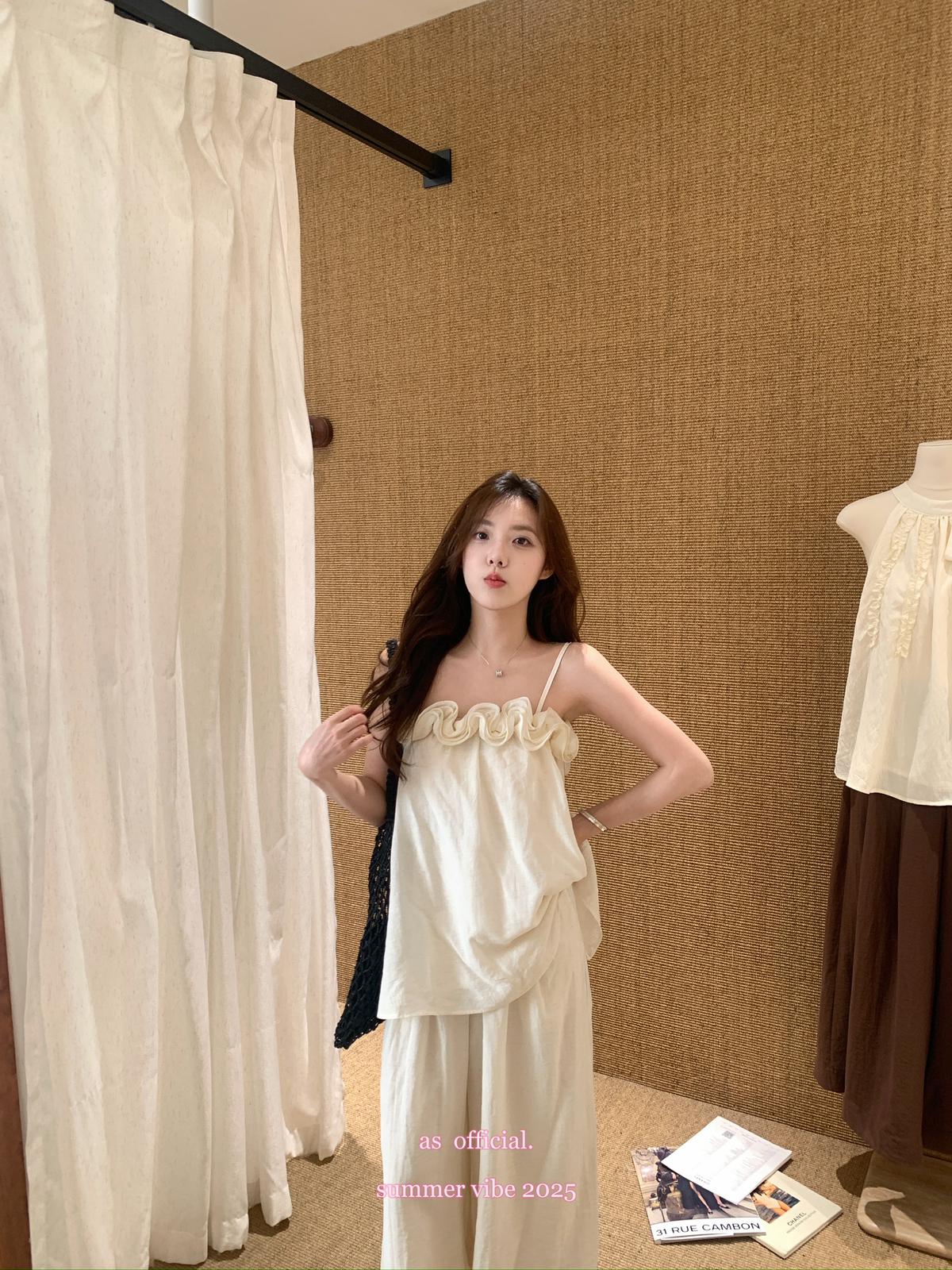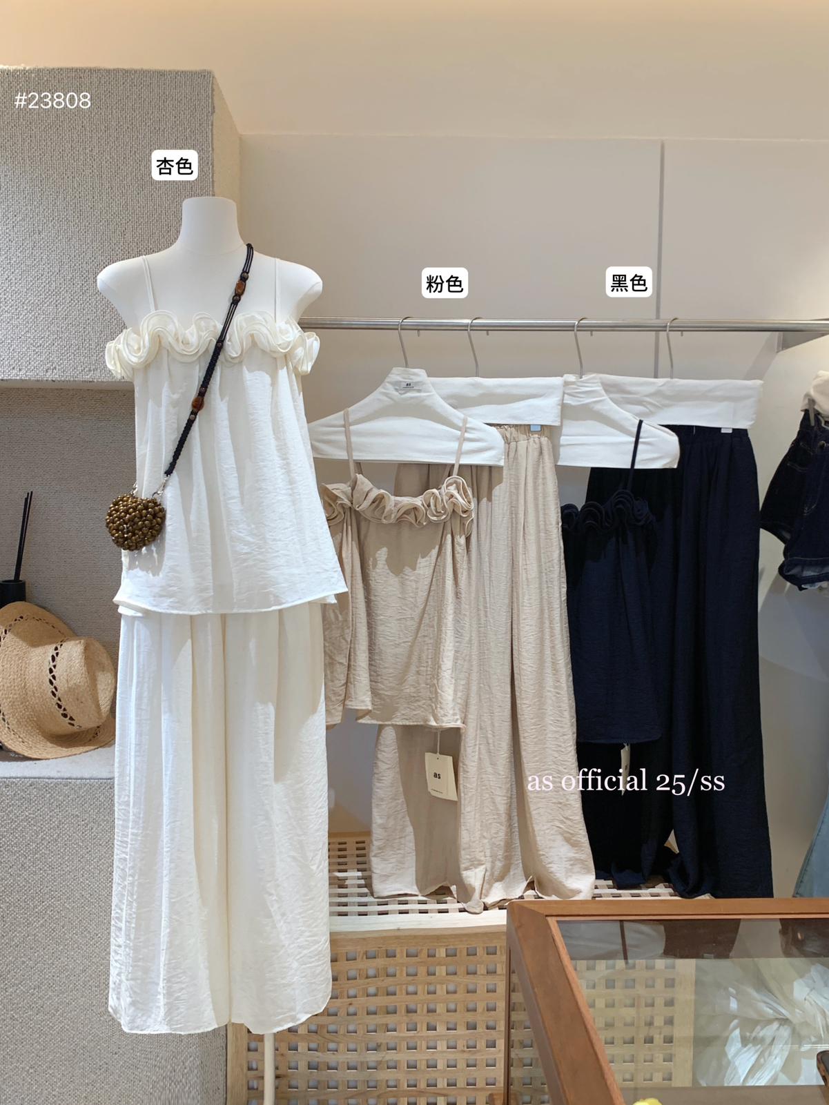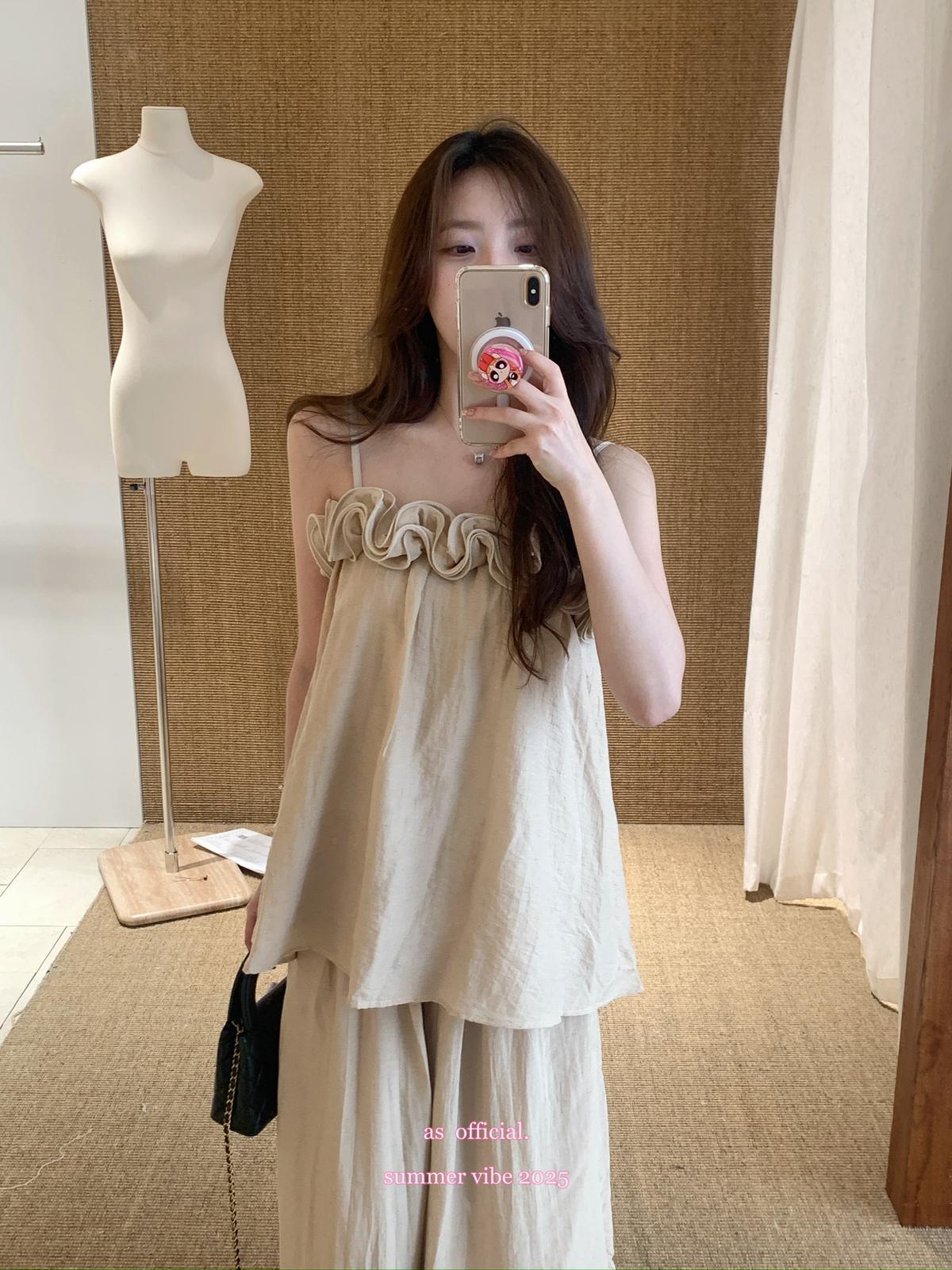【C6428】氛圍套裝!魚絲線荷葉邊*吊帶小衫+直筒闊腿休閒褲套裝