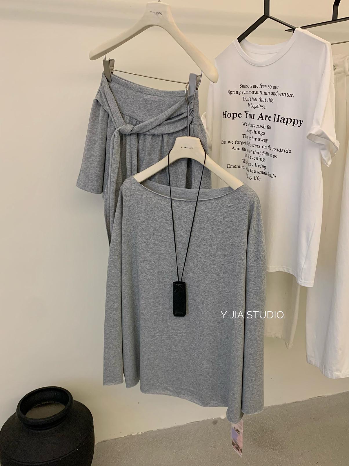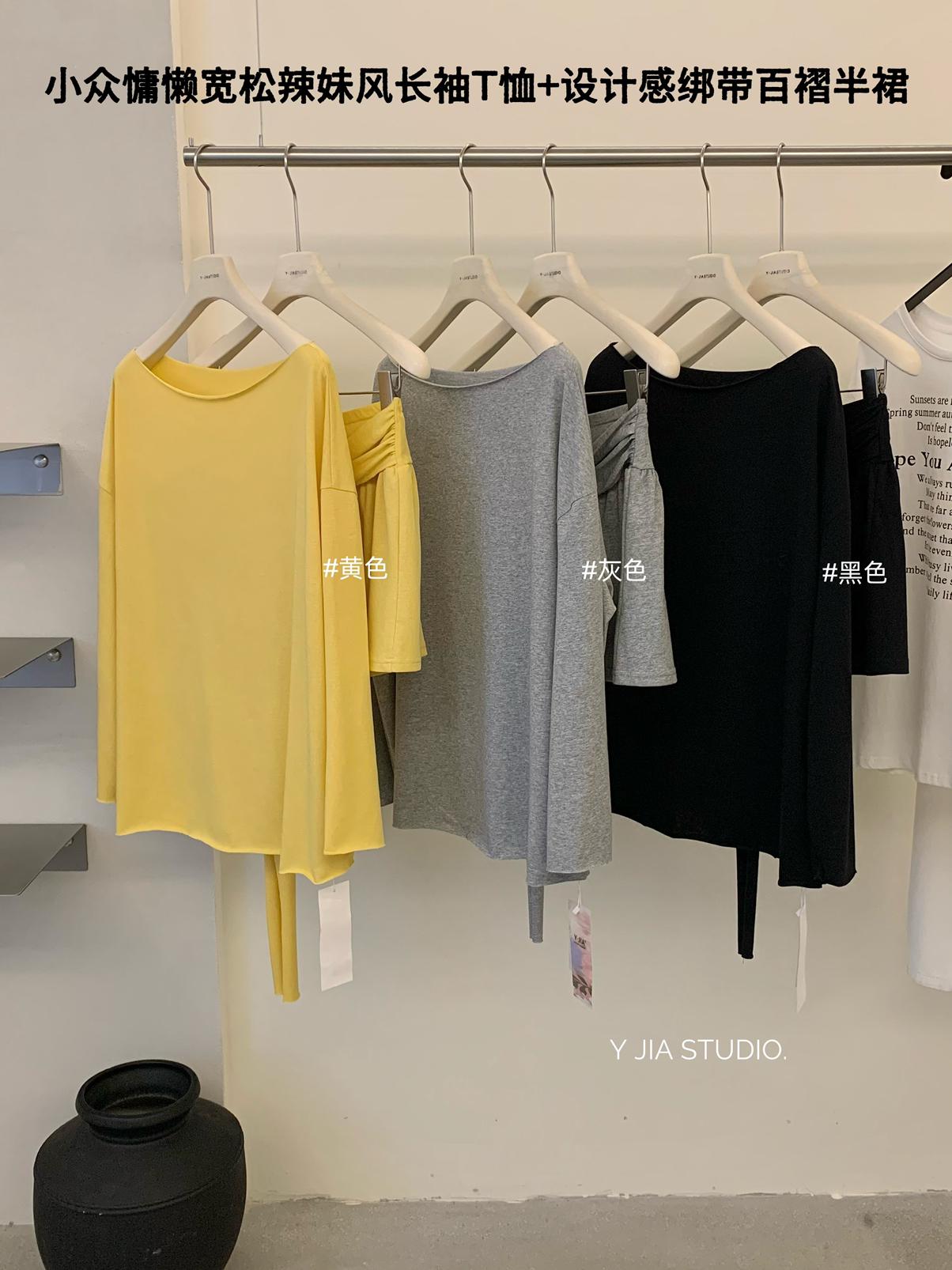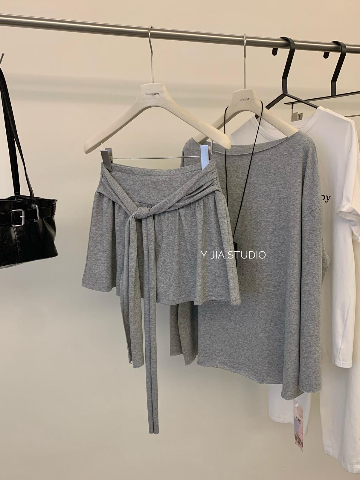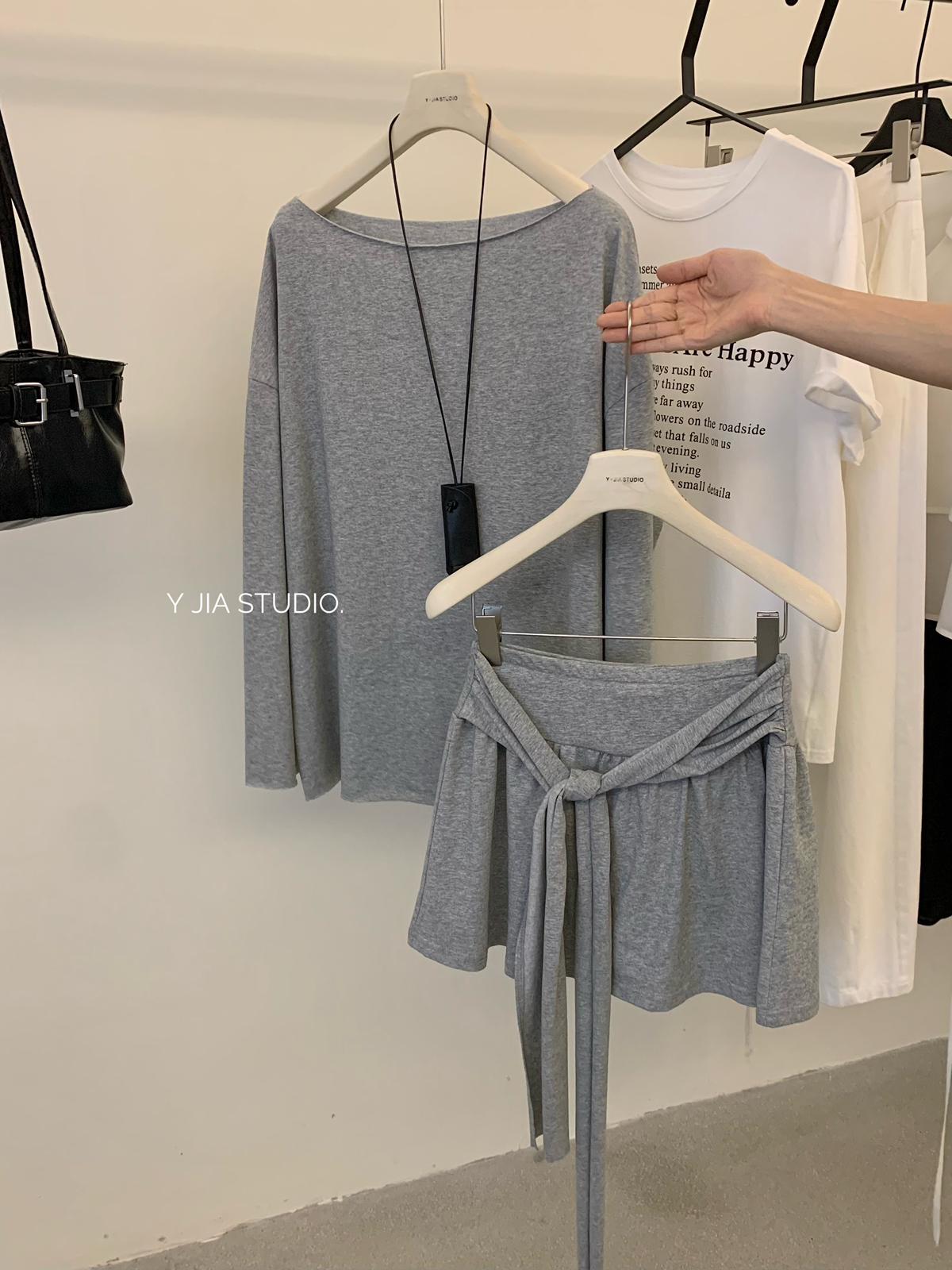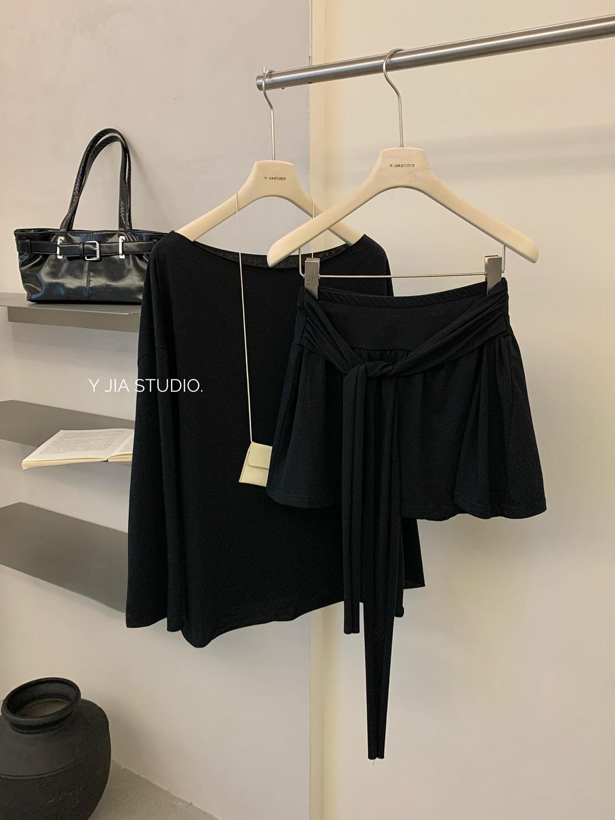 【C6904】小衆慵懶寬鬆辣妹風長袖T恤+設計感綁帶百褶半裙套裝