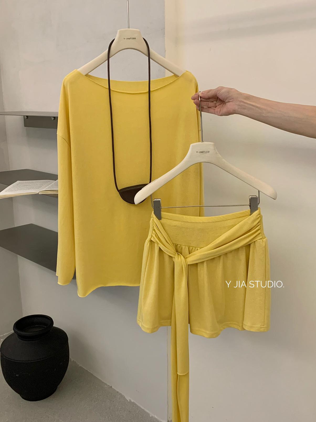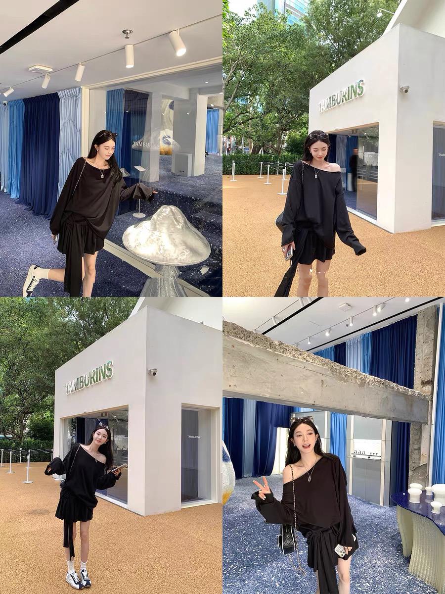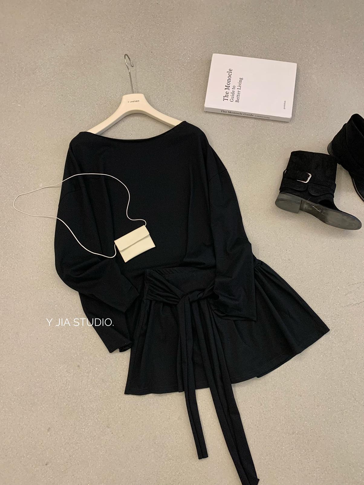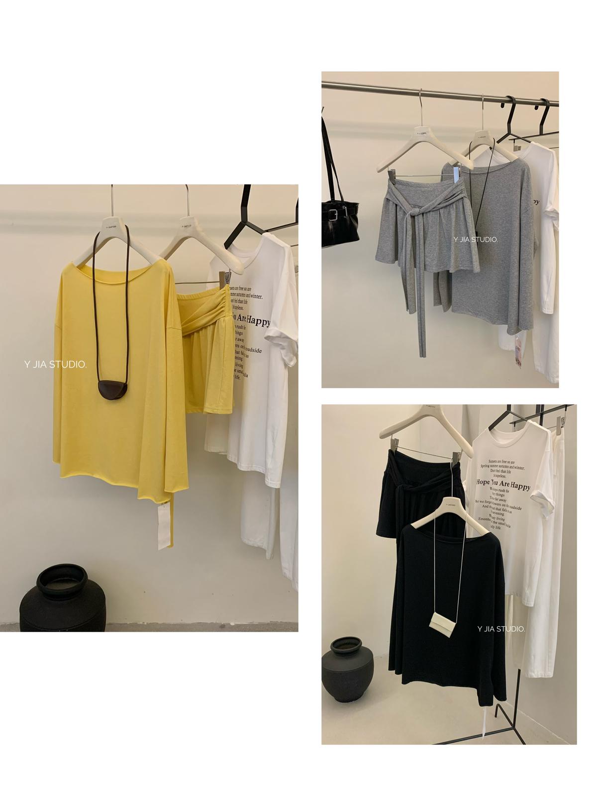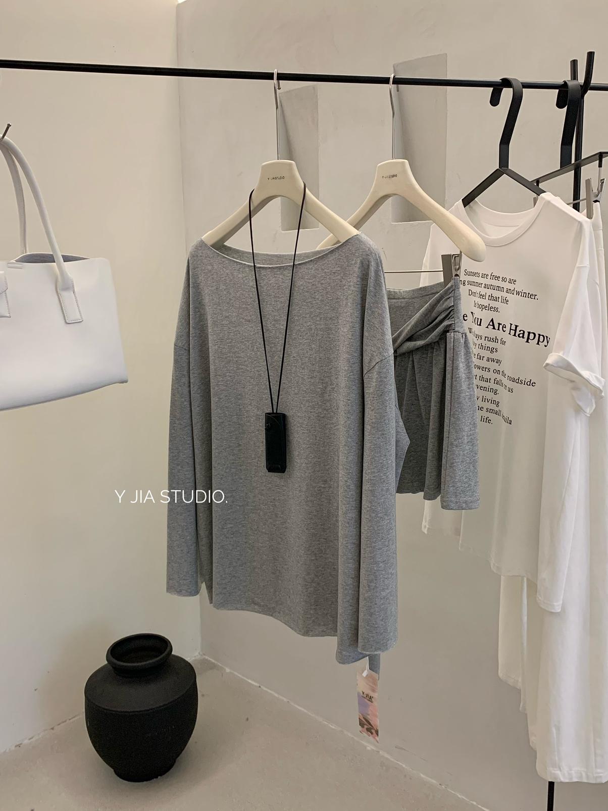 【C6904】小衆慵懶寬鬆辣妹風長袖T恤+設計感綁帶百褶半裙套裝
