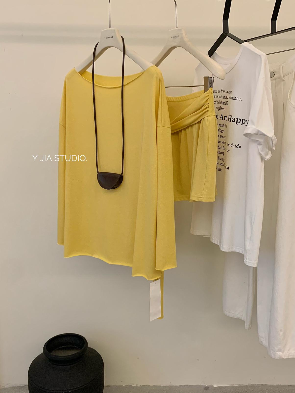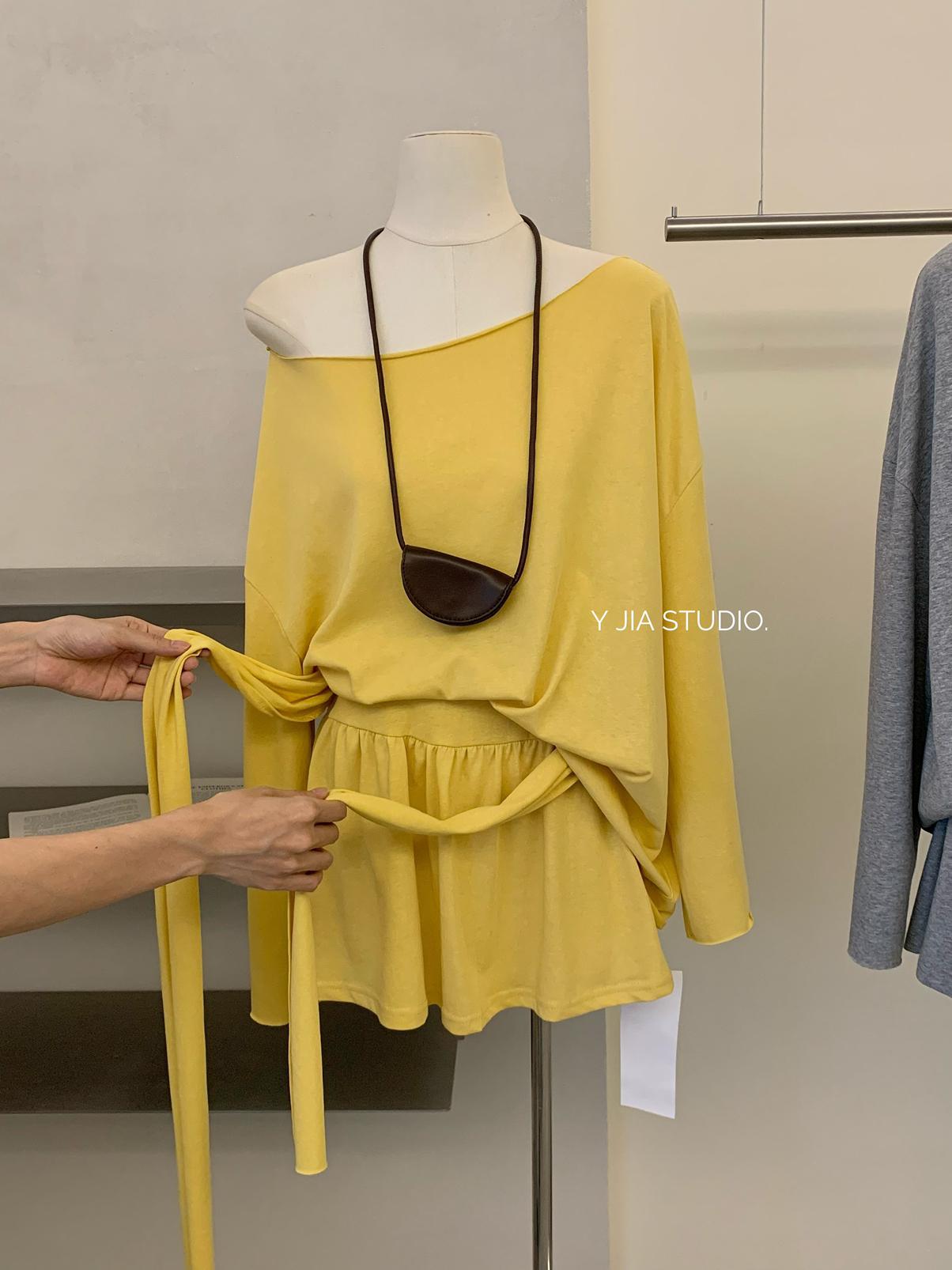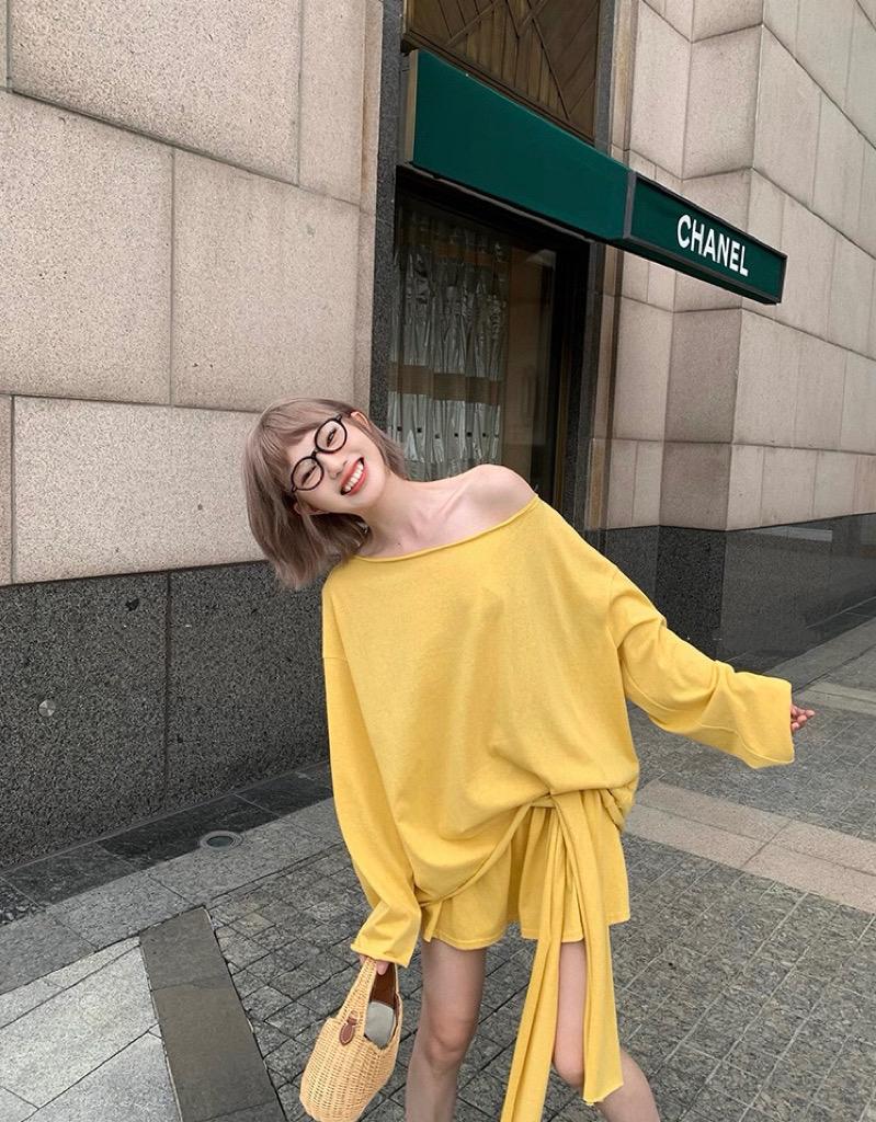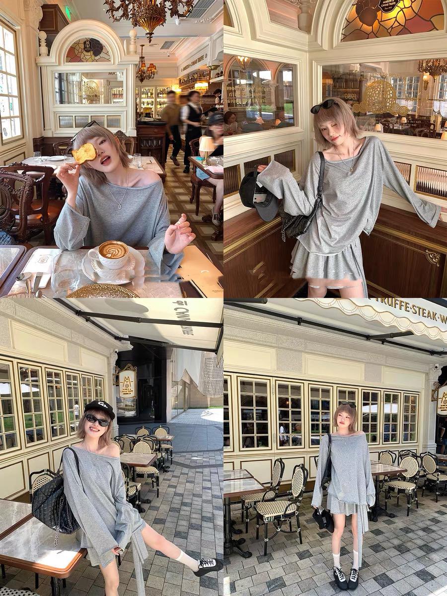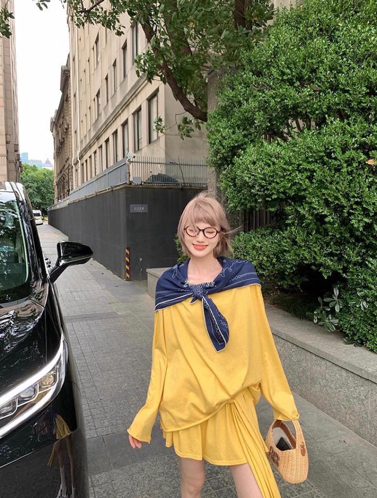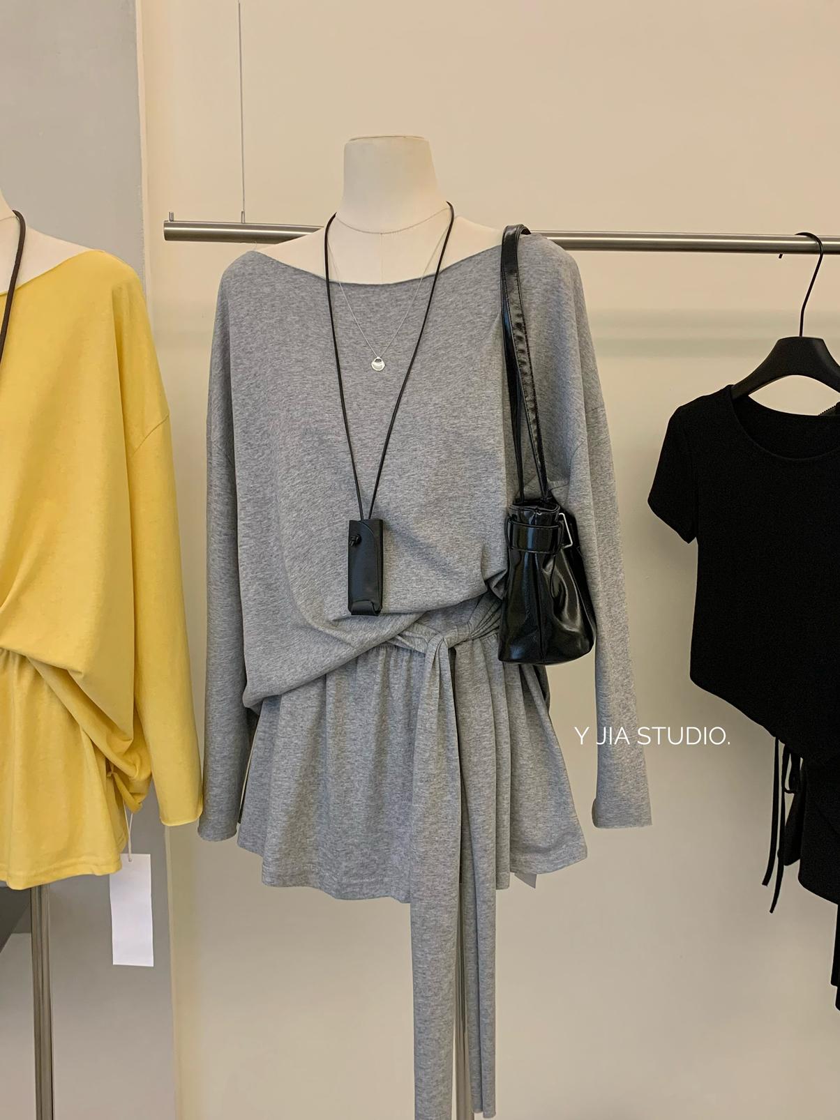 【C6904】小衆慵懶寬鬆辣妹風長袖T恤+設計感綁帶百褶半裙套裝