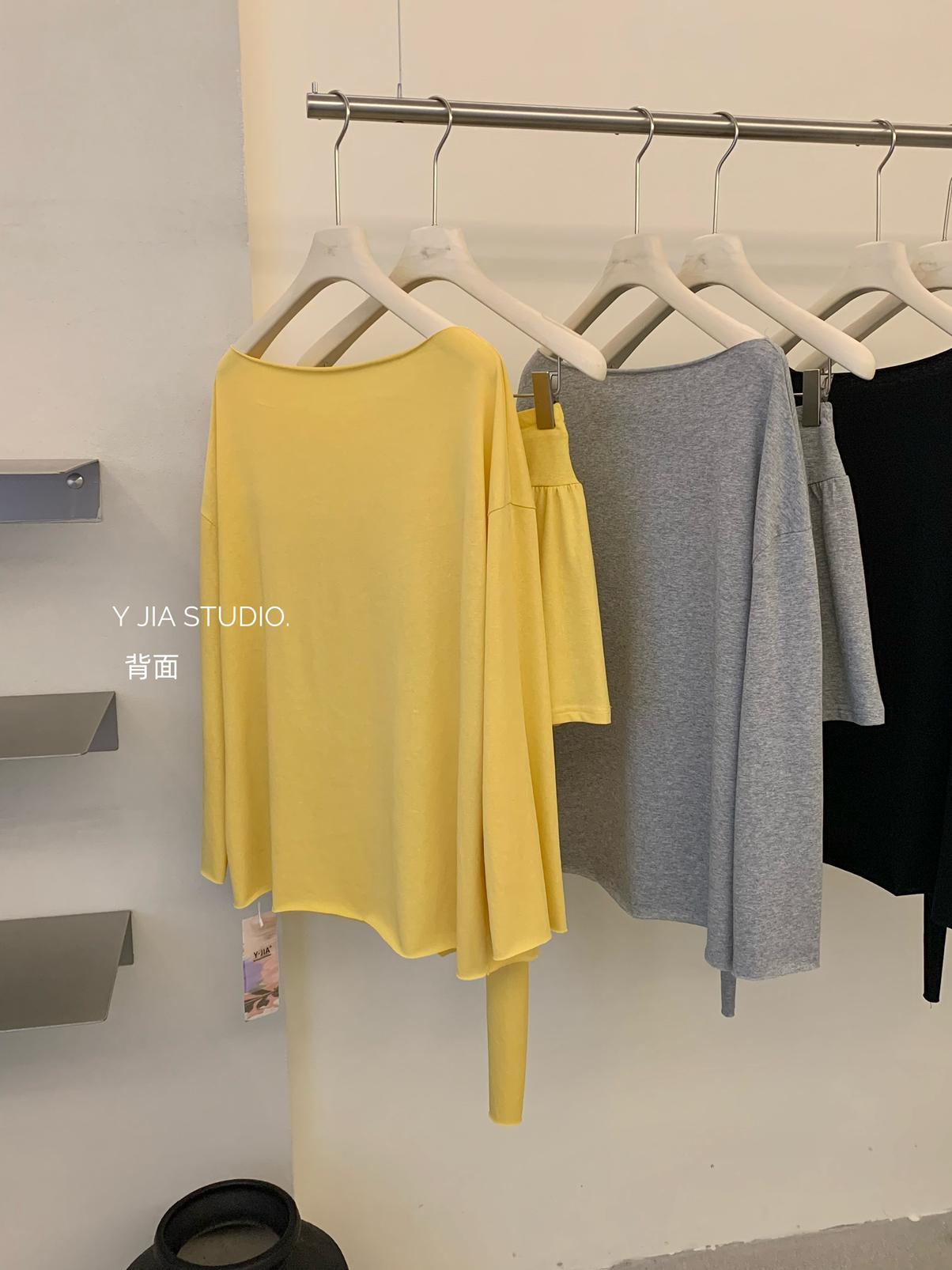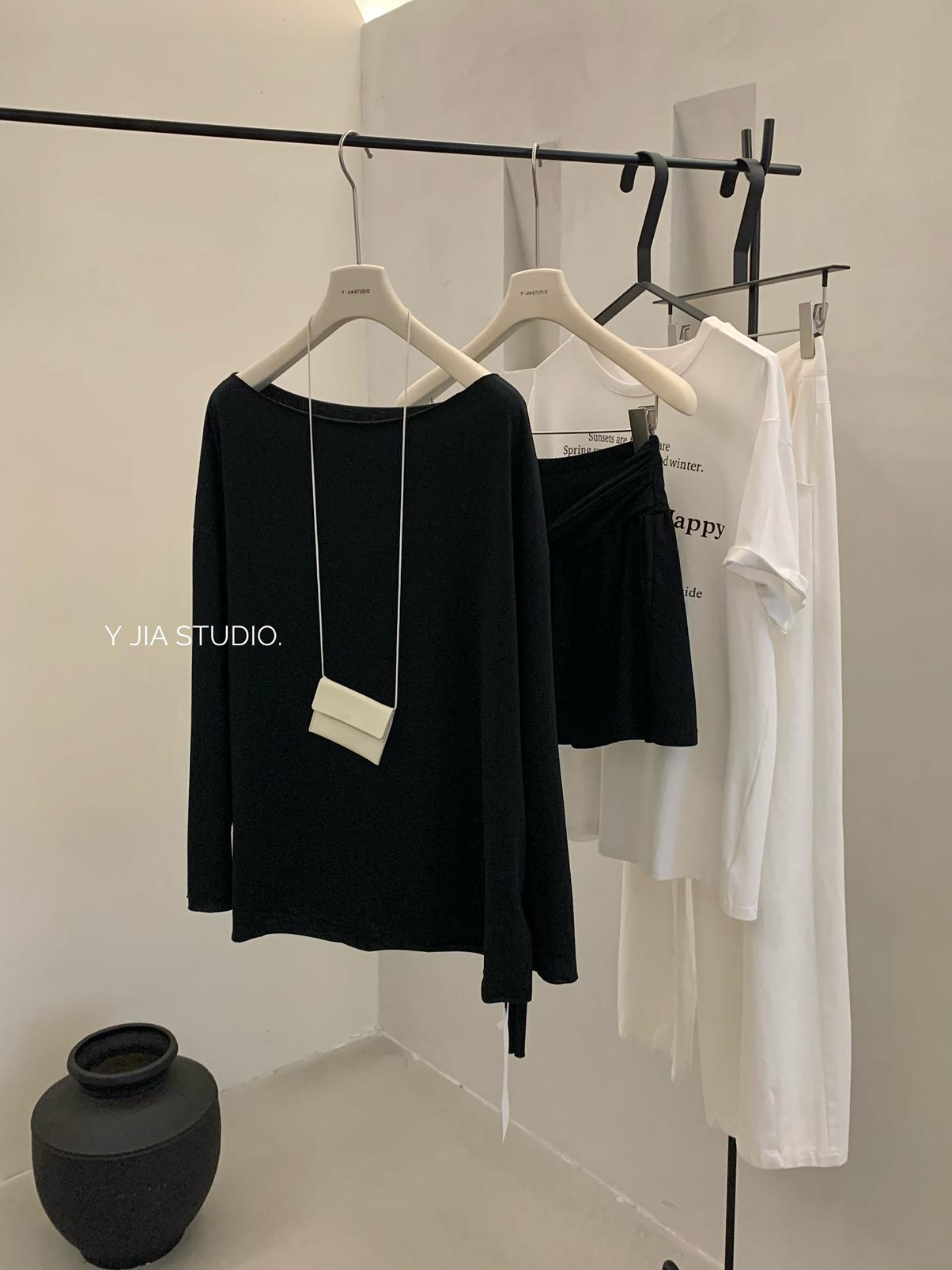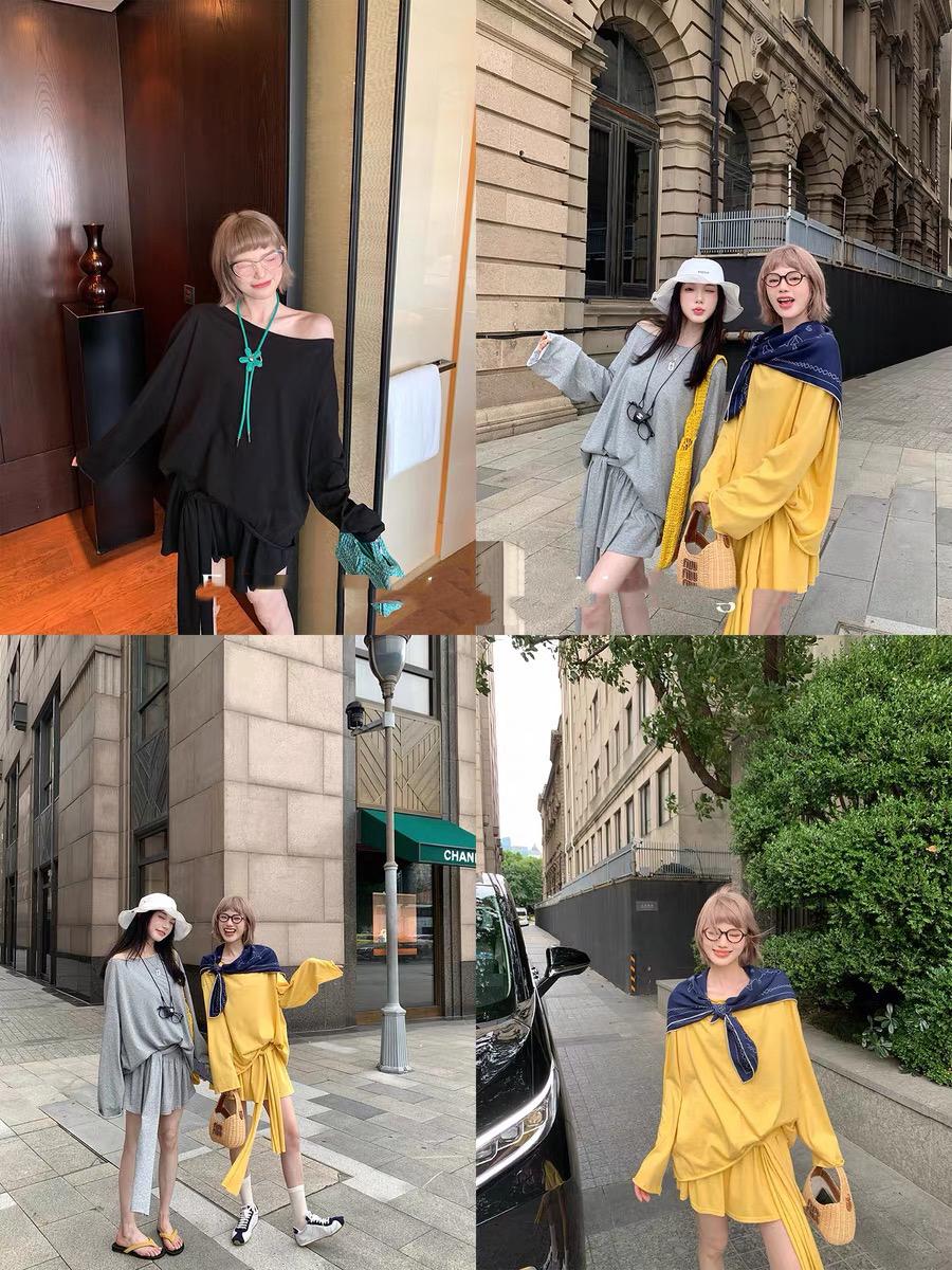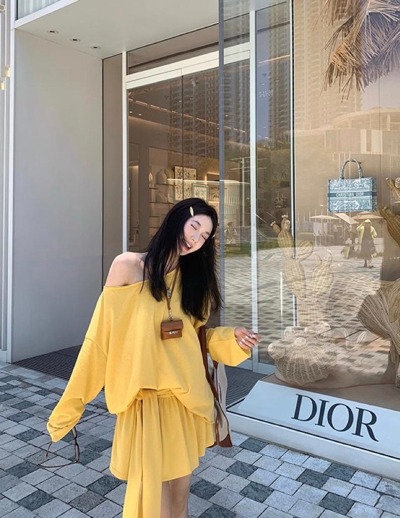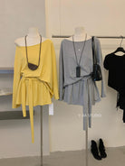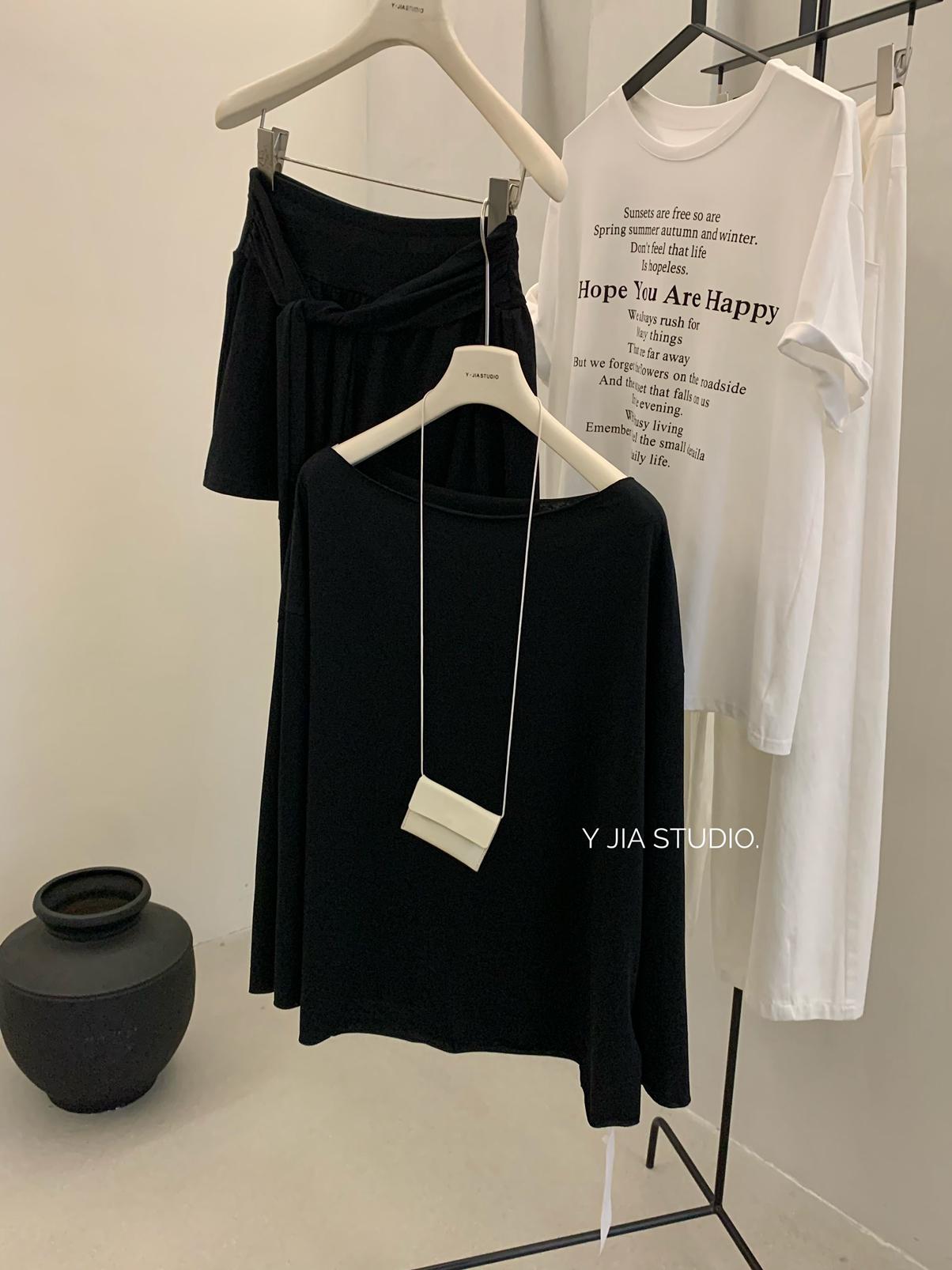【C6904】小衆慵懶寬鬆辣妹風長袖T恤+設計感綁帶百褶半裙套裝