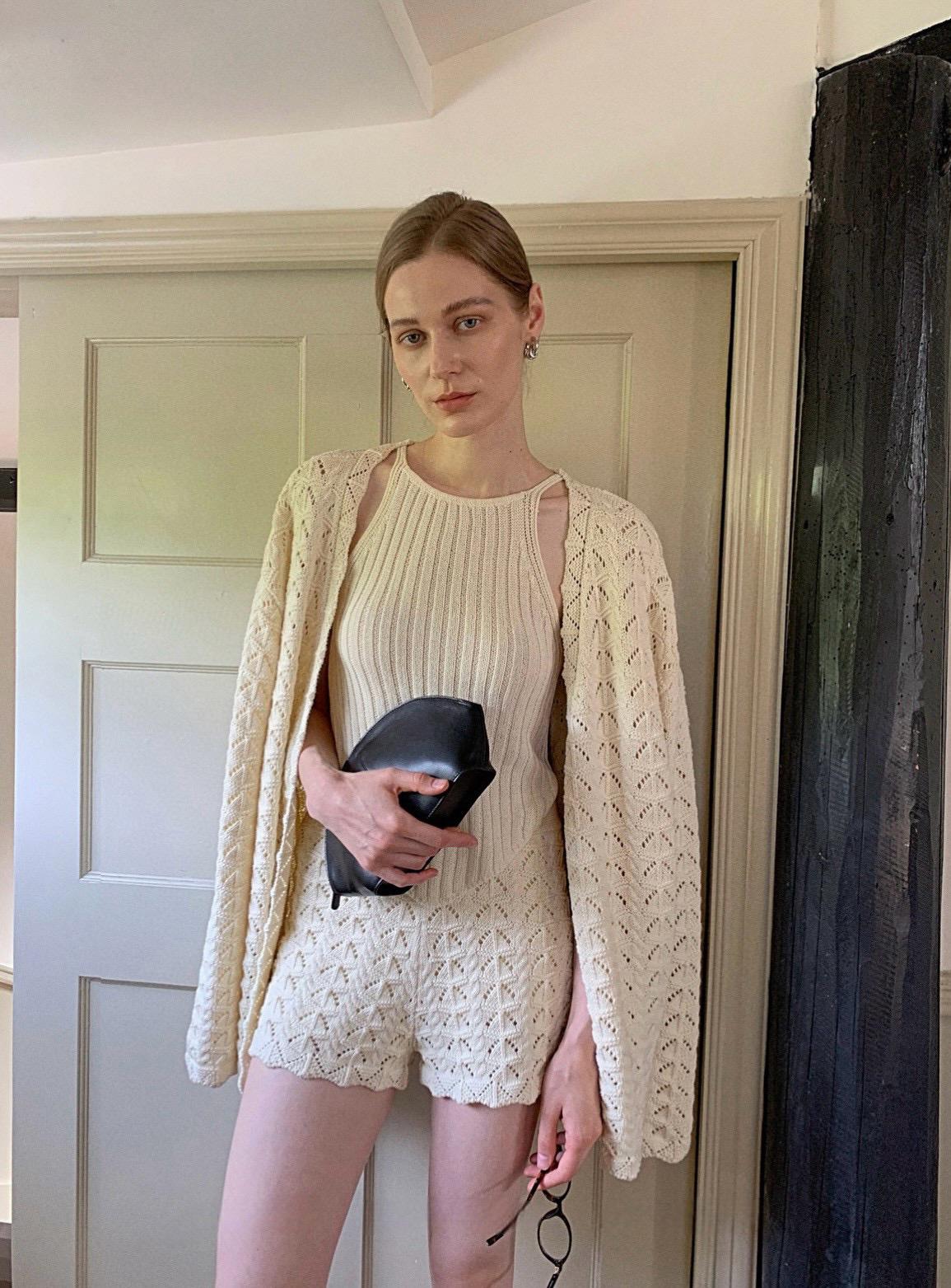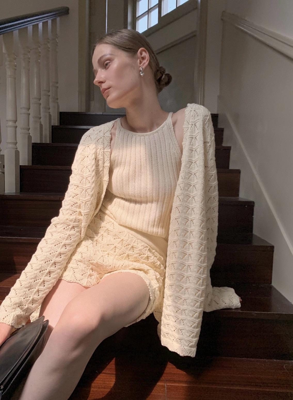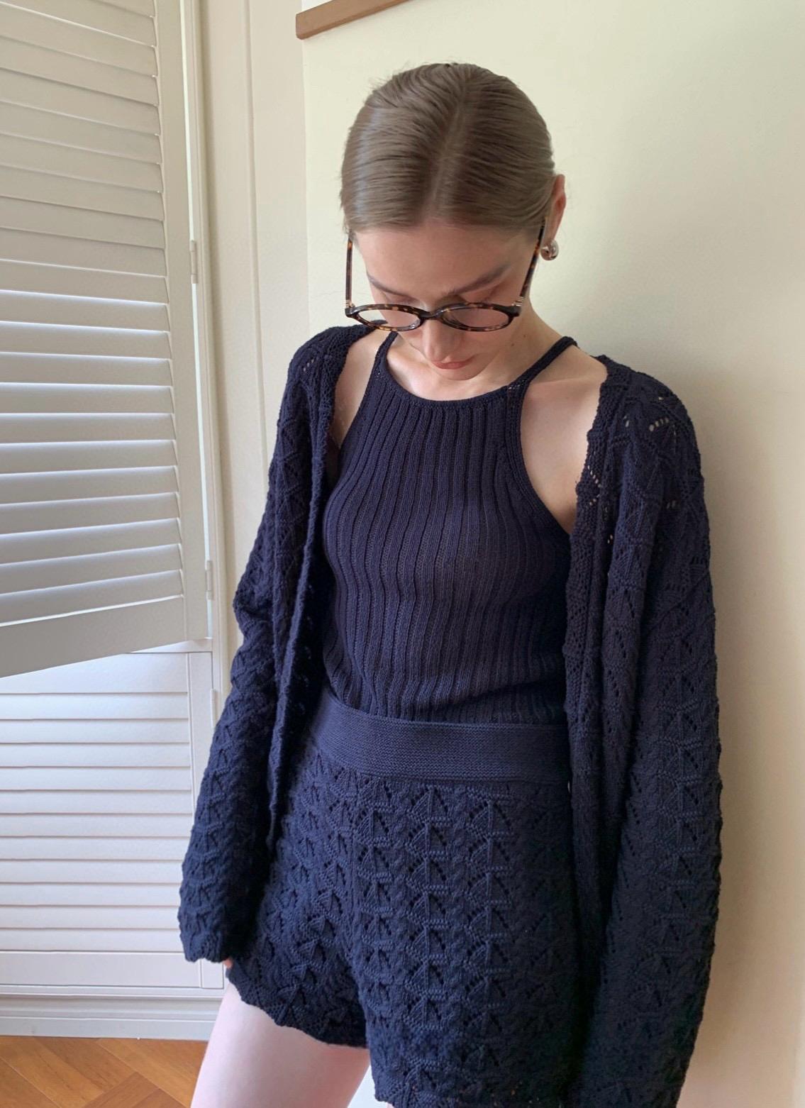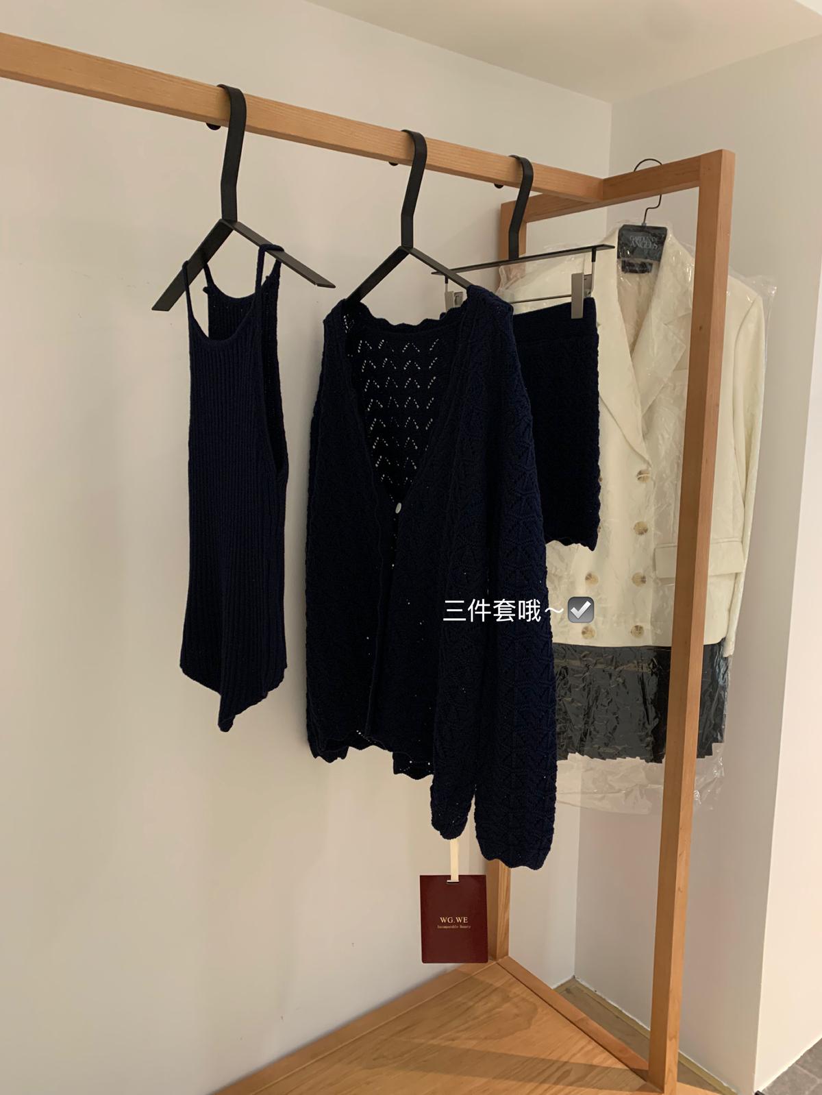 3. 【C7195】復古手工感鏤空針織開衫+吊帶背心+百搭短褲套裝