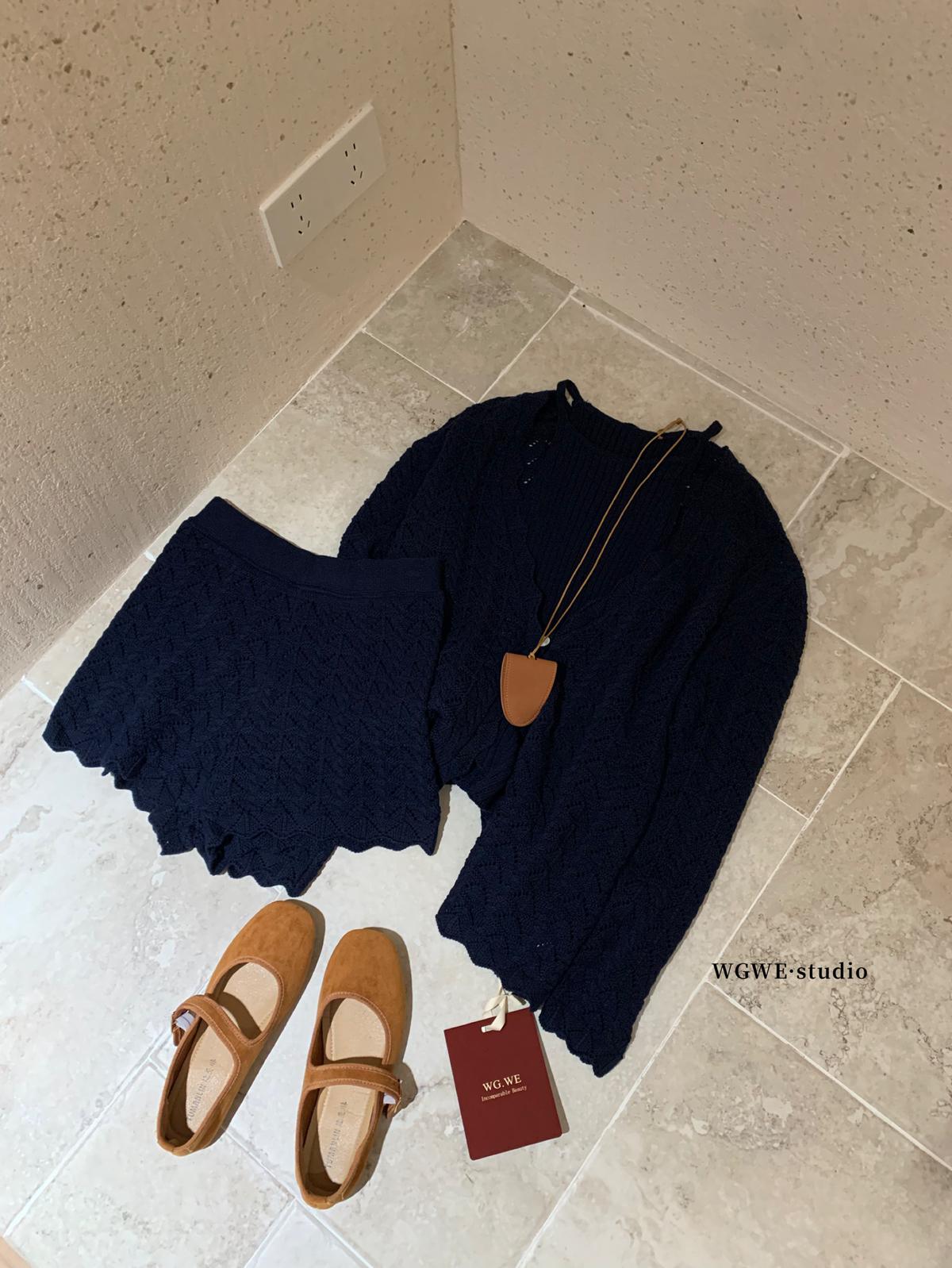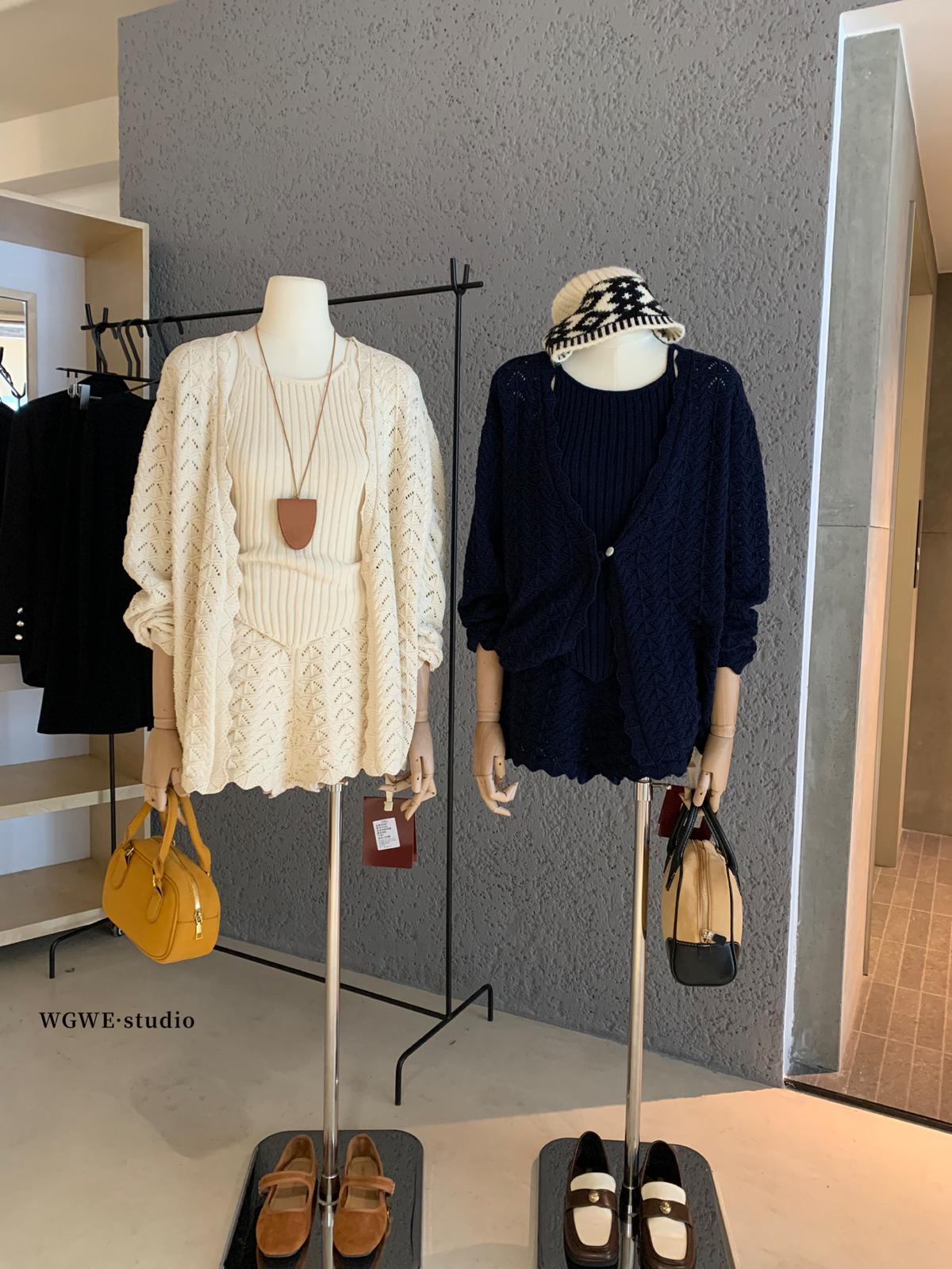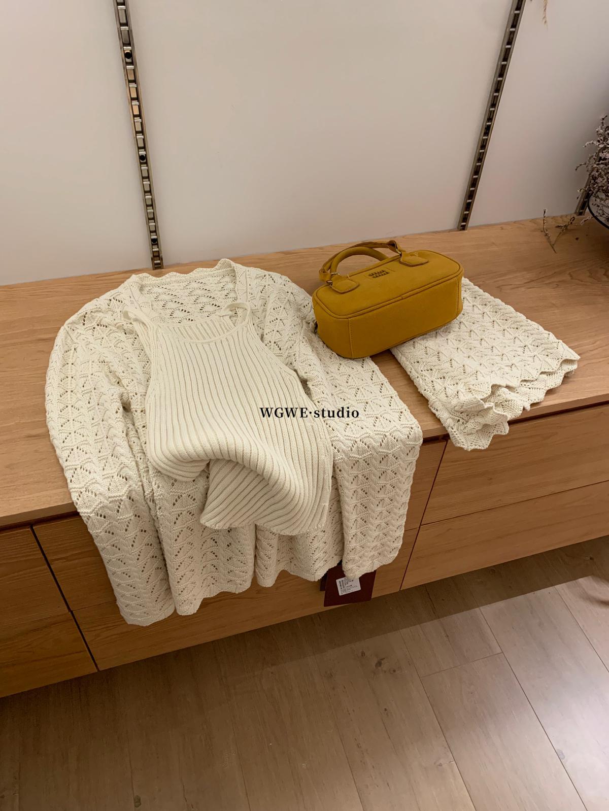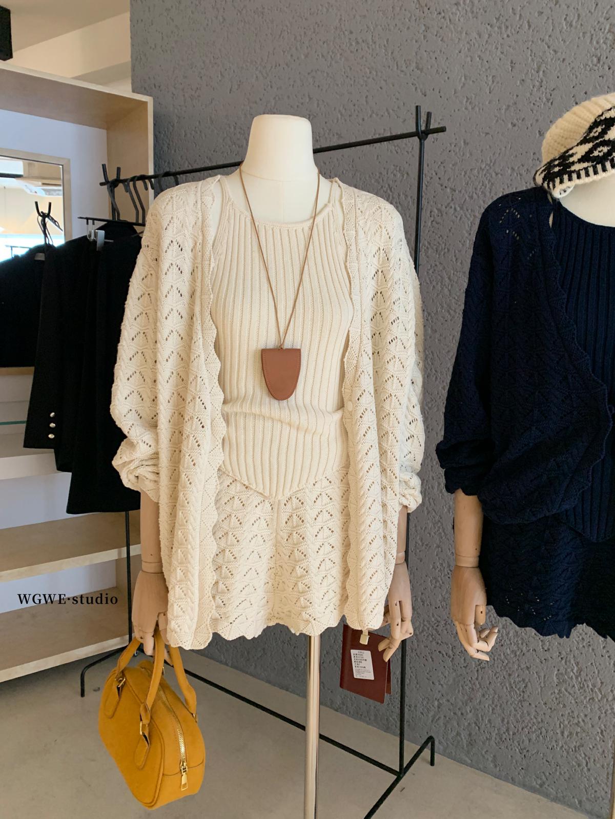 【C7195】復古手工感鏤空針織開衫+吊帶背心+百搭短褲套裝