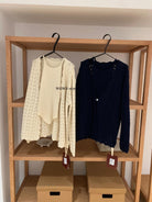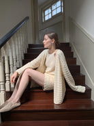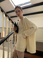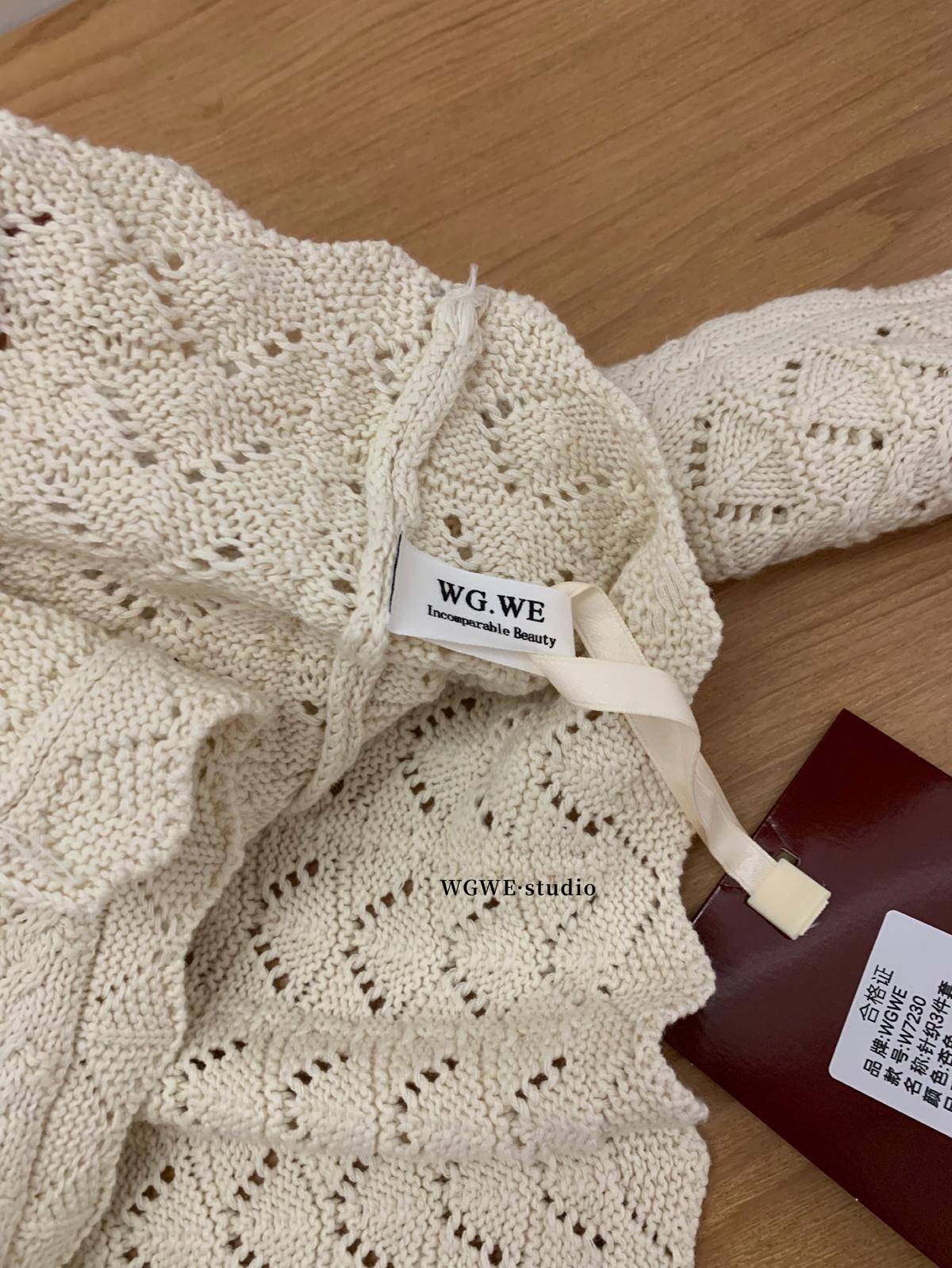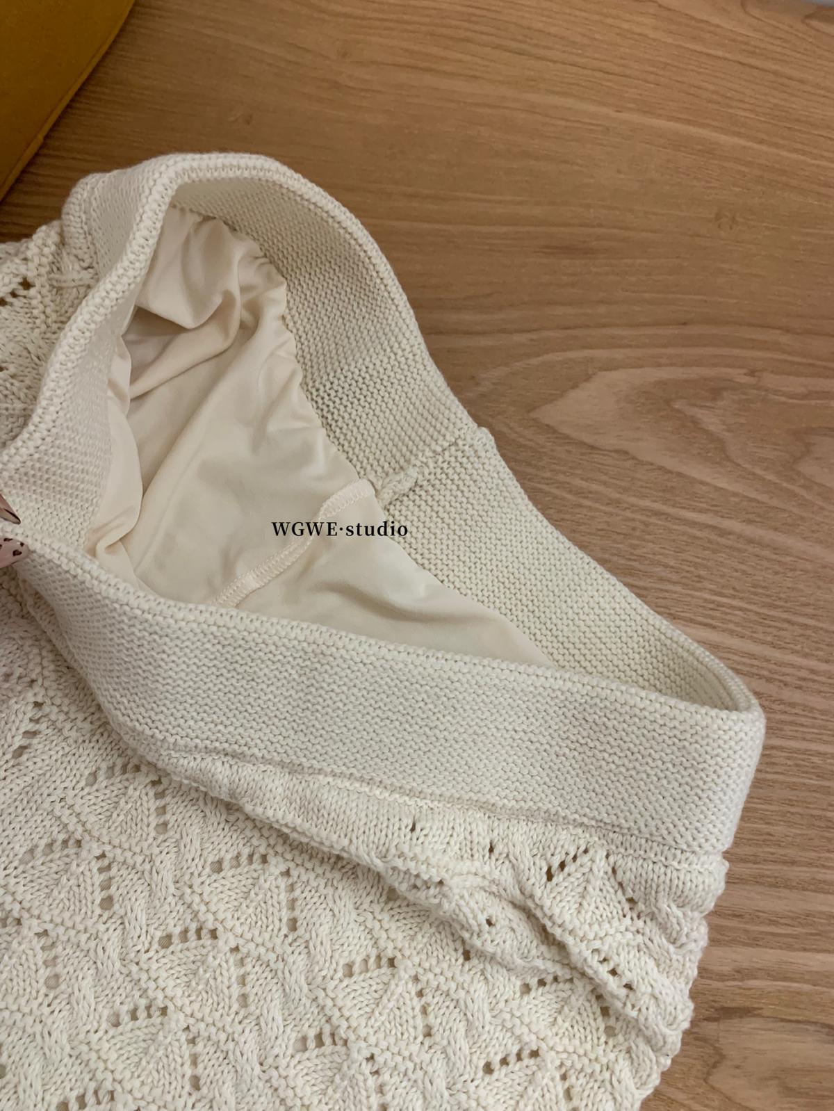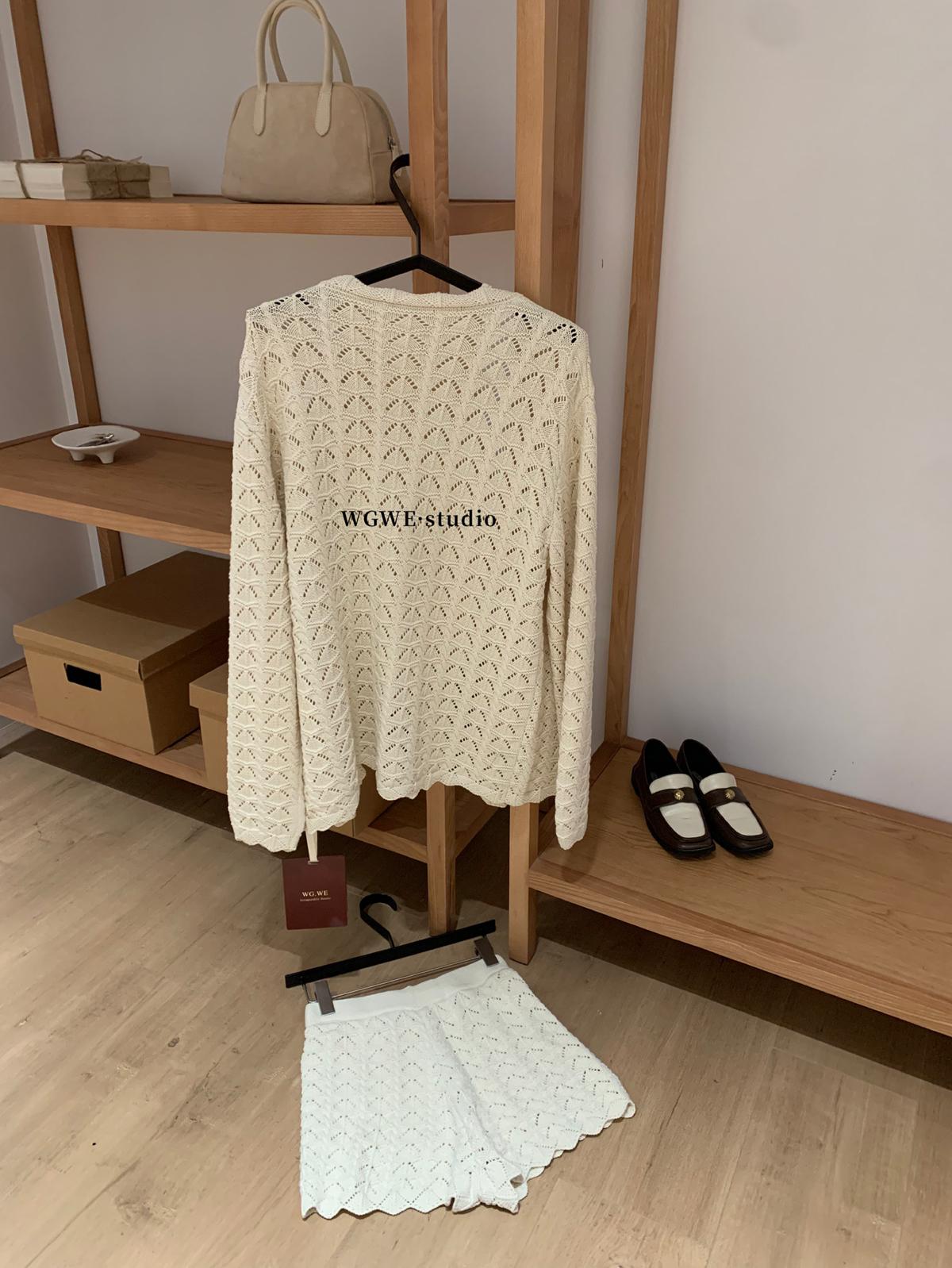 【C7195】復古手工感鏤空針織開衫+吊帶背心+百搭短褲套裝
