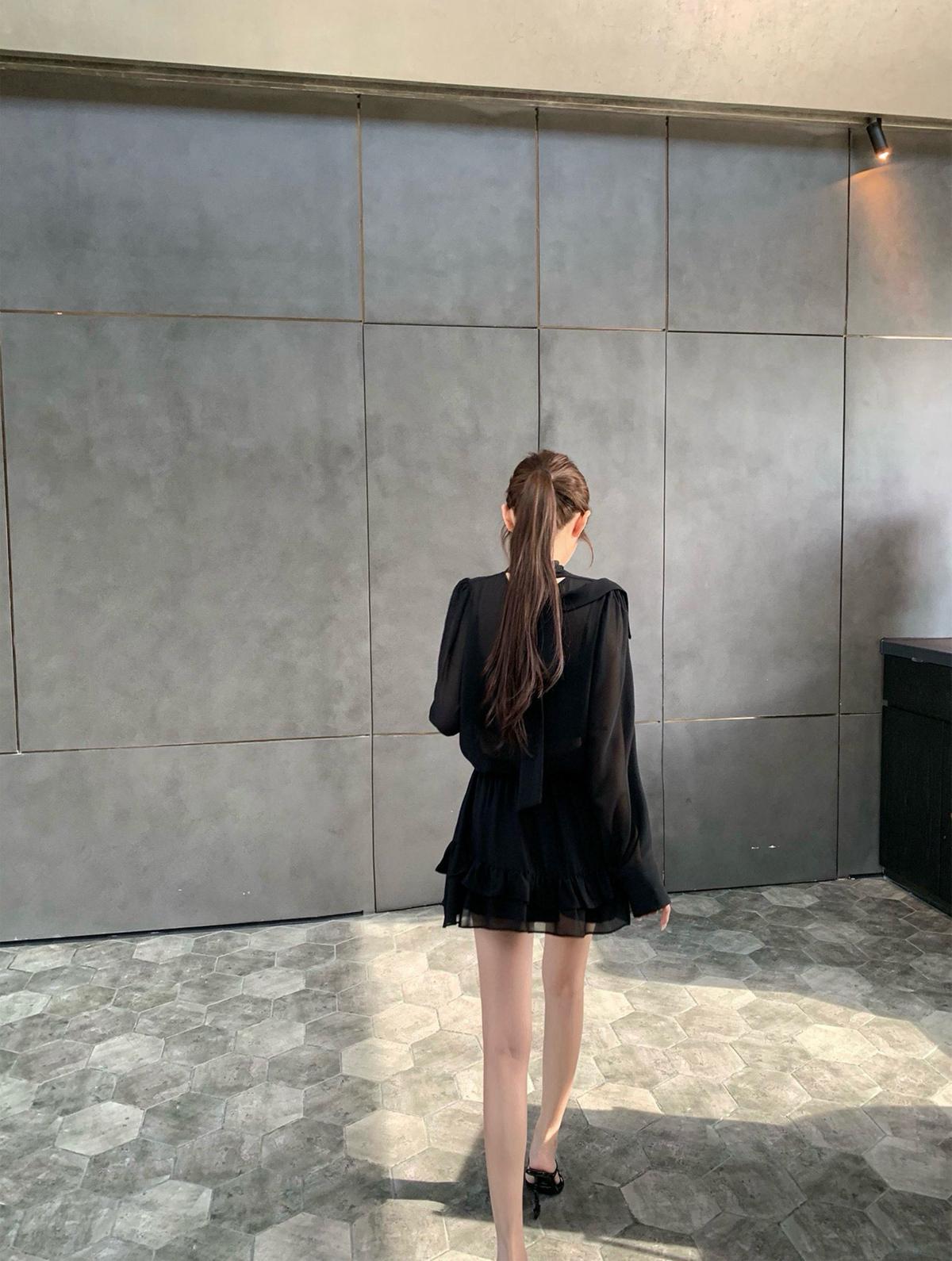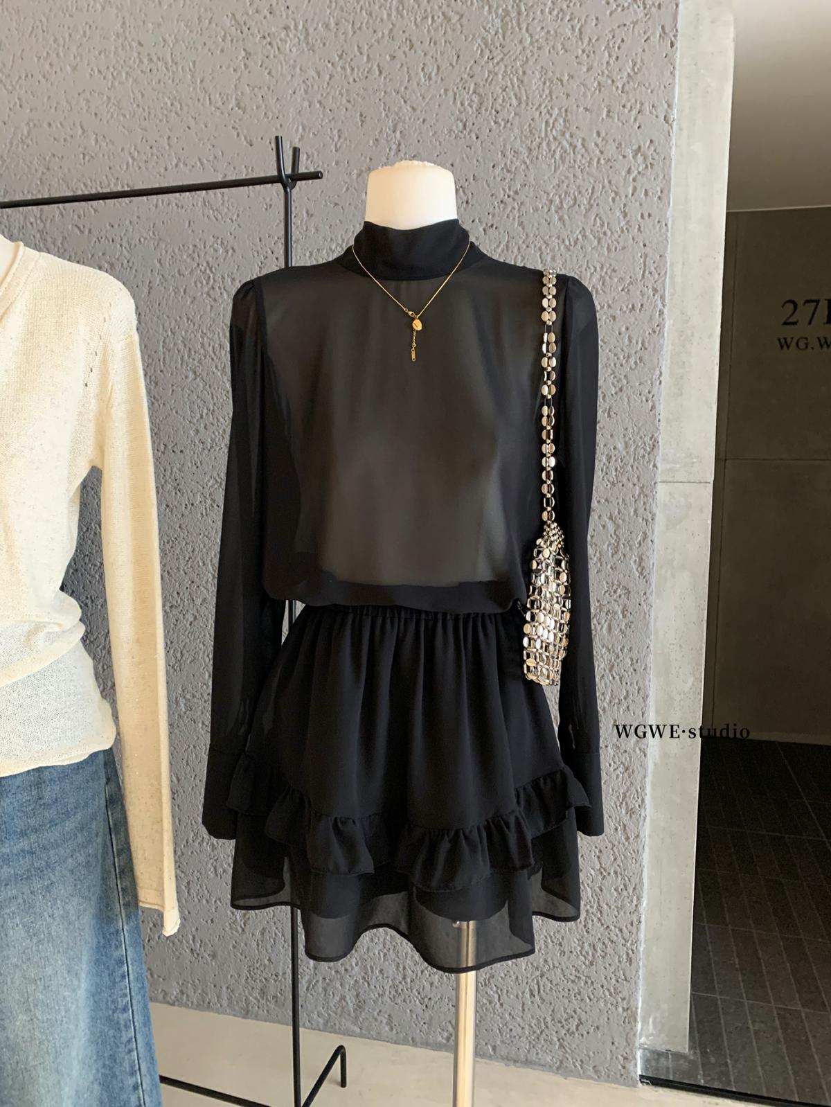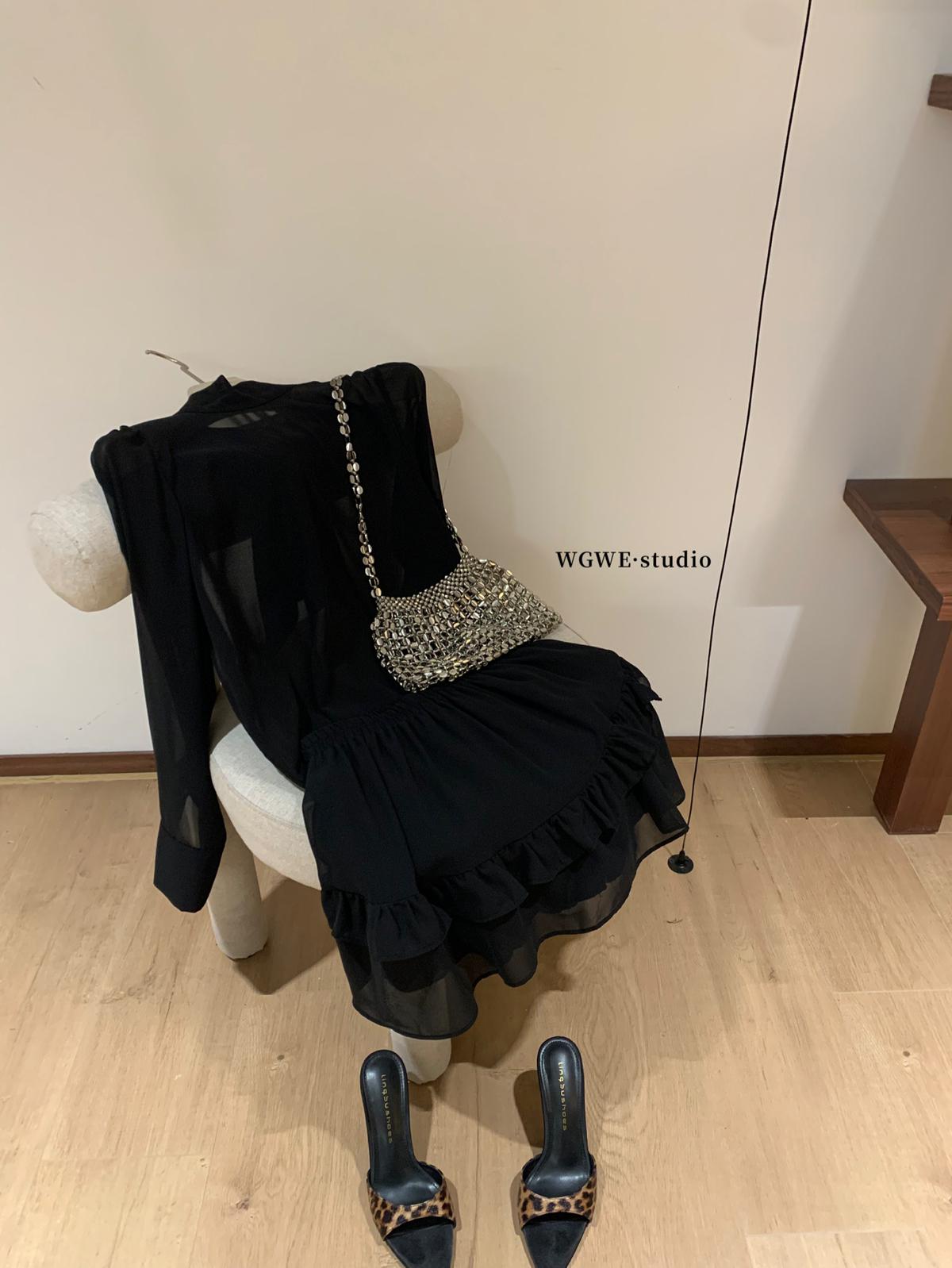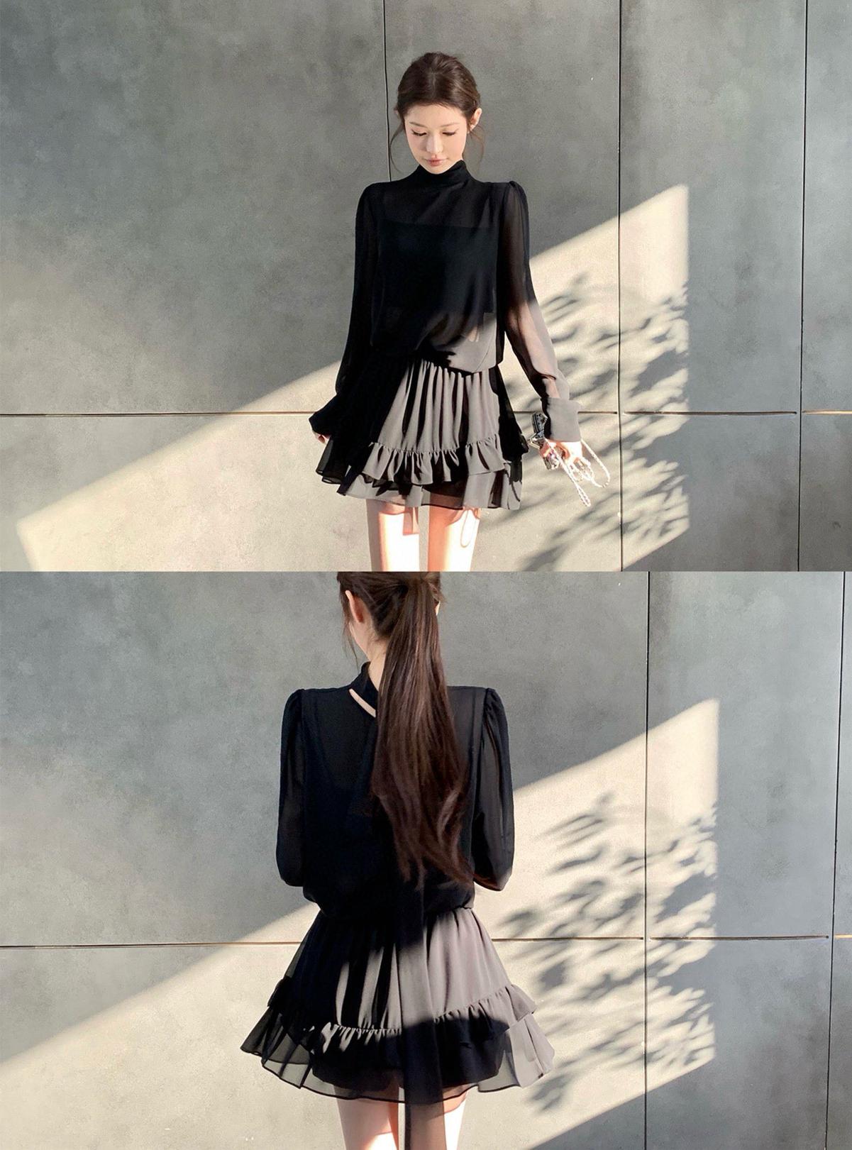 3. 【C7564】「屋頂」氣質美女黑色長袖小衫+荷葉短裙套裝