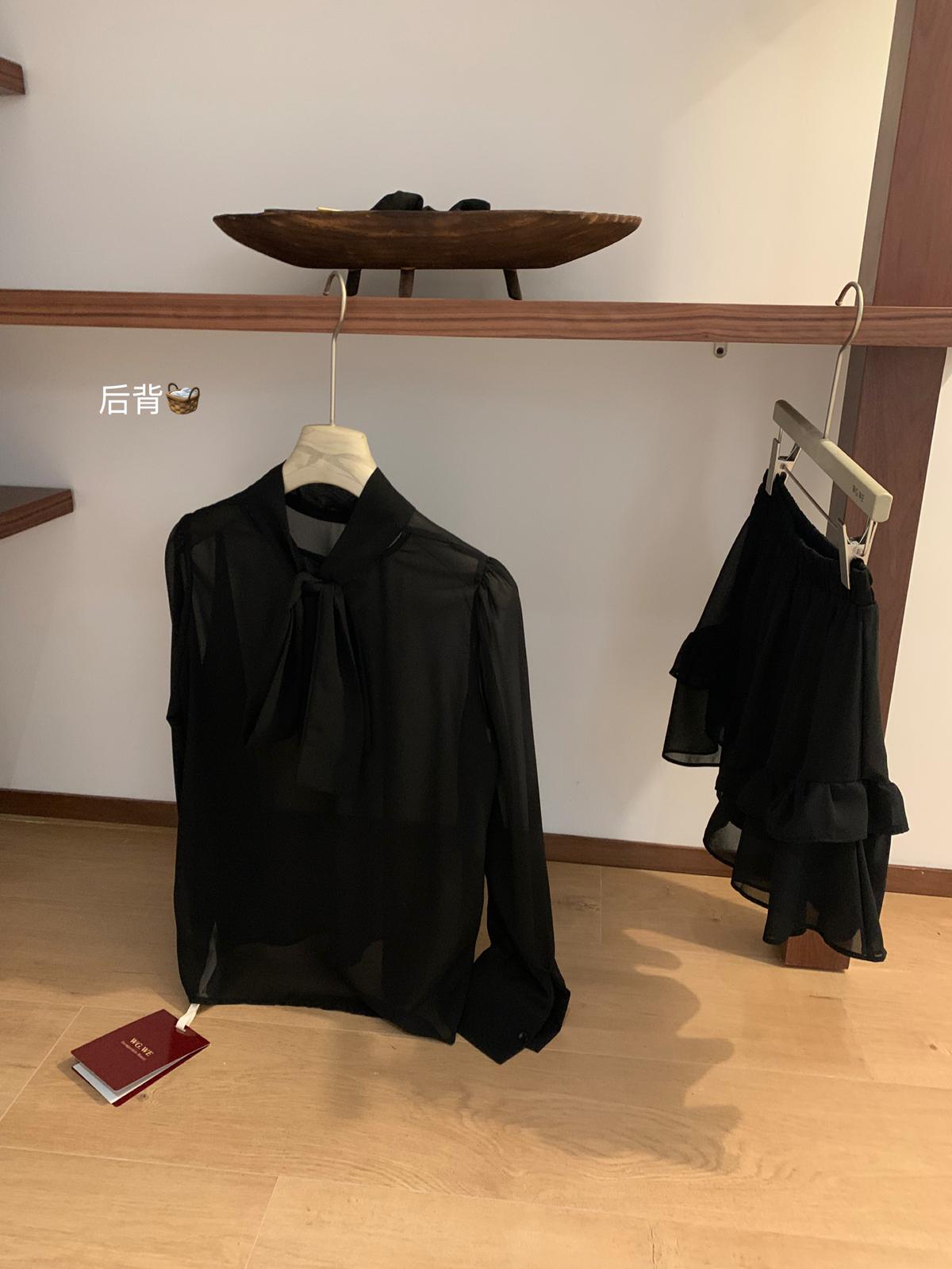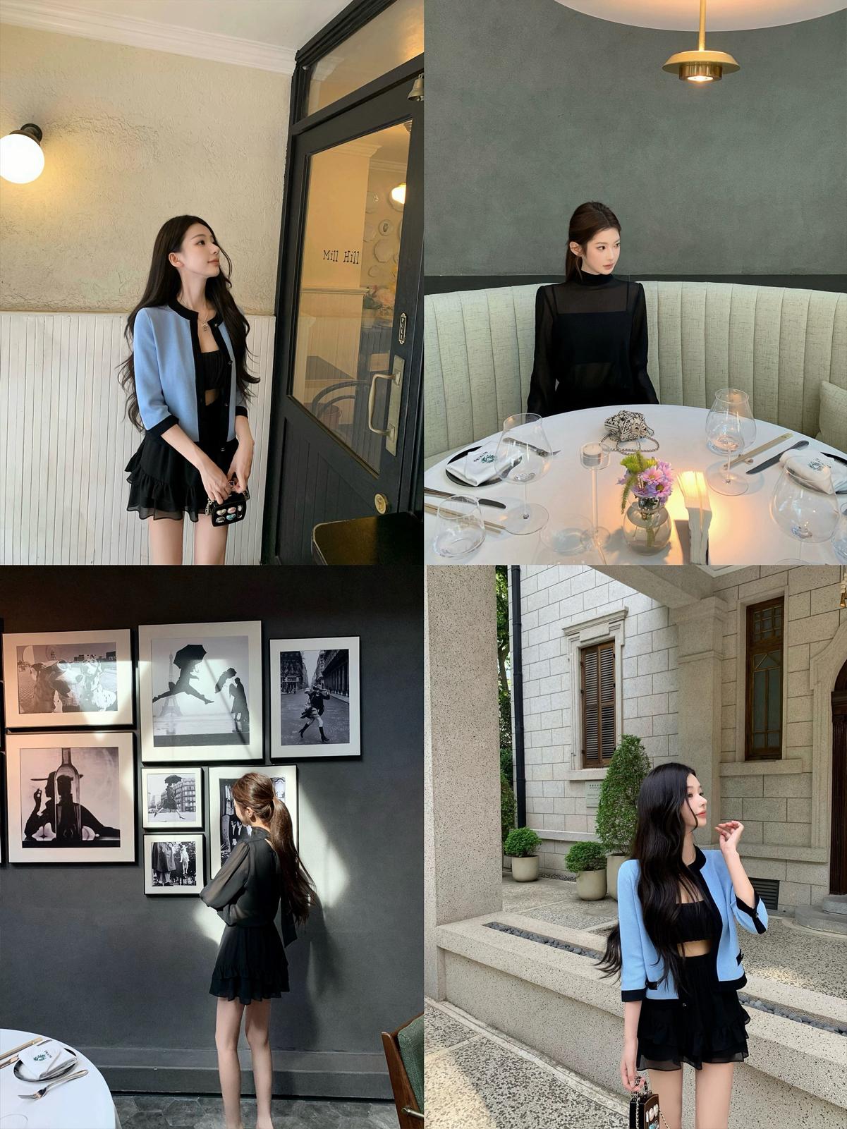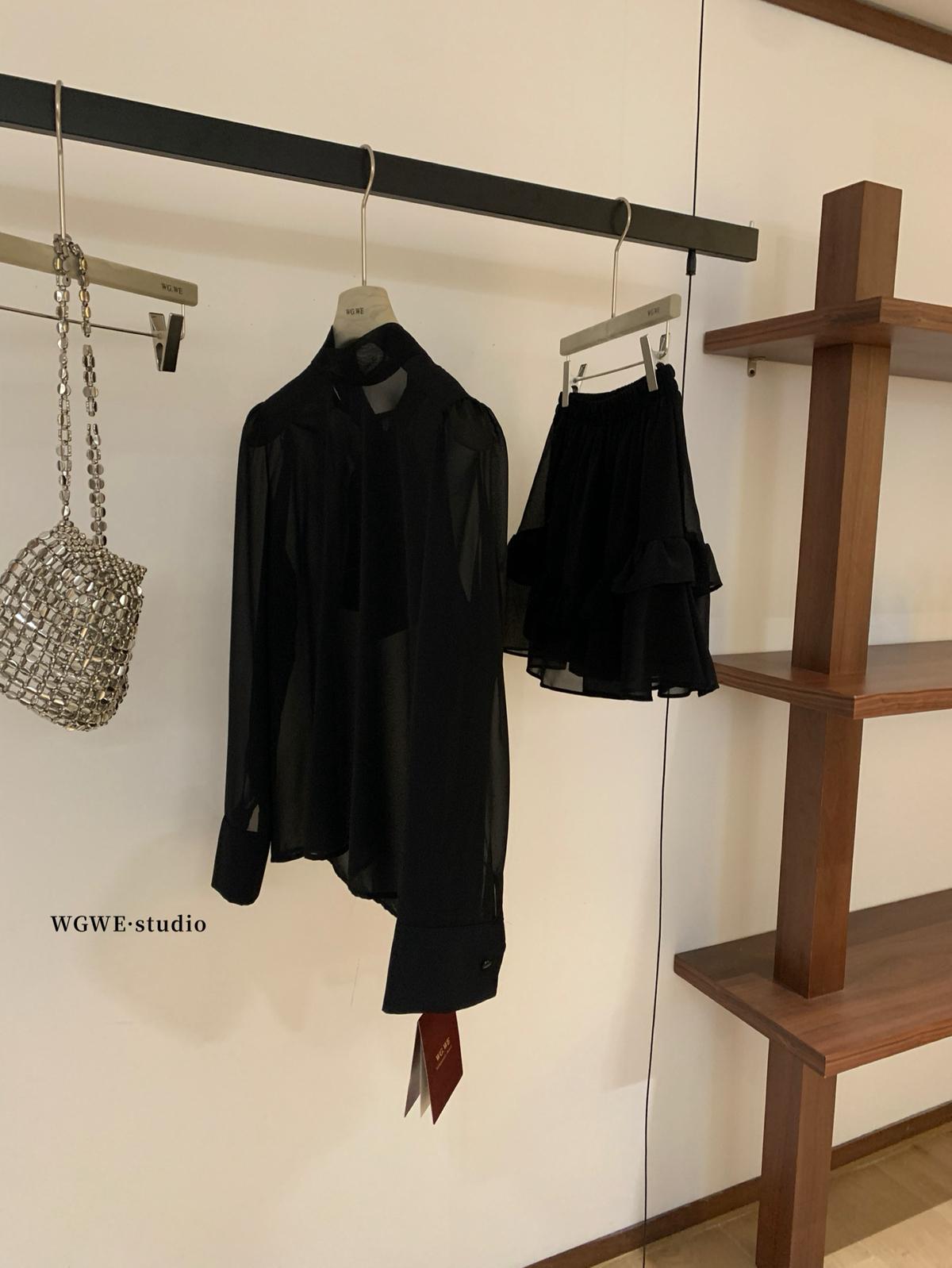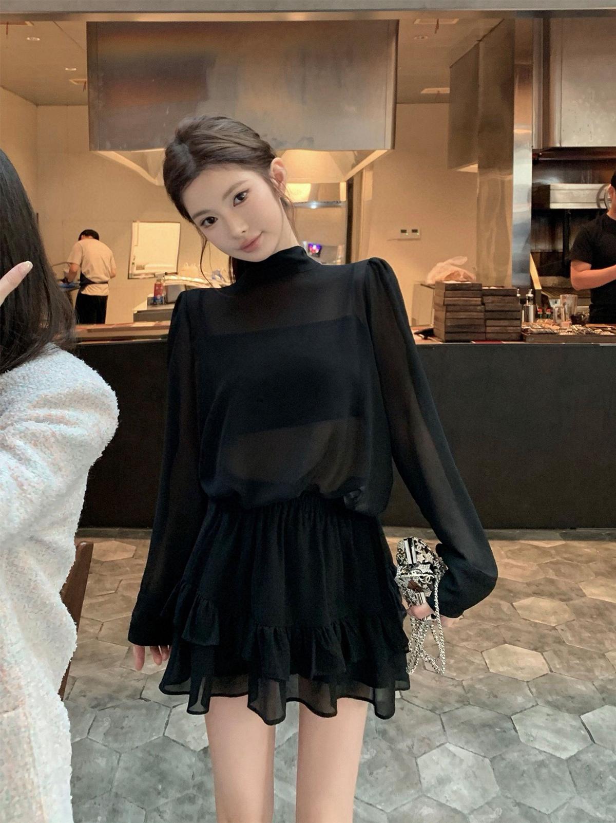 3. 【C7564】「屋頂」氣質美女黑色長袖小衫+荷葉短裙套裝