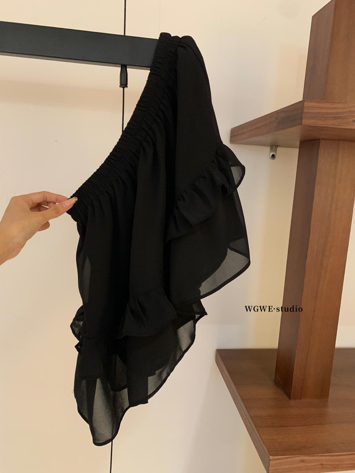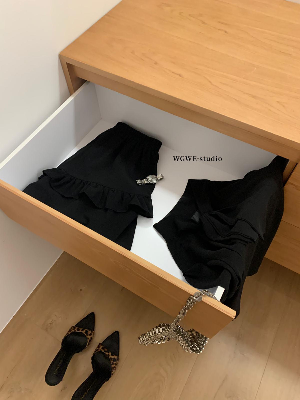【C7564】「屋頂」氣質美女黑色長袖小衫+荷葉短裙套裝