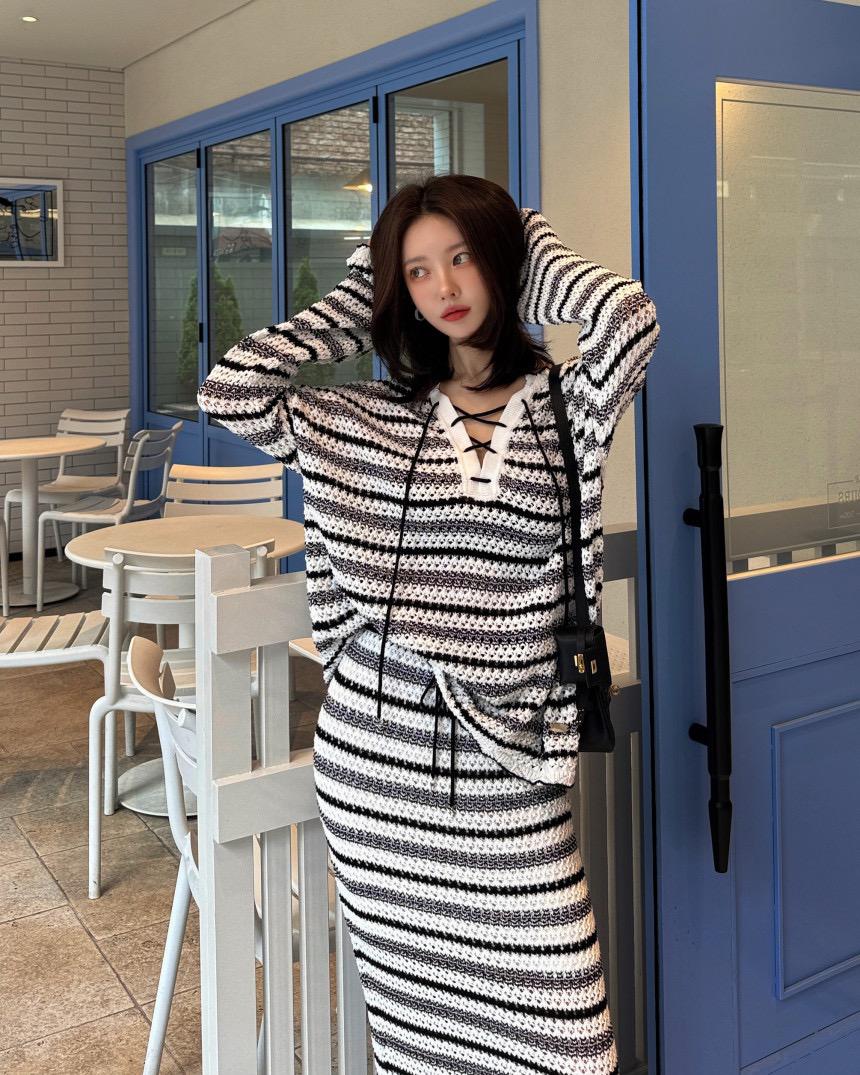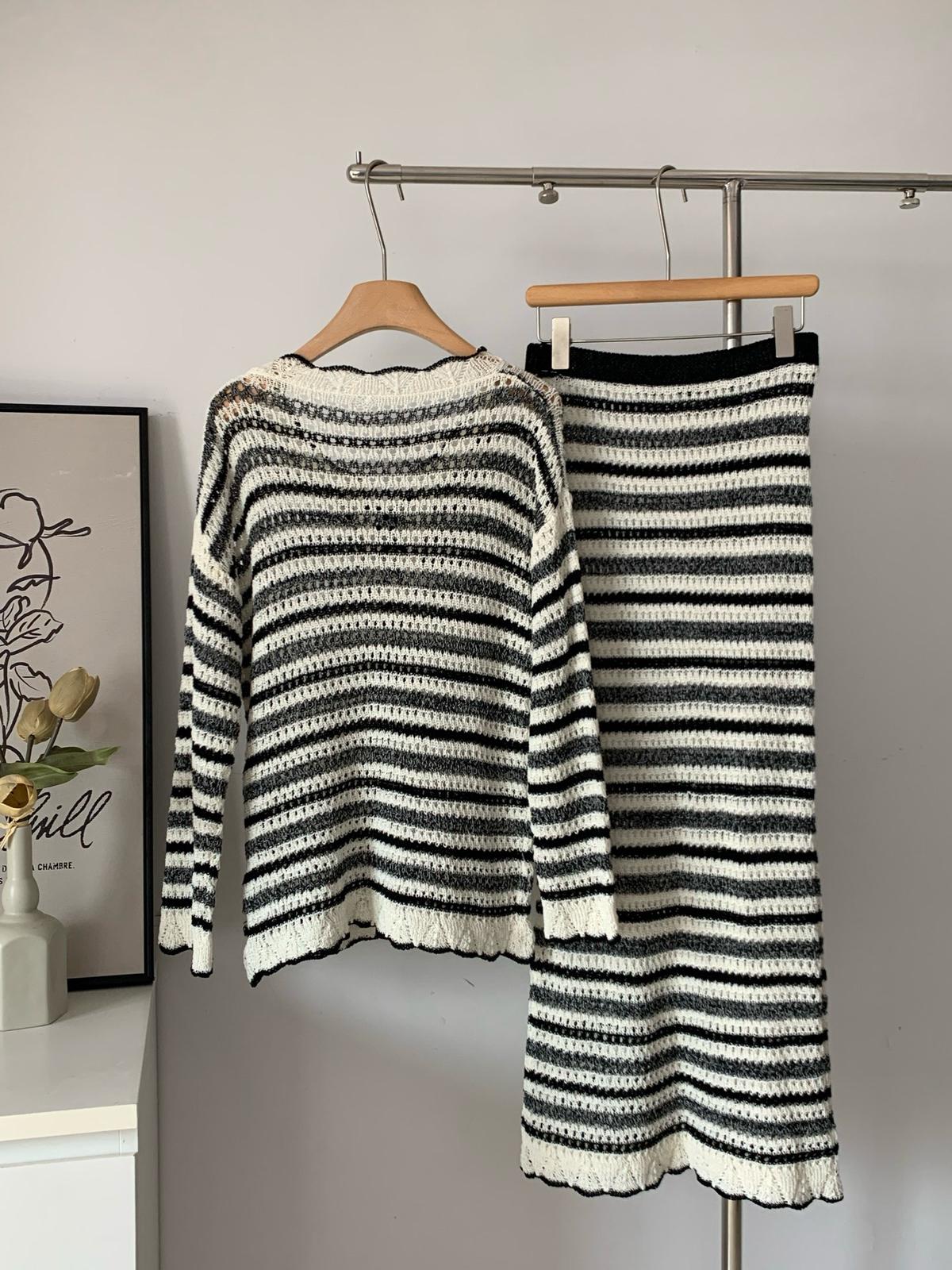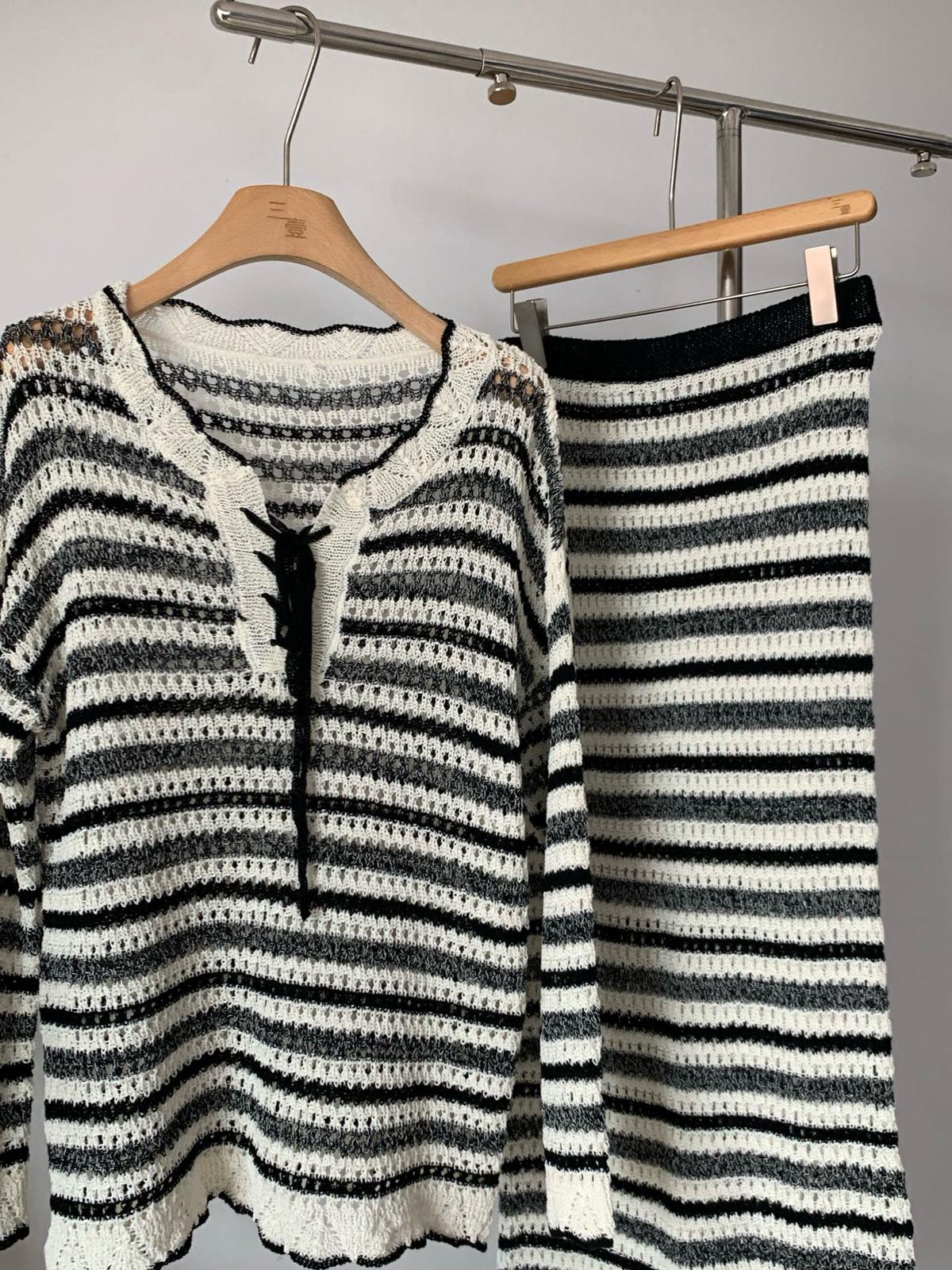 3. 【C7635】韓繫條紋針織氣質v領上衣➕高腰半身裙套裝