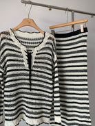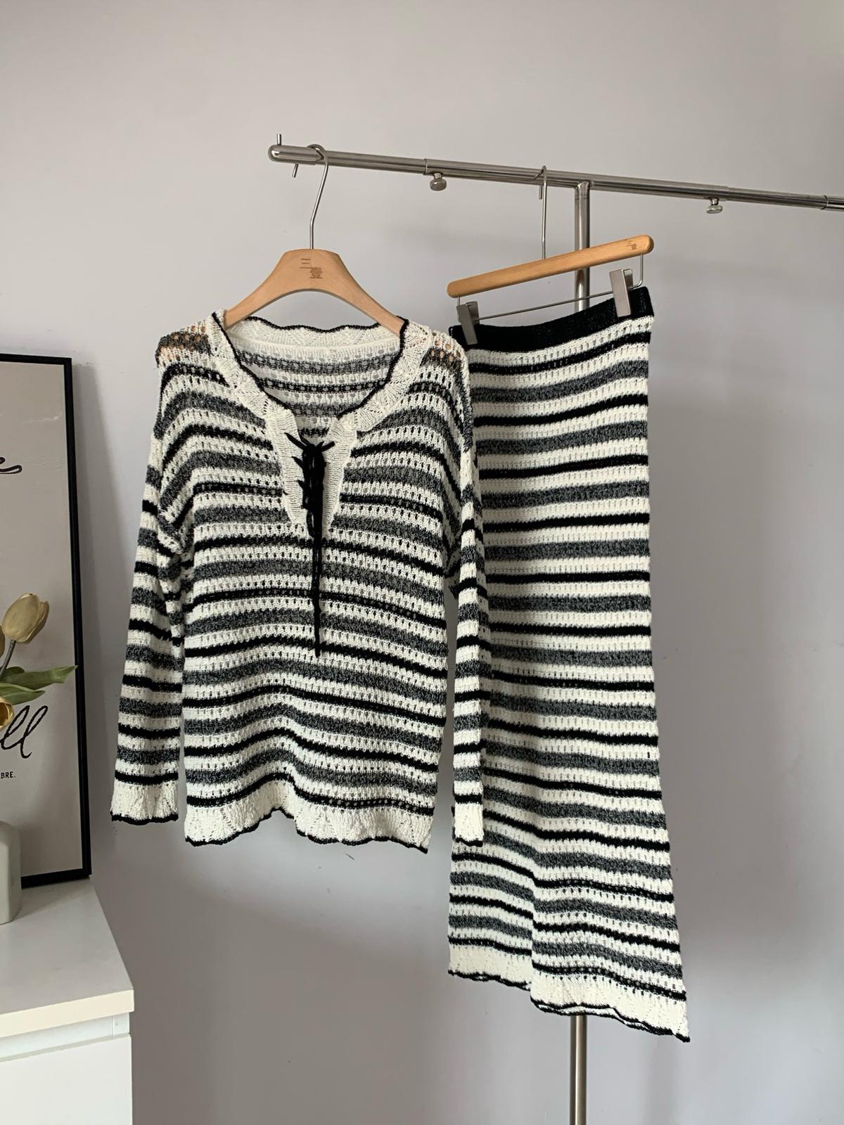 【C7635】韓繫條紋針織氣質v領上衣➕高腰半身裙套裝