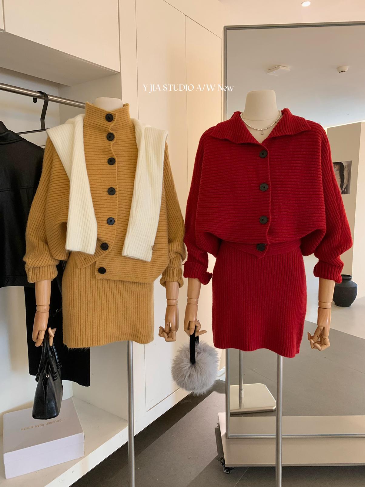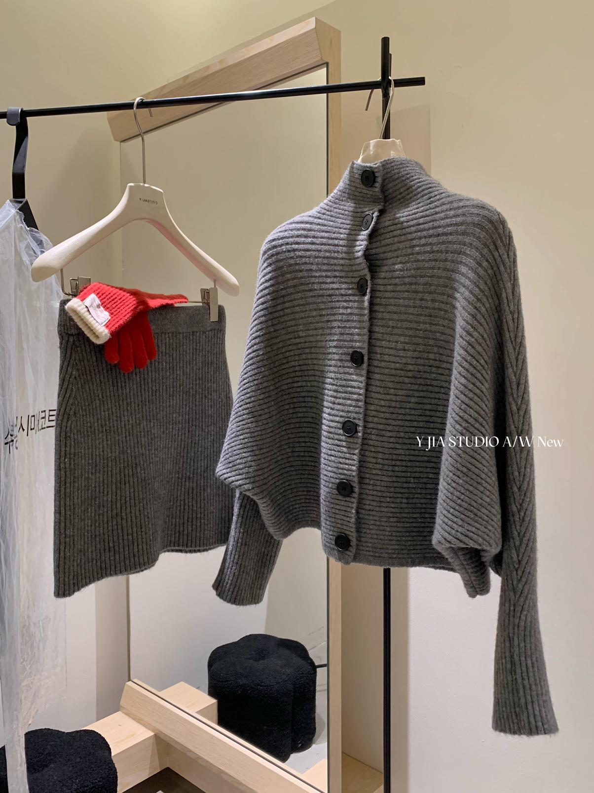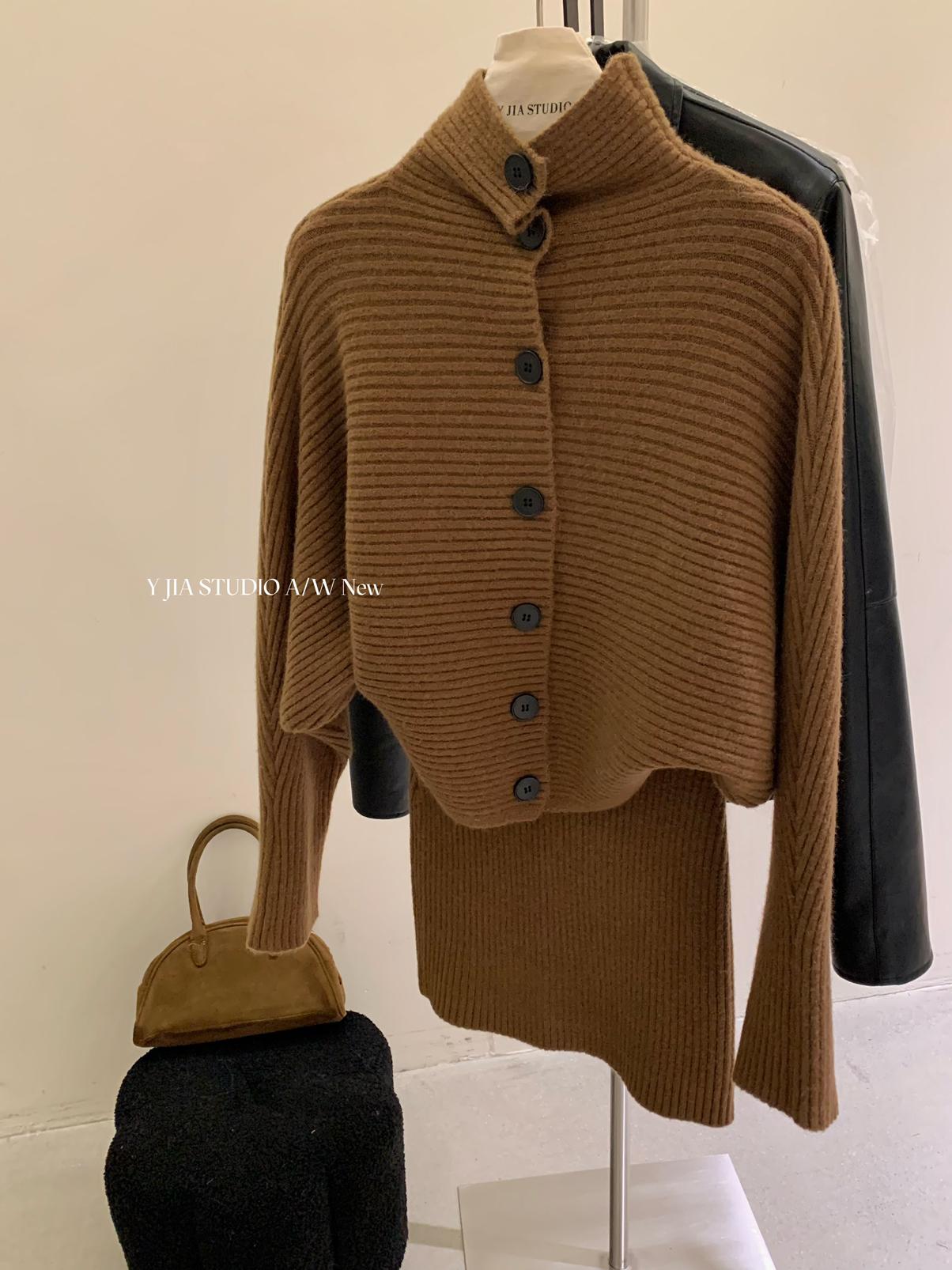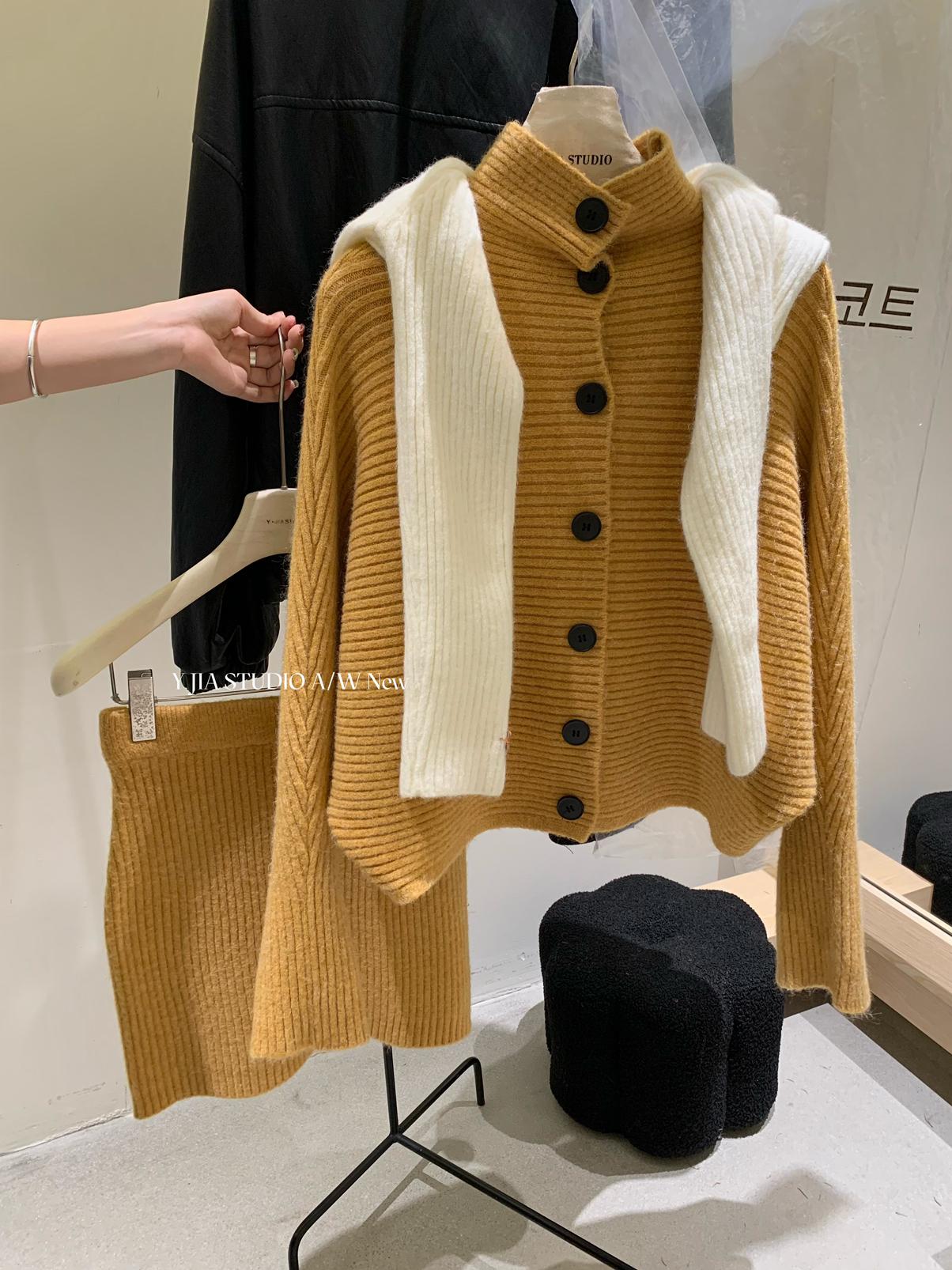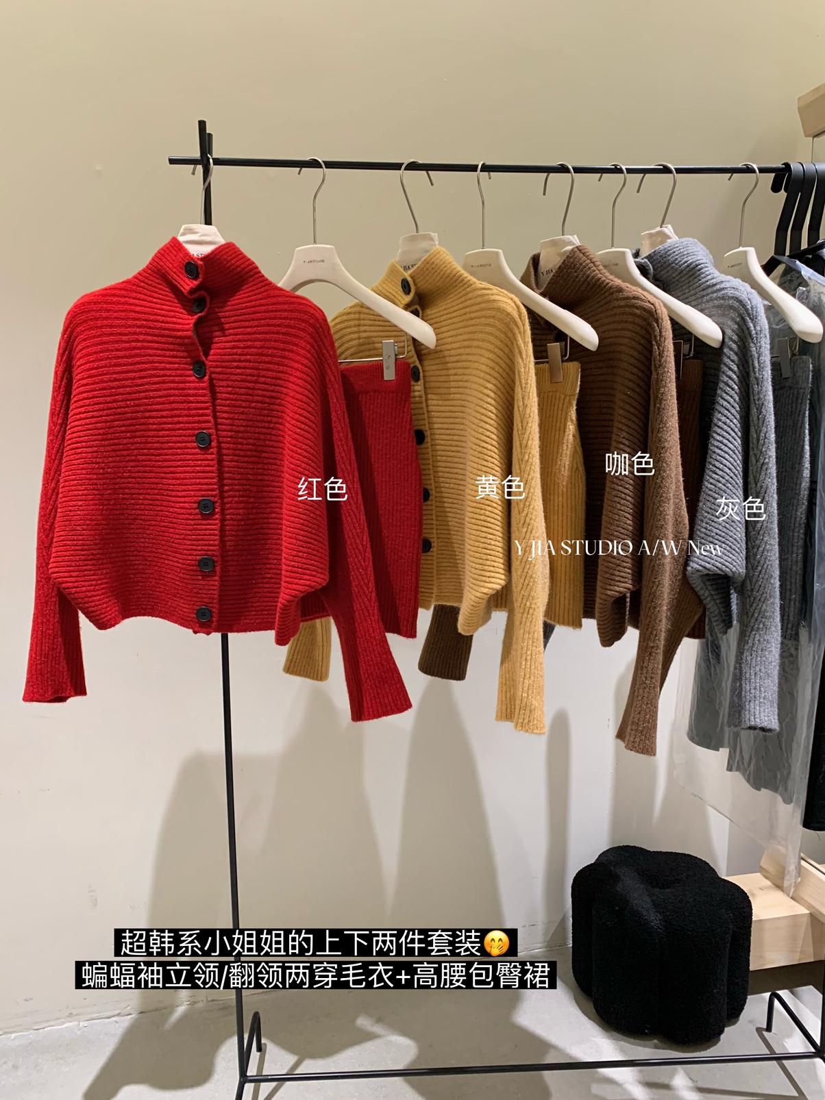 【C8219】高級感立領翻領棒針毛針織衫毛衣+高腰包臀半身裙套裝