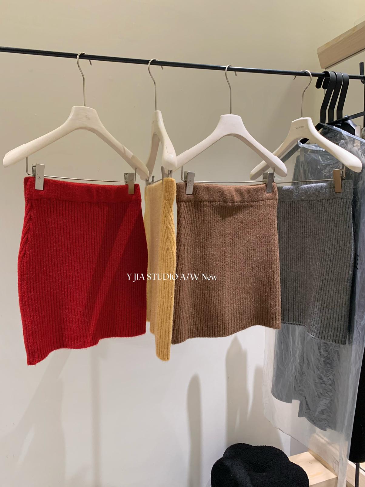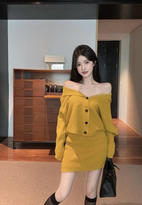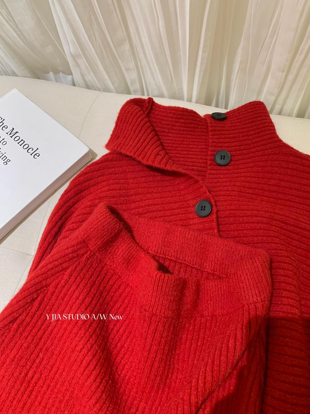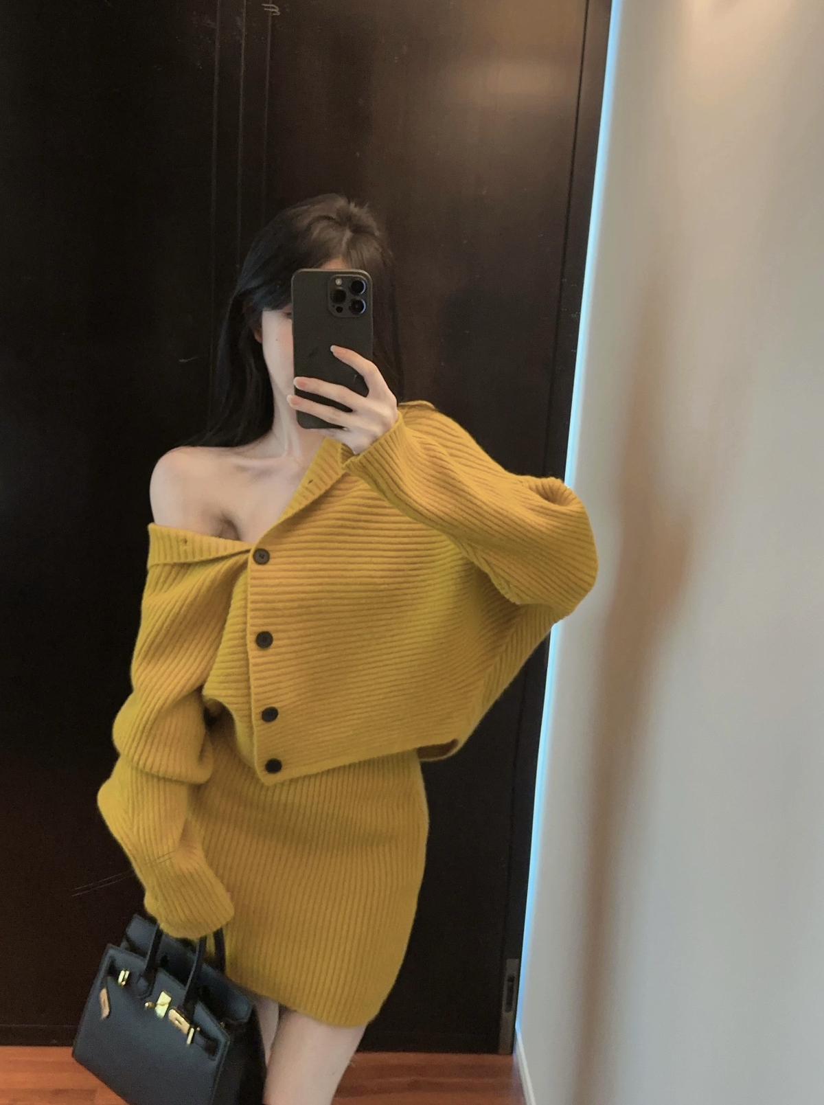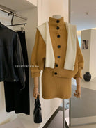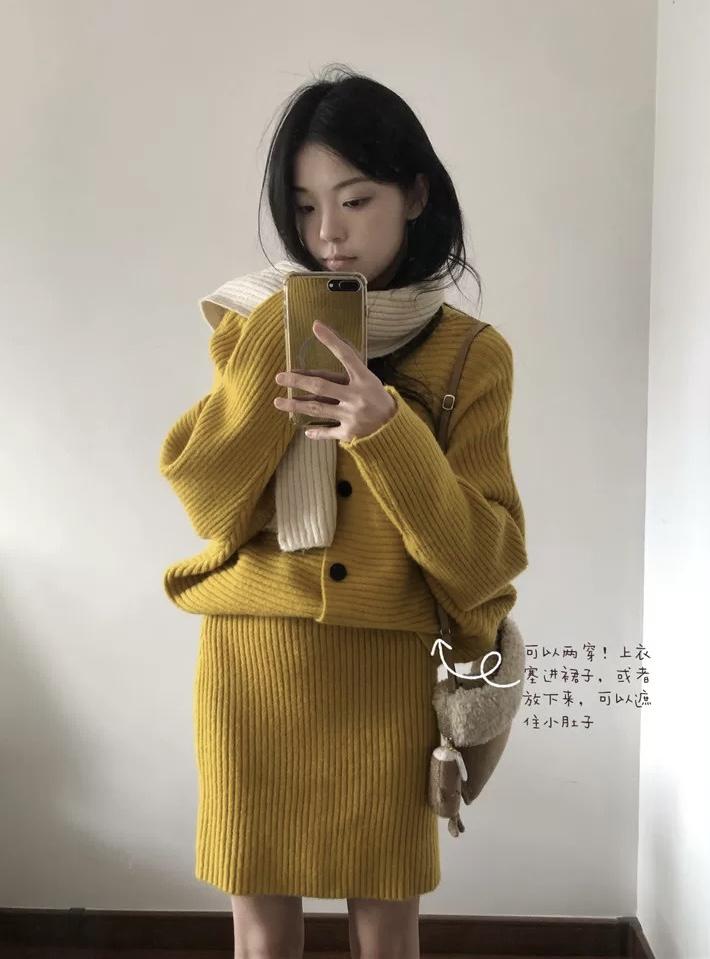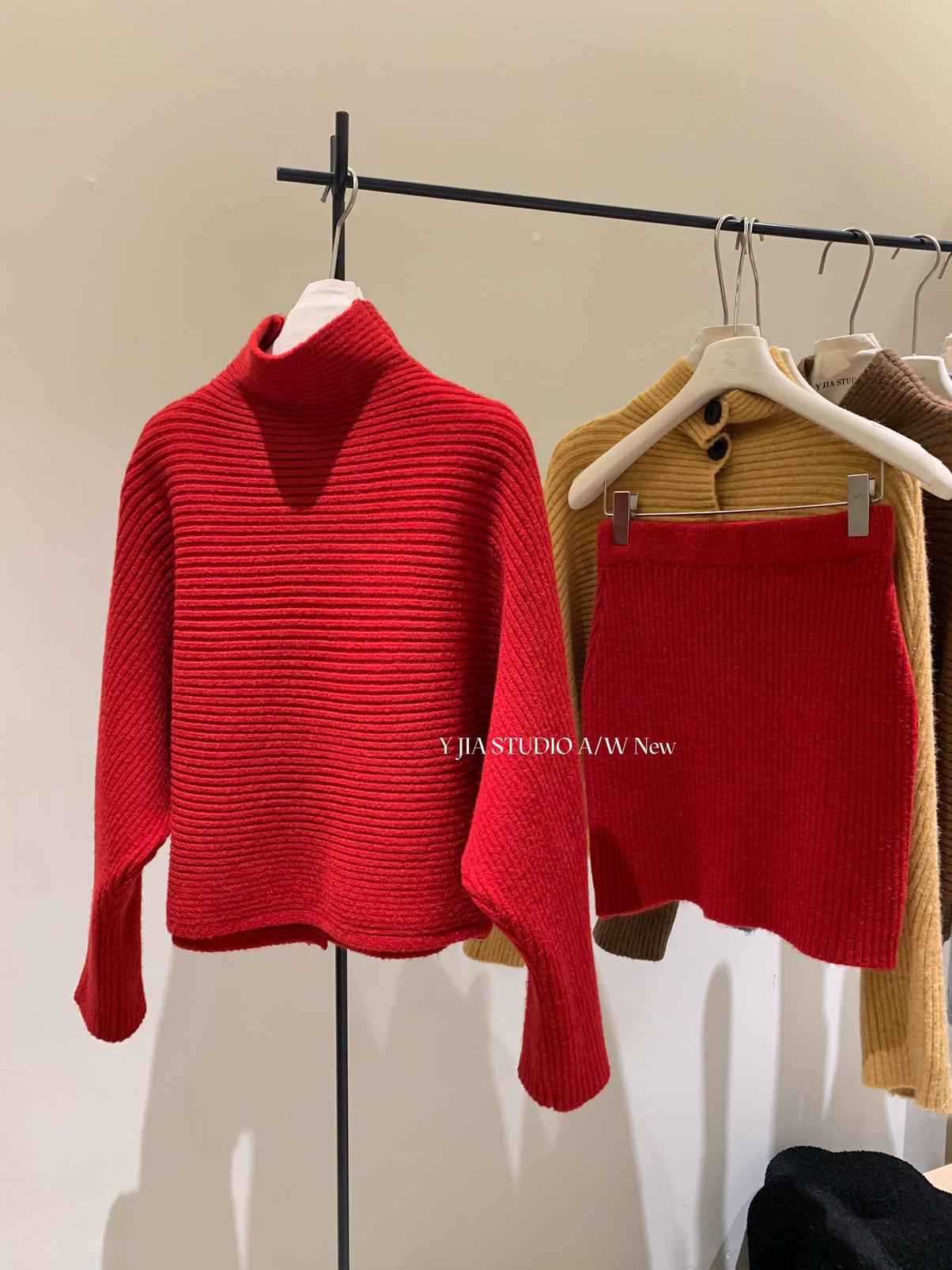 【C8219】高級感立領翻領棒針毛針織衫毛衣+高腰包臀半身裙套裝