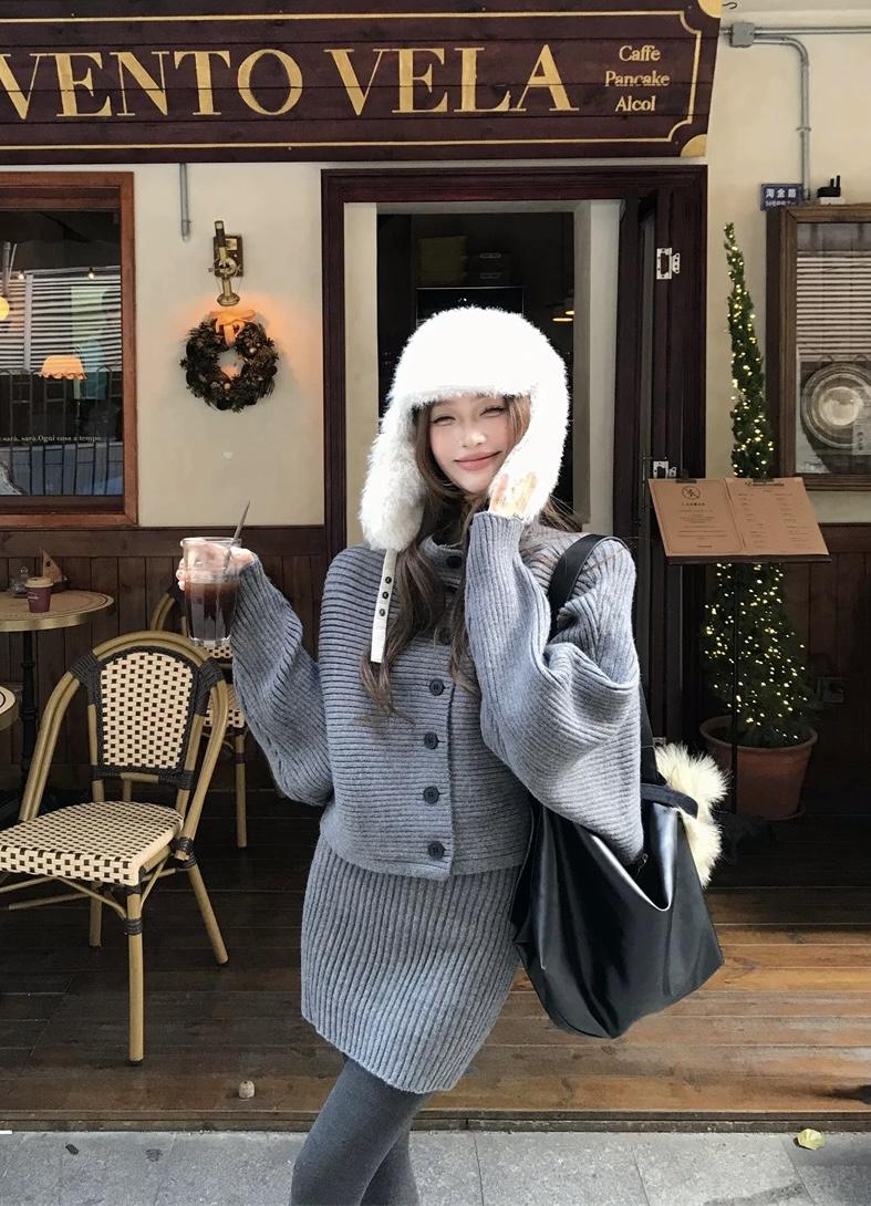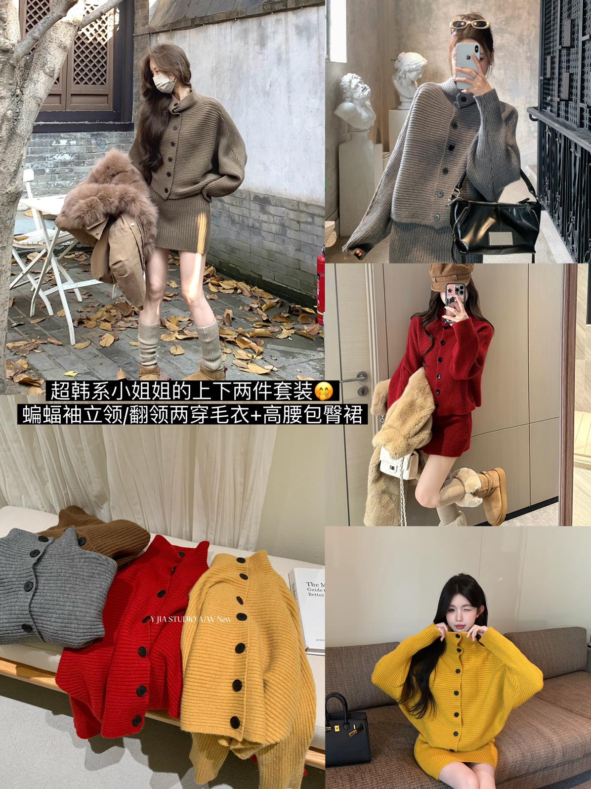3. 【C8219】高級感立領翻領棒針毛針織衫毛衣+高腰包臀半身裙套裝