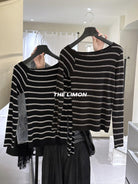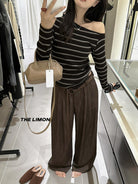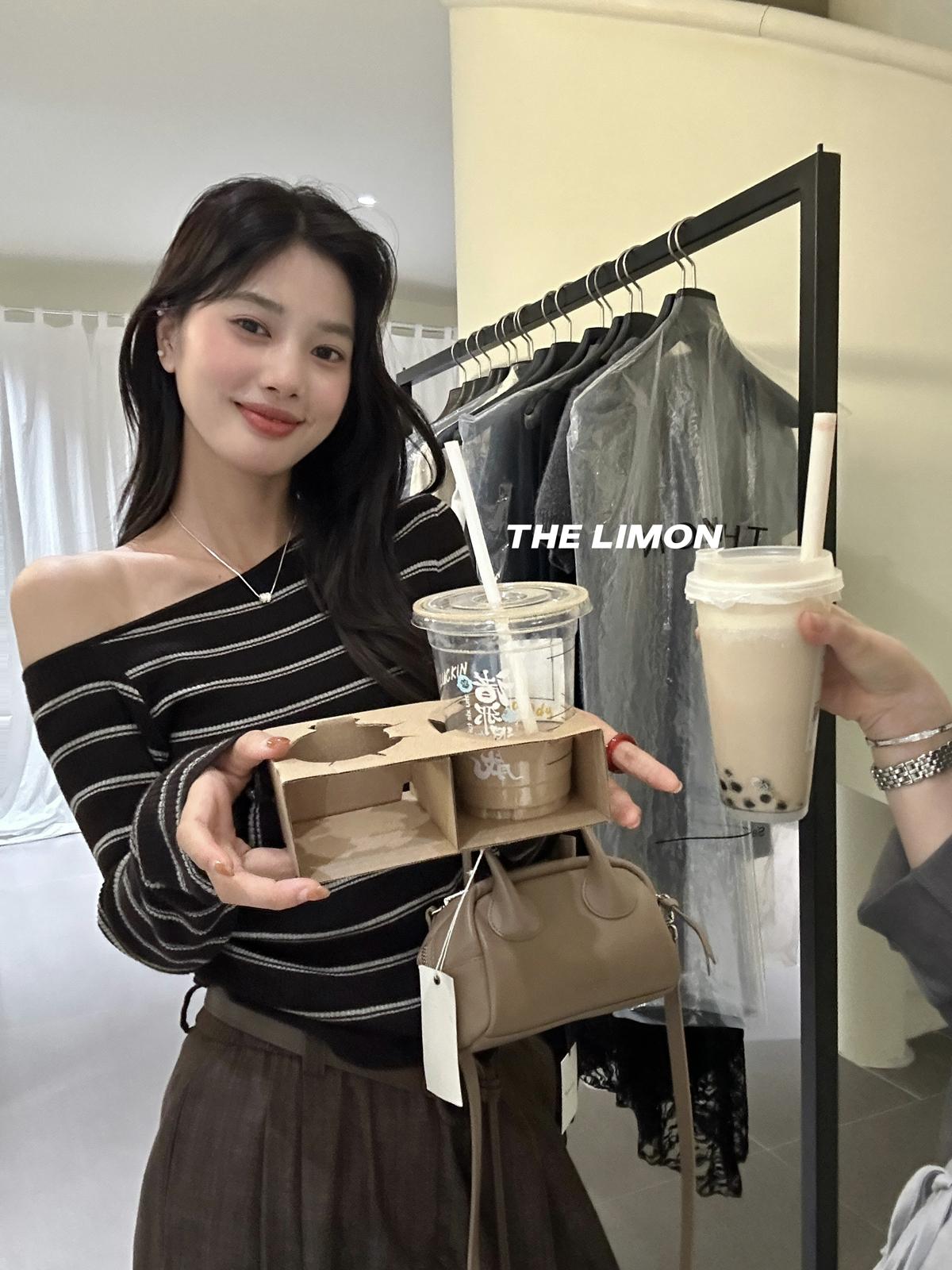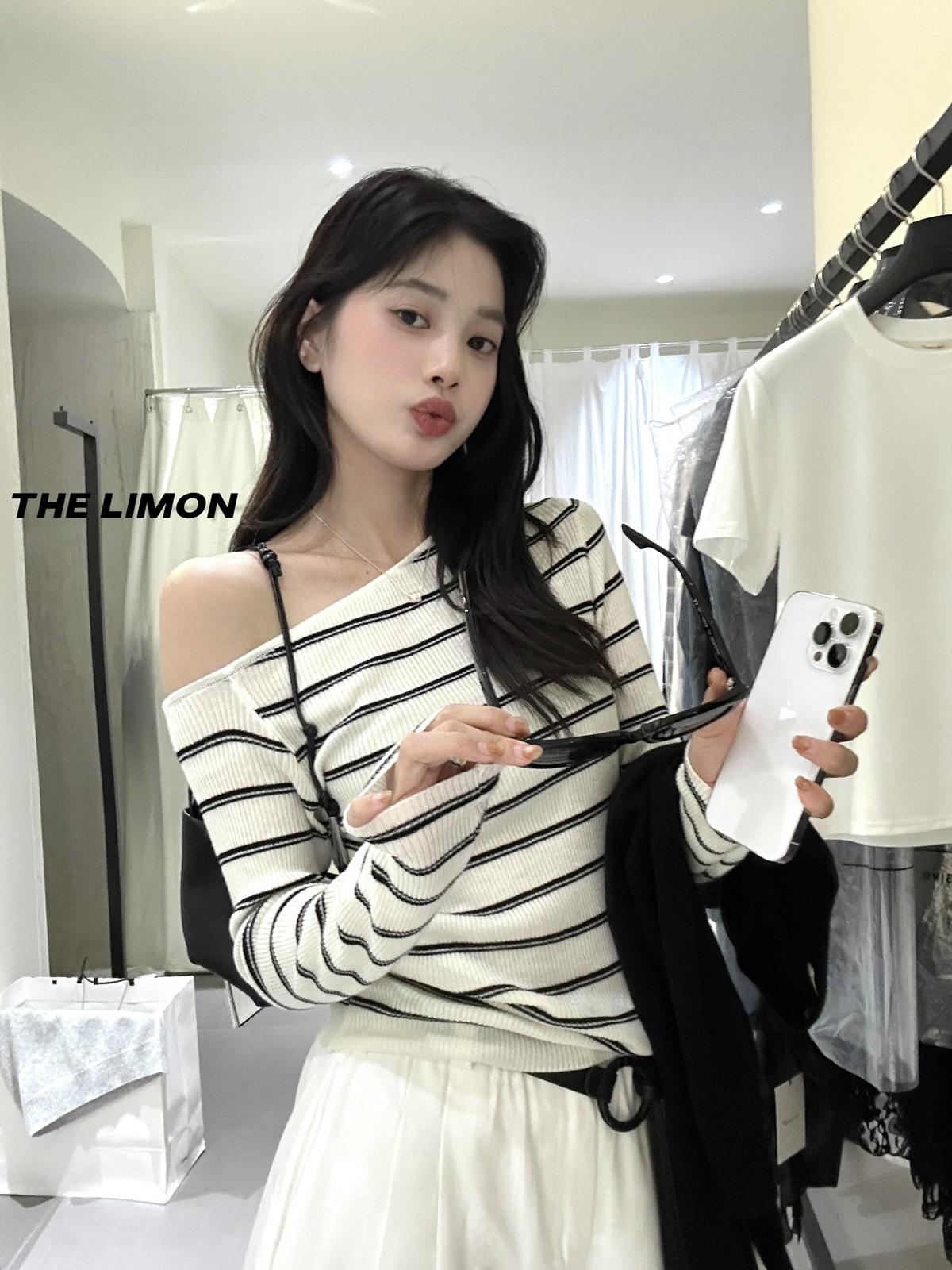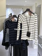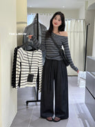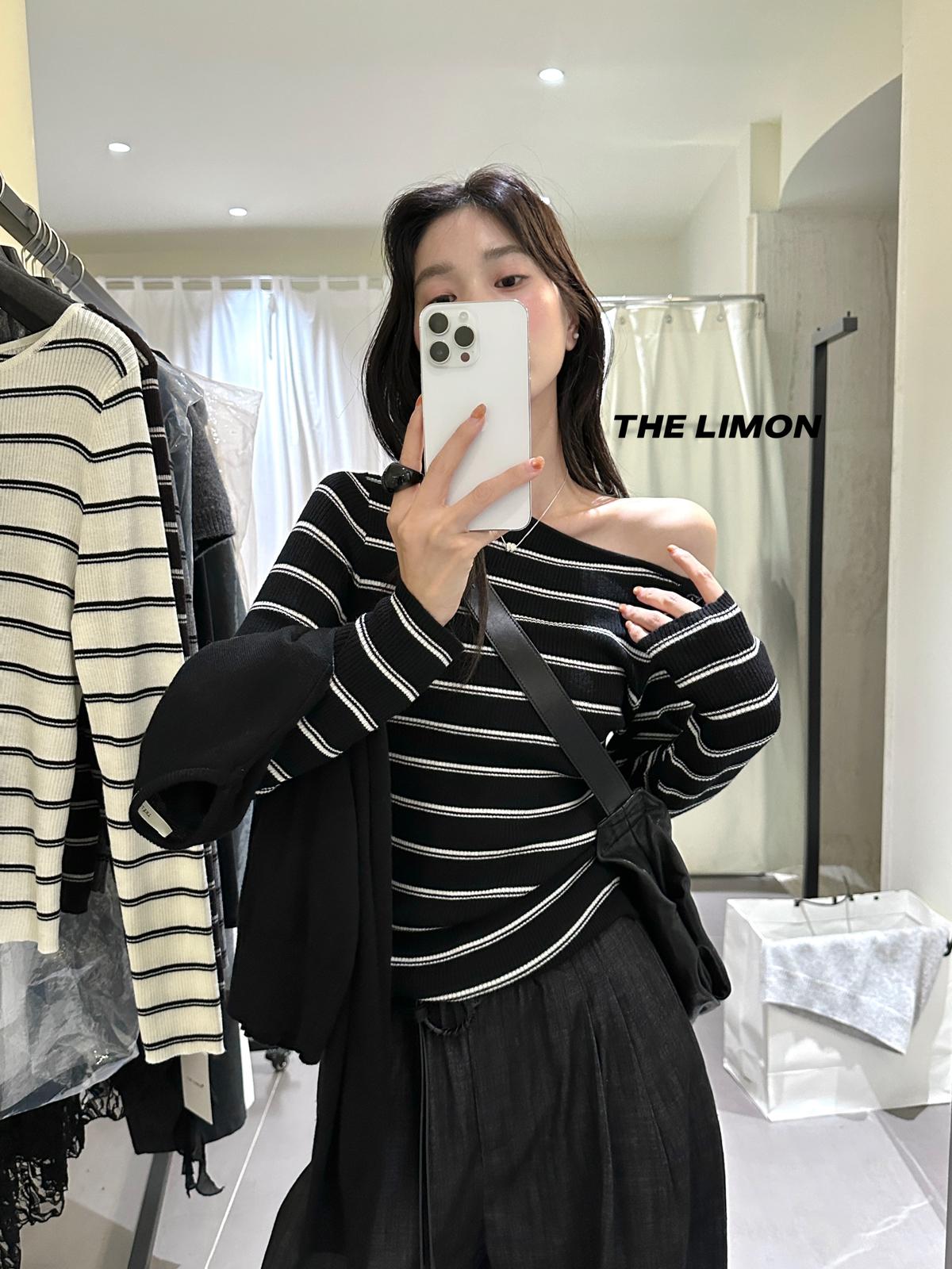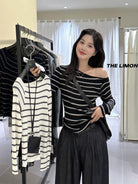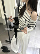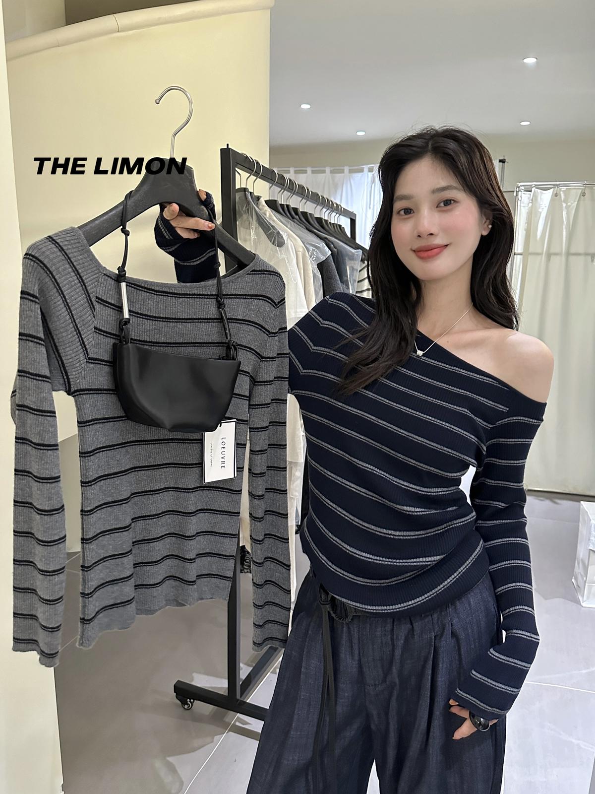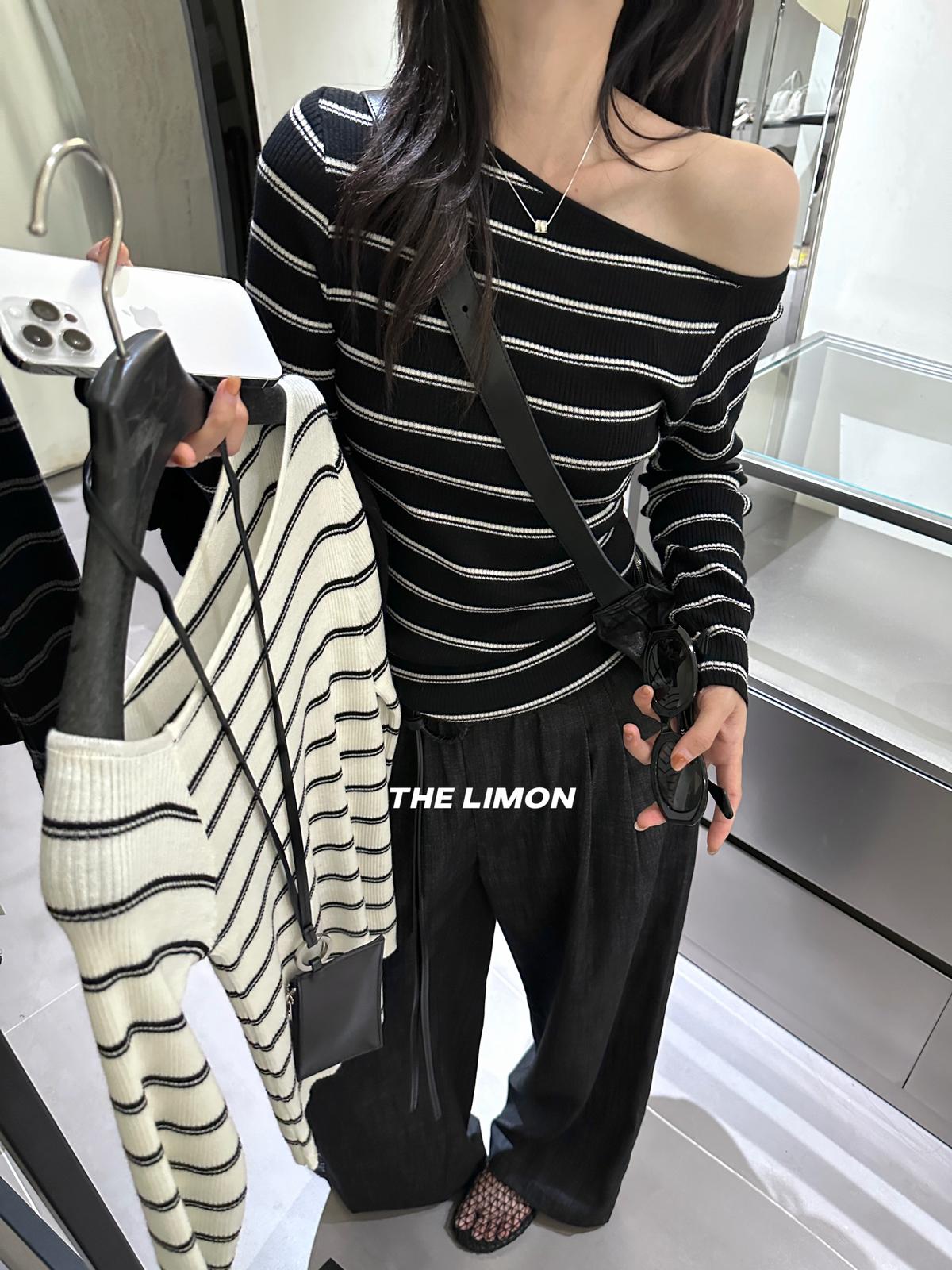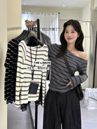 【C6827】初秋慵懶斜肩設計感條紋針織衫(含8%羊毛)