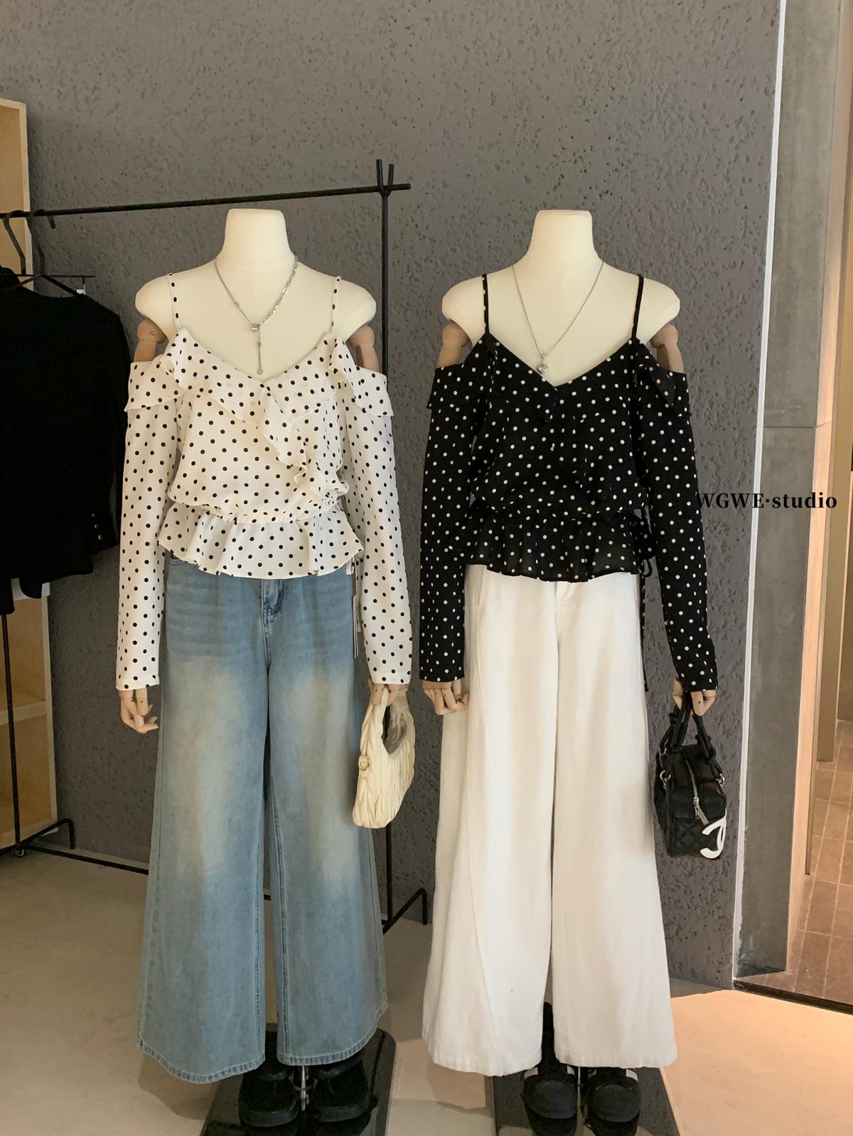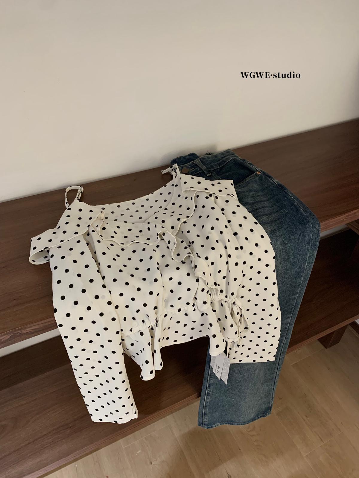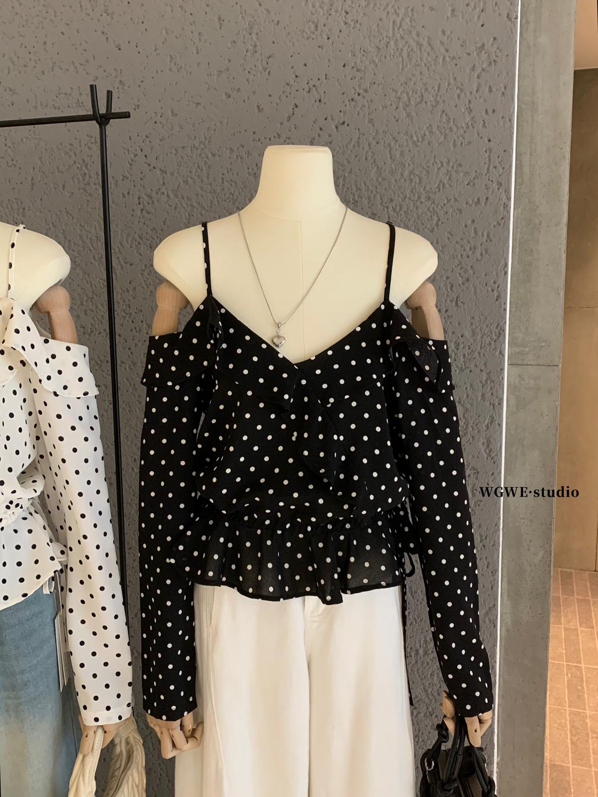 【C6952】薄款一字肩襯衫露肩別緻上衣女設計小衆波點長袖T恤