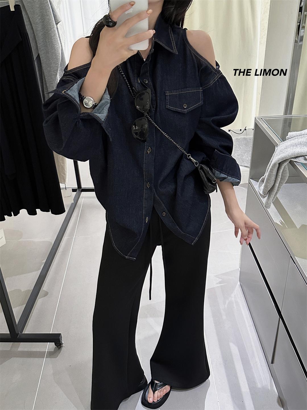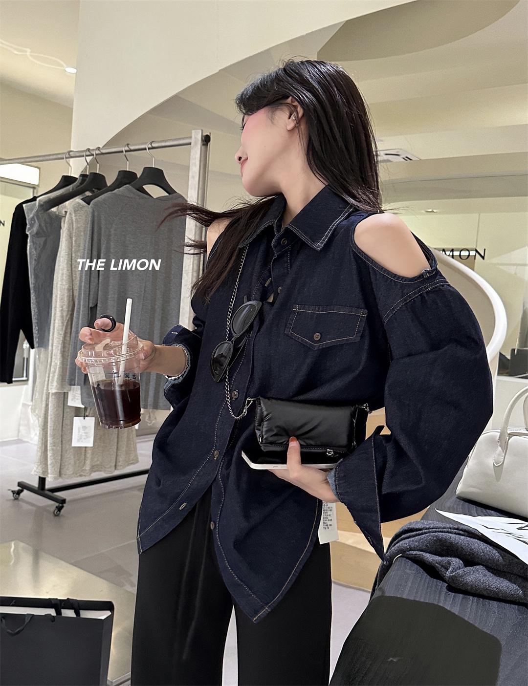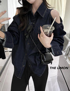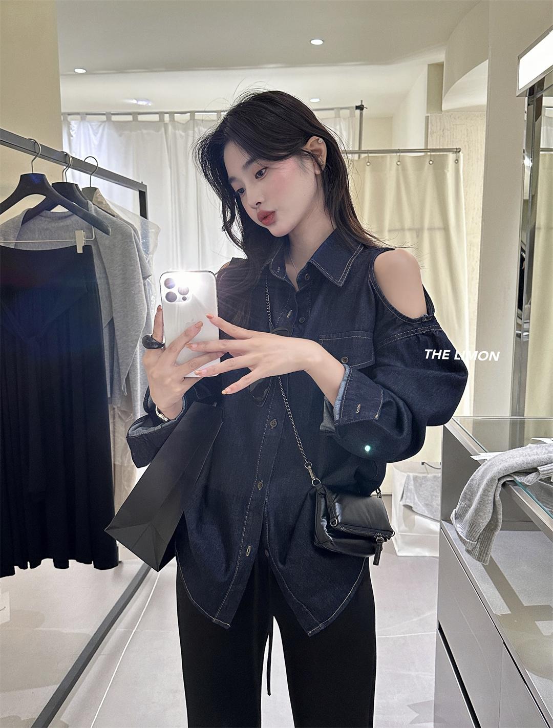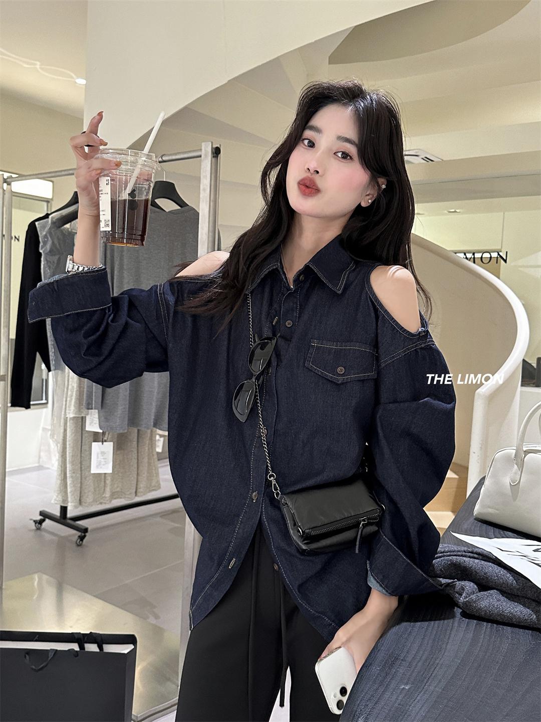 【C7102】美式復古經典百搭漏肩牛仔襯衫